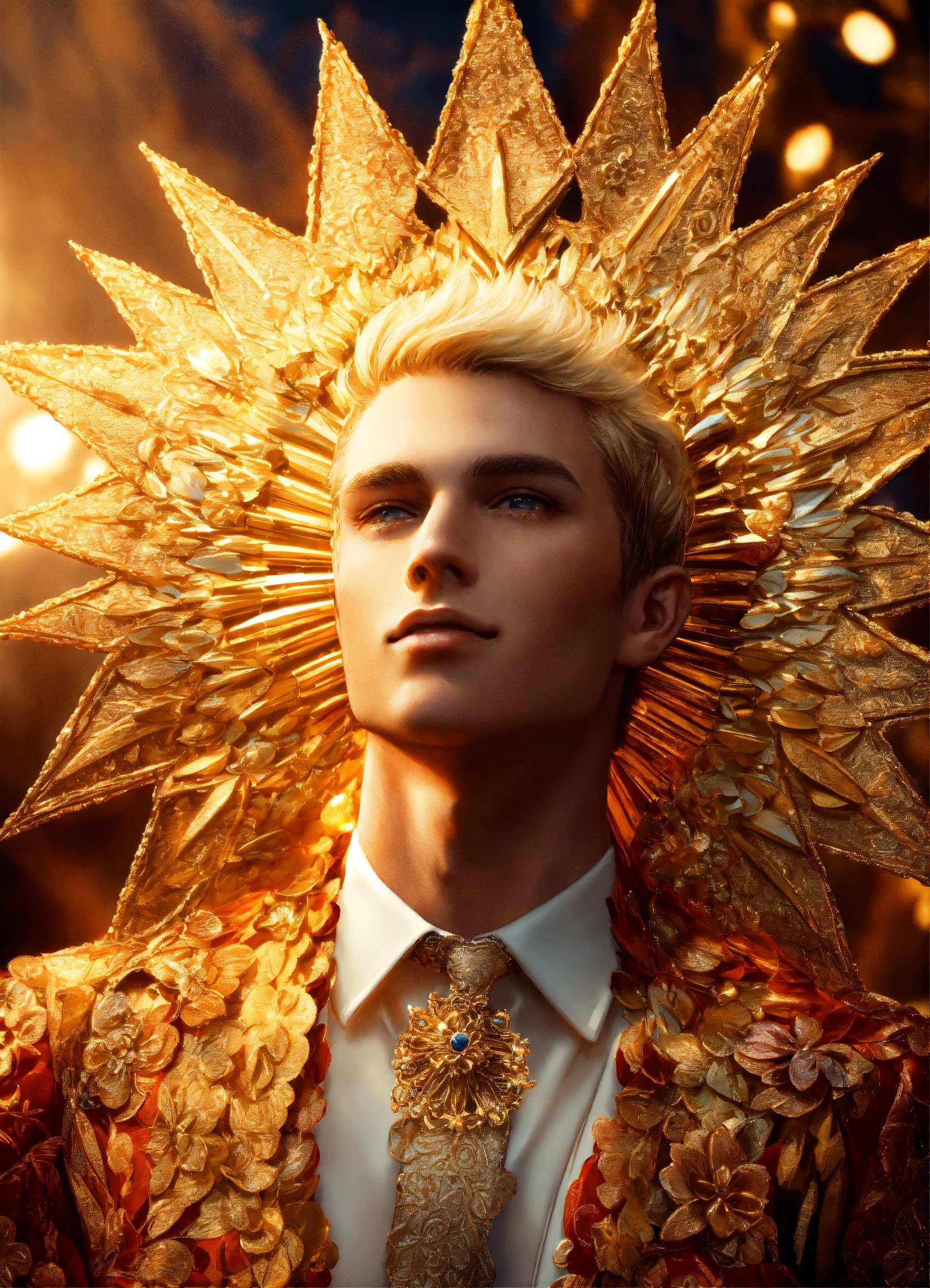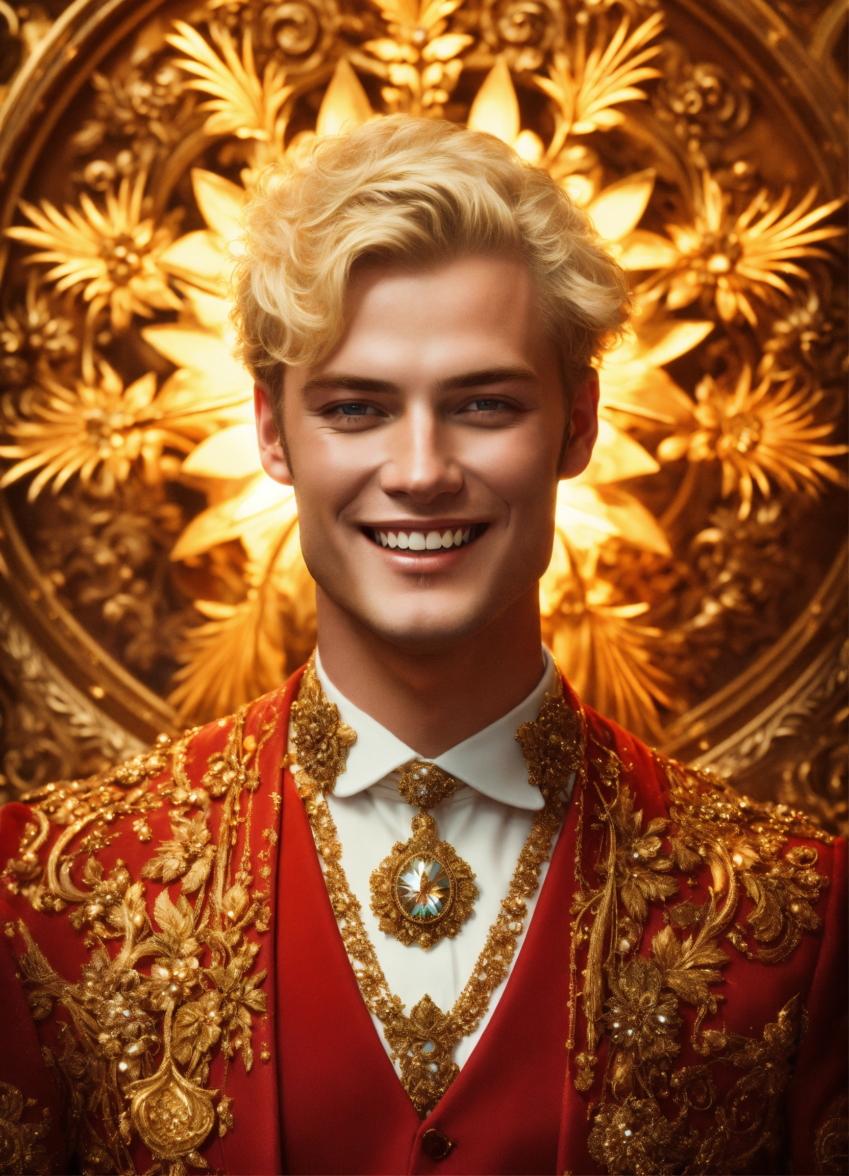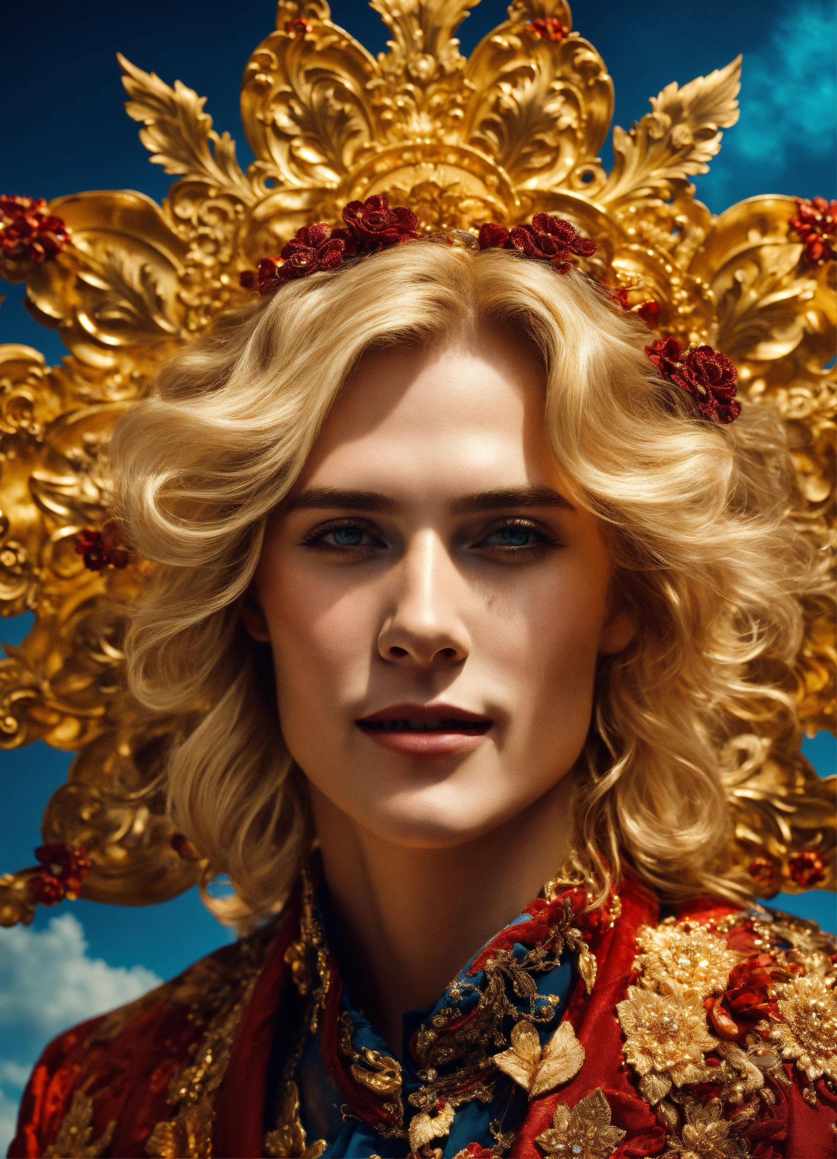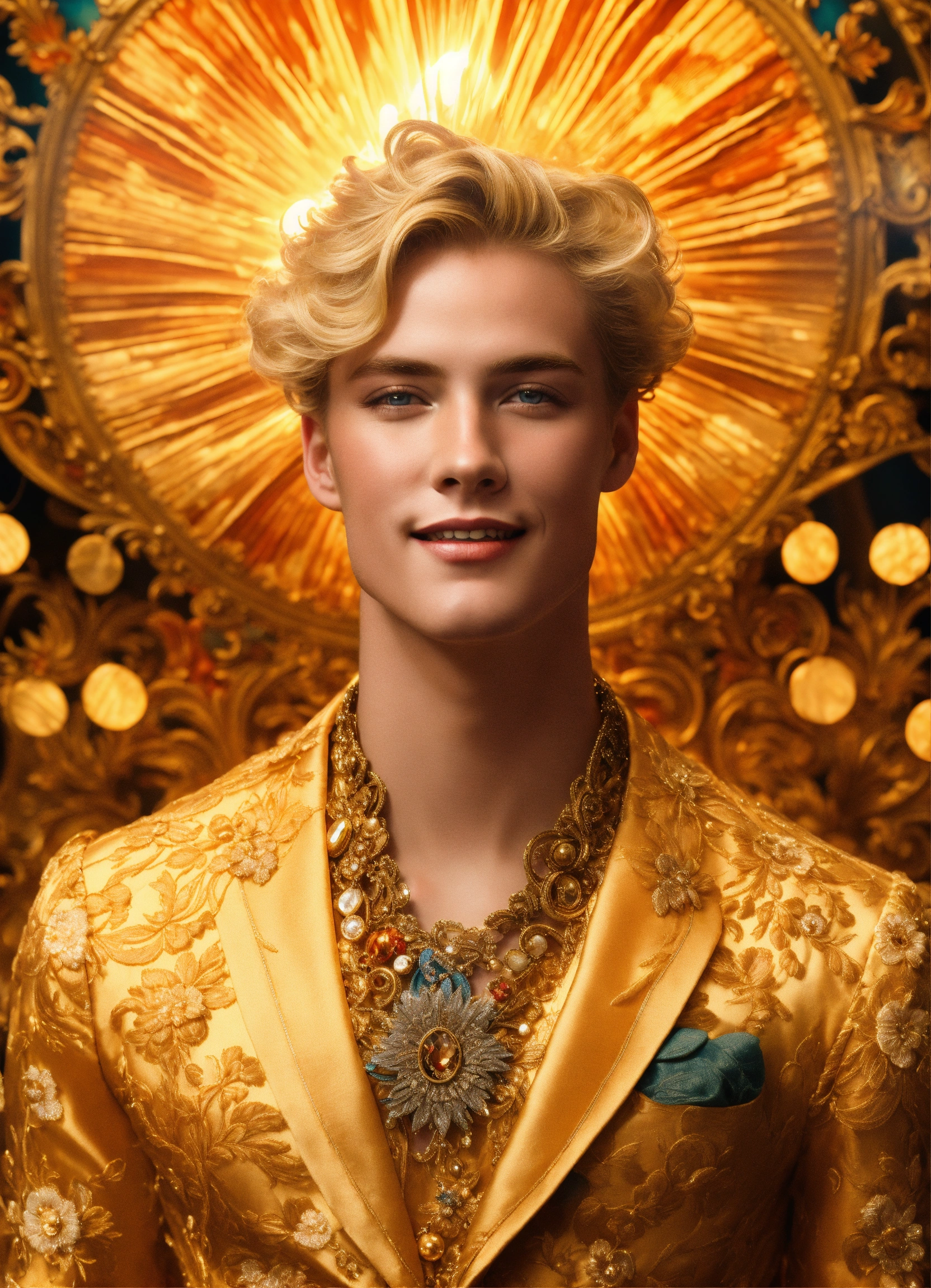 Man with blonde smiling photography, surreal, detailed, high definition, classical, sunburst in heaven, in the style of lachapelle and aldridge ornate, dynamic, particulate, rich colors, intricate, elegant, highly detailed, the vogue, harper's bazaar art, fashion magazine, smooth, sharp focus, high definition, octane render
