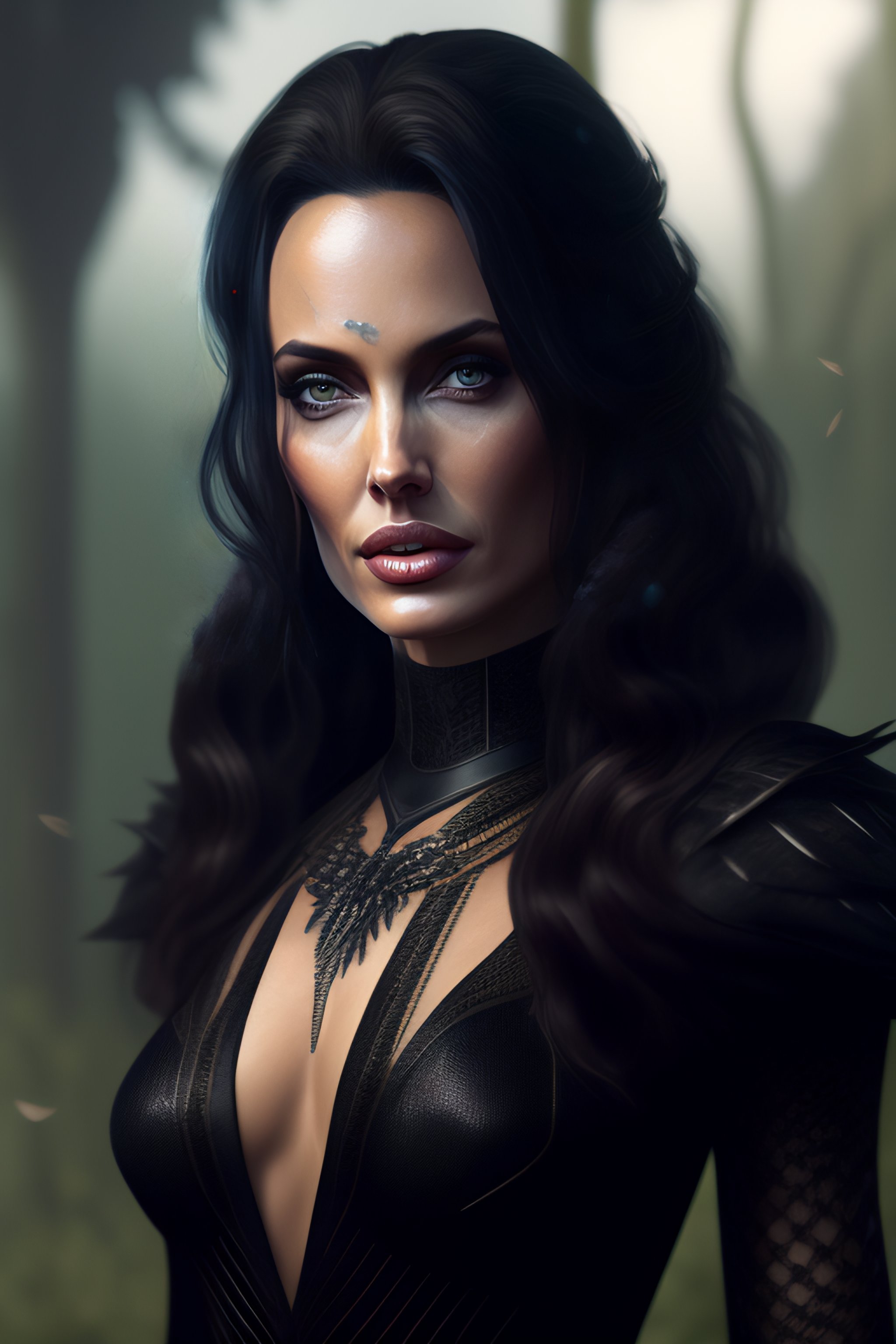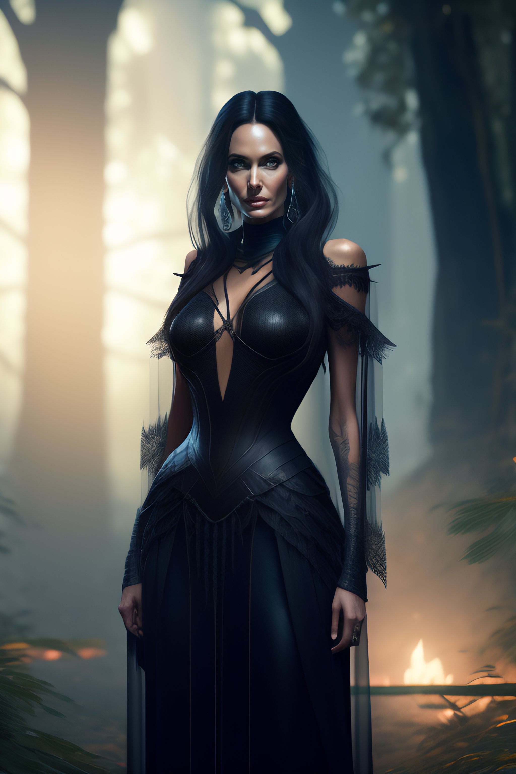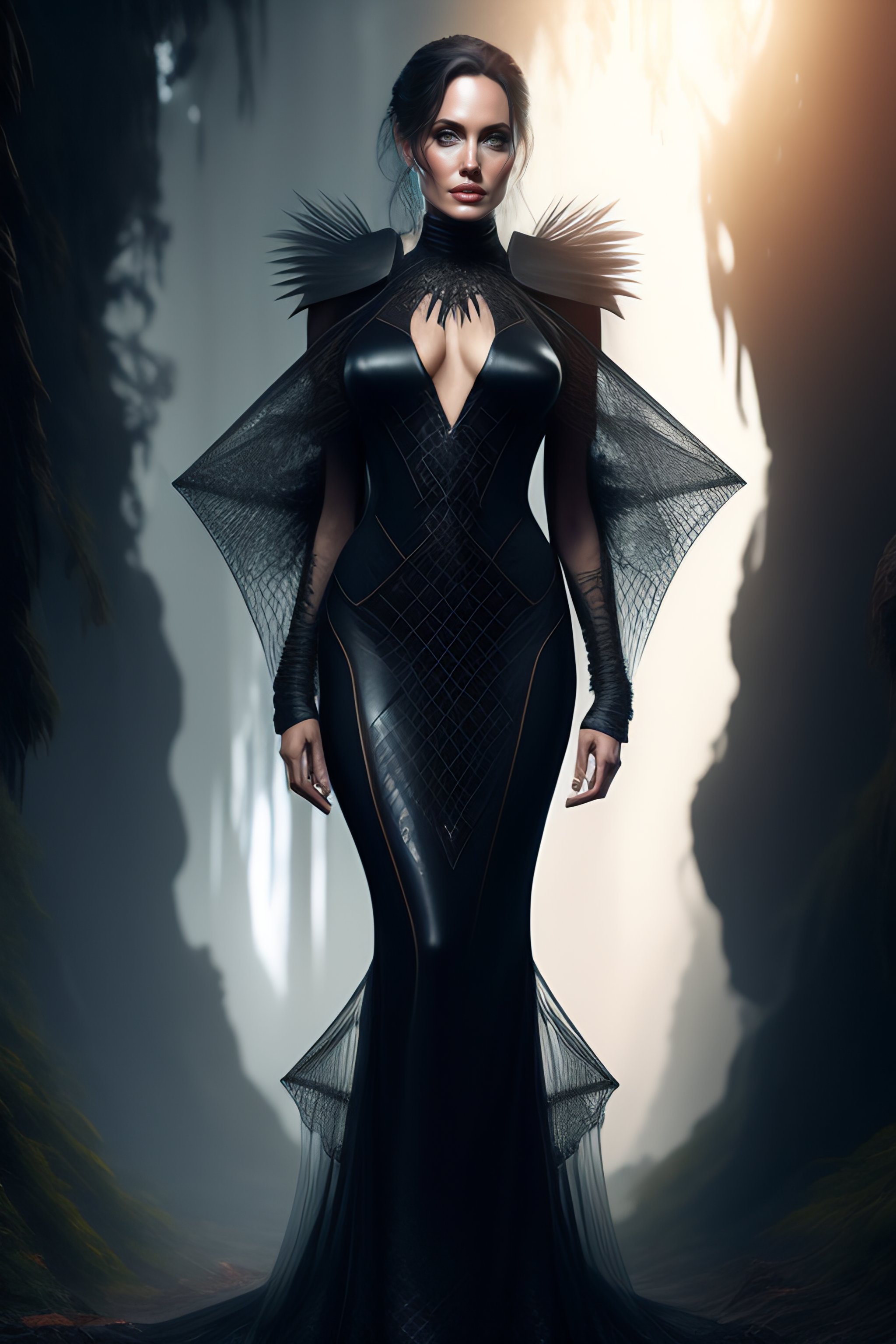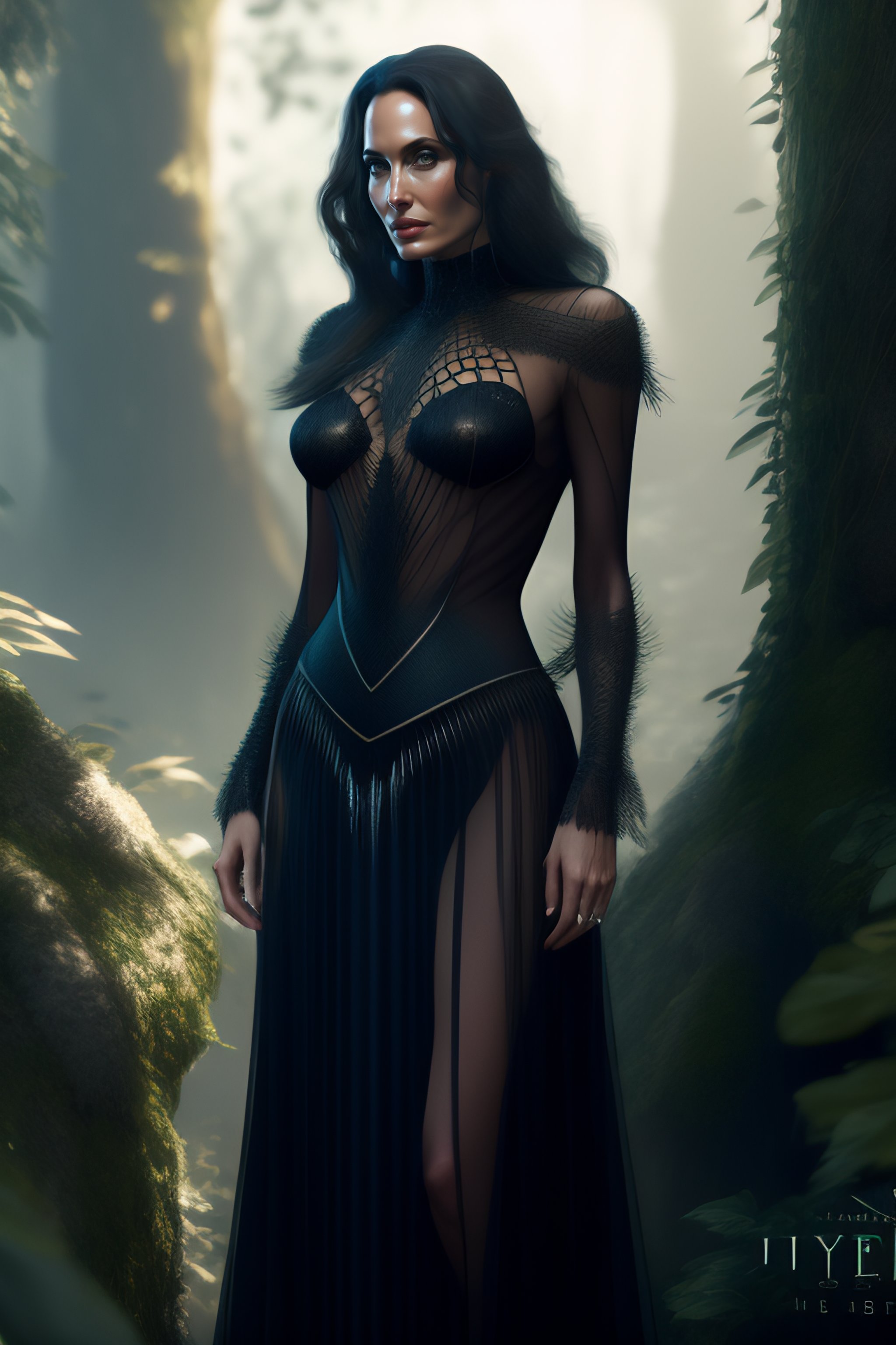 Angelina jolie, hyperrealistic, full length artistic portrait, gothic, sexy gothic transparent sheer dress slit, dress string, beautiful black hair, goth orchid forest, spiderweb, honeycomb, barn wire, cobweb. 8k resolution concept art portrait by greg rutkowski, artgerm, rpg, jrpg, hdr, unreal engine, game character in a topselling game, playstation 5