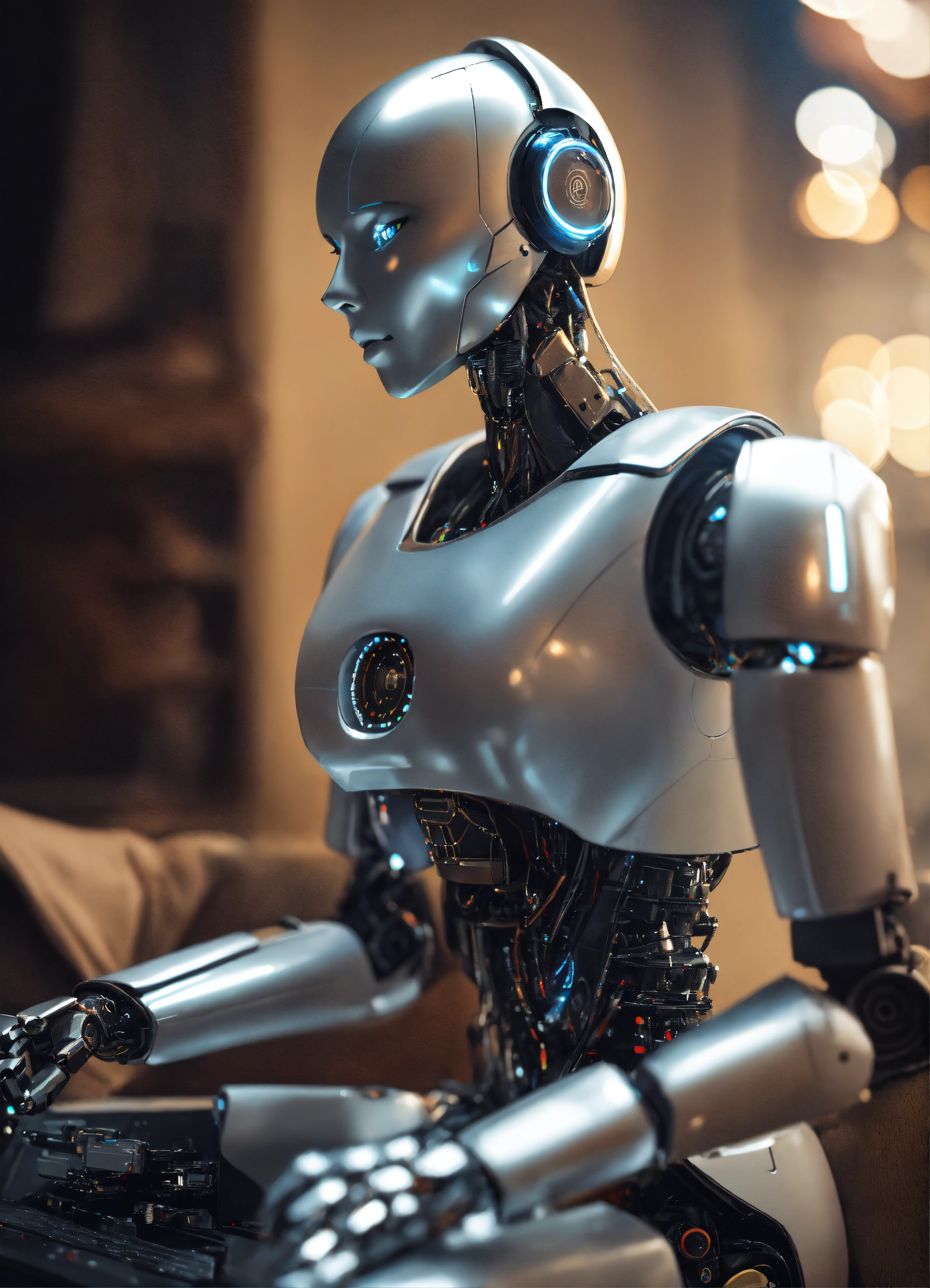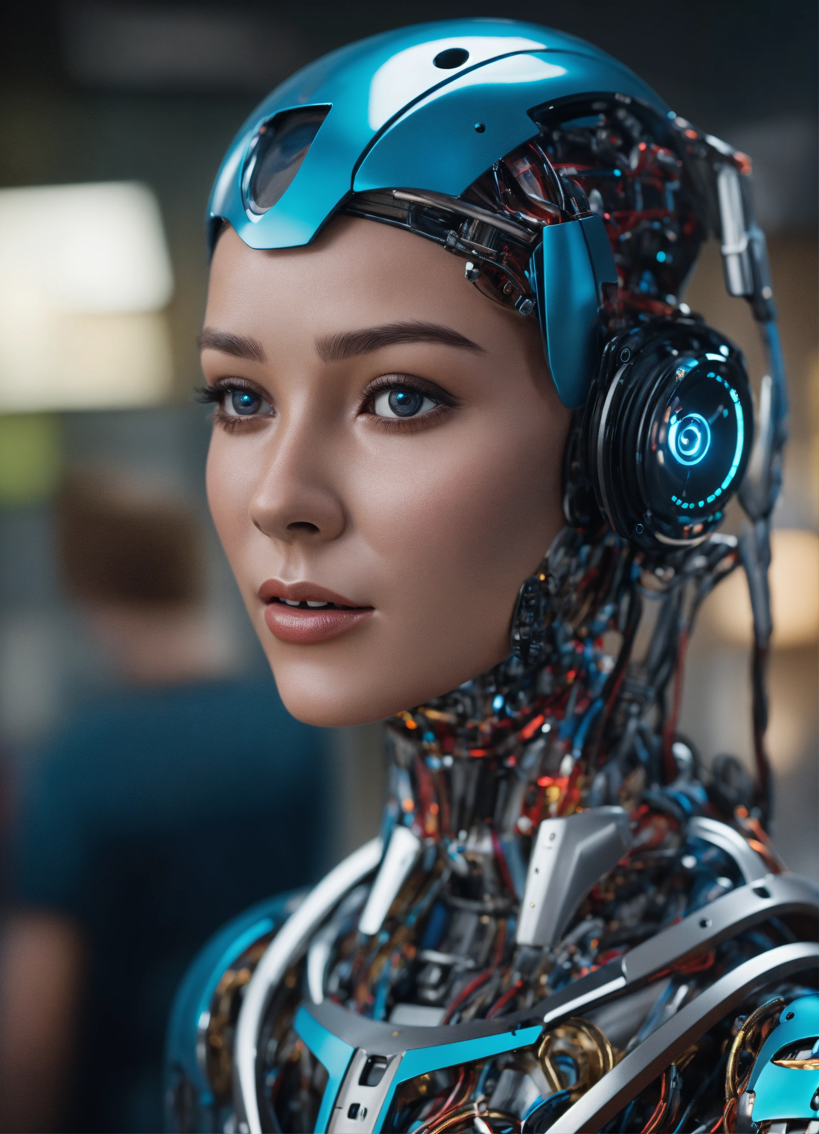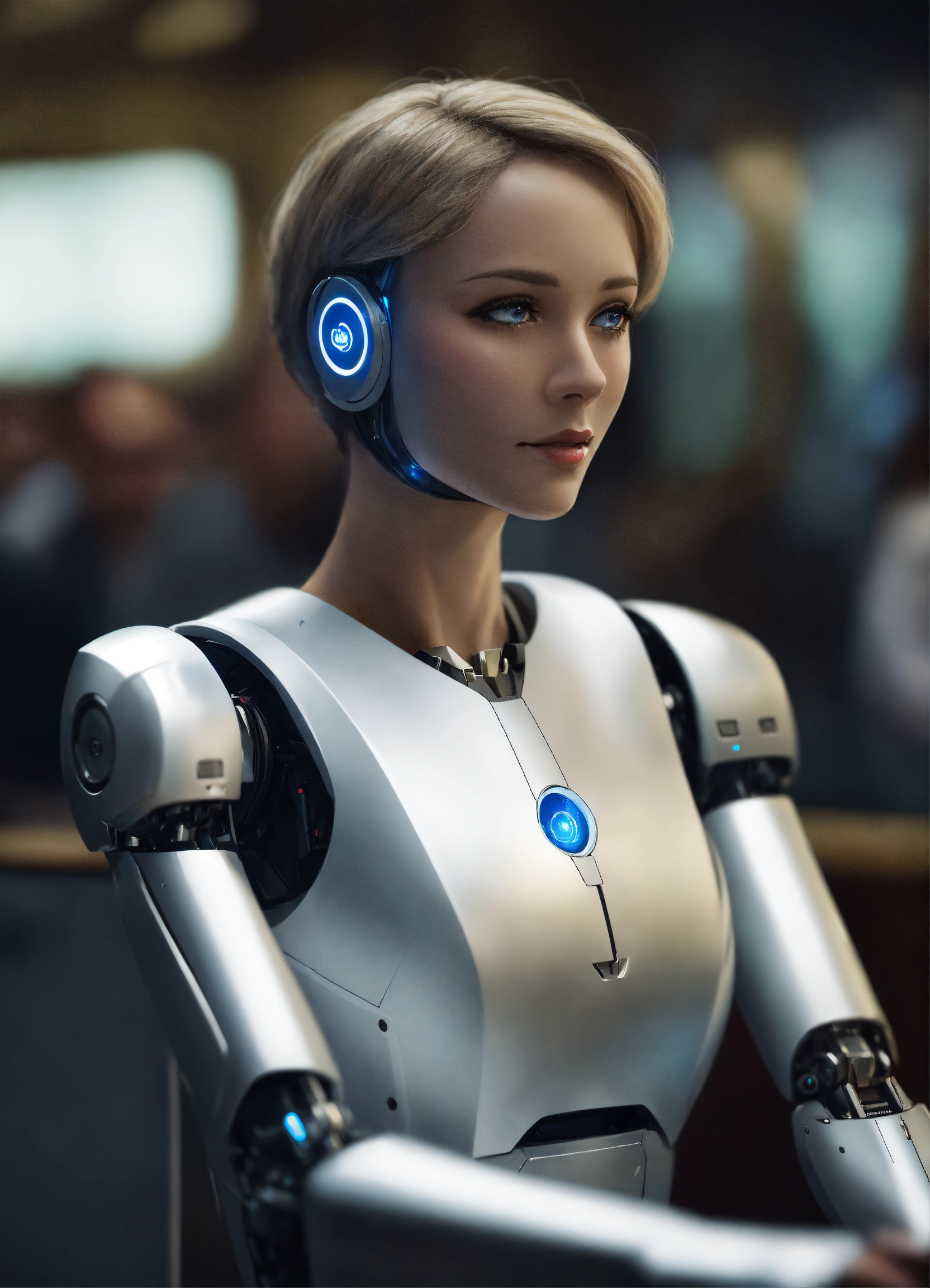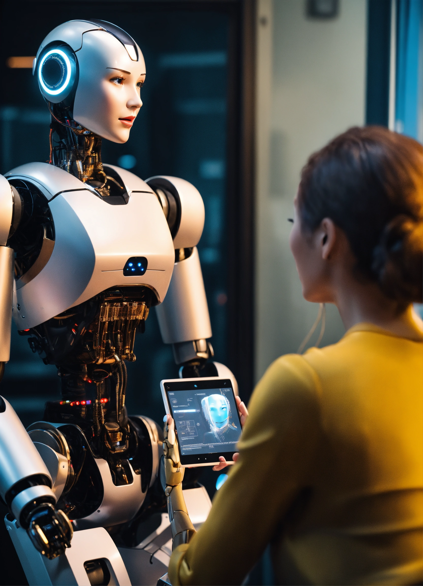 Create a hyper-realistic, 4k, lifelike digital image that show humanoid robot speaking to a human woman