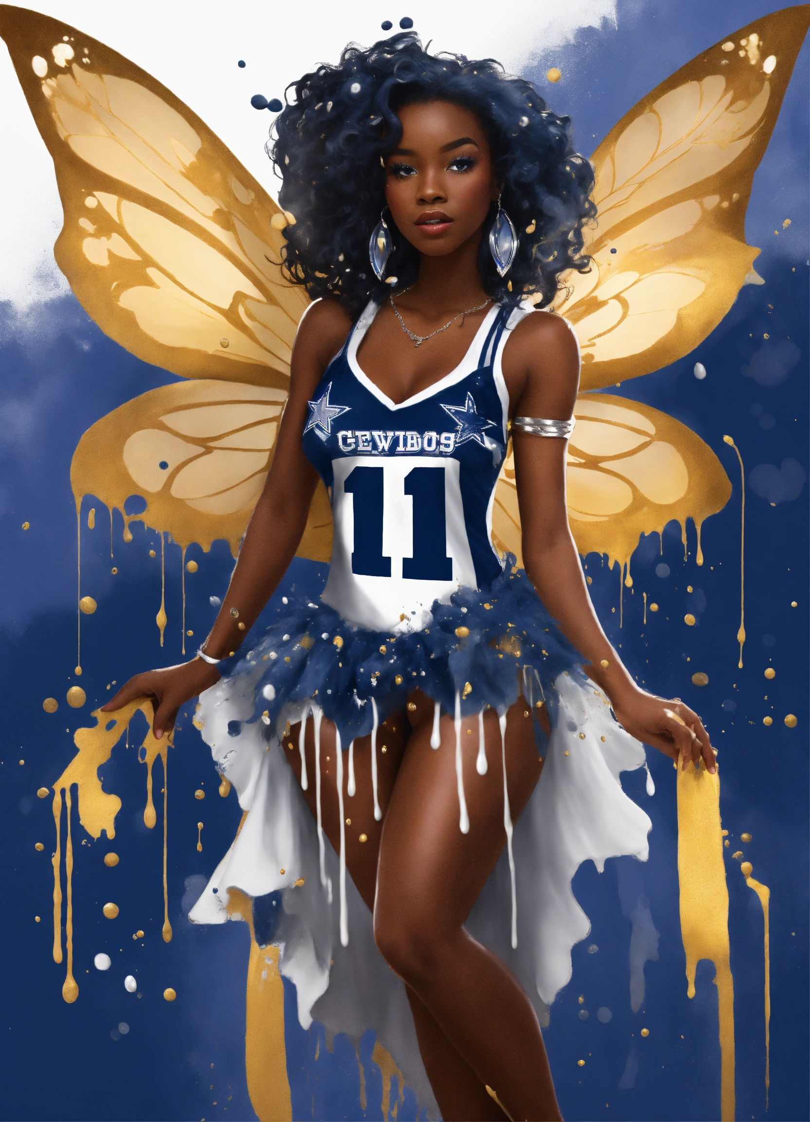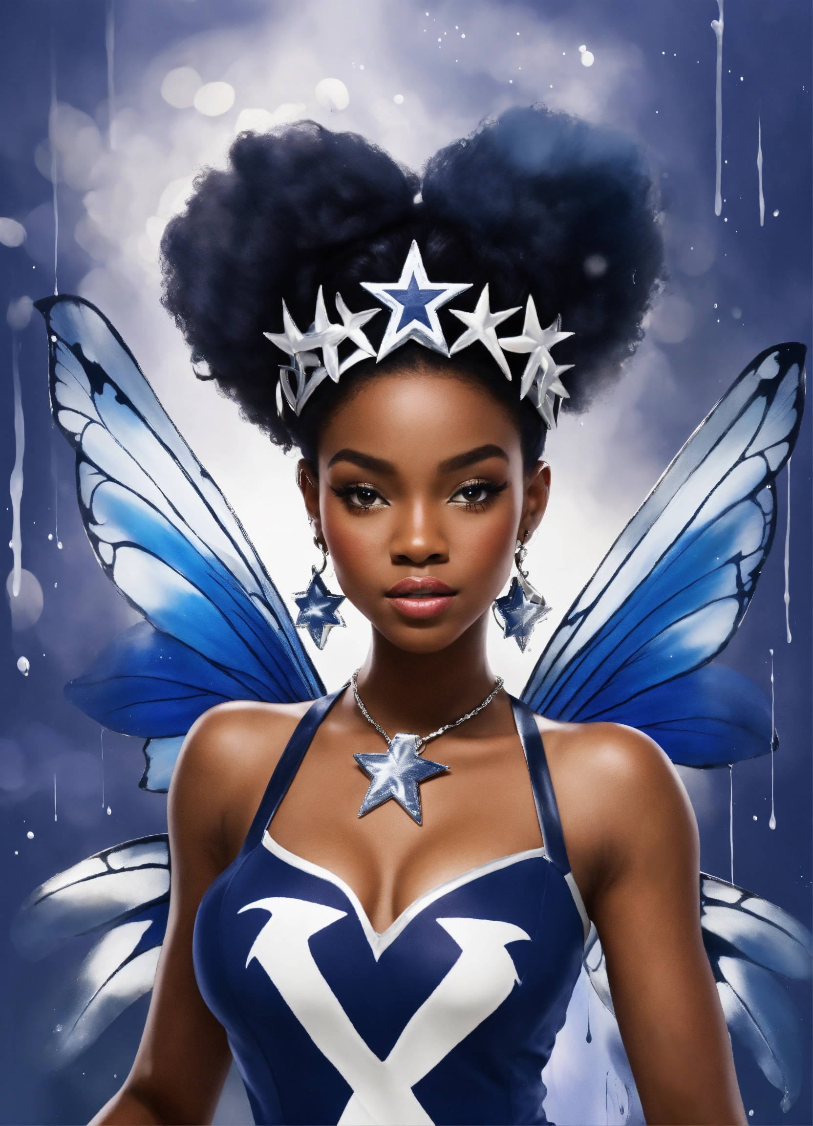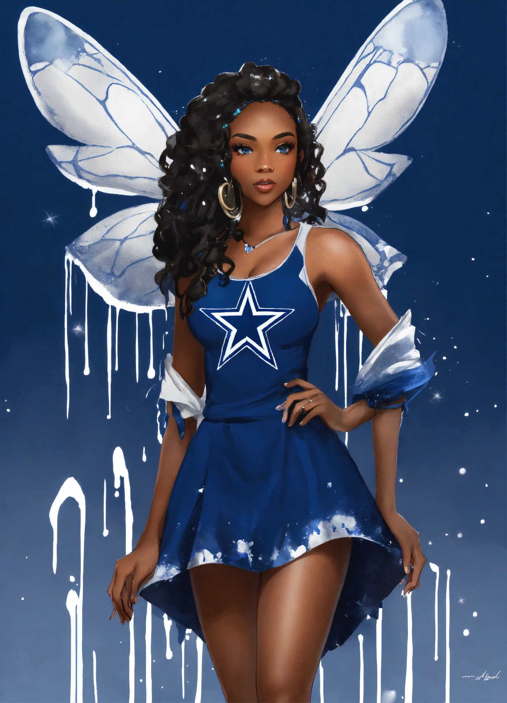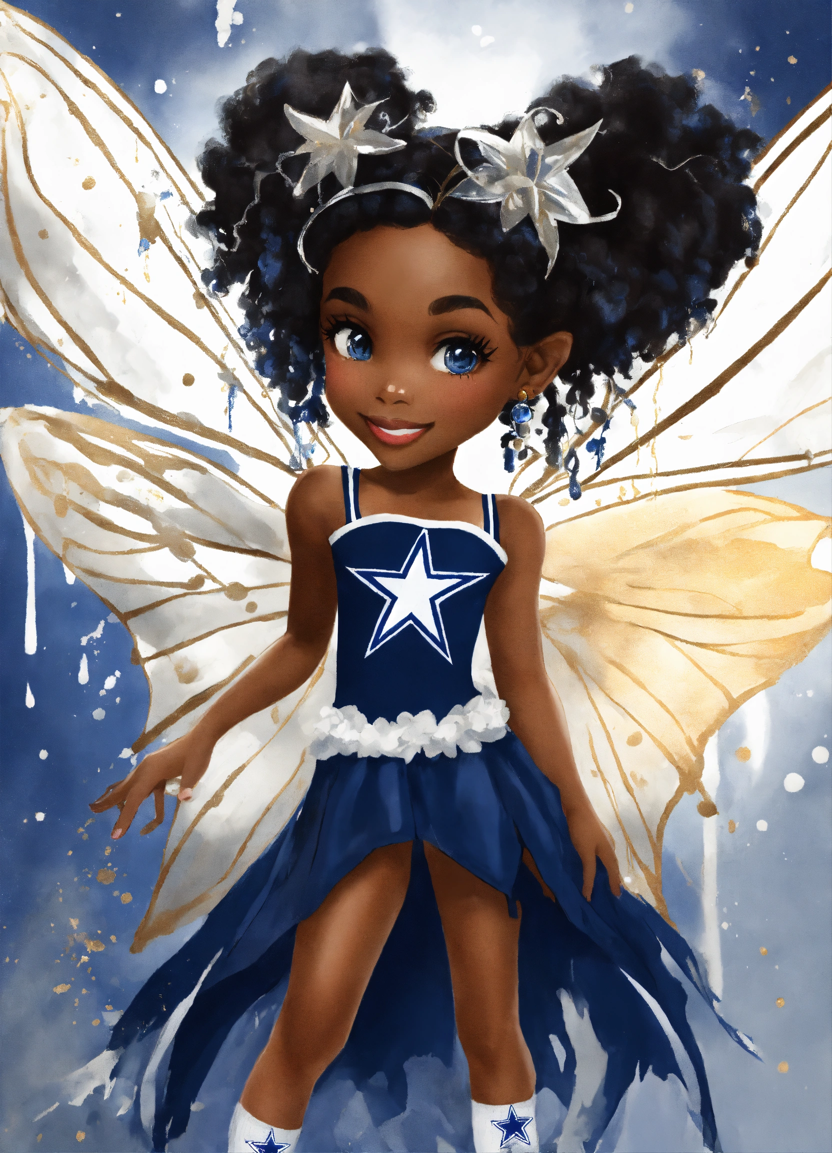 Create an african american fairy, in the style of disney, with a dallas cowboys jersey, with a navy blue and silver splash dripping on a white background
