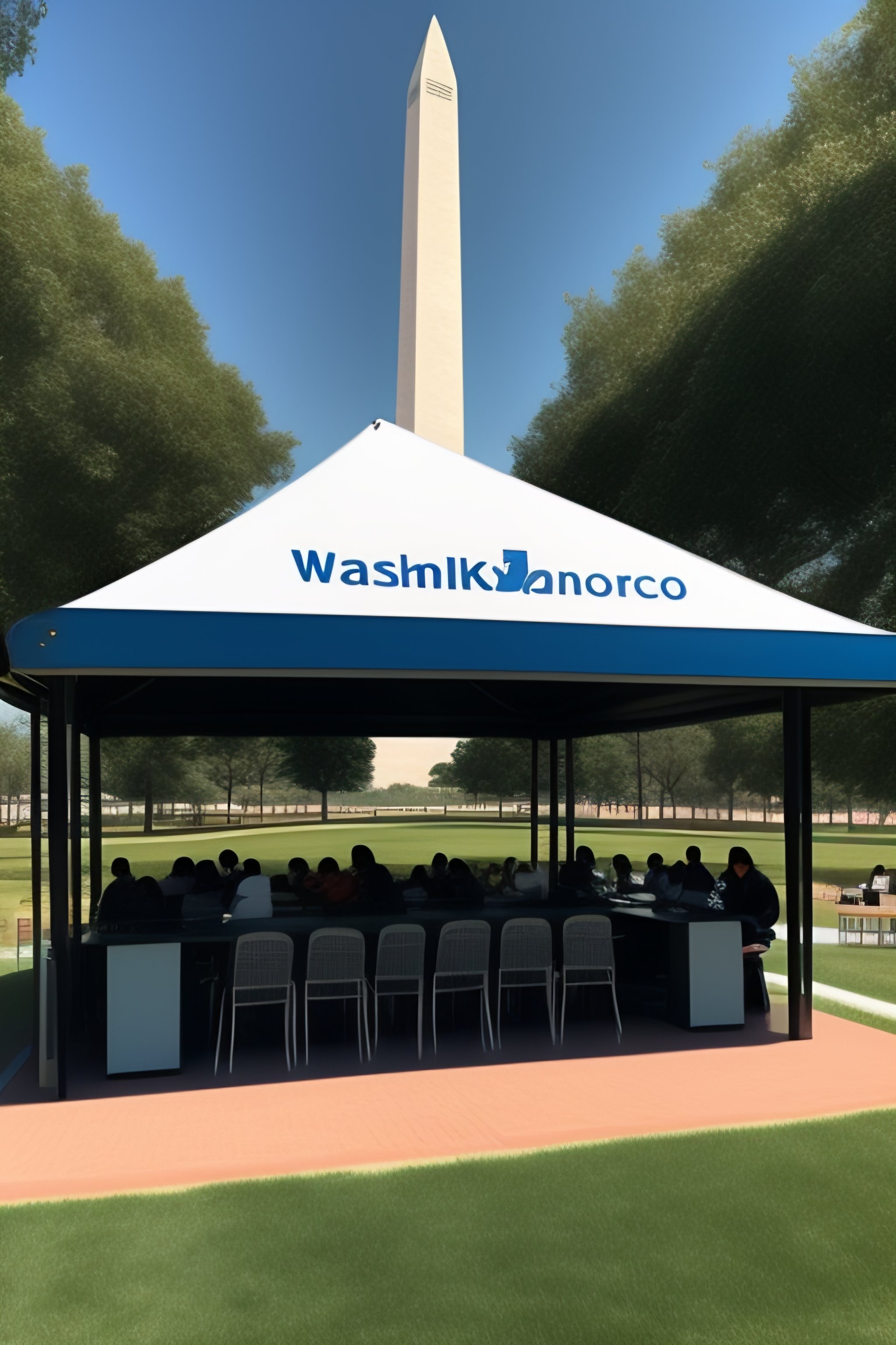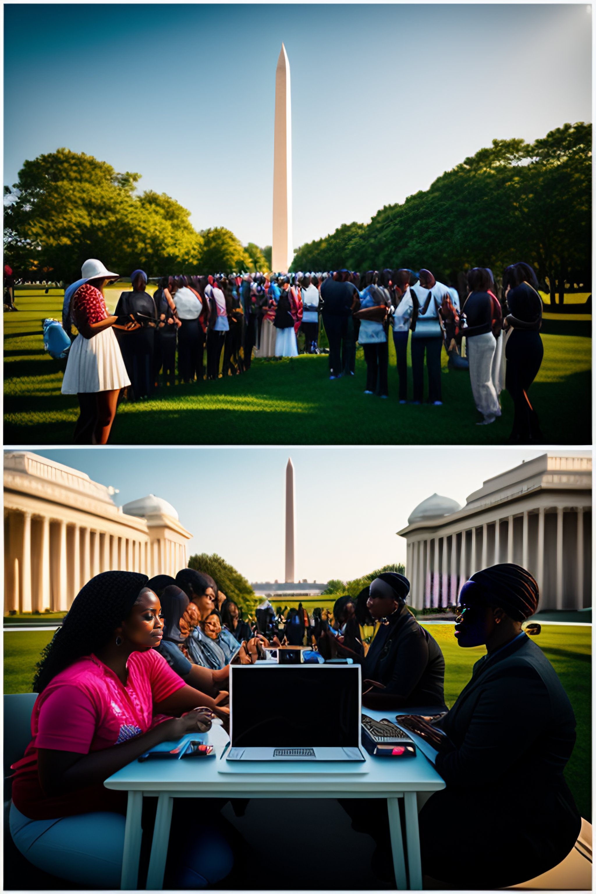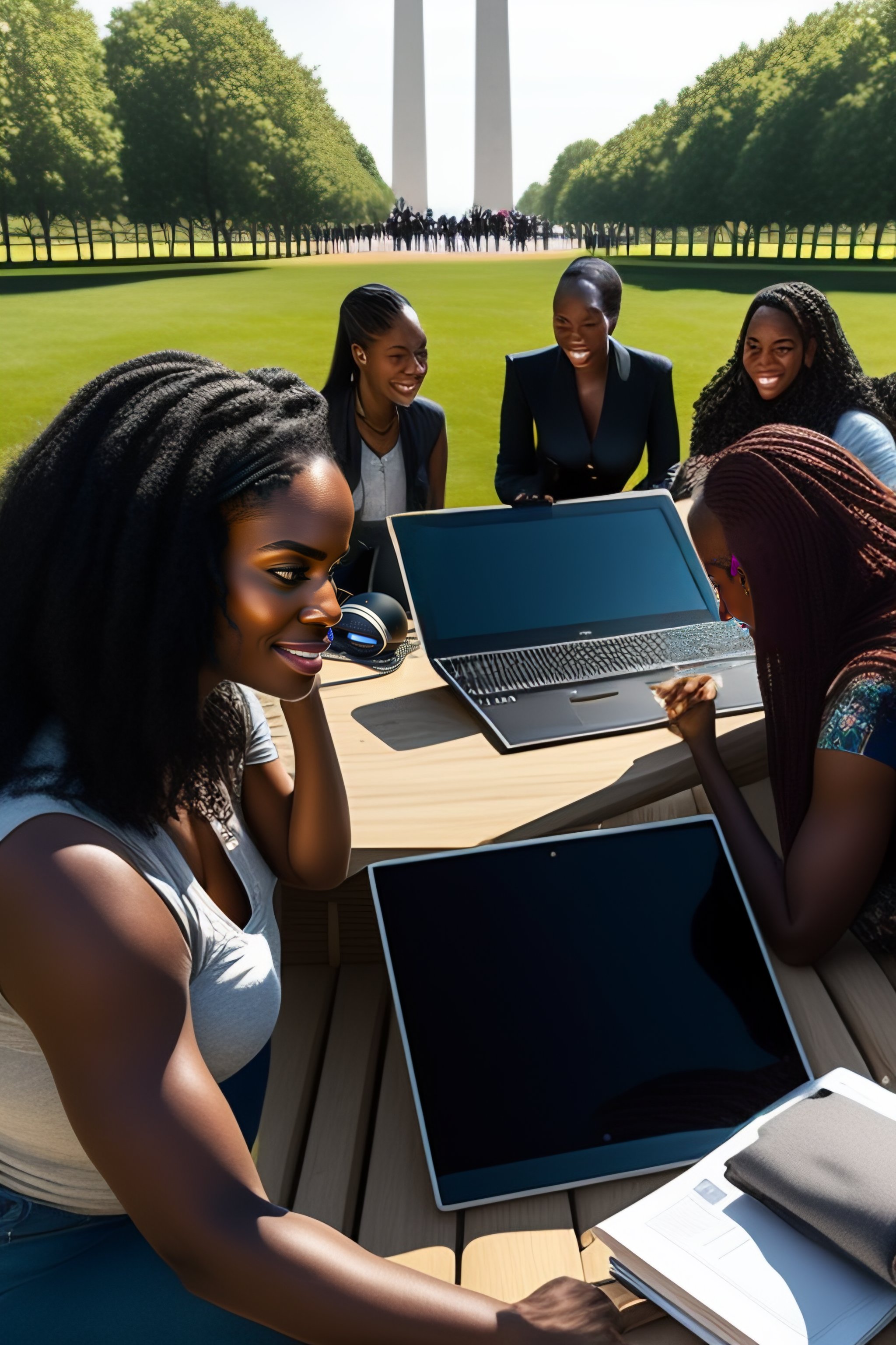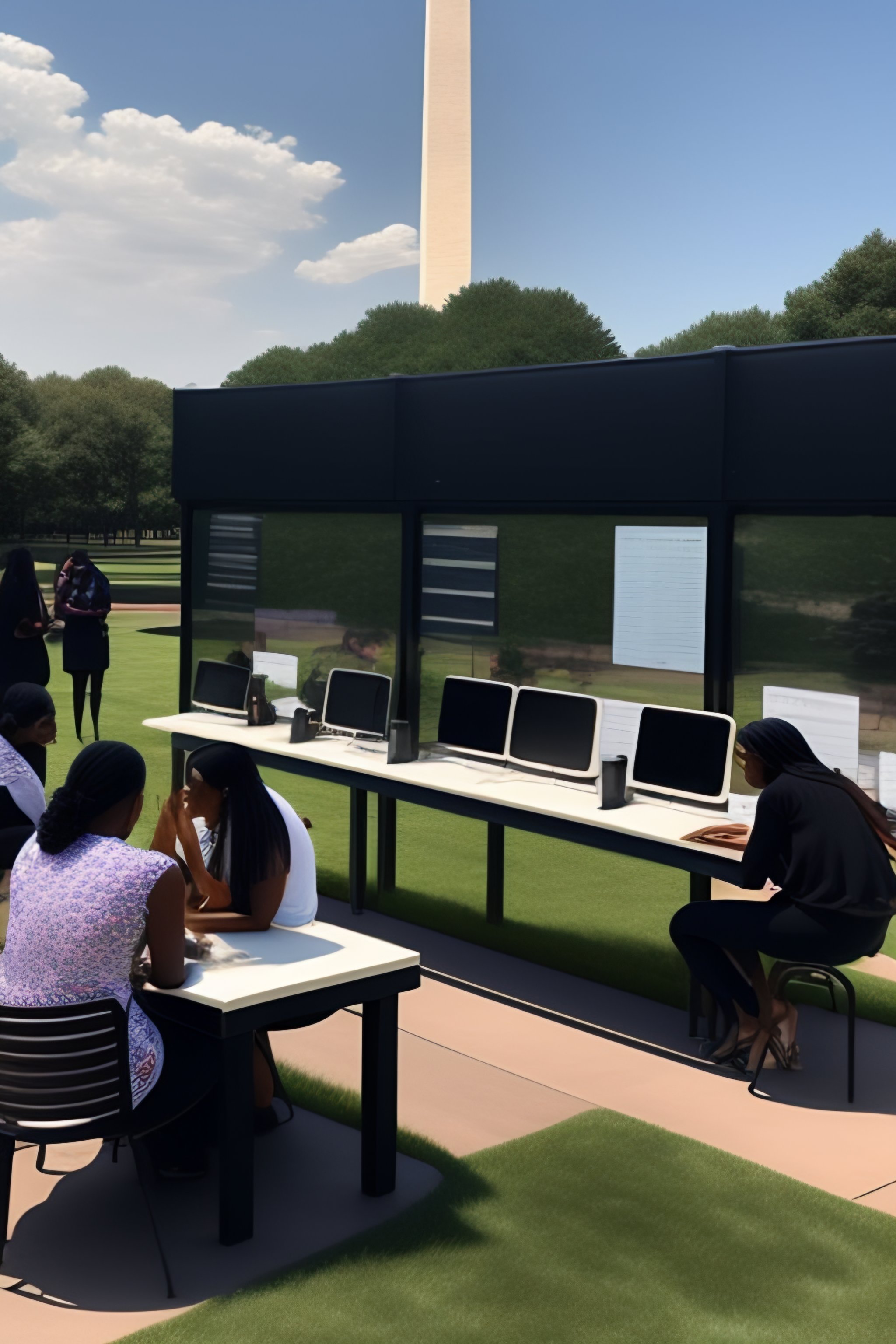 An outdoor computer lab with many women and people of color near the washington monument