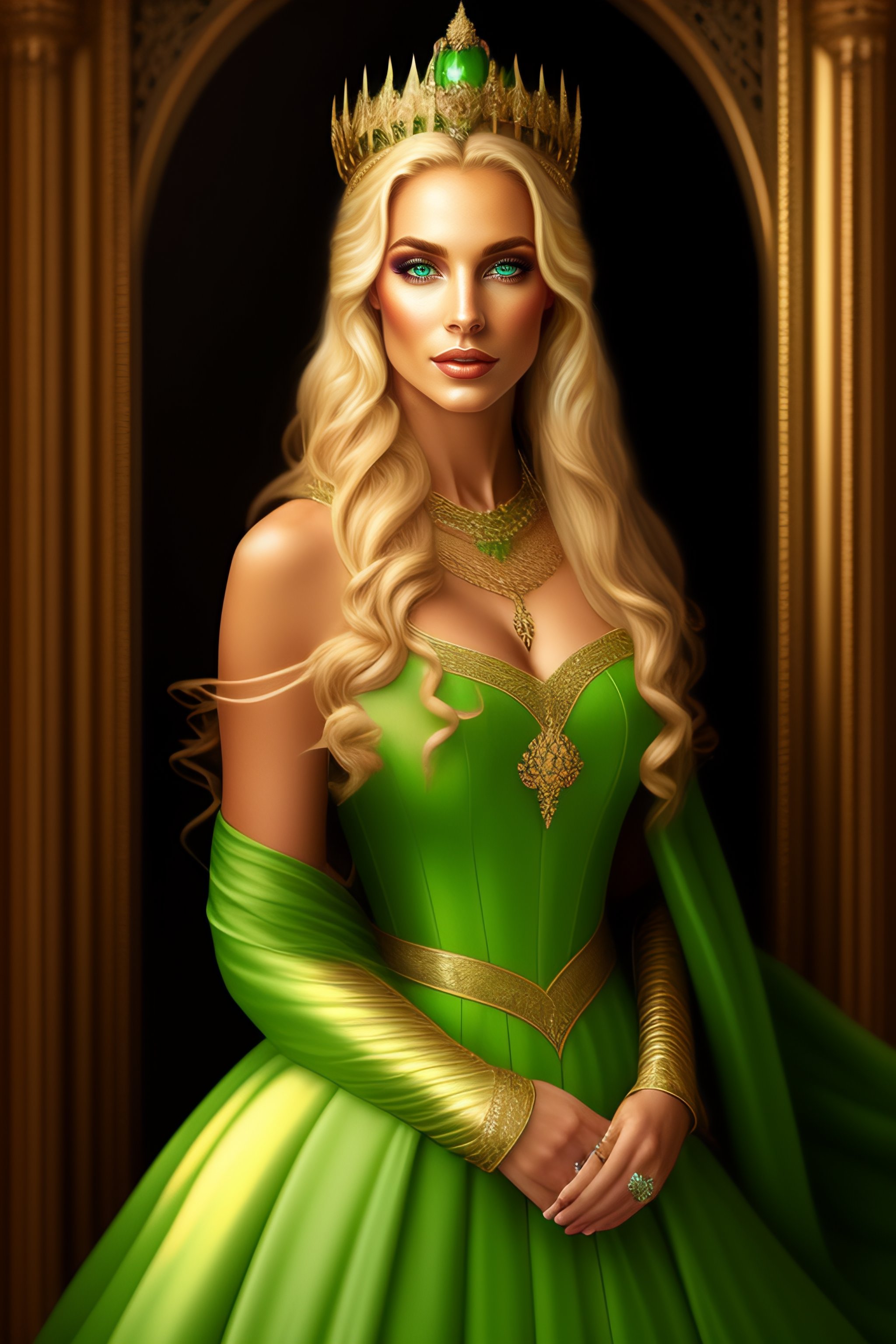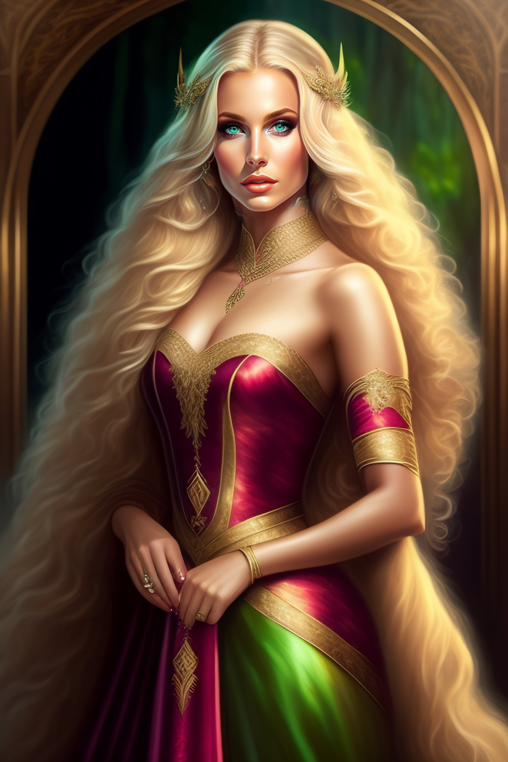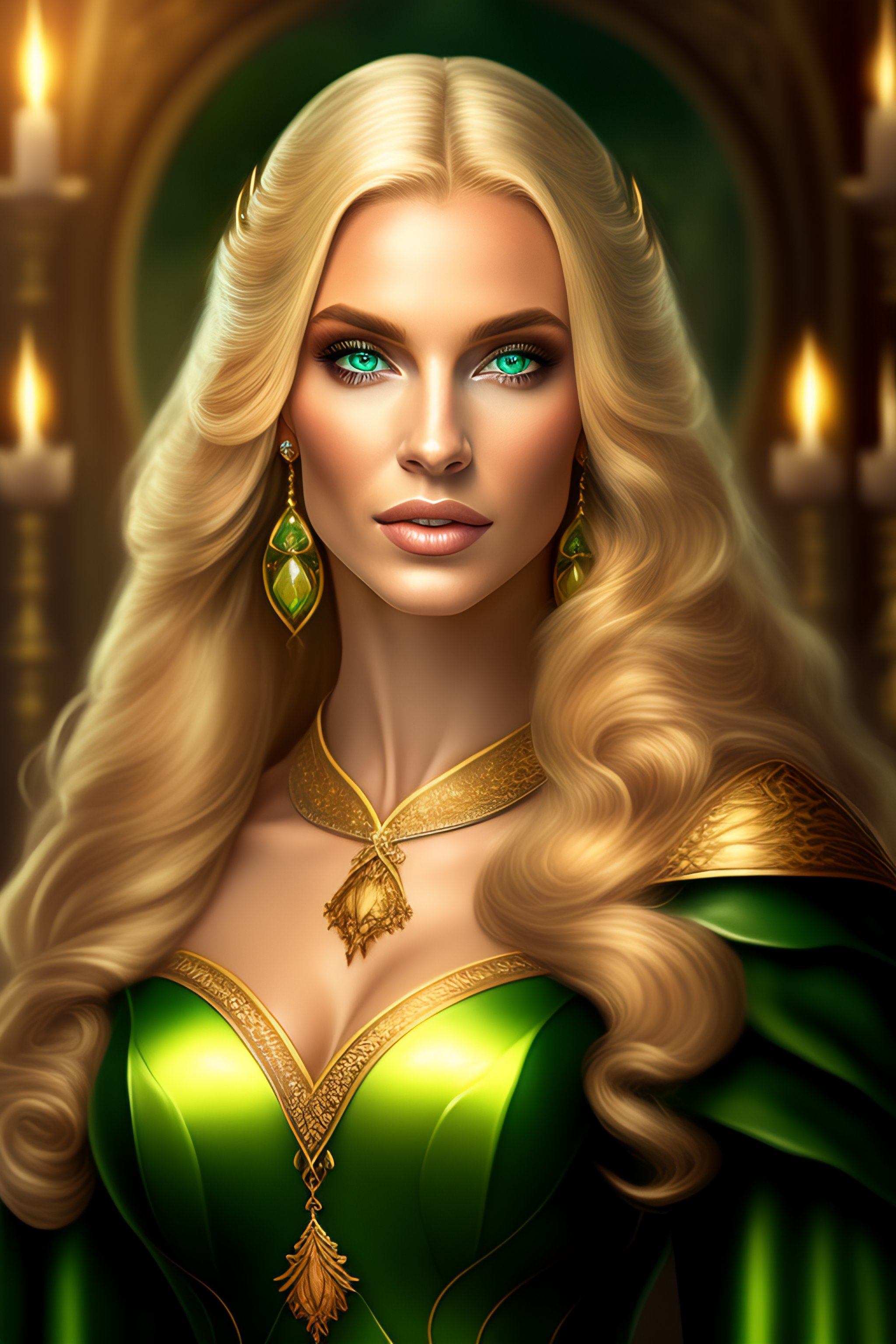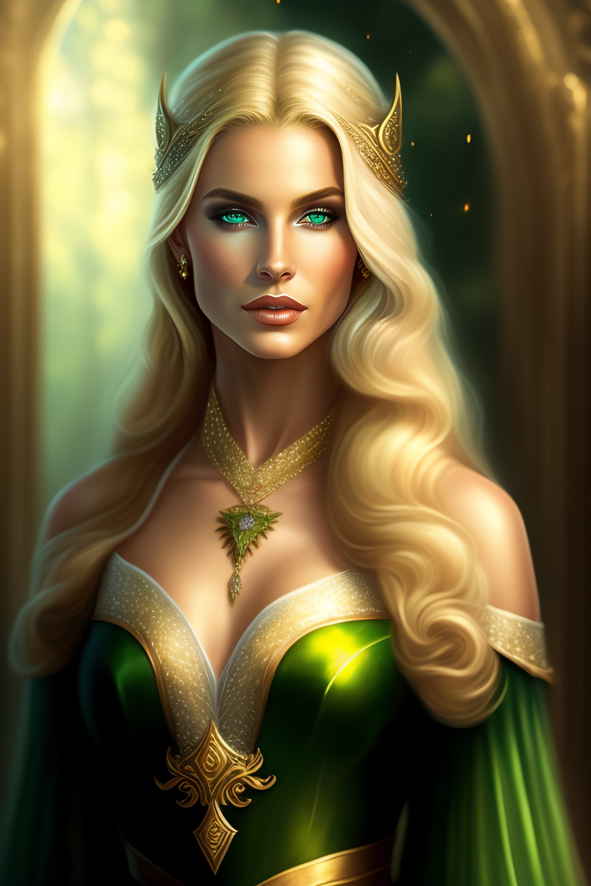High elf beautiful blonde female green eyes full body portrait wearing an elegant gown casting a spell