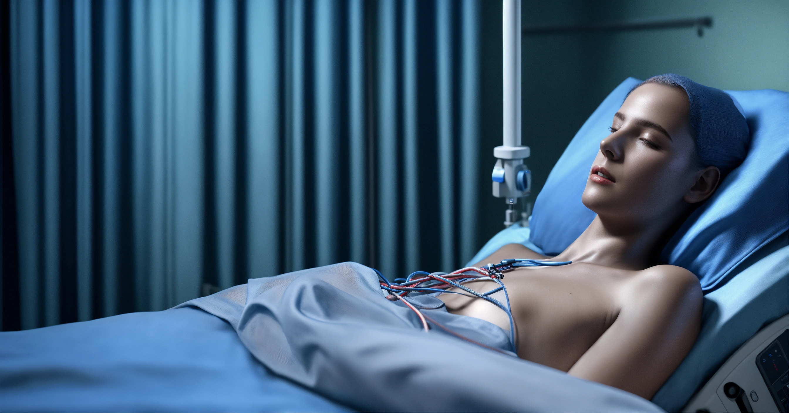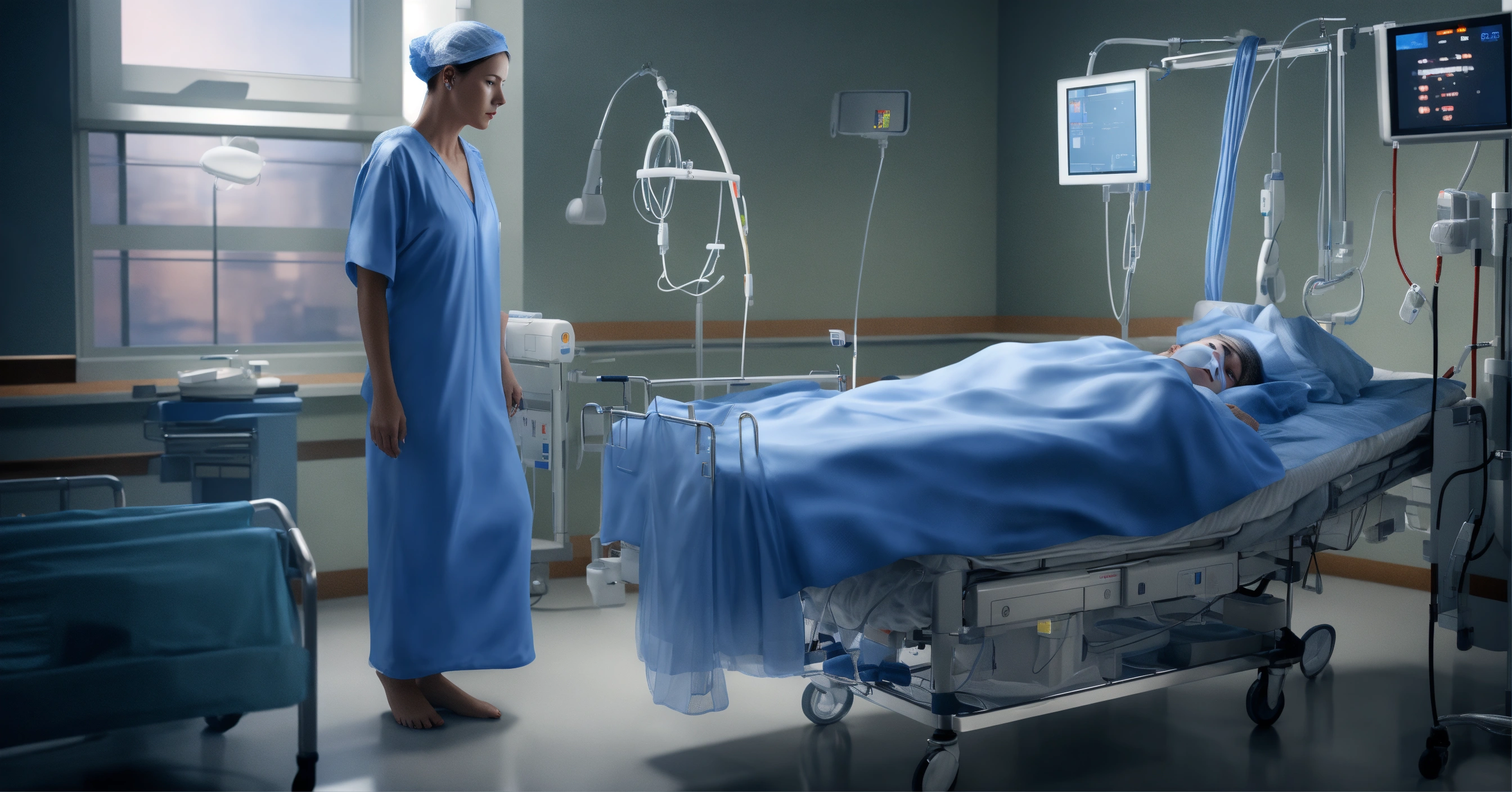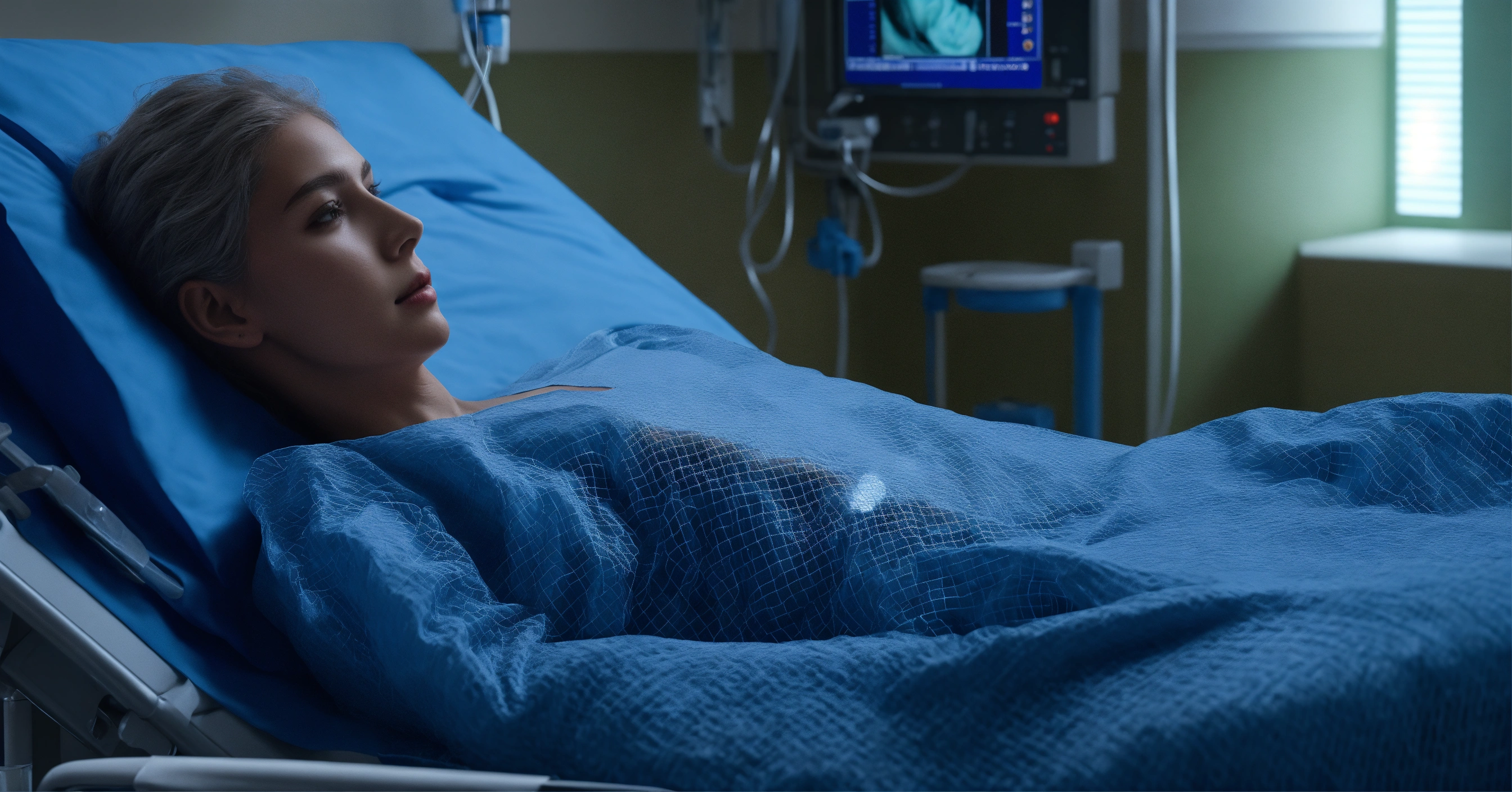 Hospital patient made of aluminum mesh and wires in a blue cotton nightgown, photorealism, hd, 4k, dynamic color