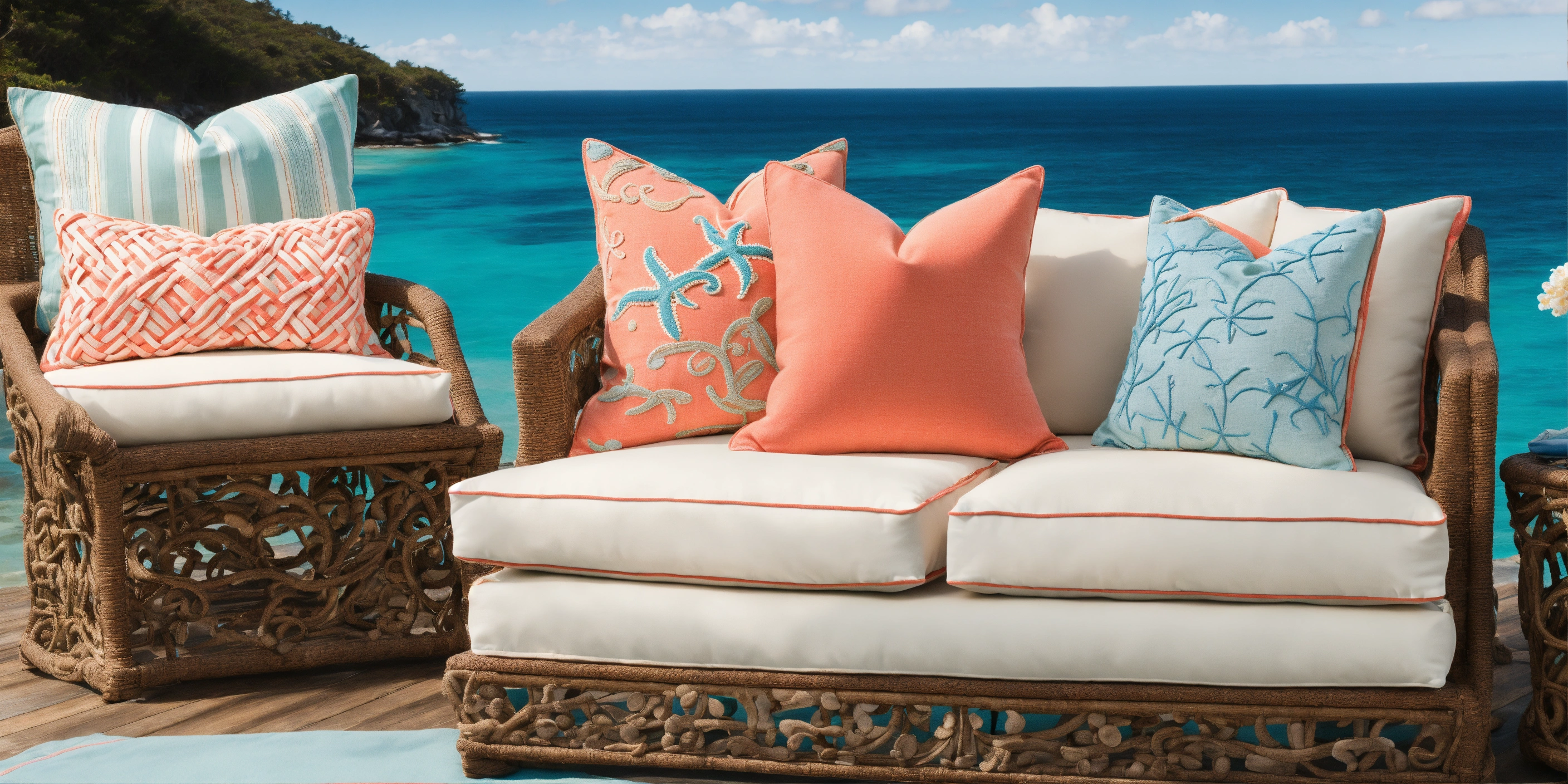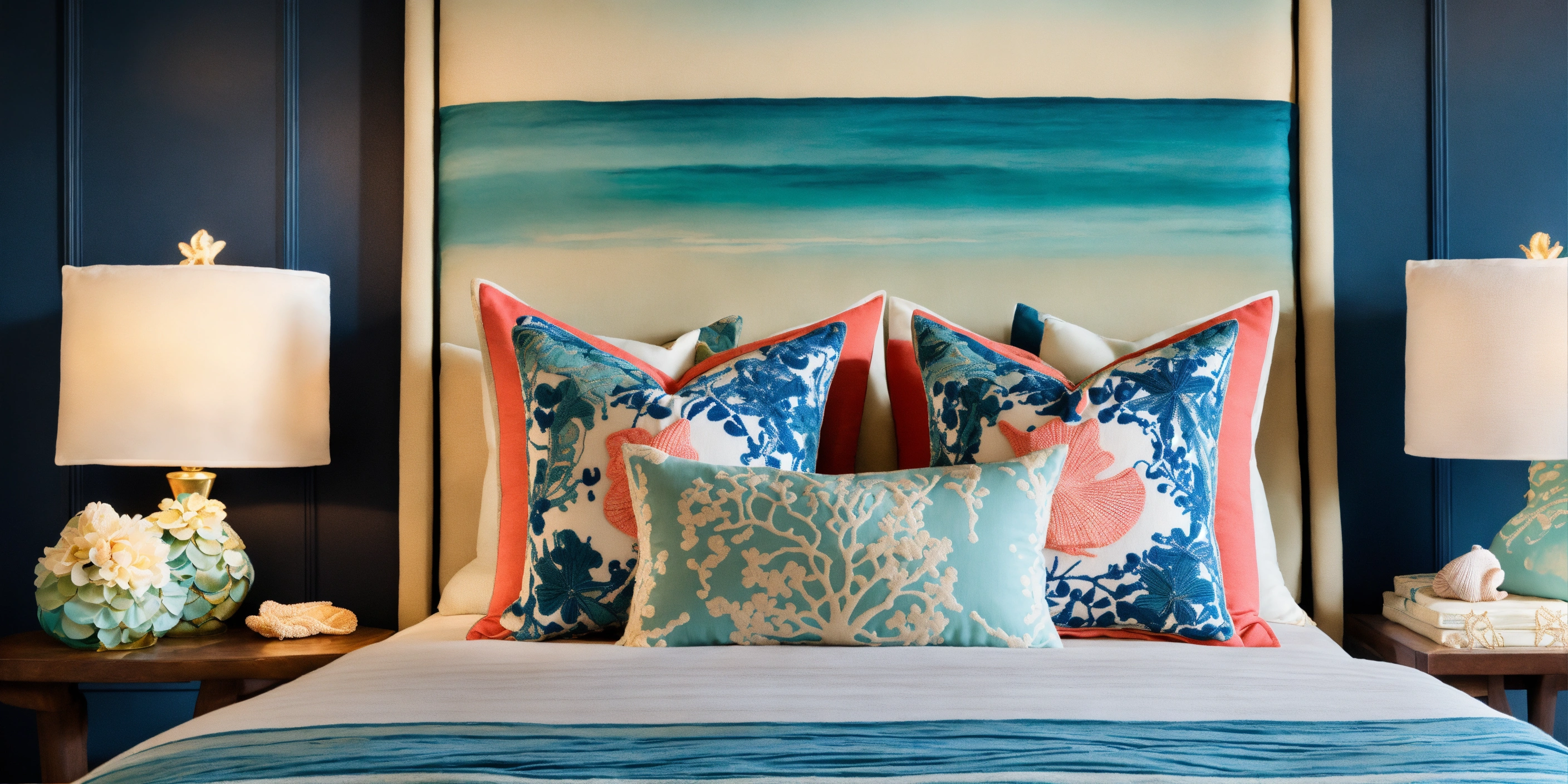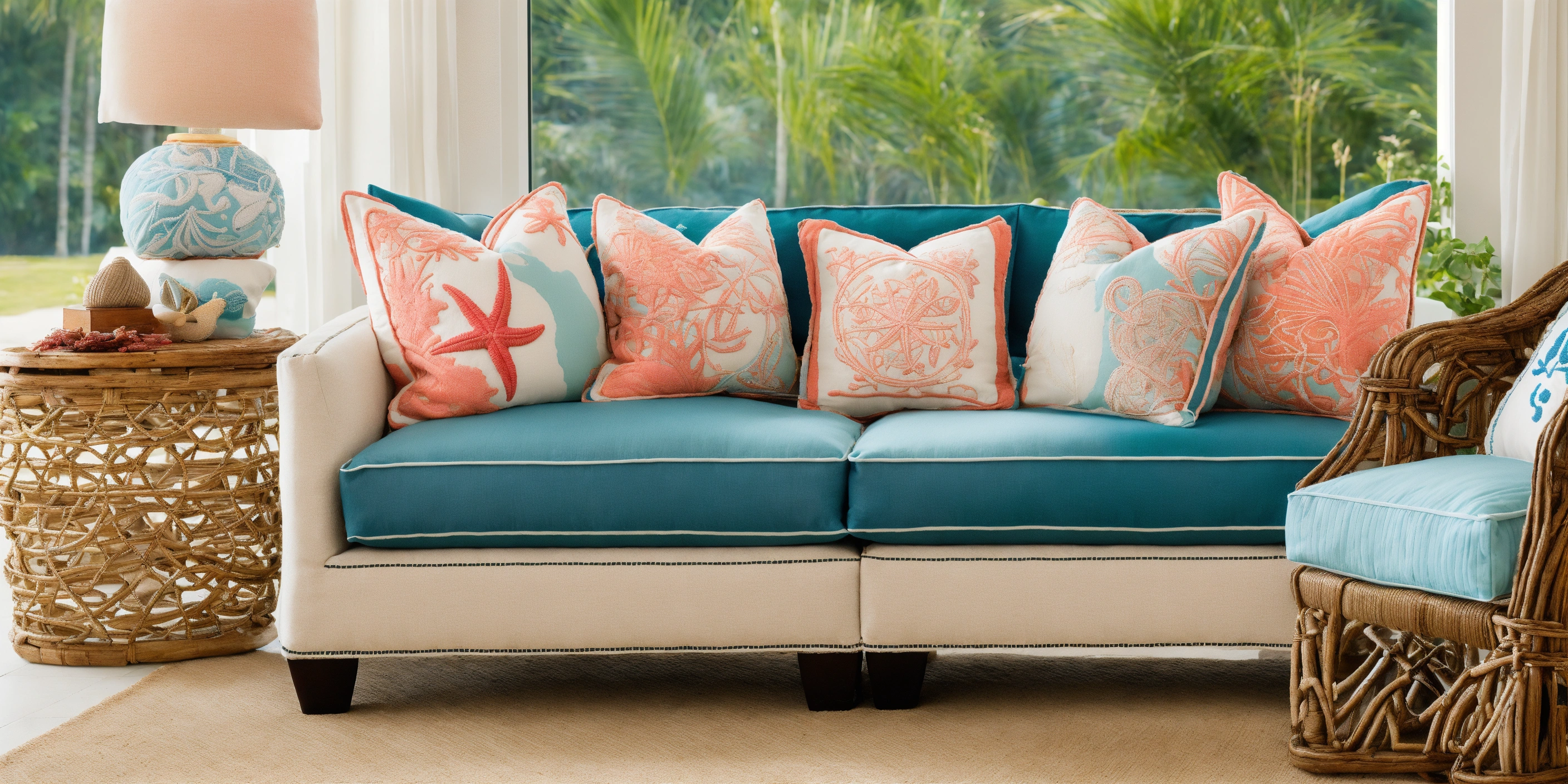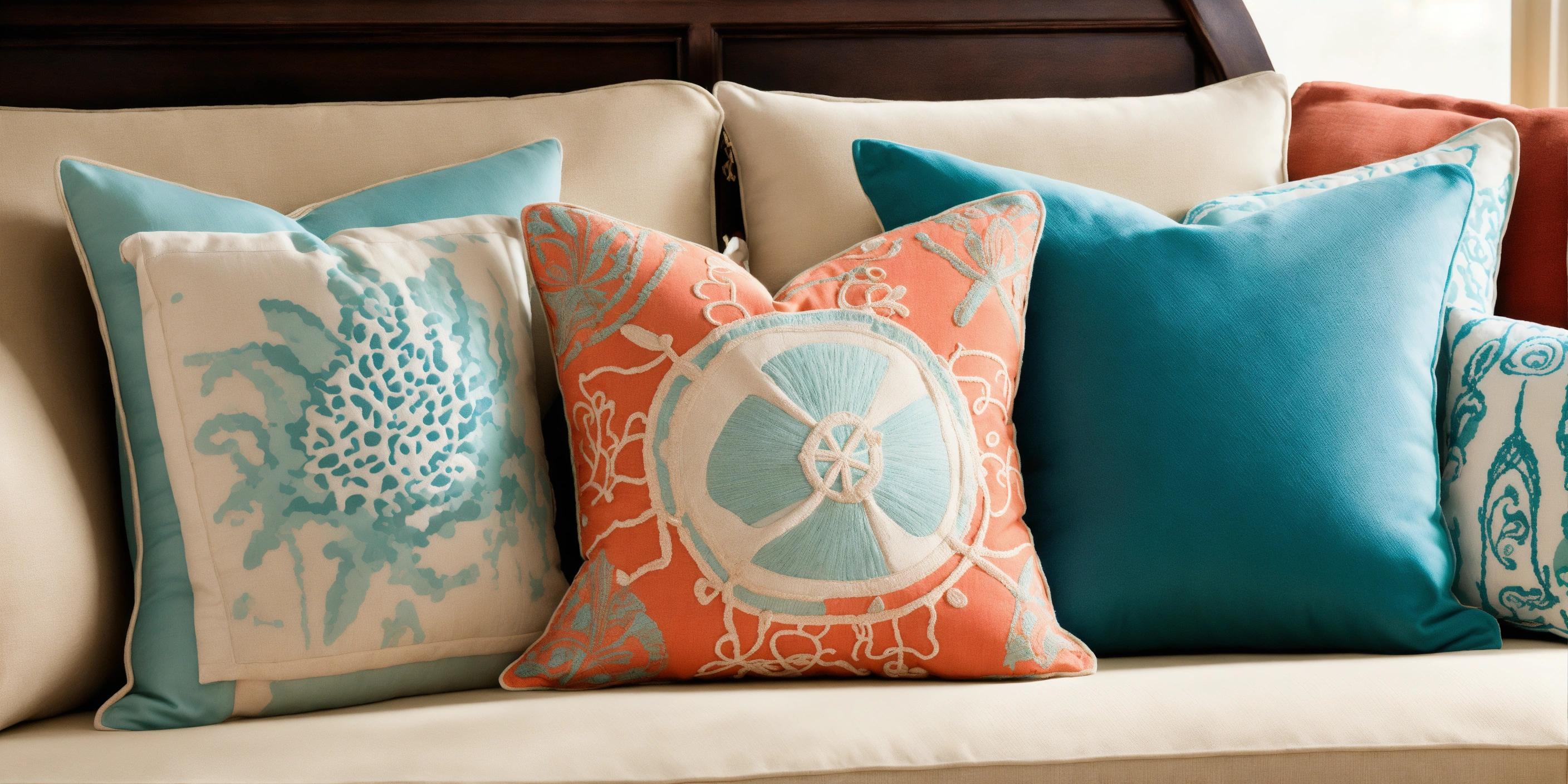 Create images of luxury decorative accent pillows inspired by coastal hamptons style. the pillows should feature soft hues of blues, seafoam green, and coral pink. incorporate maritime elements like seashells, starfish, and sailor knots through intricate designs or embroidery on the pillow surfaces. the fabrics should look luxurious and textures should be inviting. the goal is to evoke the feel of a sophisticated coastal setting, with each pillow appearing as a standalone piece of art, perfectly fitting into a luxurious beachside home.