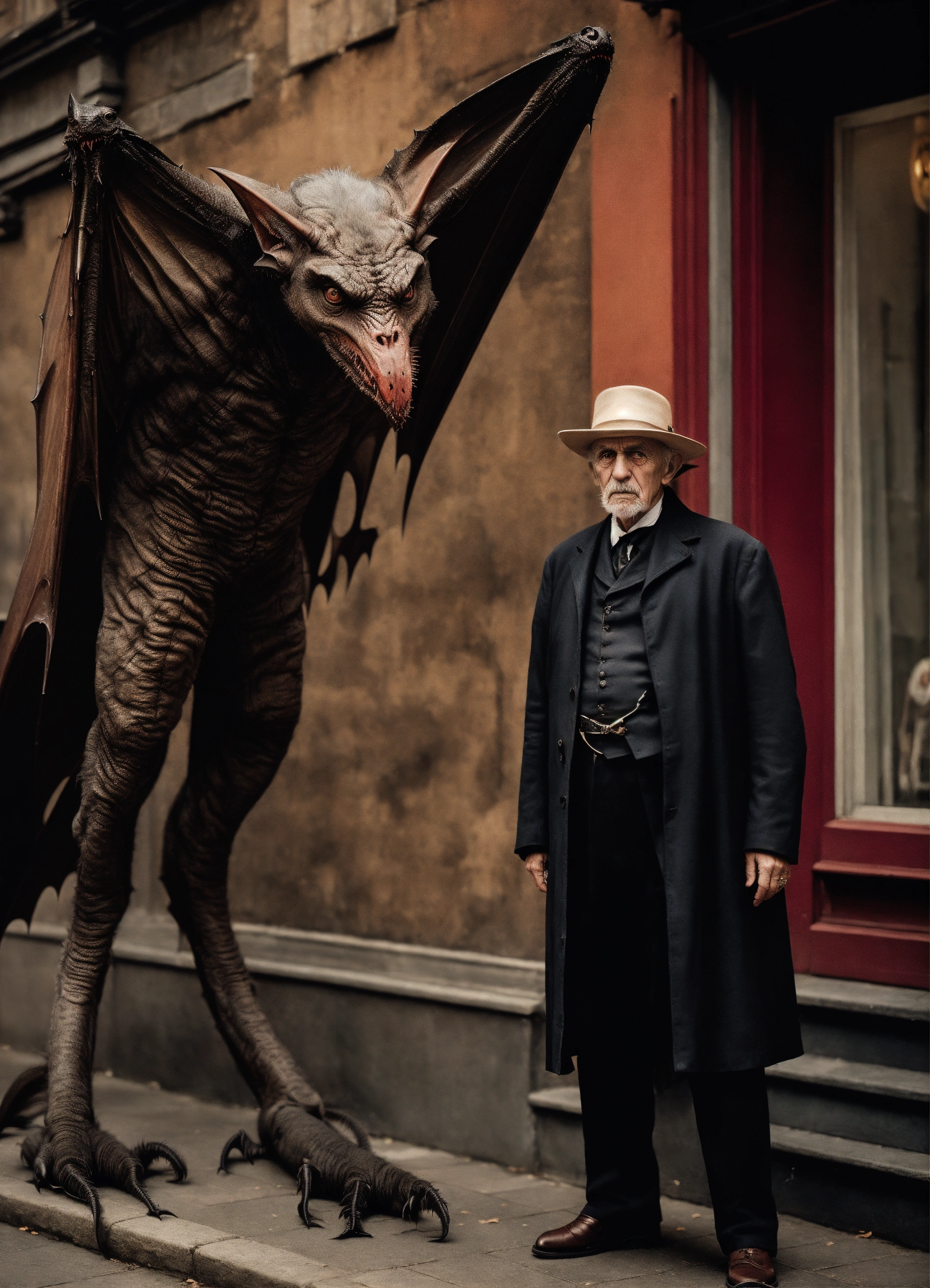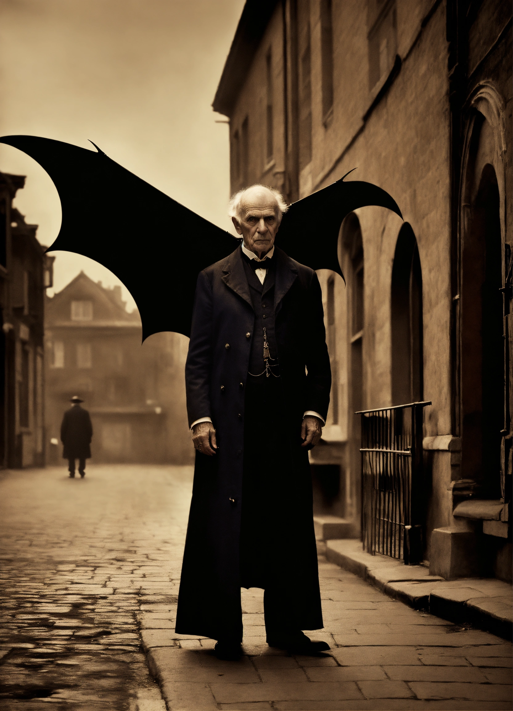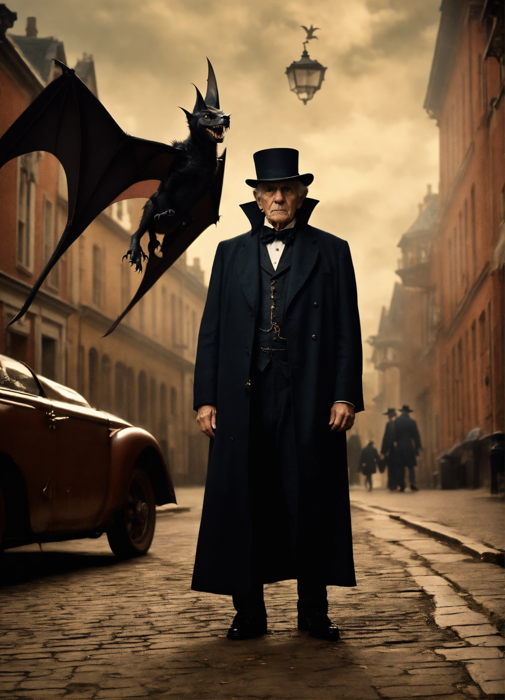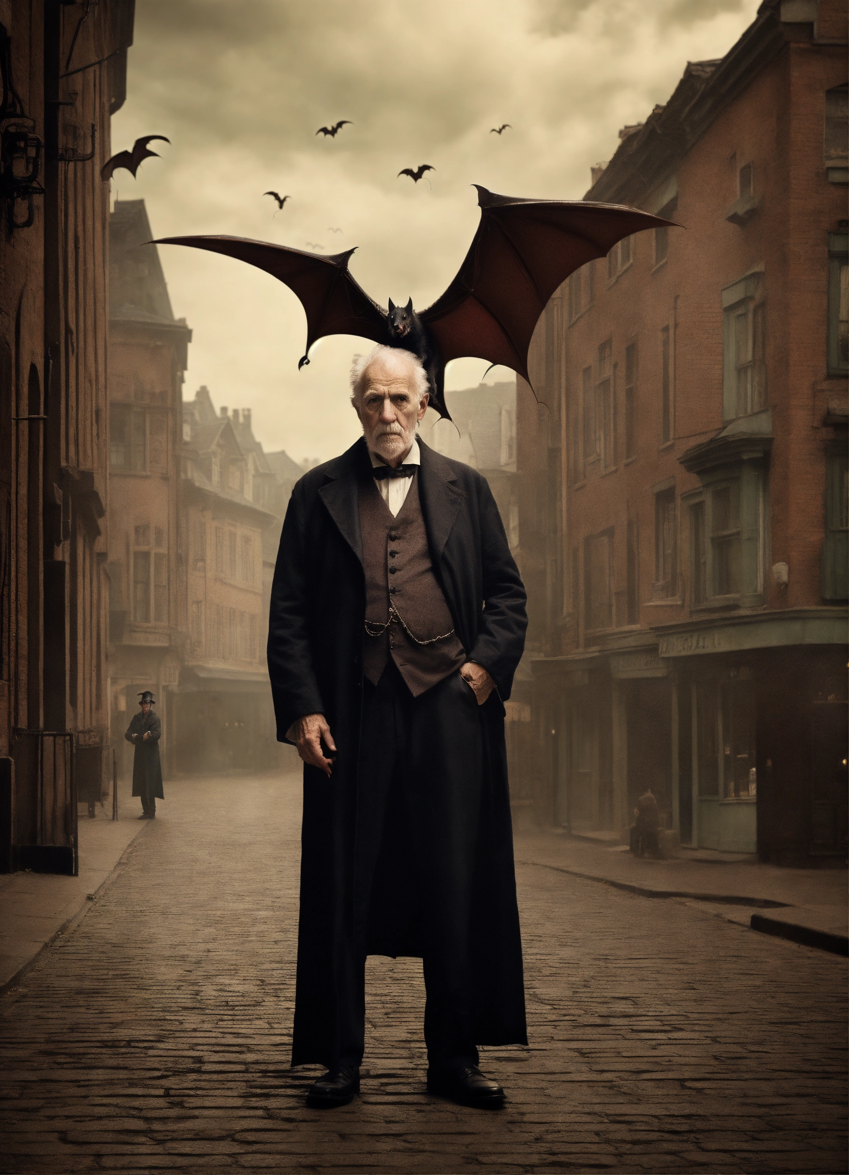 Old vampire man standing next to a giant bat monster, in a old town street, in the style of contemporary vintage photography, necronomicon illustrations, tabletop photography, 1890, hyperrealistic animal portraits, ghostly presence, whirring contrivances