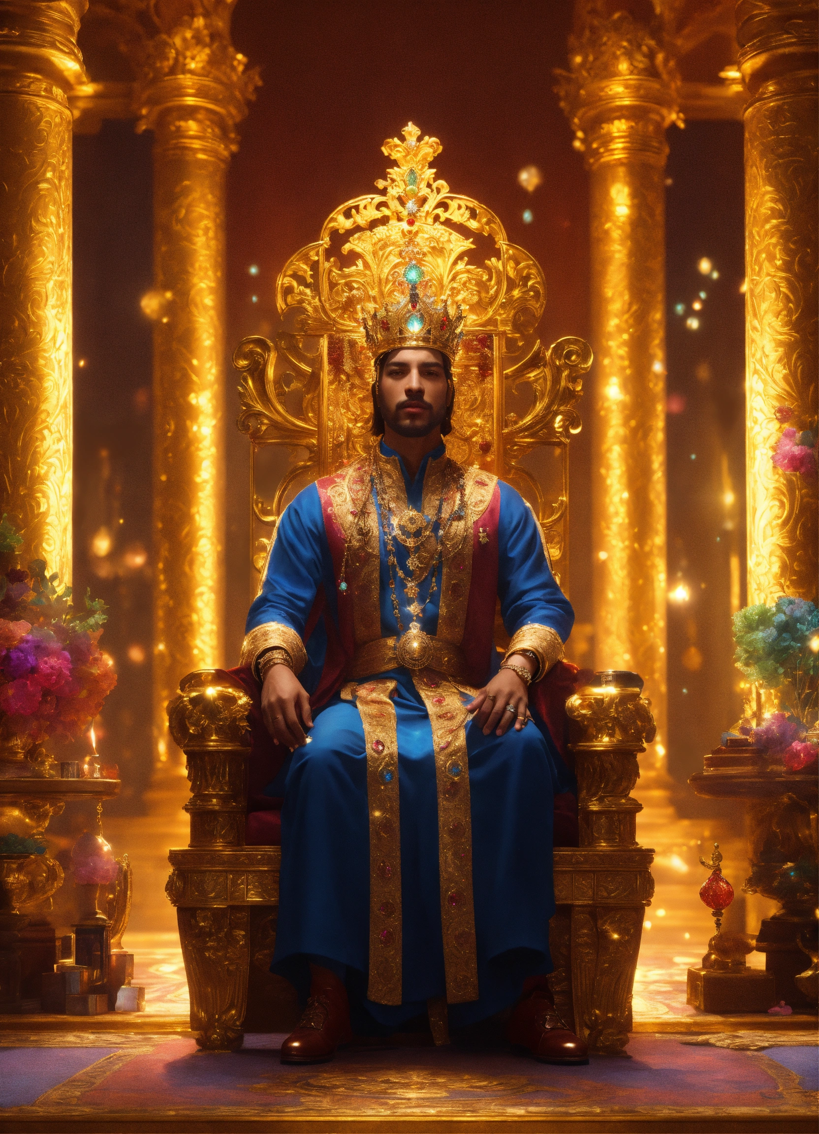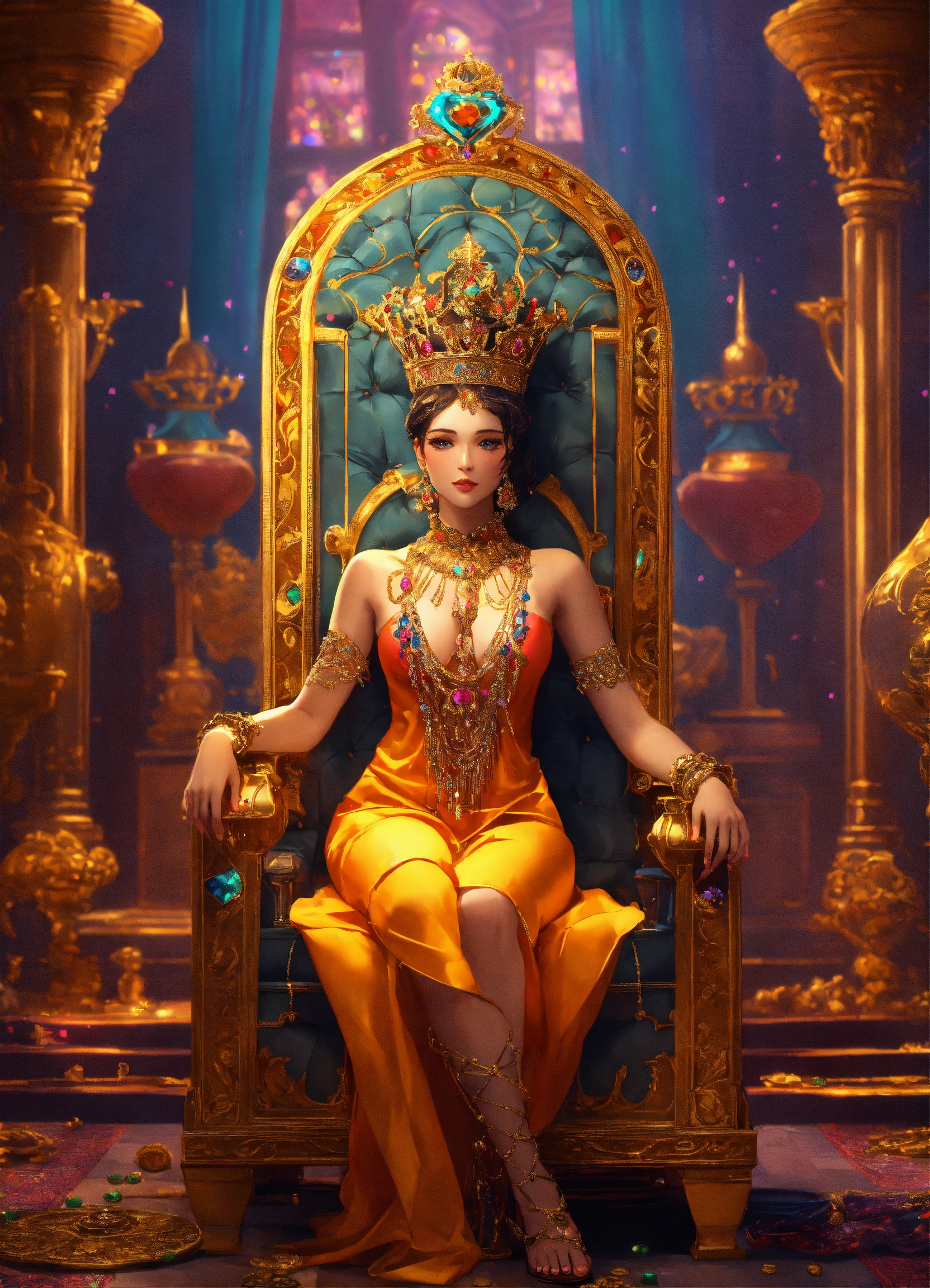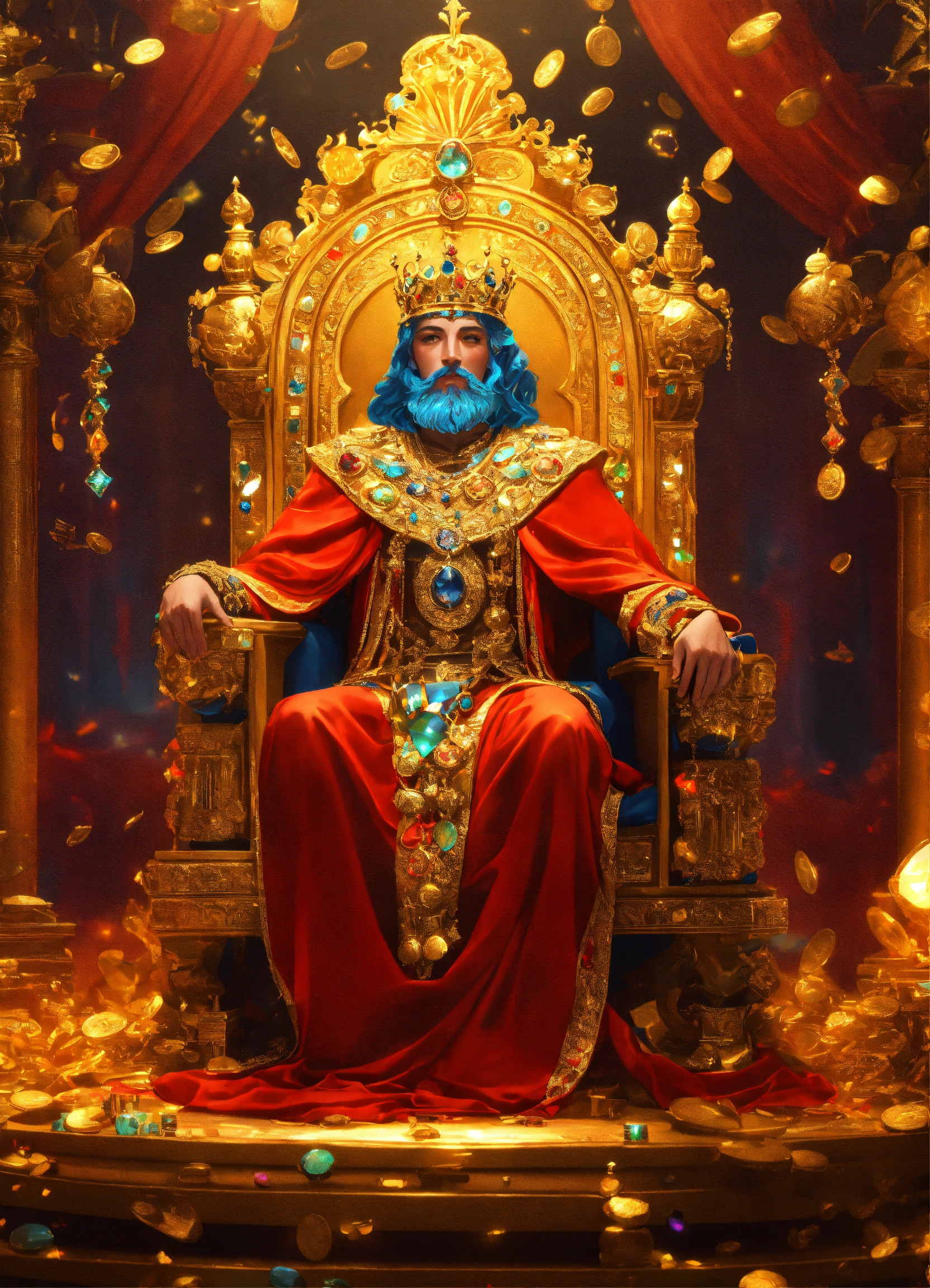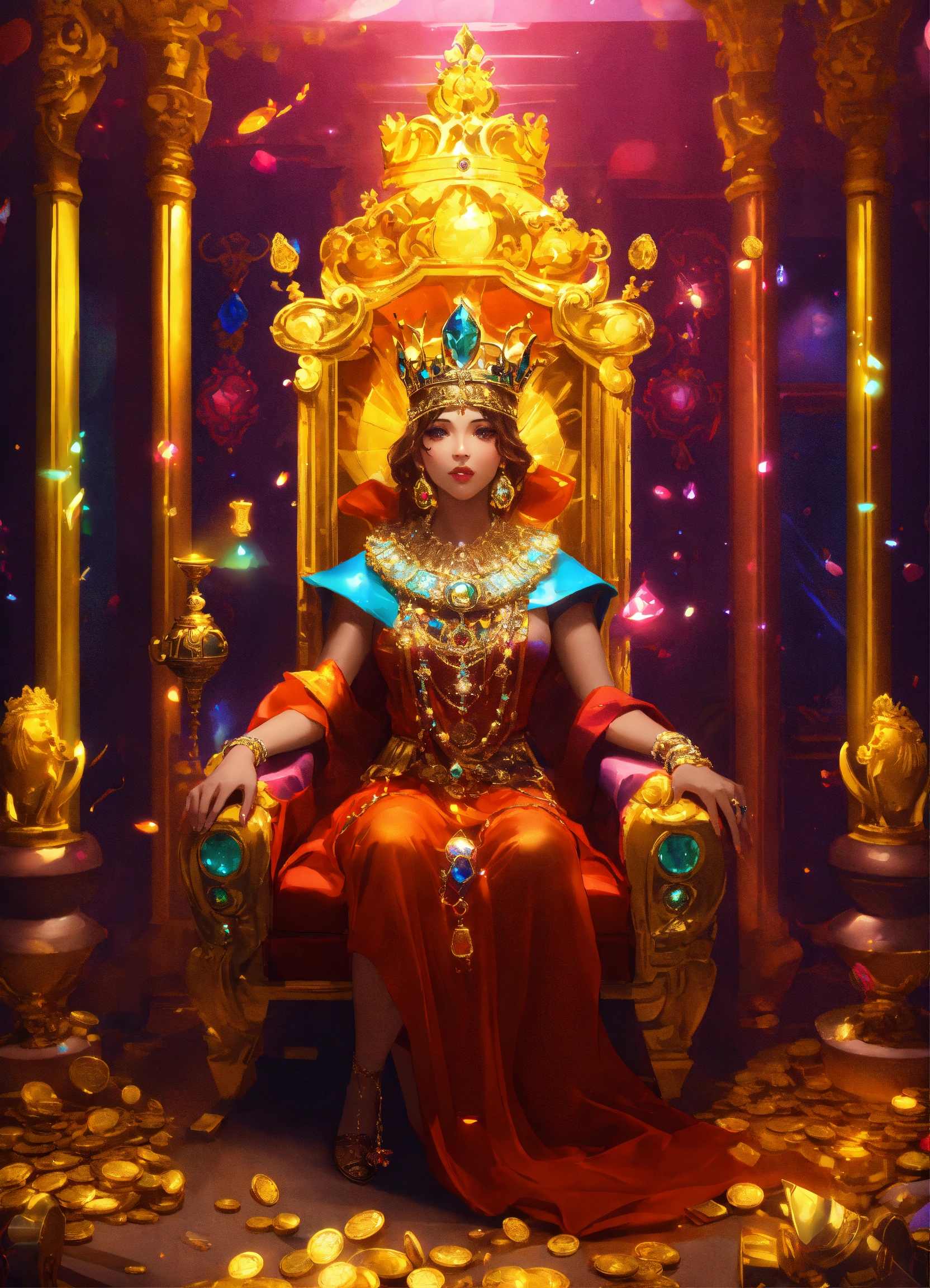 "digital illustration, a regal figure seated on a throne made of gold and gemstones, with an ornate crown on their head. surrounding them are treasure chests overflowing with jewels, coins, and artifacts. the ambiance is of grandeur and affluence. art styles fantasy digital art with vibrant colors, art inspirations art station and dribble, camera frontal view using a 35mm lens, render high resolution, ambient lighting with sparkling