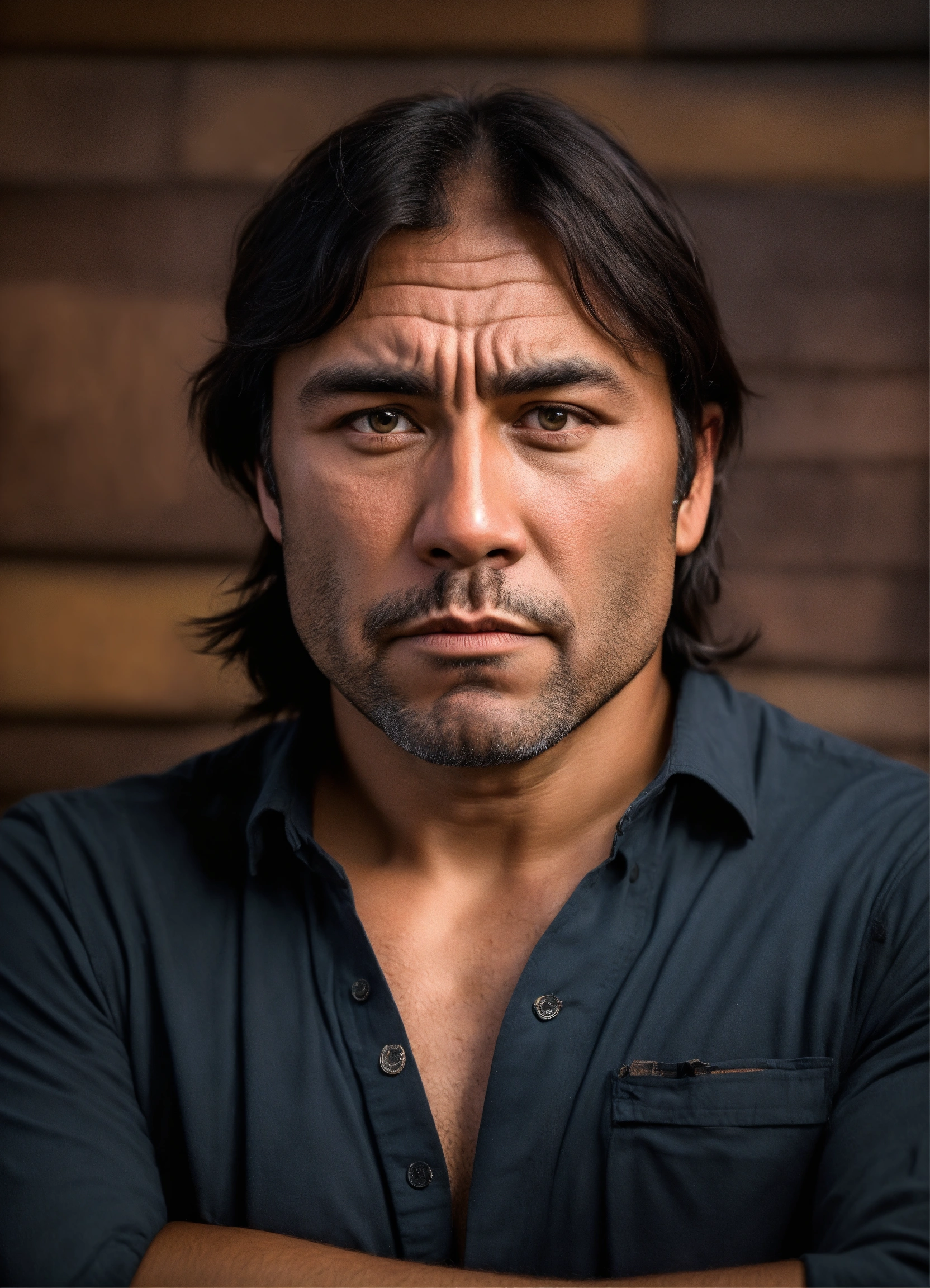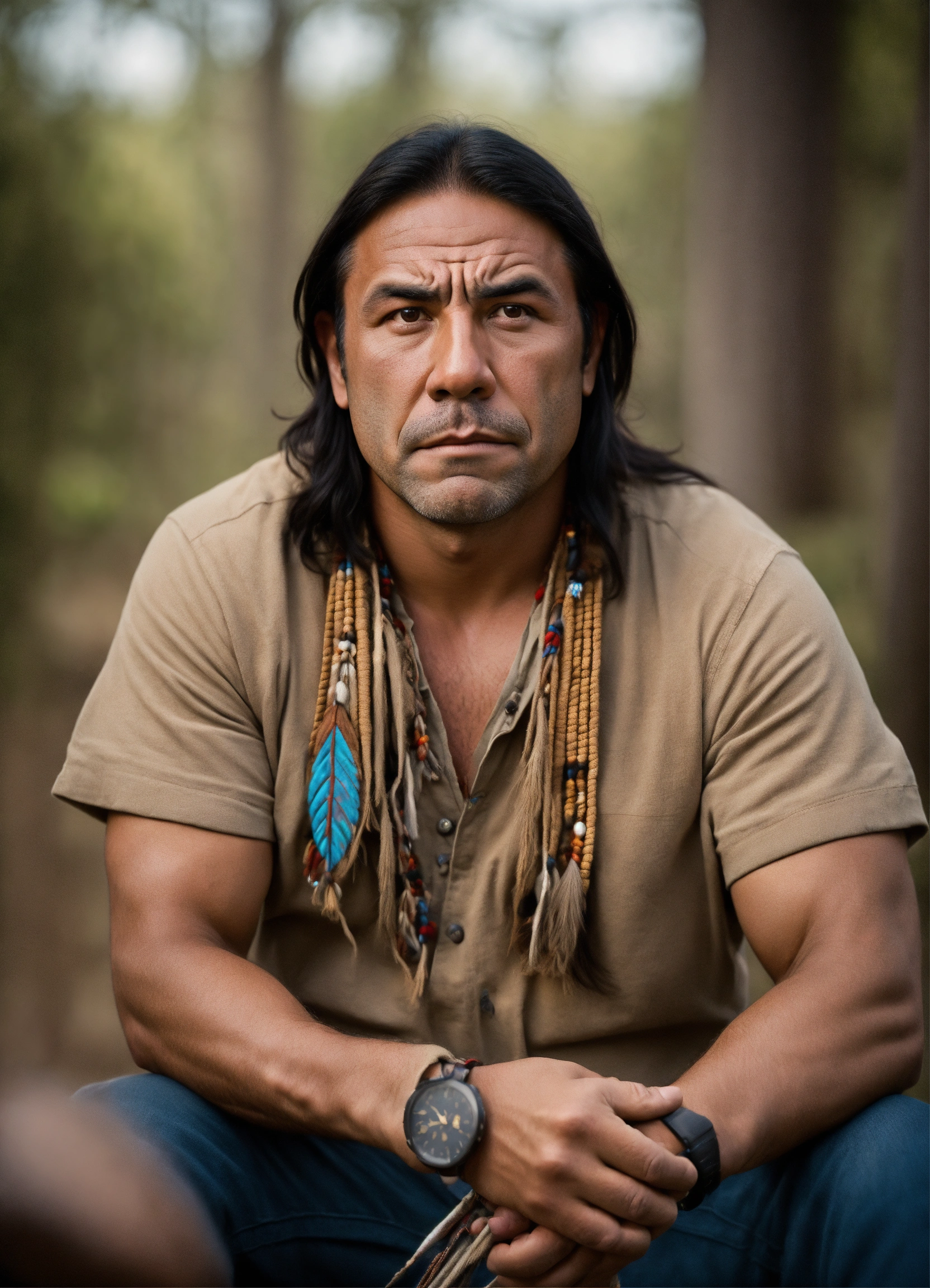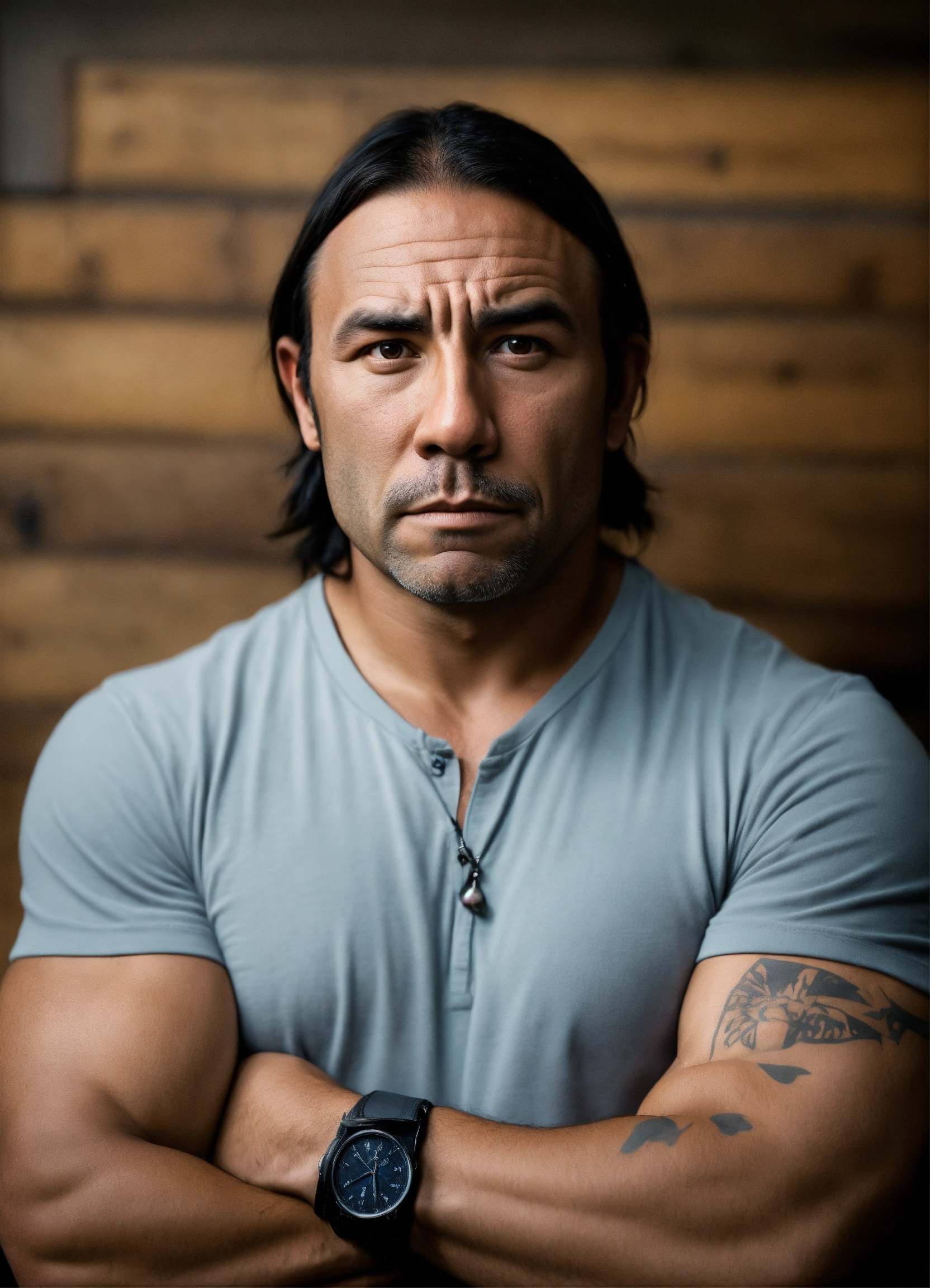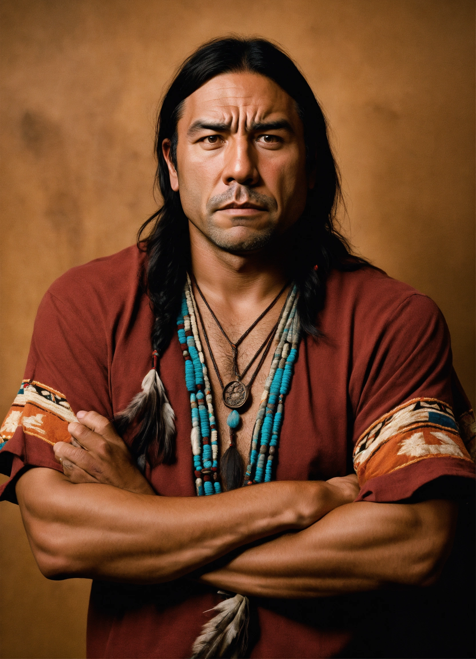 Scared native american man, front view, casual clothes, arms crossed, looking at the camera, unique facial features, unique facial characteristics, joe rogan lookalike