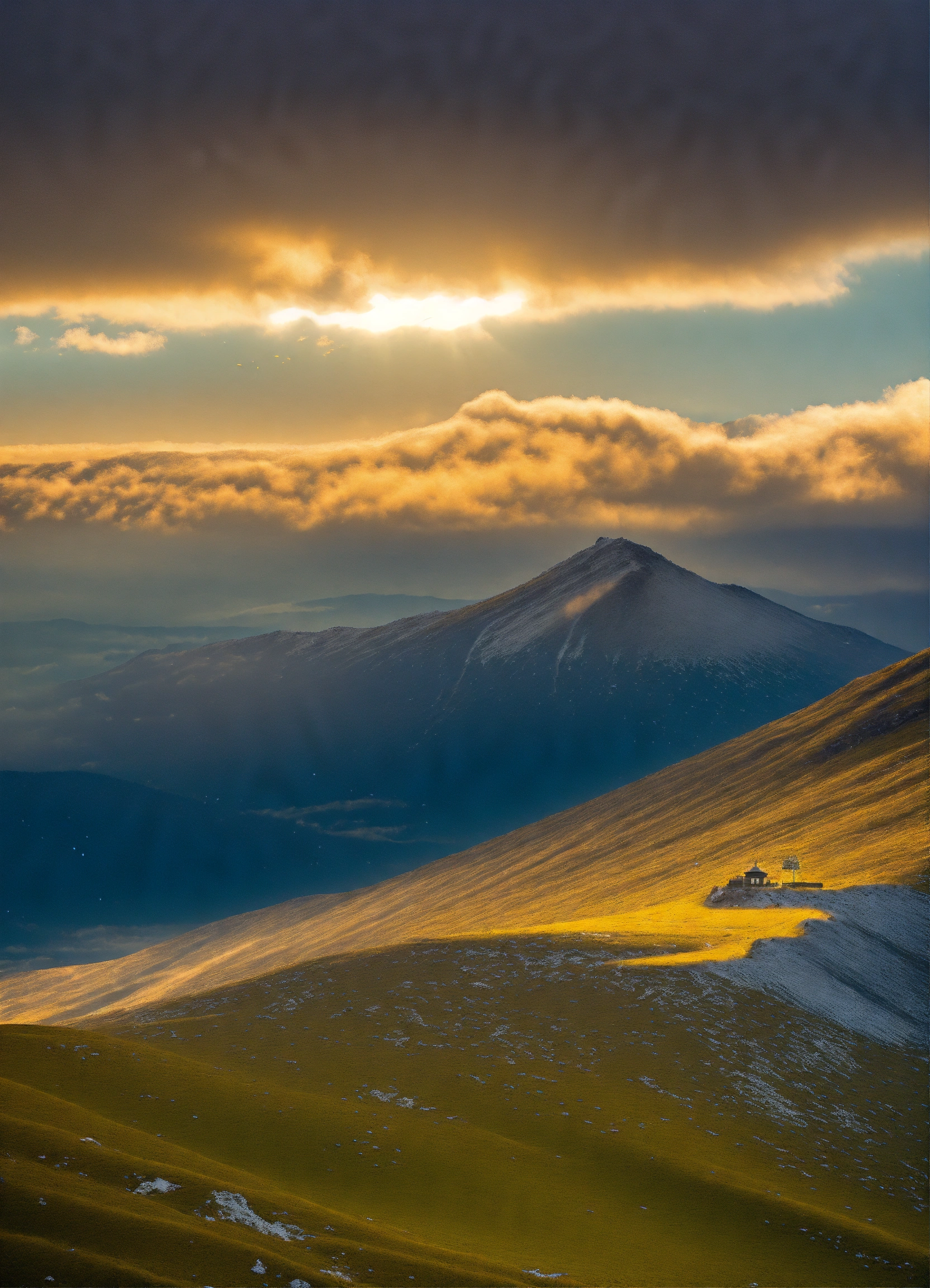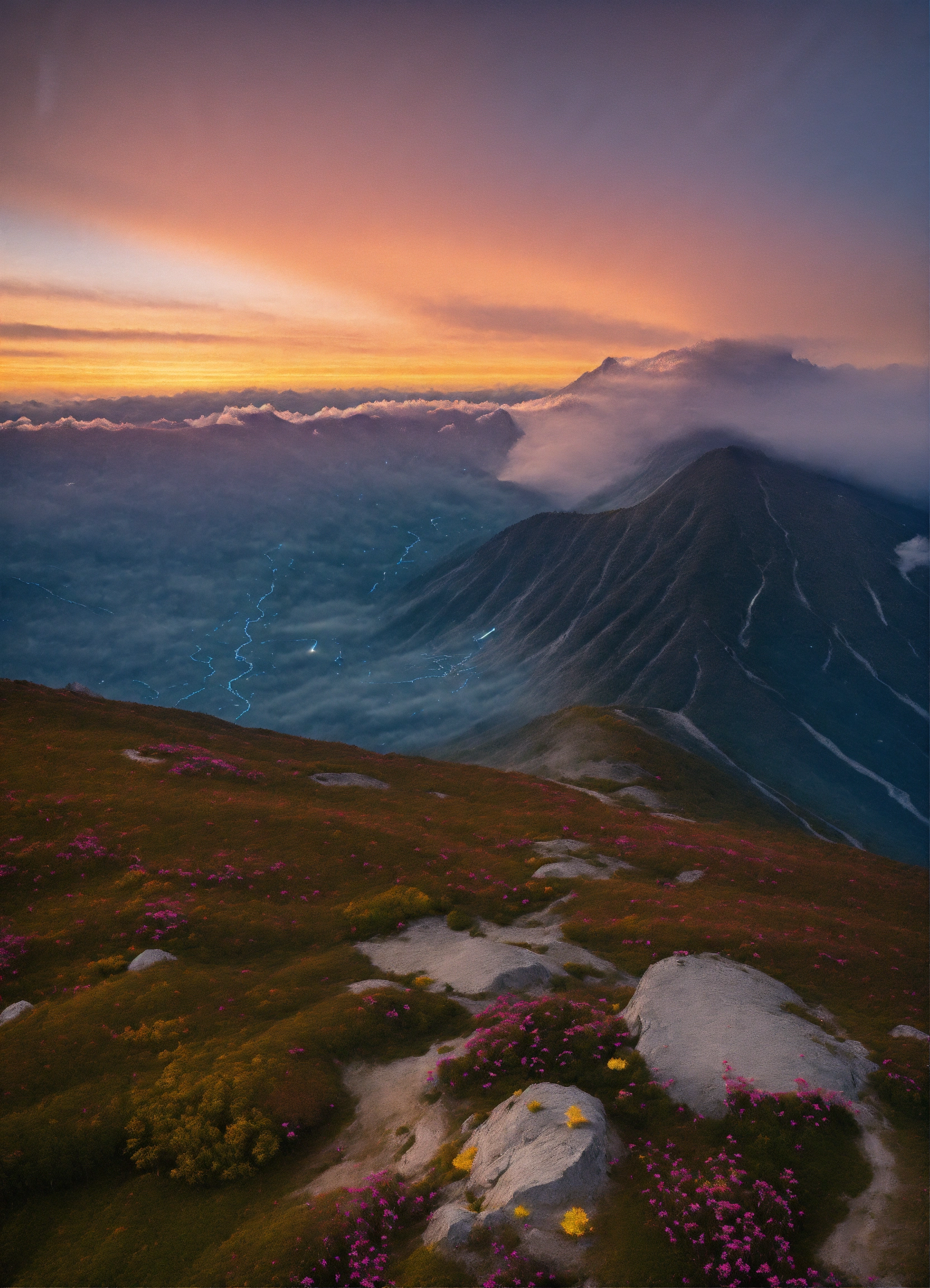 Au sommet d'une montagne scintillante, une personne contemple un horizon infini, où chaque nuage a la forme d'un rêve ou d'une aspiration. de son cœur, un rayon de lumière puissant se projette, attirant à elle des étoiles filantes et des aurores boréales. ces manifestations célestes l'entourent, la bénissant de leur énergie et reconnaissant sa valeur et son mérite d'abondance.