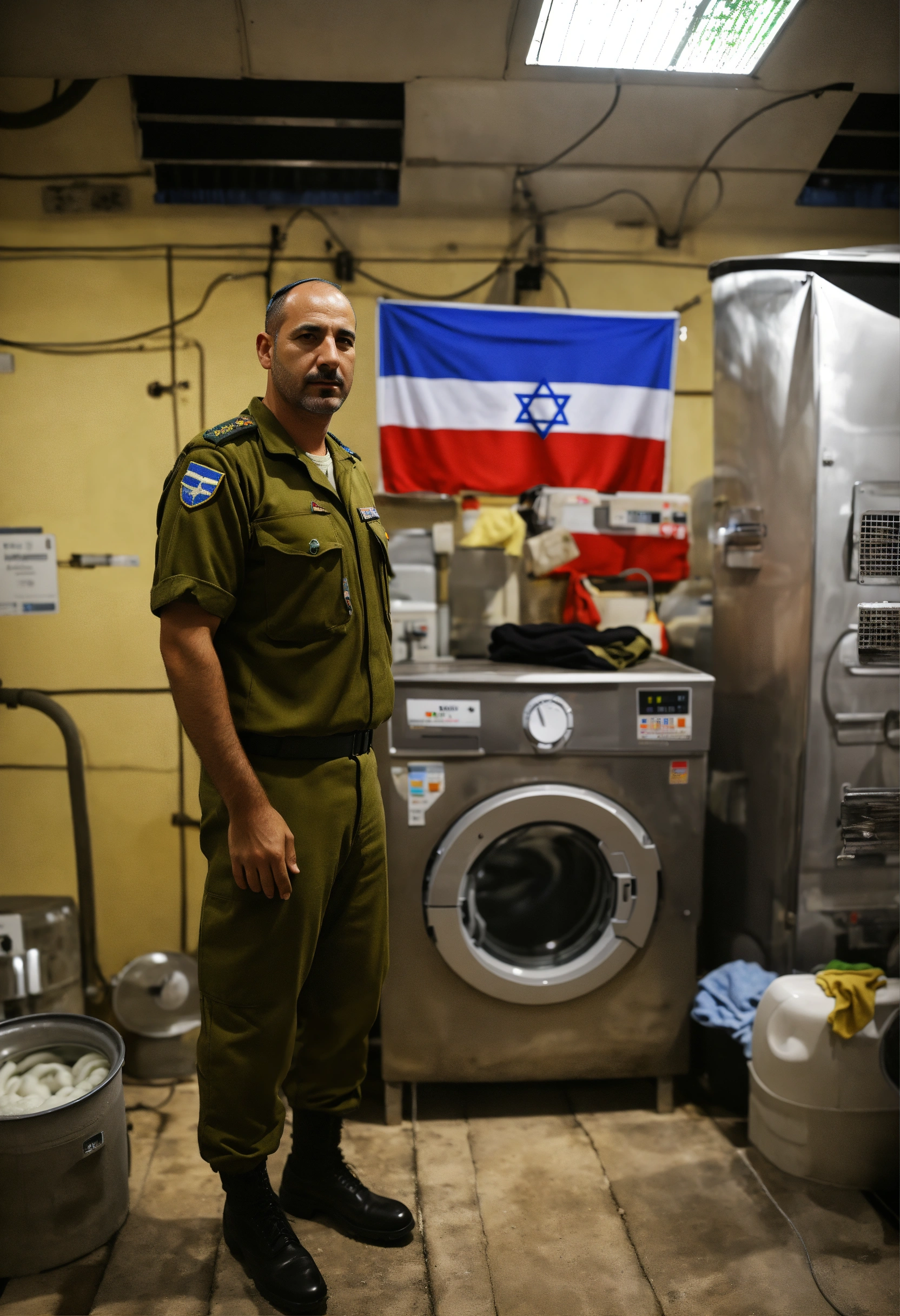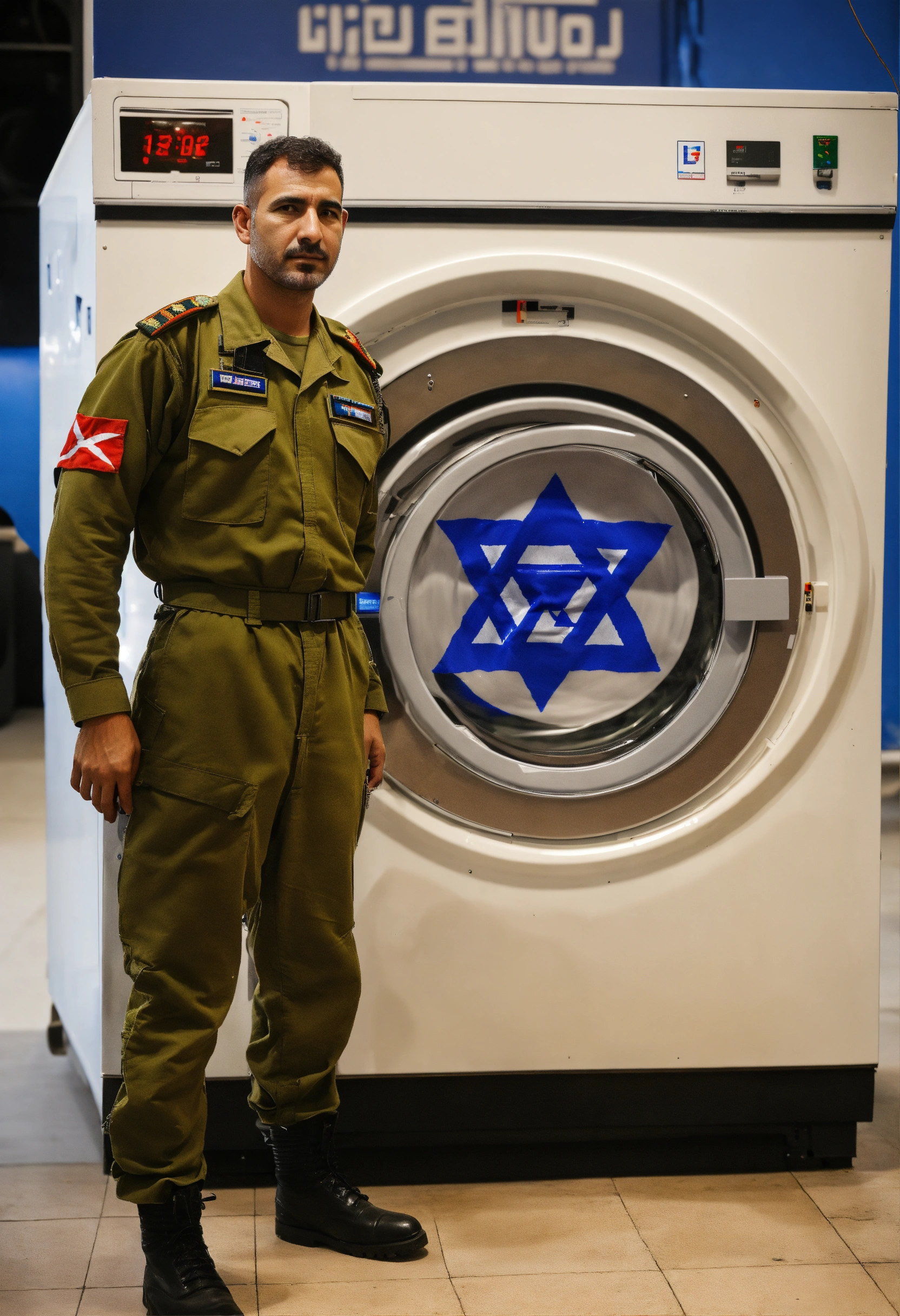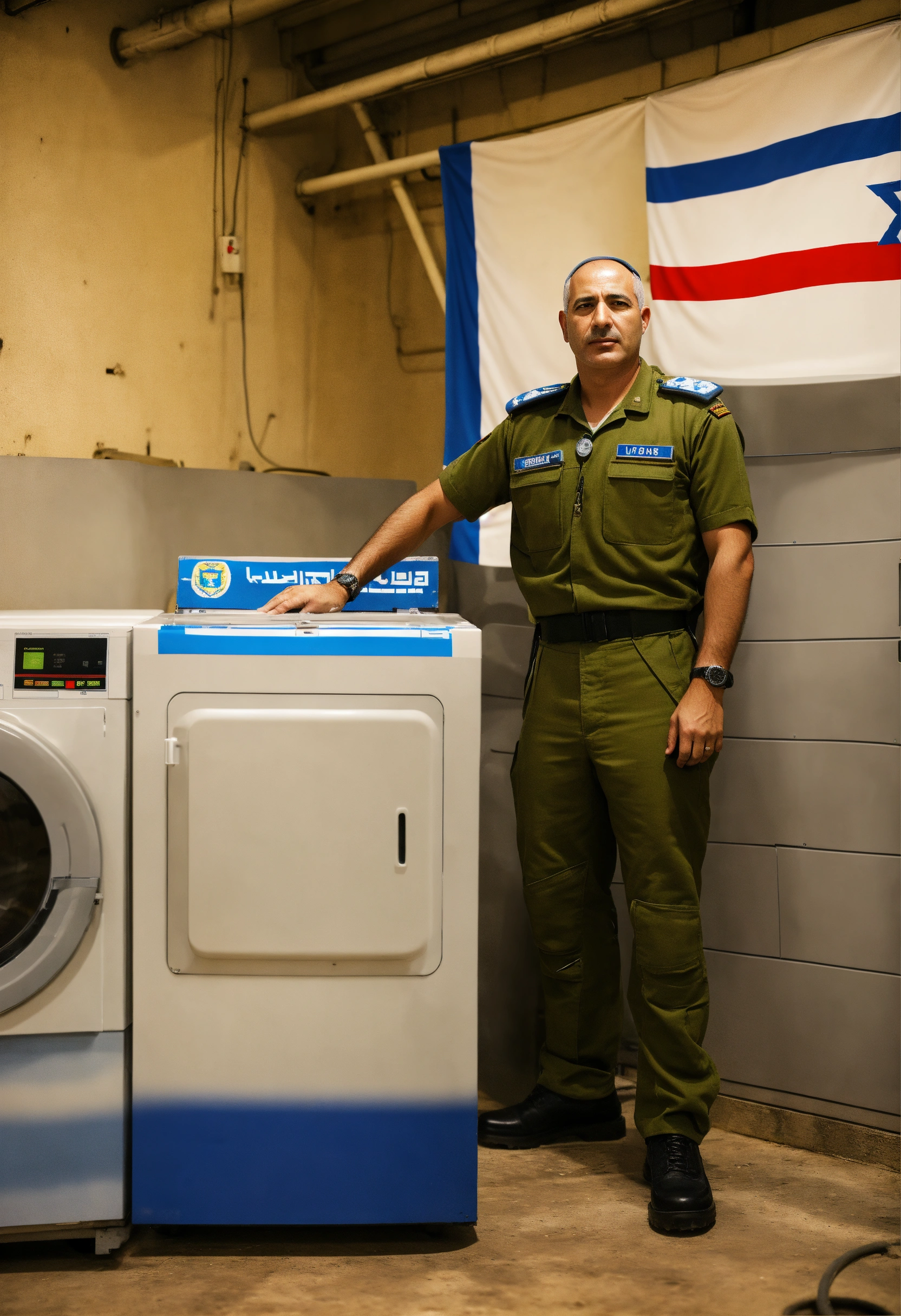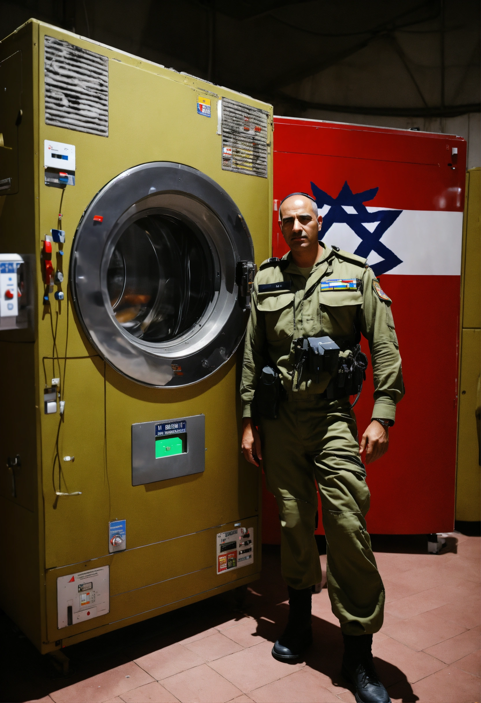 An israeli army pilot stands next to an industrial washing machine designed with the israeli flag at the command center