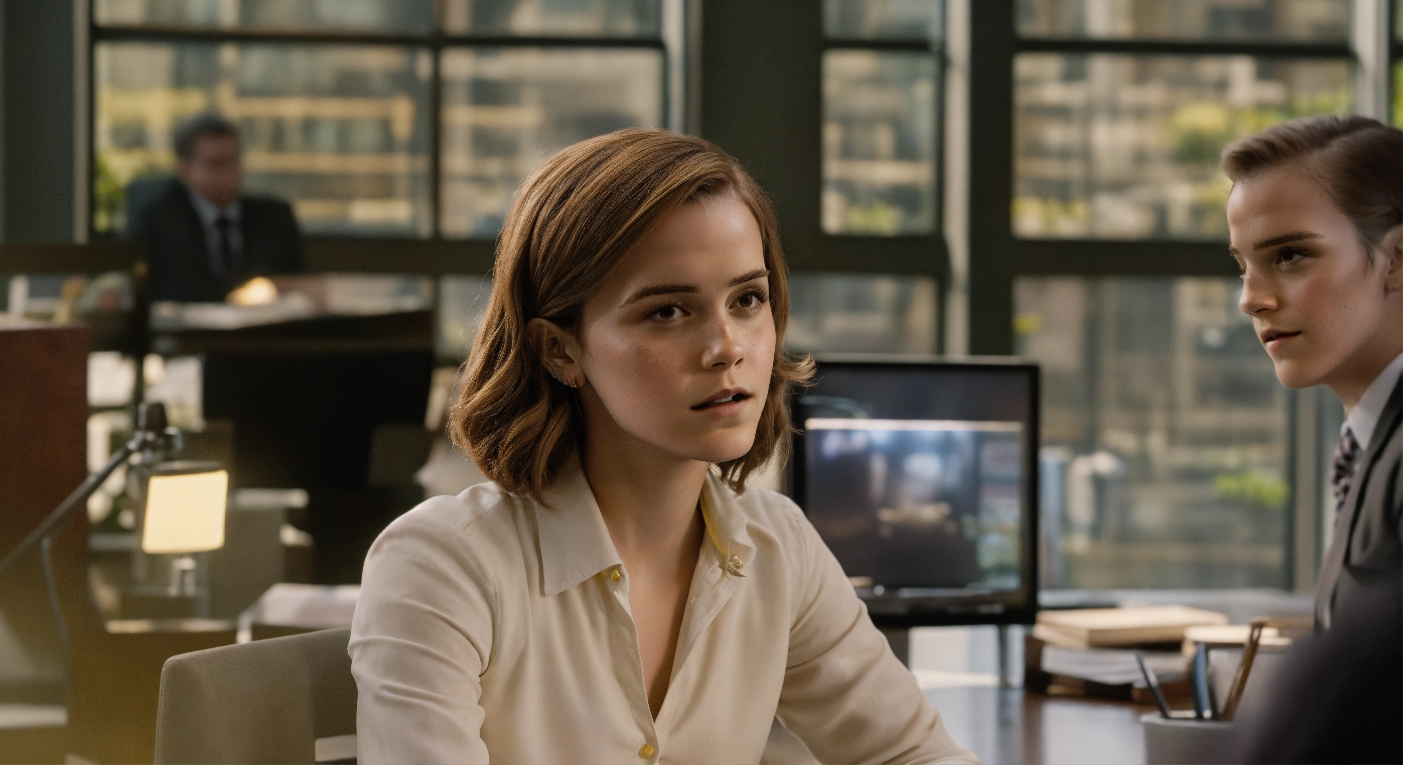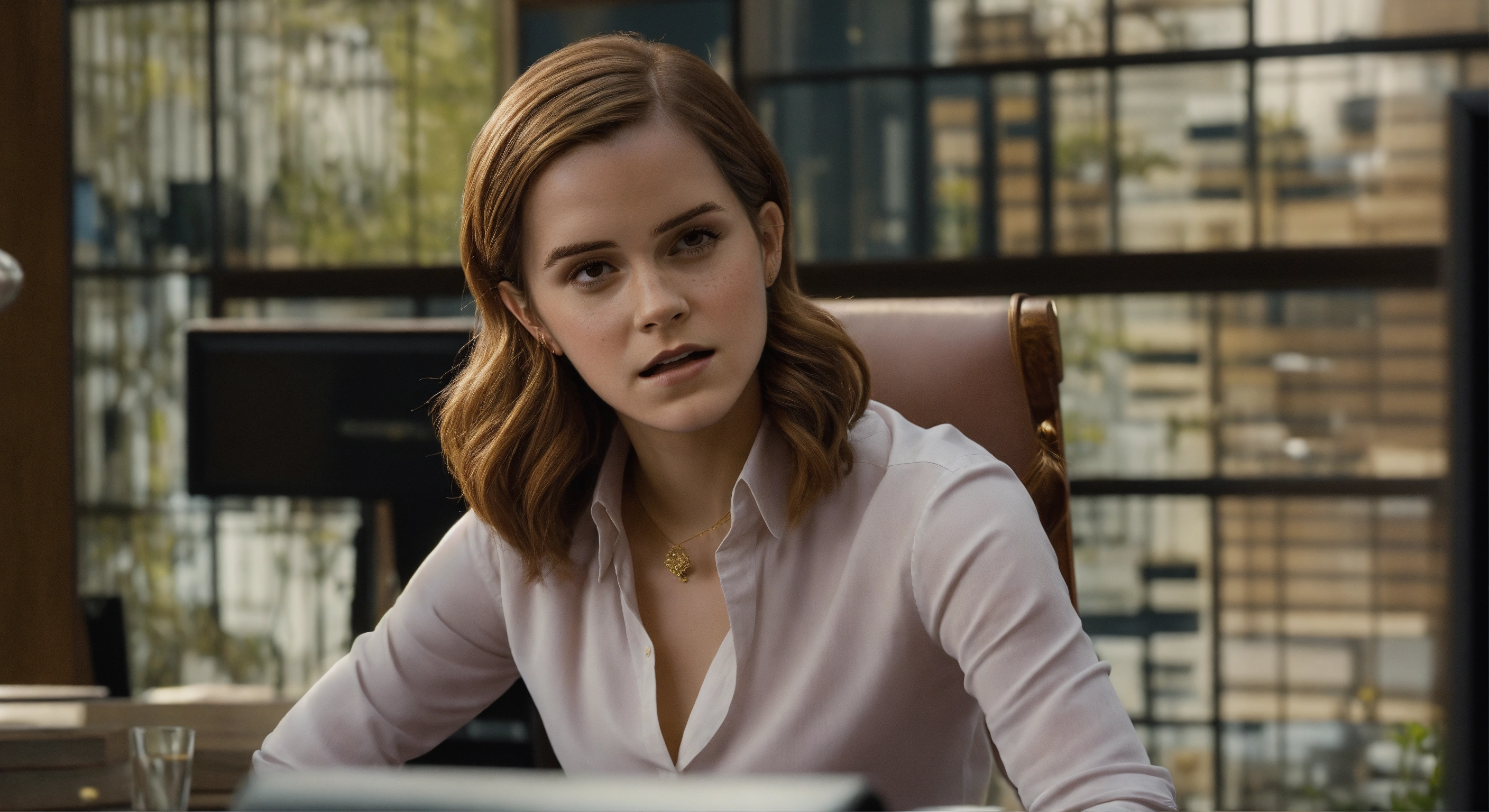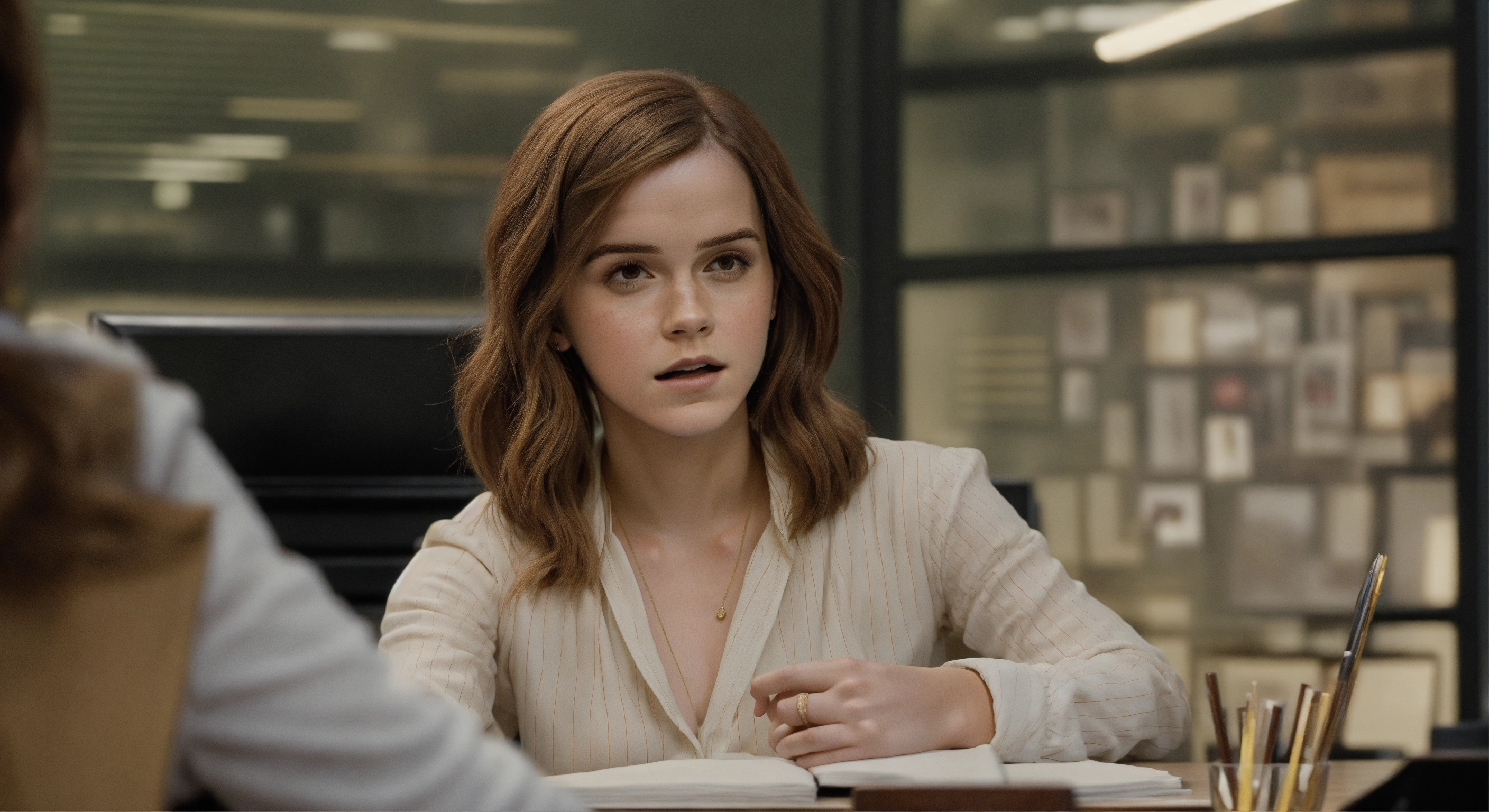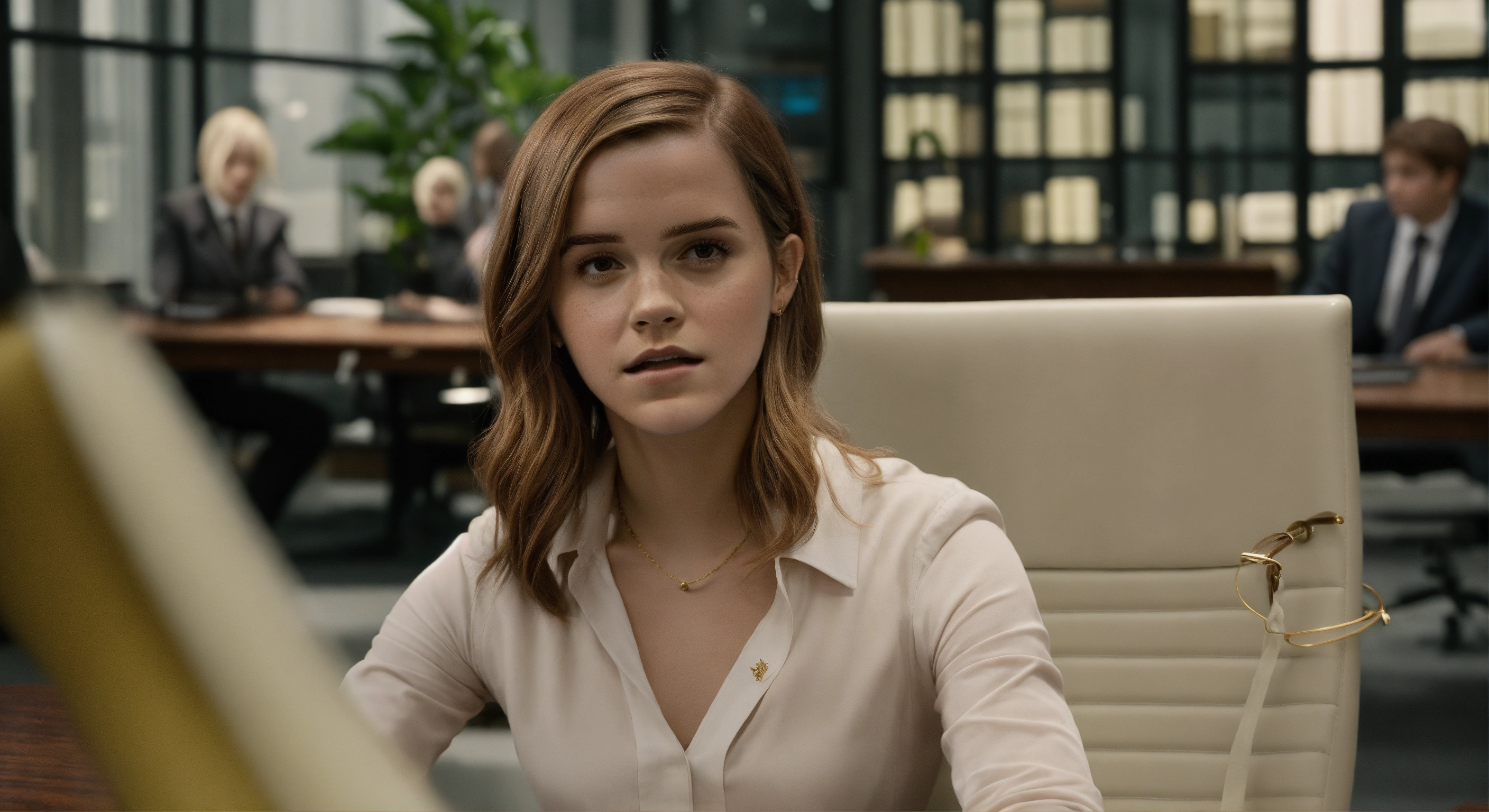 High quality, movie scene of emma watson as hermione granger in a business dress sitting on a mahogany desk in the middle of a modern glass office. white, yellow, brown tones. 8k resolution. digital art, high quality, realistic, tv show lighting, perfect lighting, canon 35mm f2.0, natural lighting, film grain
