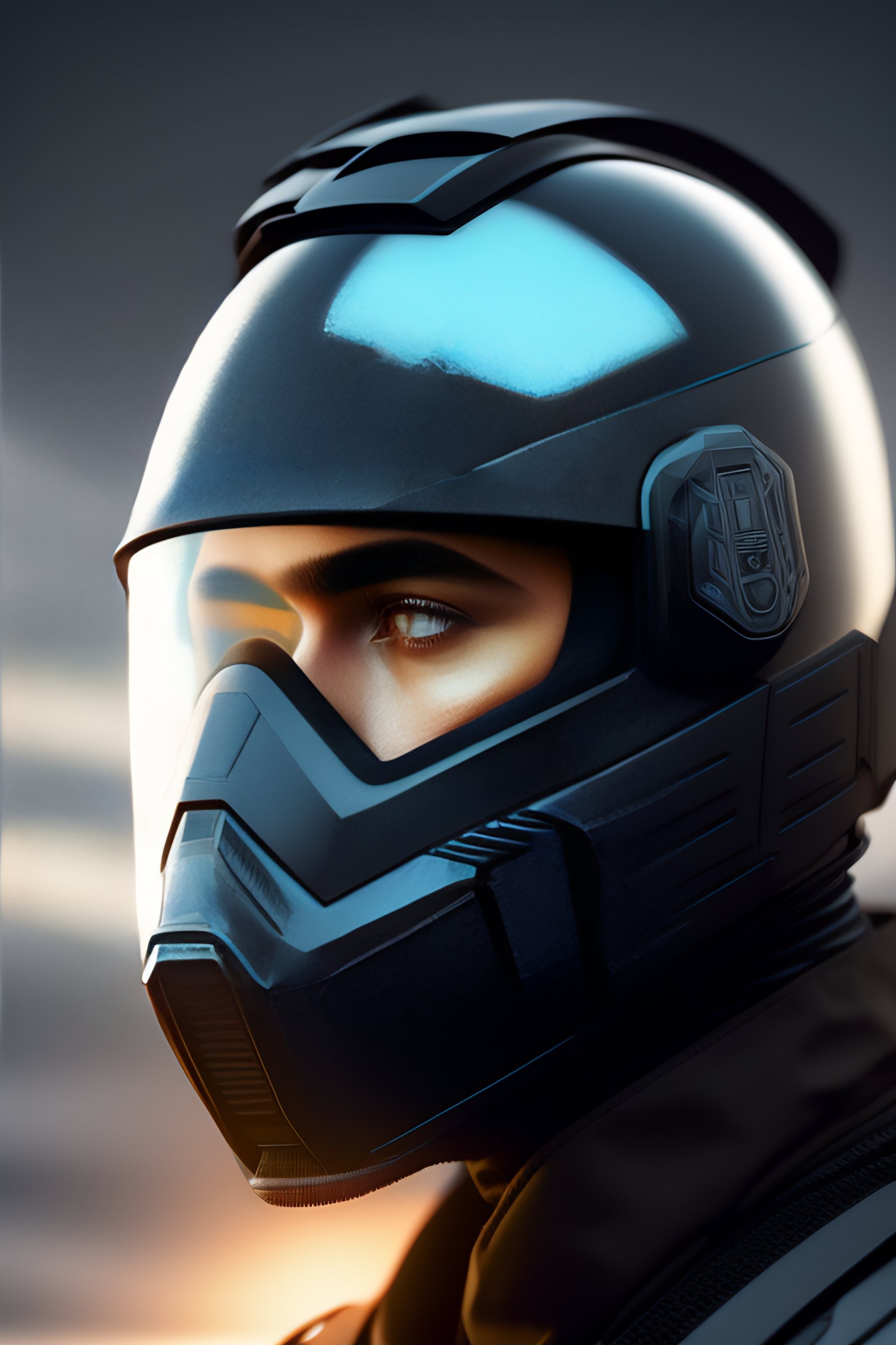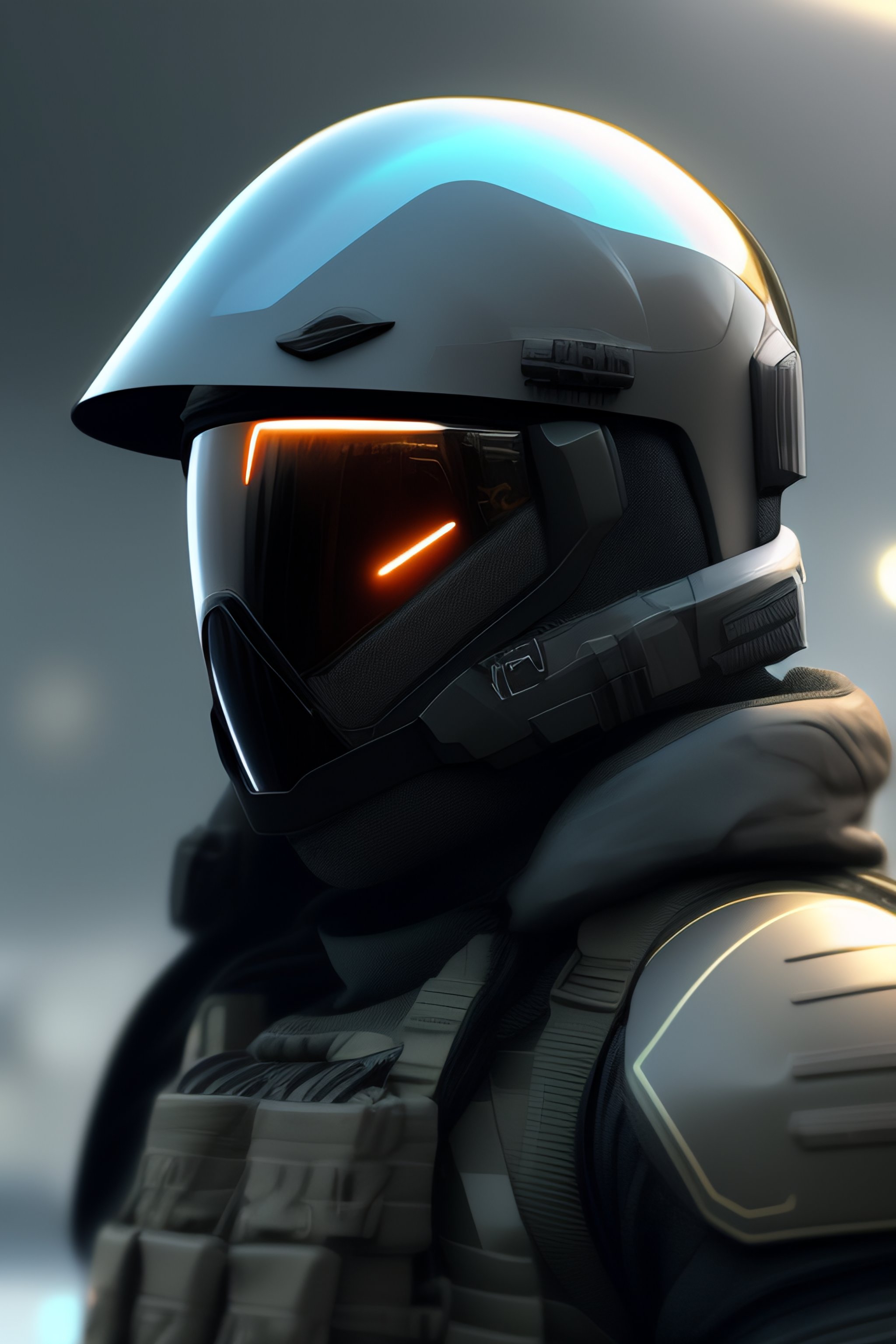 A combat futurist full-face helmet, highly detailed, smooth, sci fi, illustration, digital art, concept art, combat helmet, full face protection, headgear, artstation, military helmet, mute colors, futurist visor, sci fi soldier, grayish background, eugenia firs, face cover, big wide visor, combat sci fi, black helmet, grey color tones, lightweight, full image, light blue visor, halo spi armor artstation, opaque visor, spi helmet, odst helmet, art by ilya kuvshinov artstation, ilya kuvshinov, wide angle action dynamic portrait, trending on artstation, digital painting, moody lightning, realistic shading, jama jurabaev concept art, combat slim suit, aesthetic illustration, black combat helmet, black tones, polygon helmet theme, high quality, military gear, neck covered, sharp details, detailed, high quality, black colors, mute color scheme, stefan kostic artstation, art by stefan kostic, art by gregory manchess, gregory manchess artstation, face protection, full face cover, art by sargent and richard schmid, menacing presence, real lightning