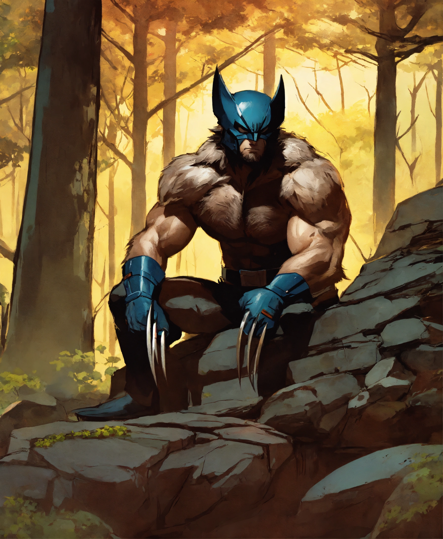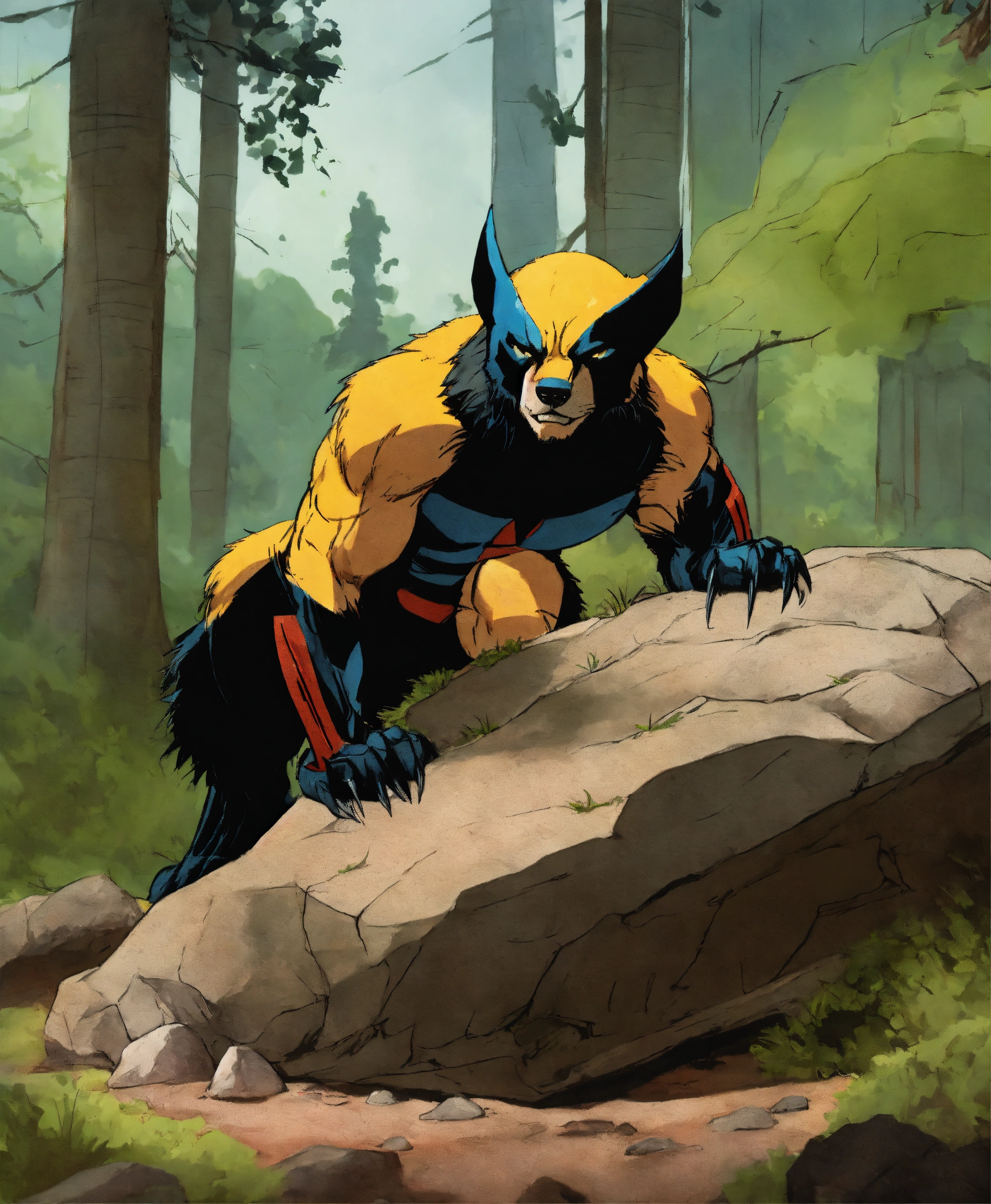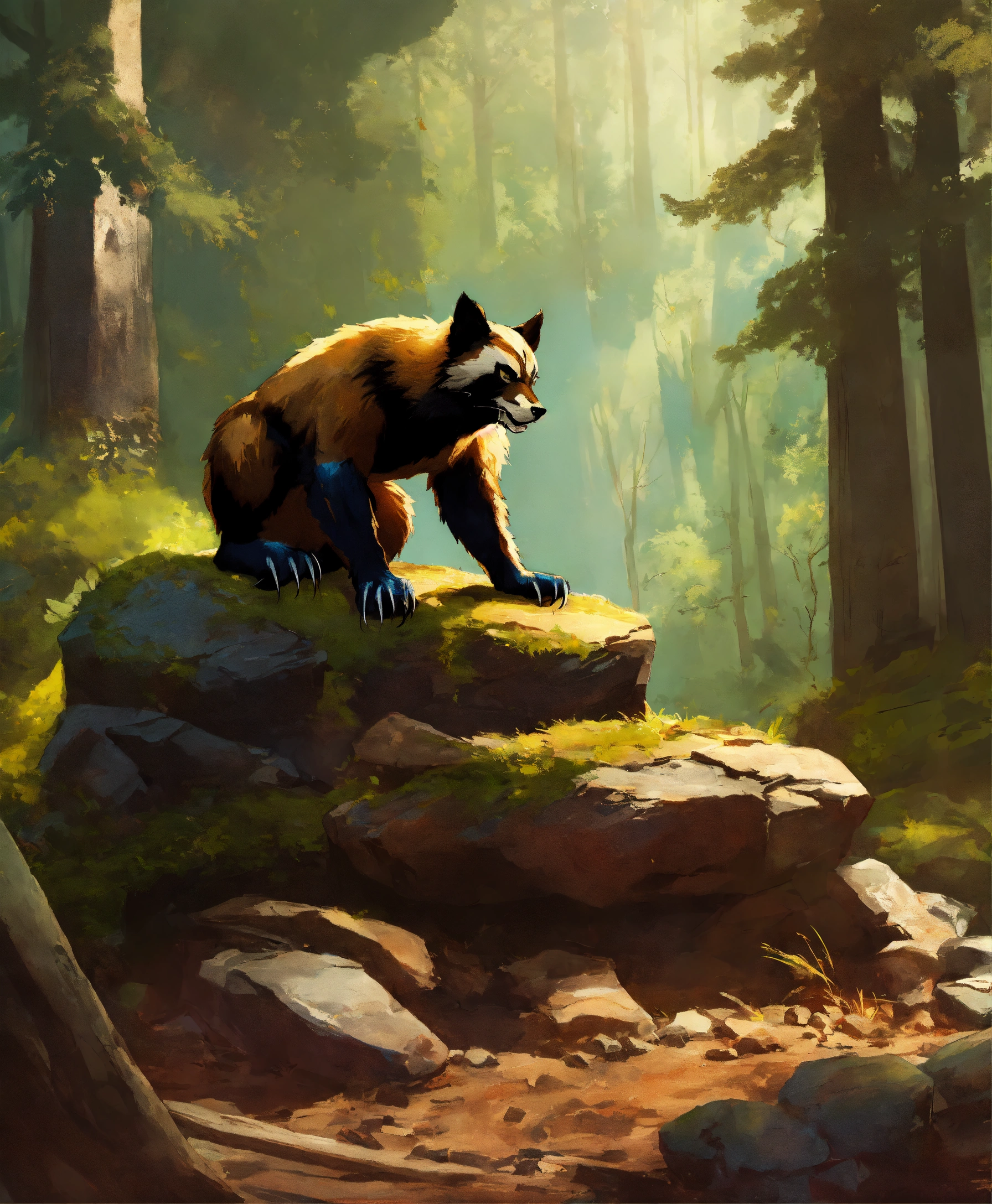 Concept art of a wolverine laying on a rock surrounded by woodland