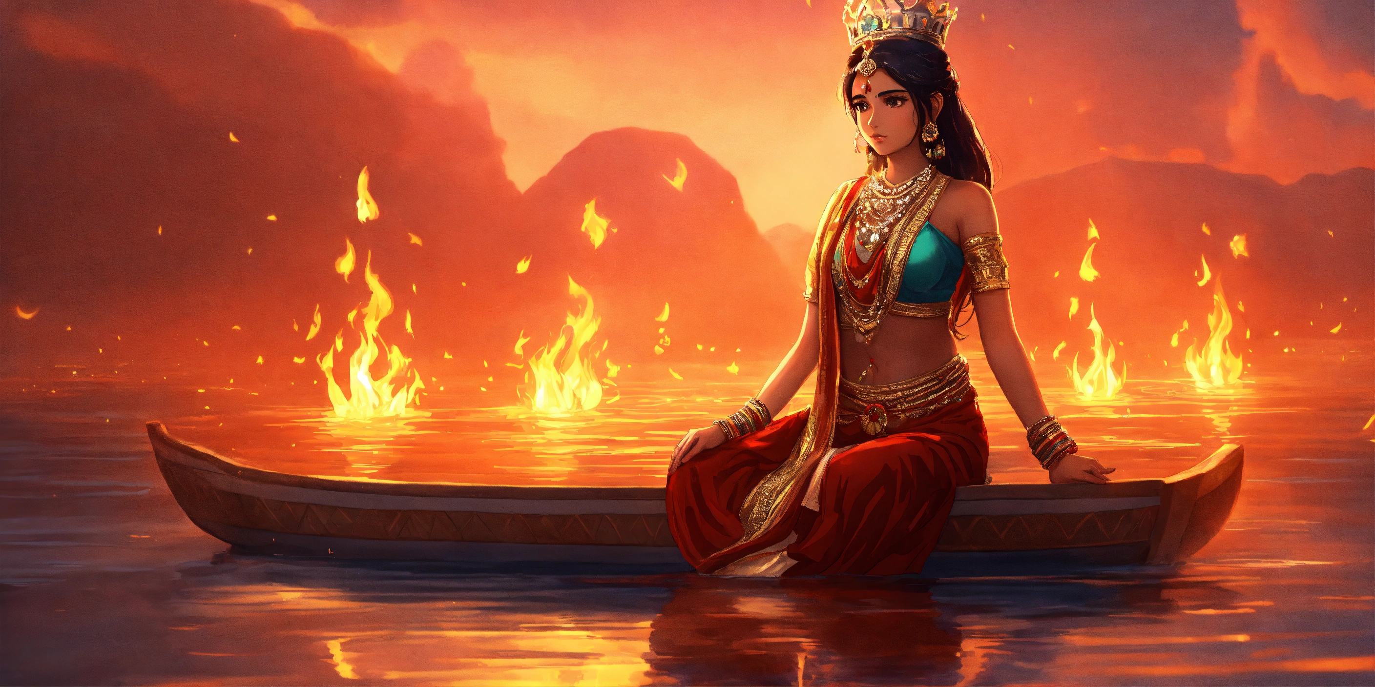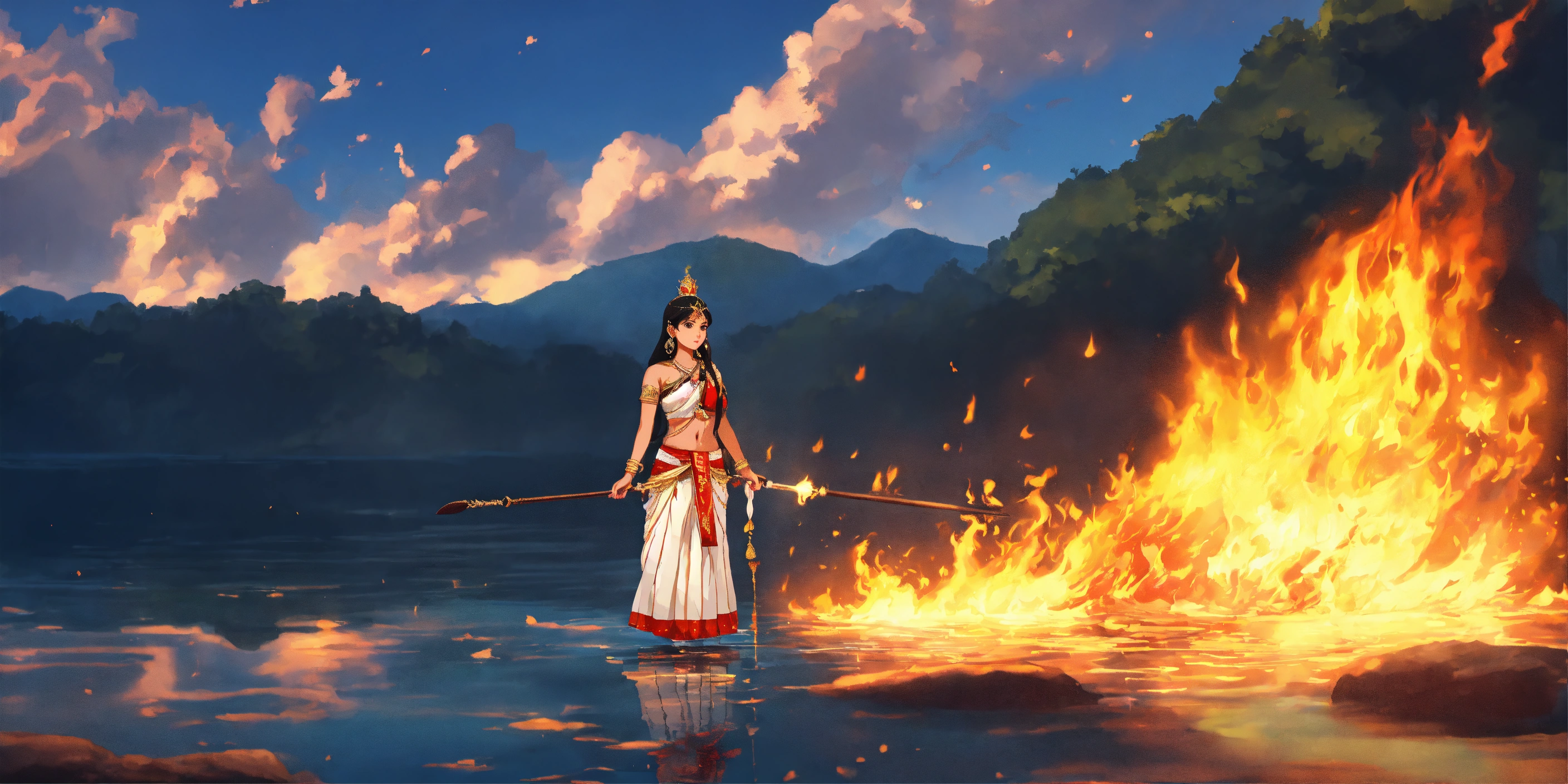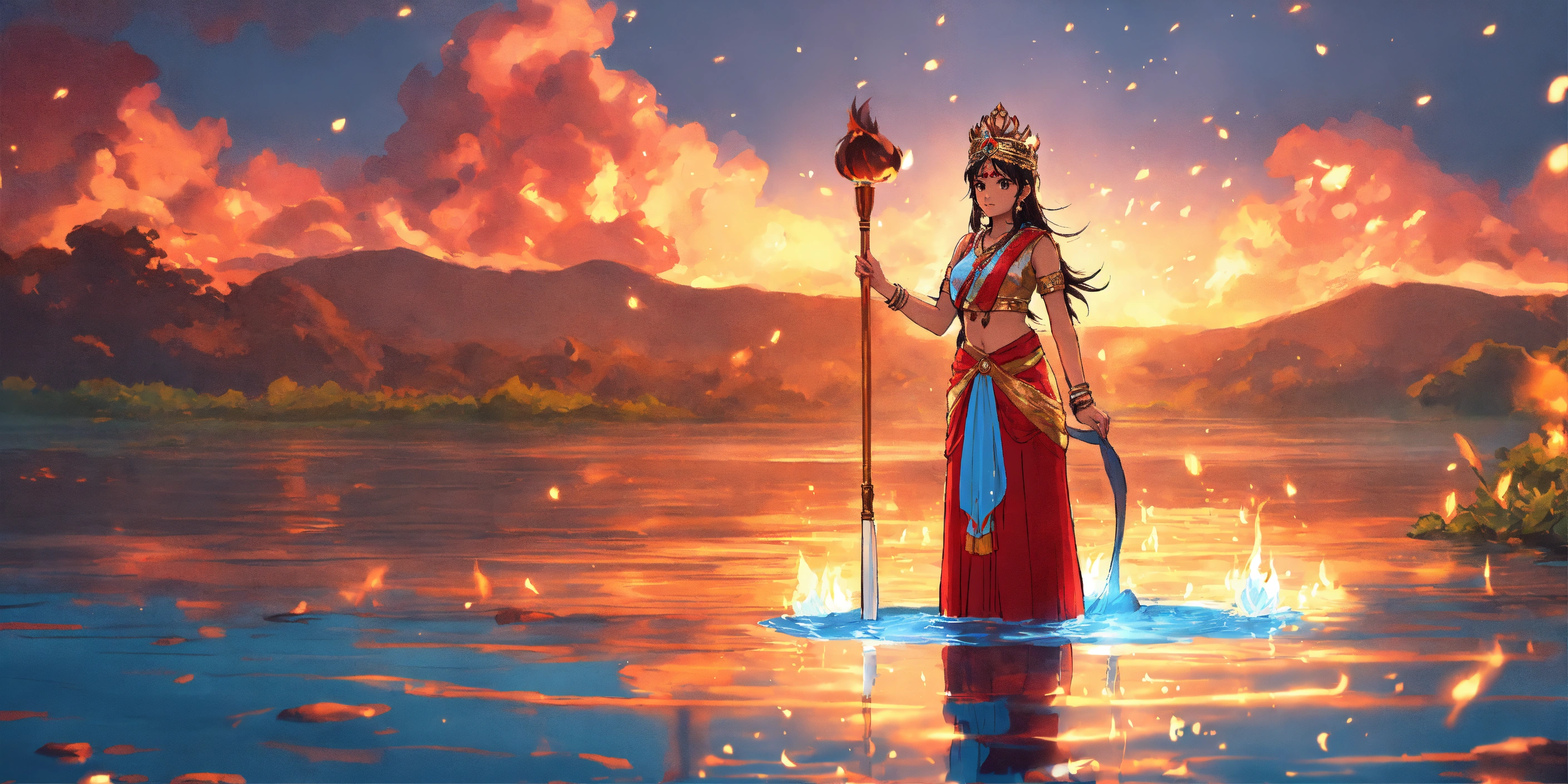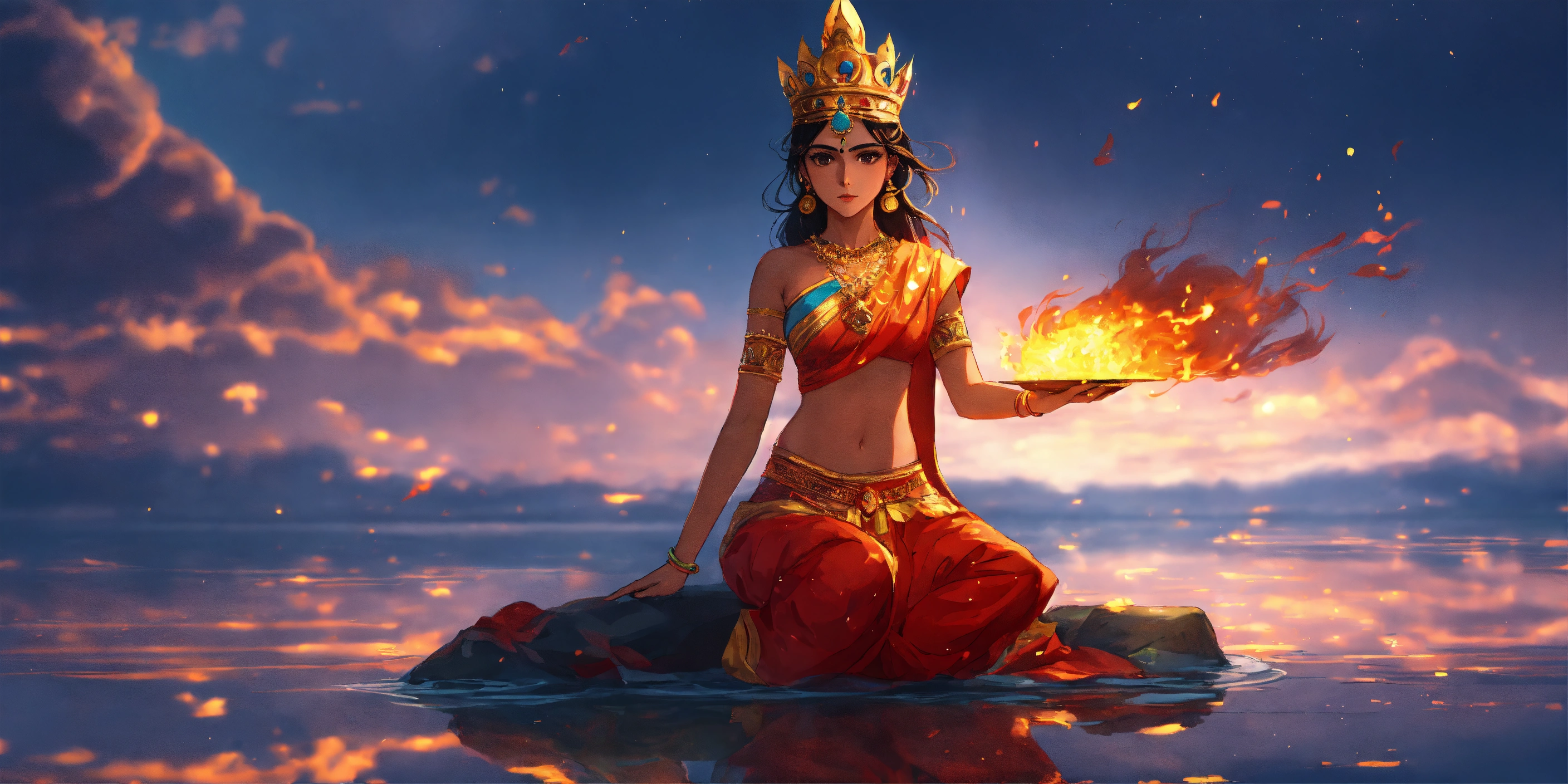 Indian girl as queen standing on water with little fire on sides very realistic anime