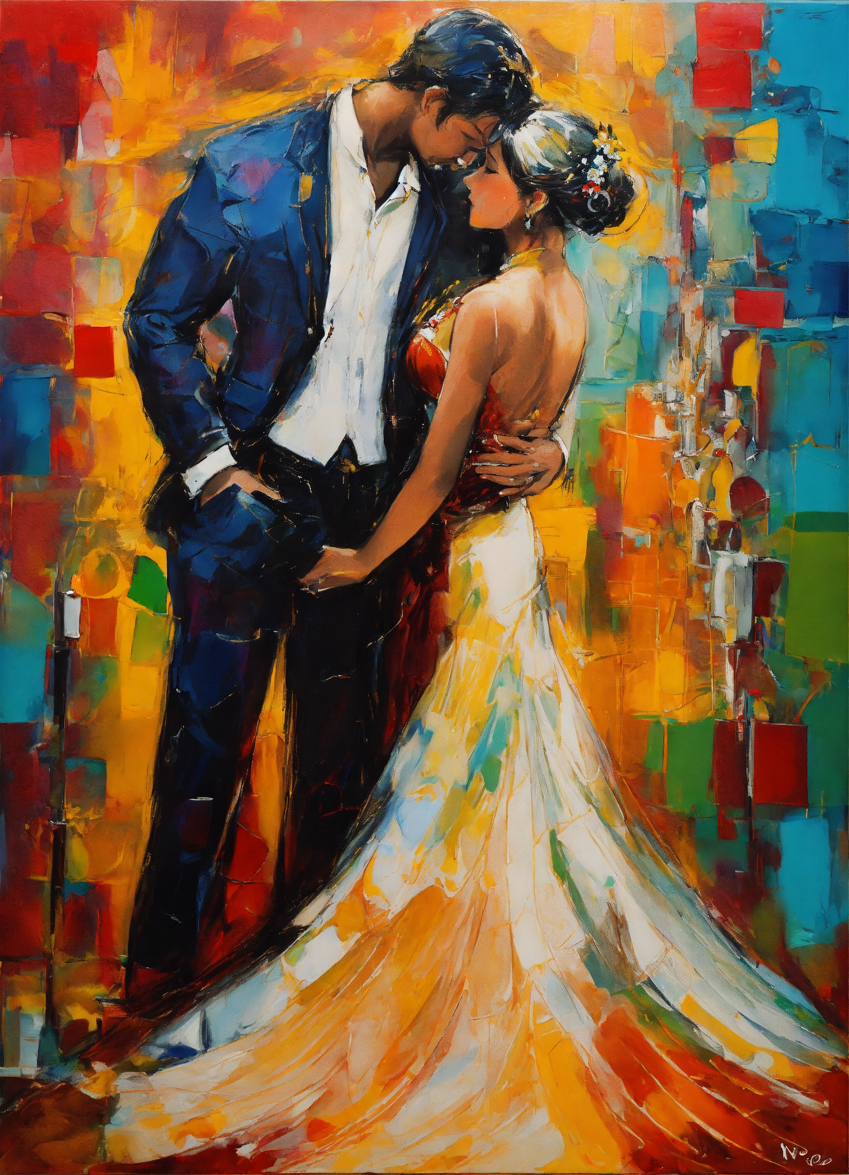 Let's celebrate a neo-expressionist matrimony a fusion of togetherness and commitment! in this emotionally charged style, we'll vividly depict the symbols of matrimony – interlocking rings, the unity candle, and the bond of two families, using bold, expressive strokes and vibrant colors. we'll illuminate the scene with an intense and passionate light, capturing the profound emotional essence of marriage. through neo-expressionism, we'll celebrate the spirit of togetherness and lifelong commitment, creating an artwork that beautifully represents the union of two families in matrimony.