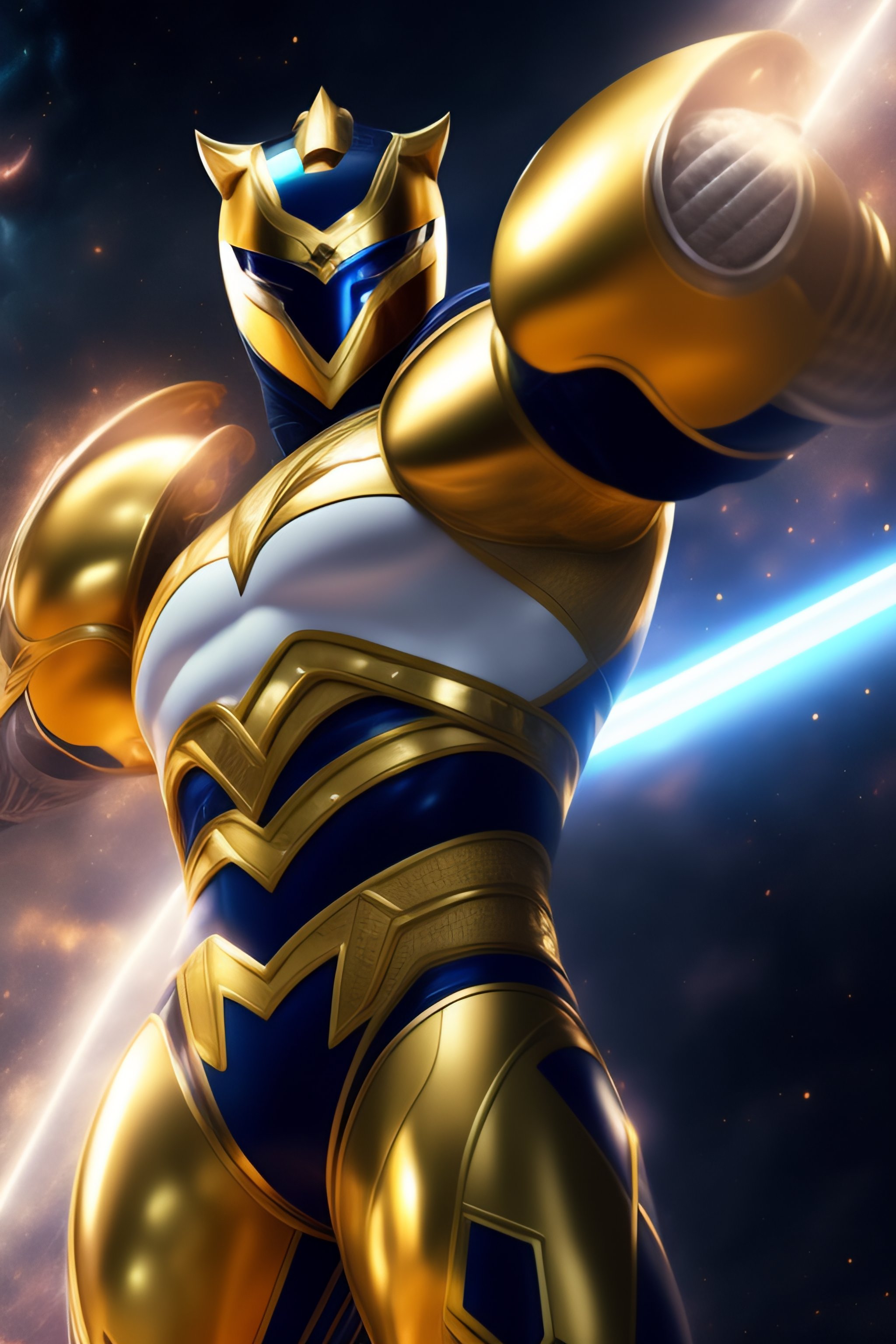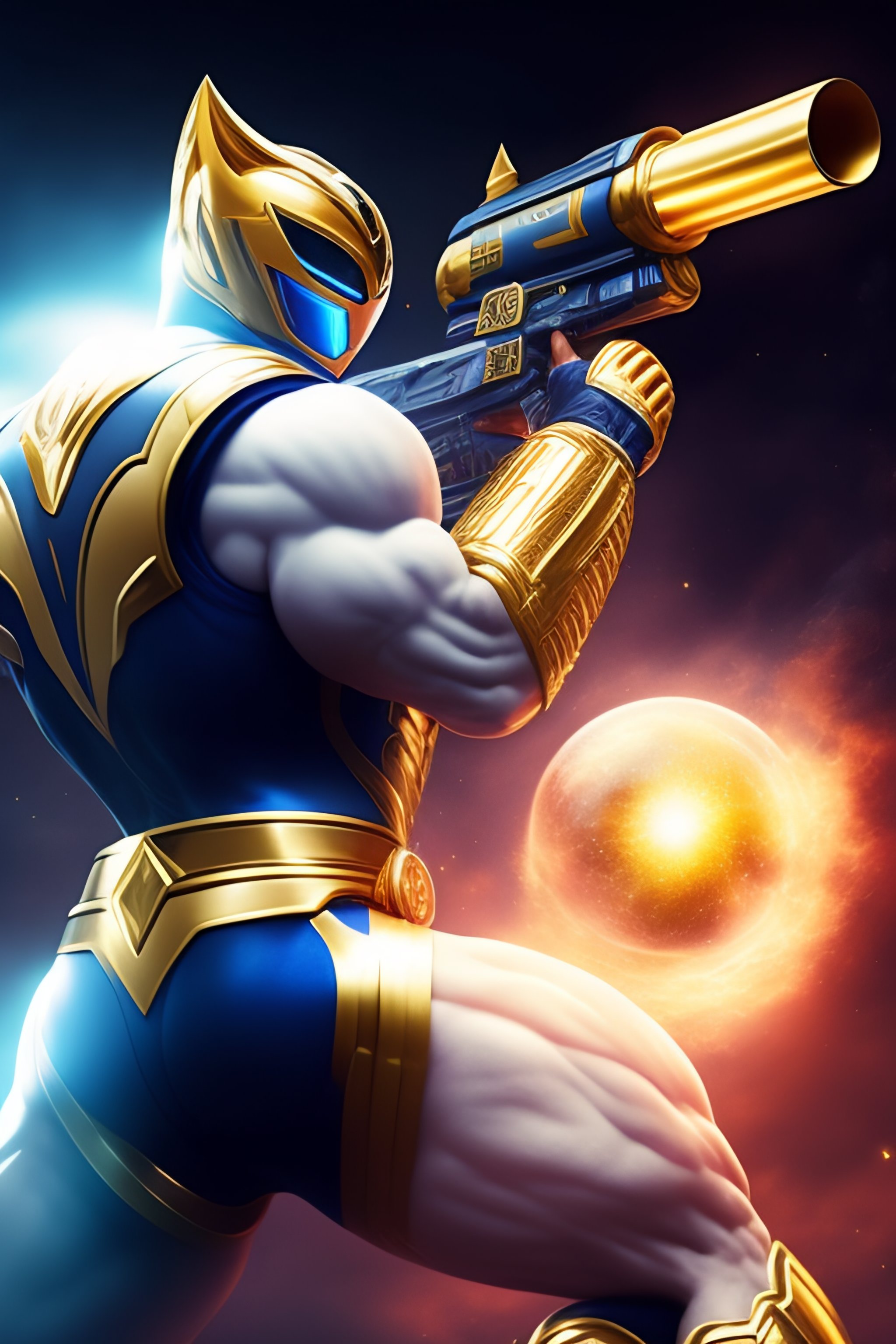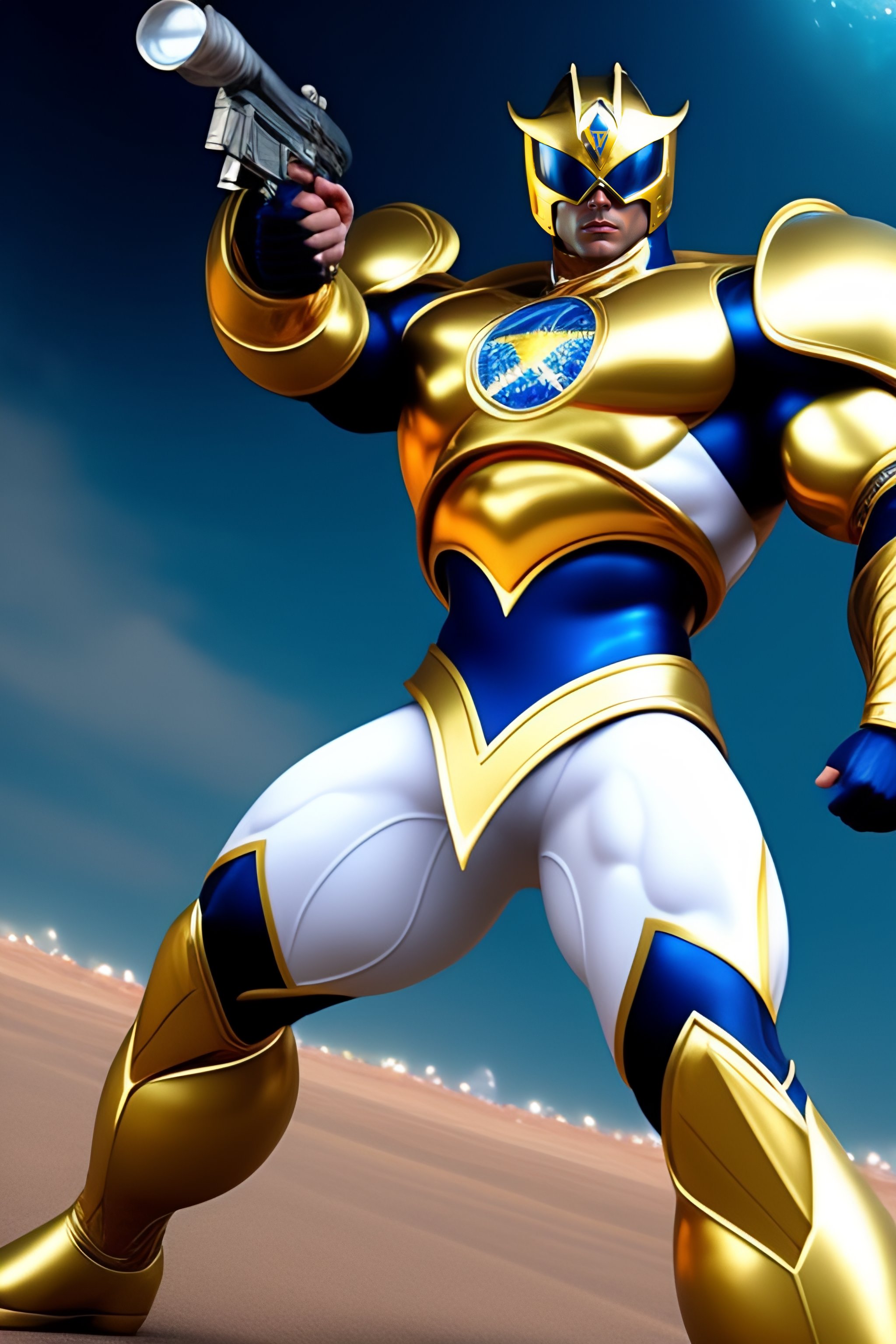 A buff white male with a gold and blue power ranger suit shooting a minigun