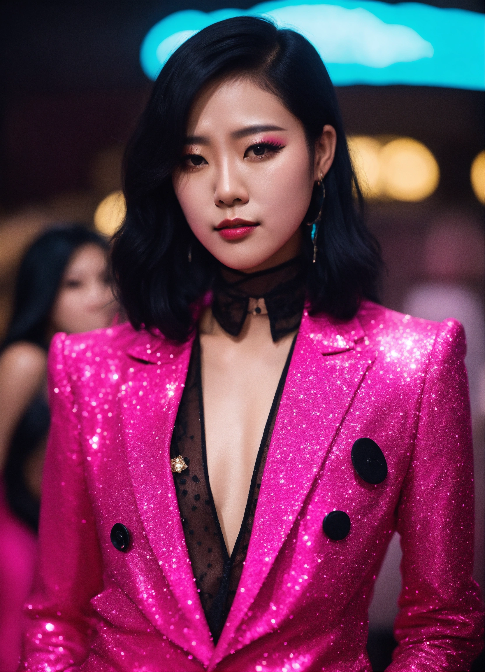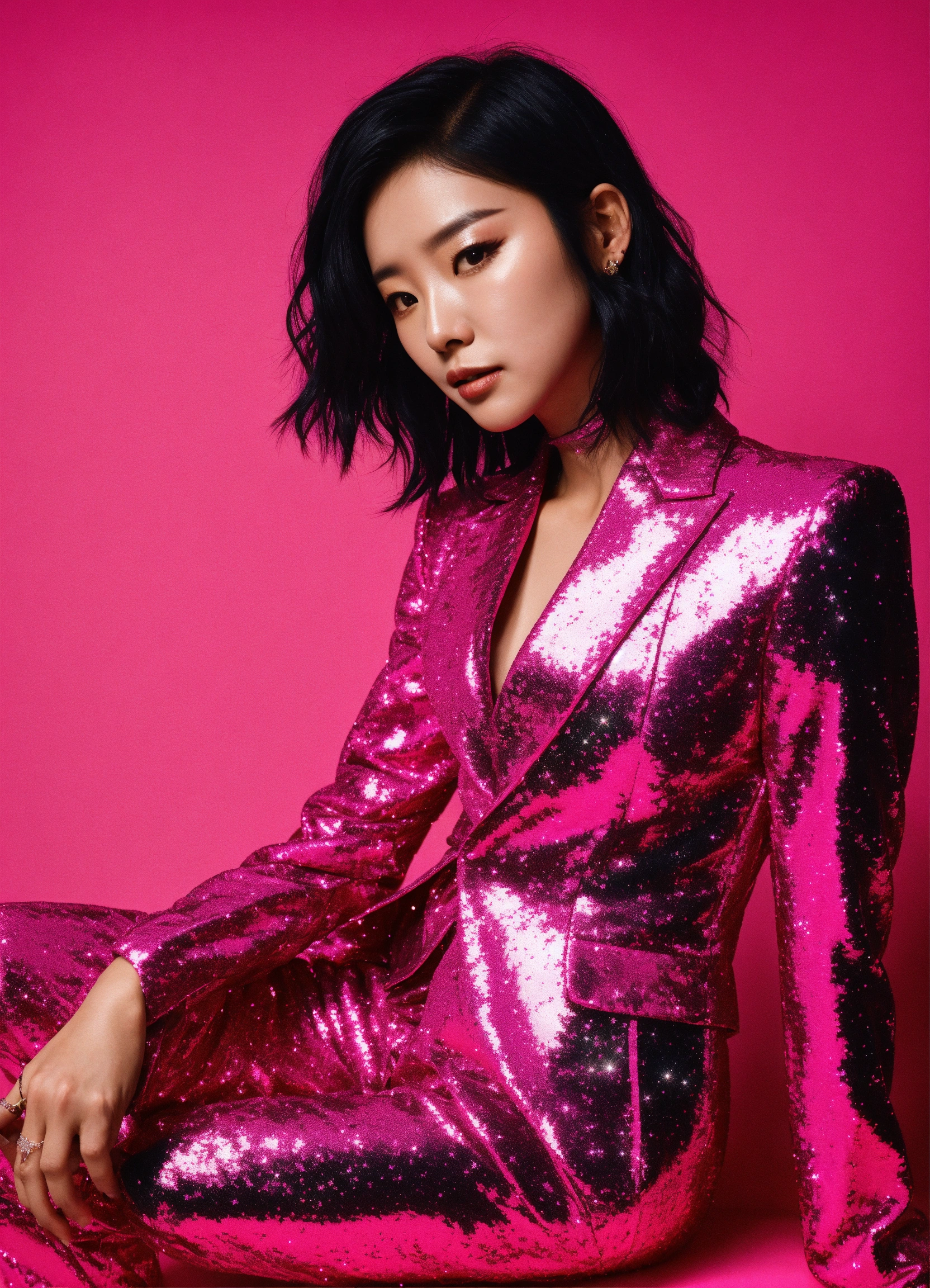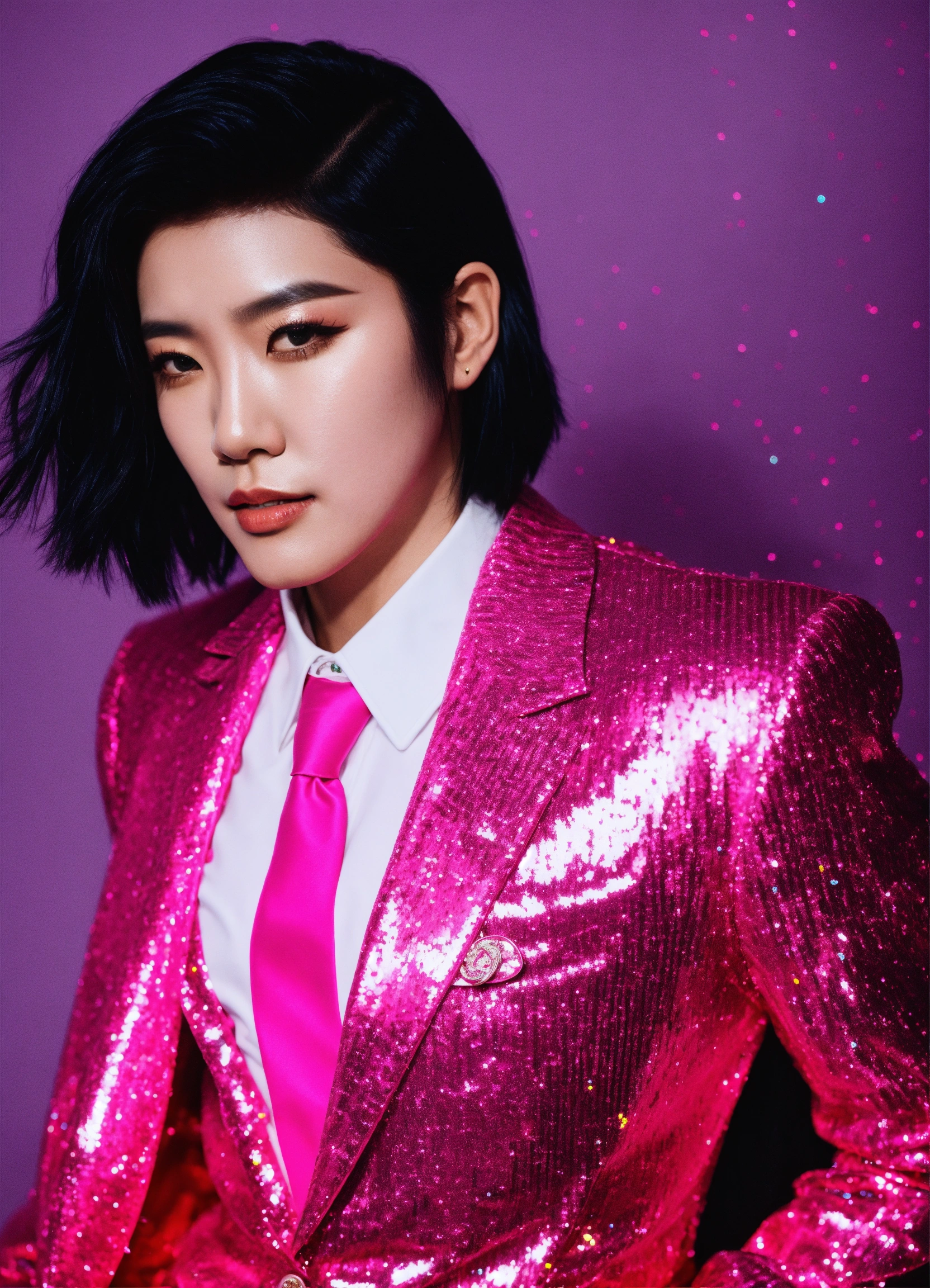 Jiu wearing glittery hot pink suit with black hair