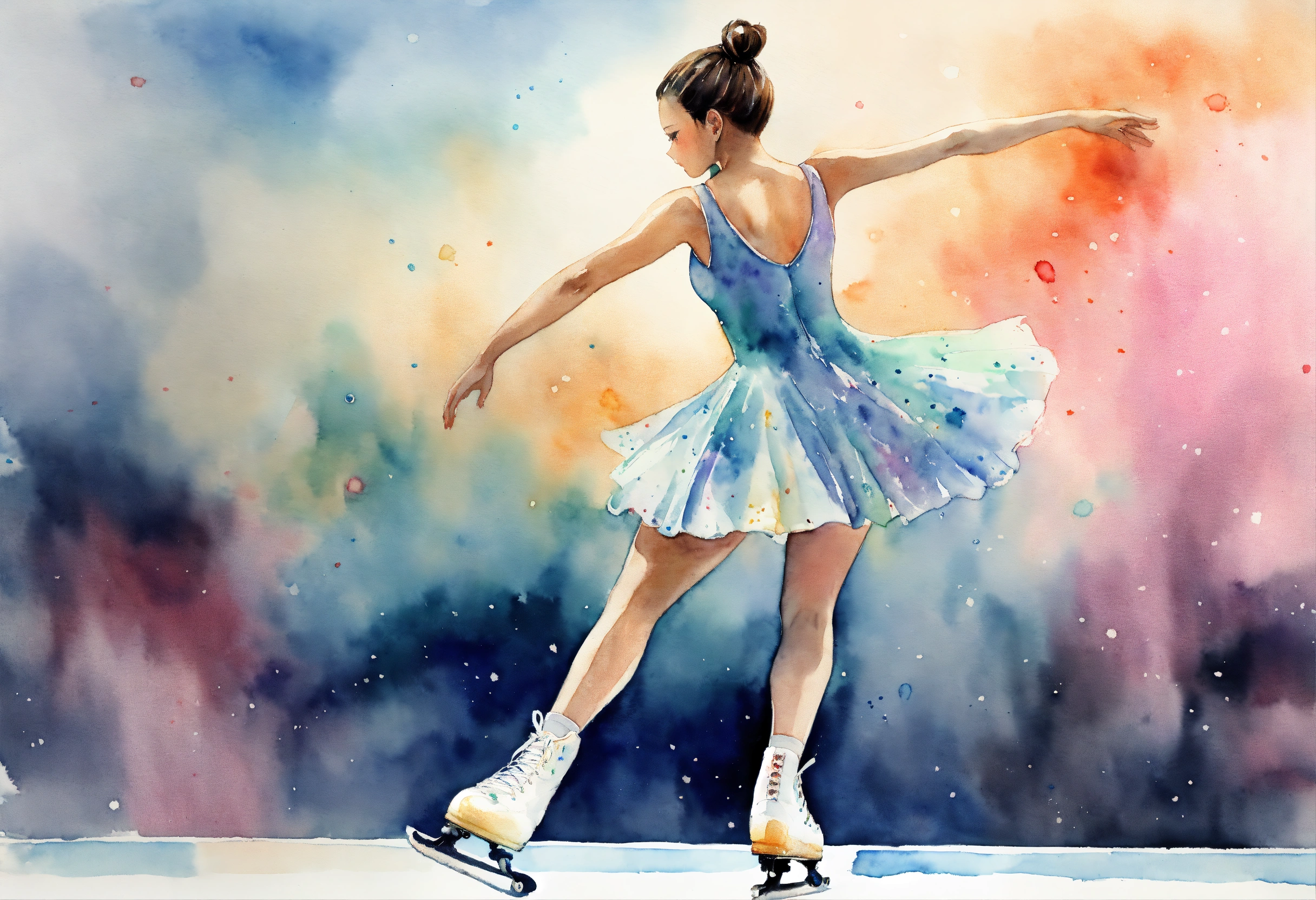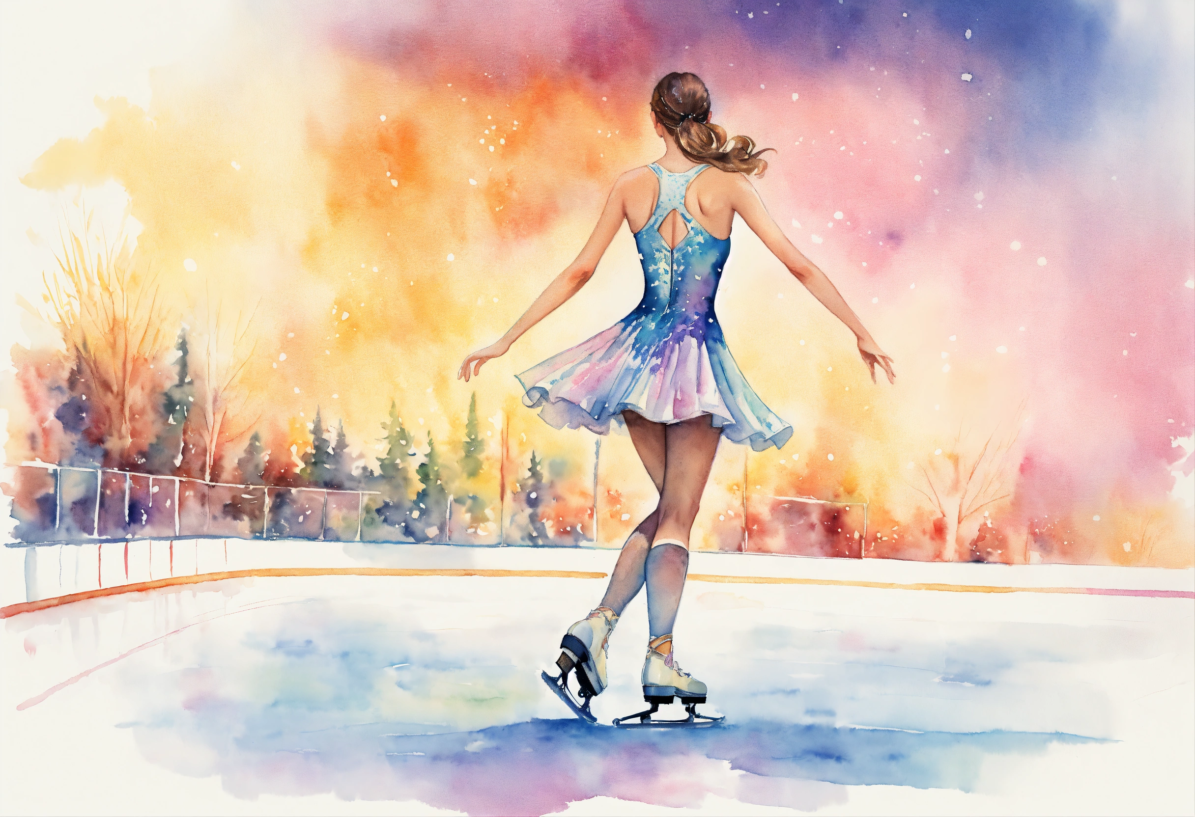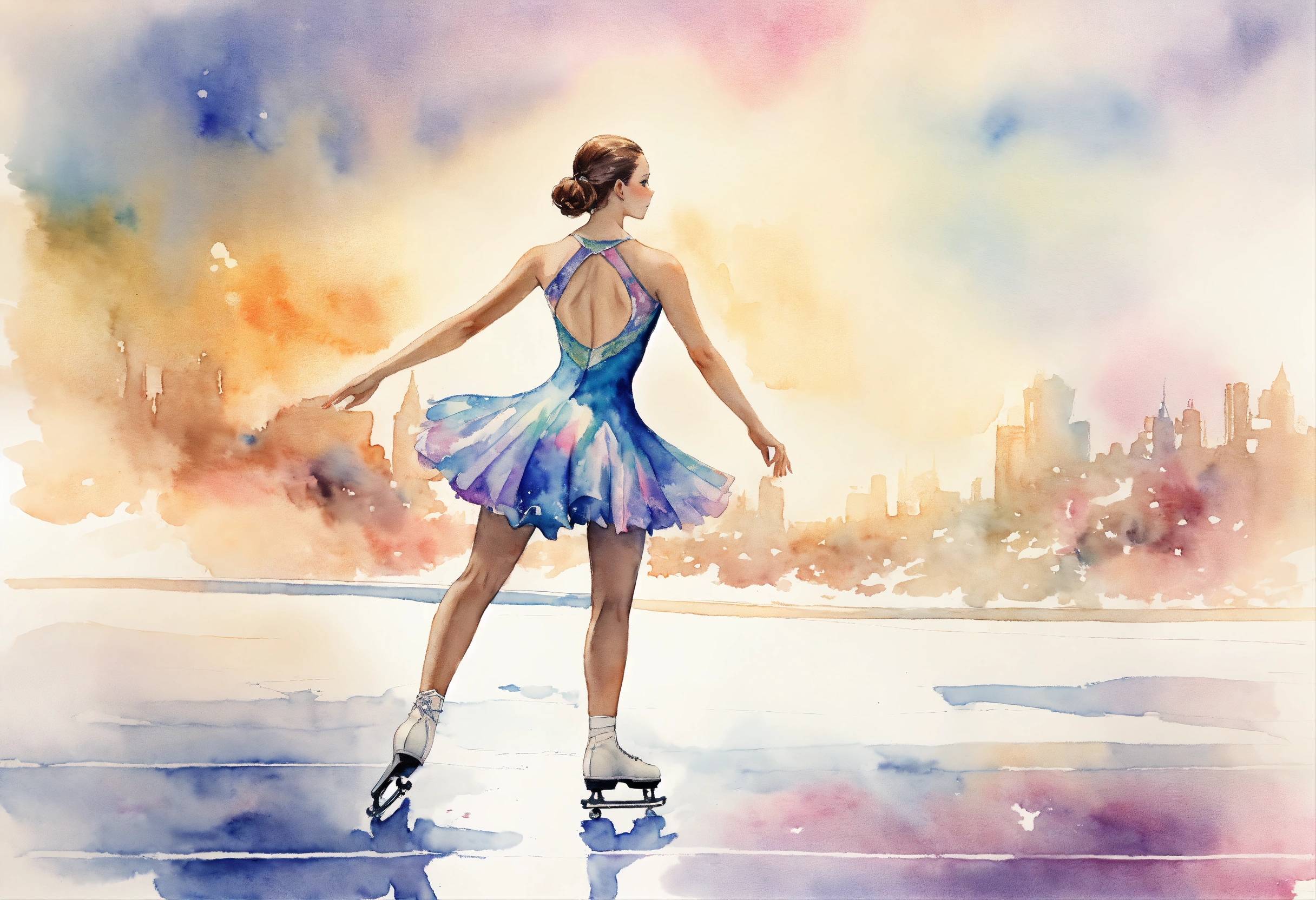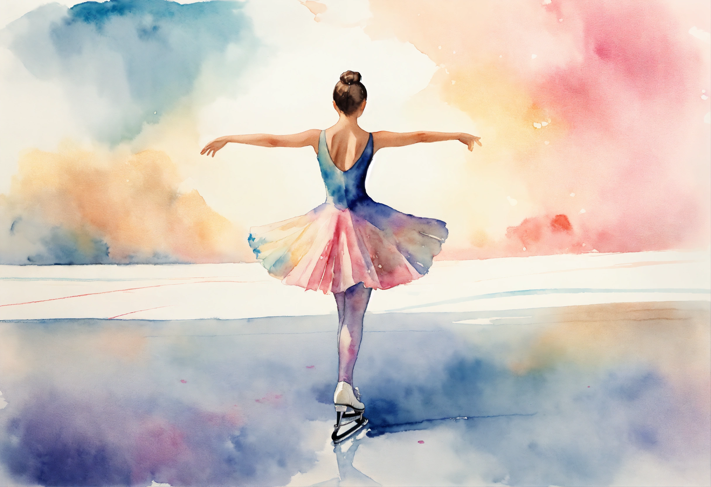 Full body watercolor of a young female figure skater from the back in the distance, wearing a detailed skate dress, pastel colors, wide angle