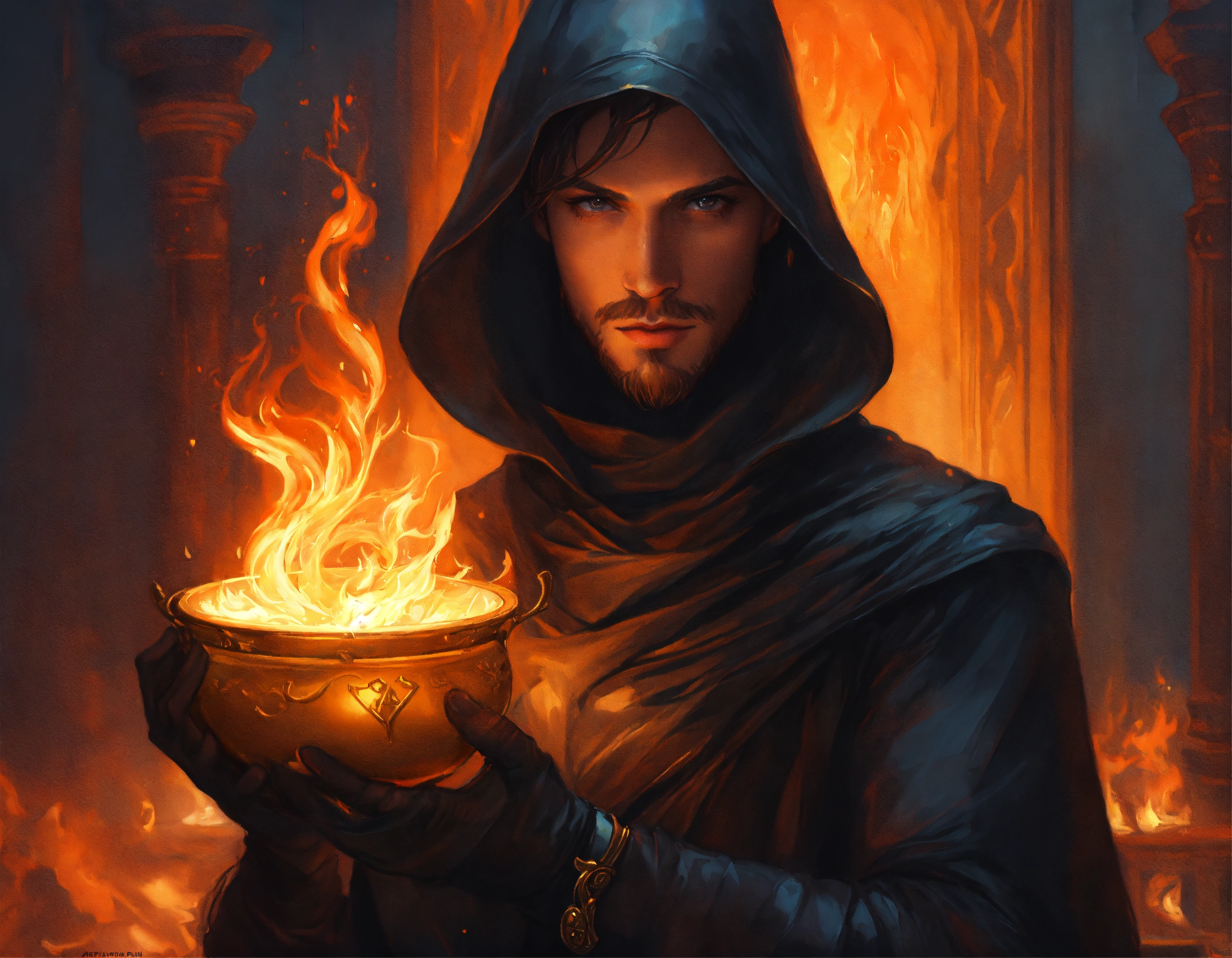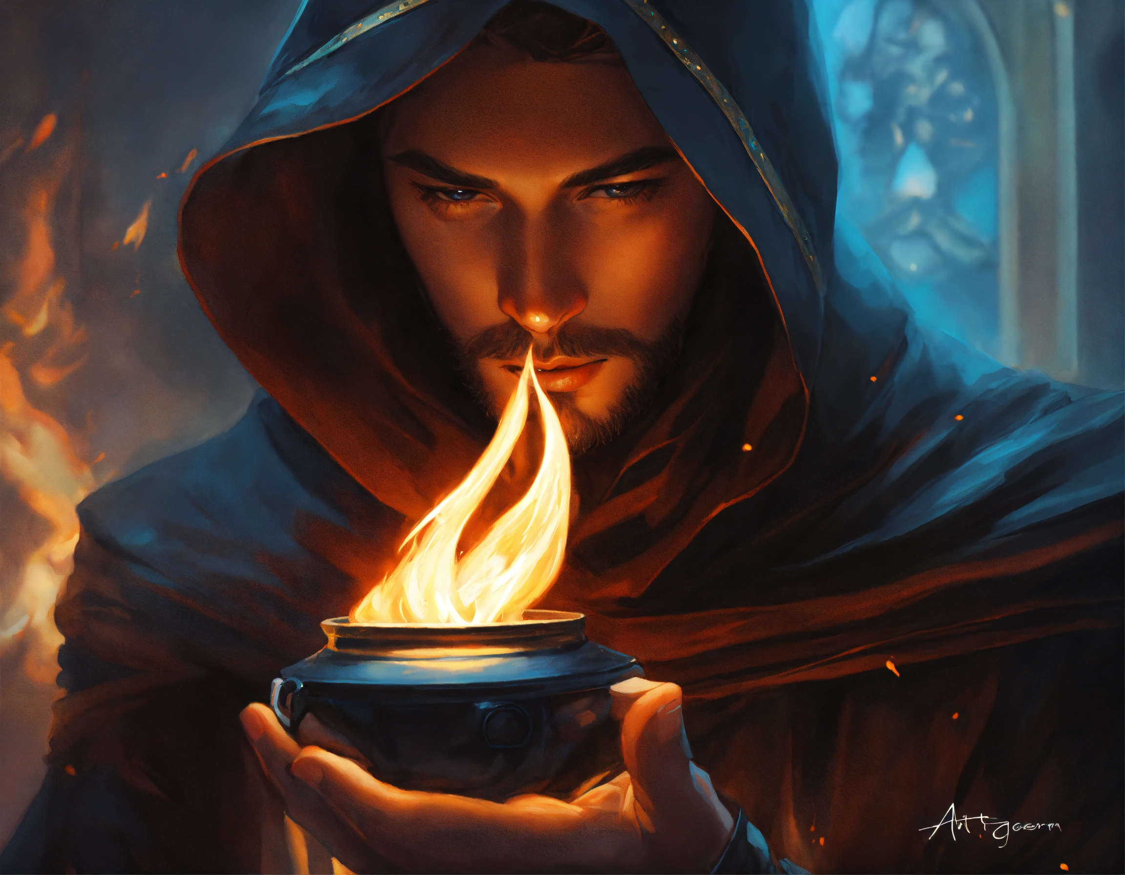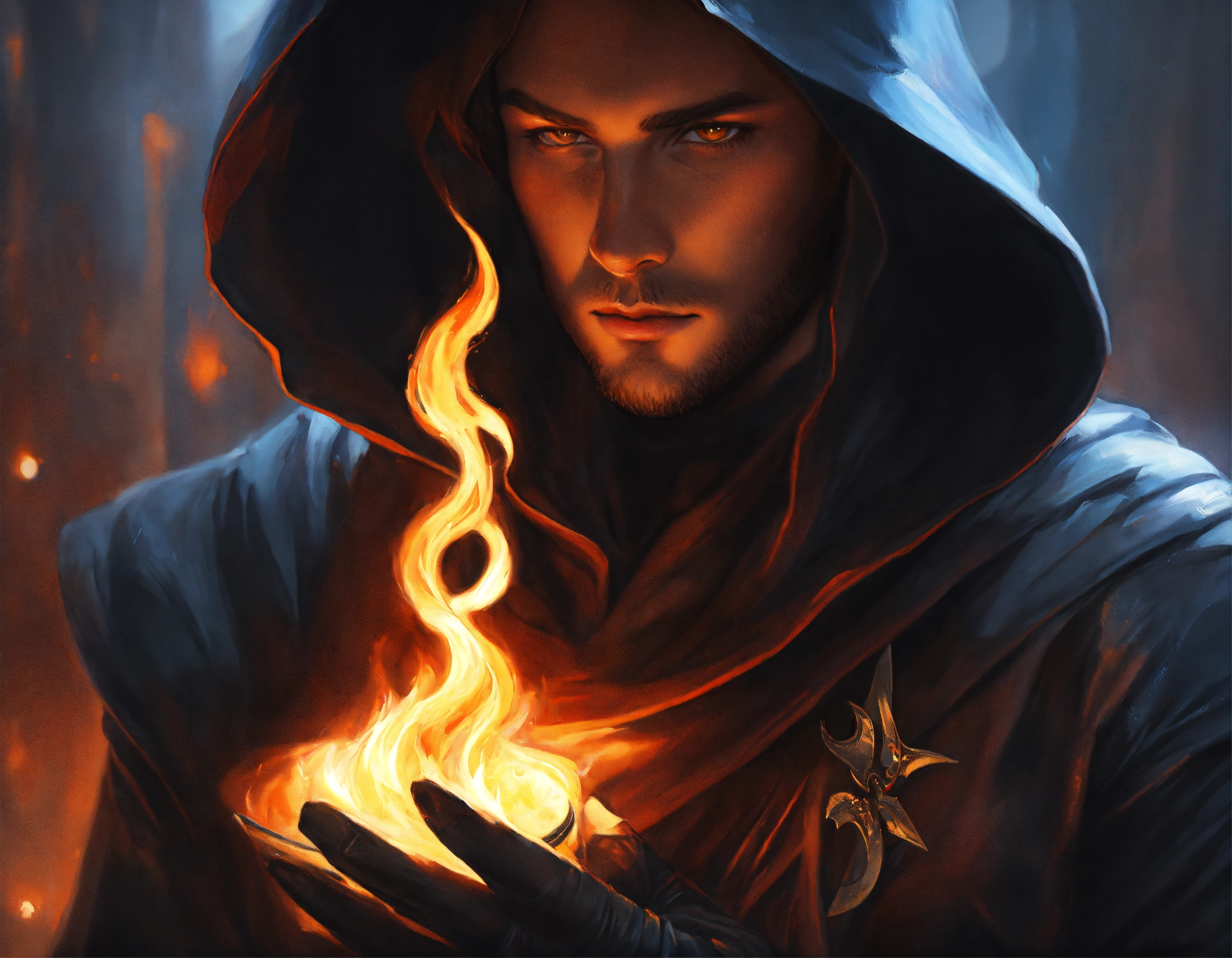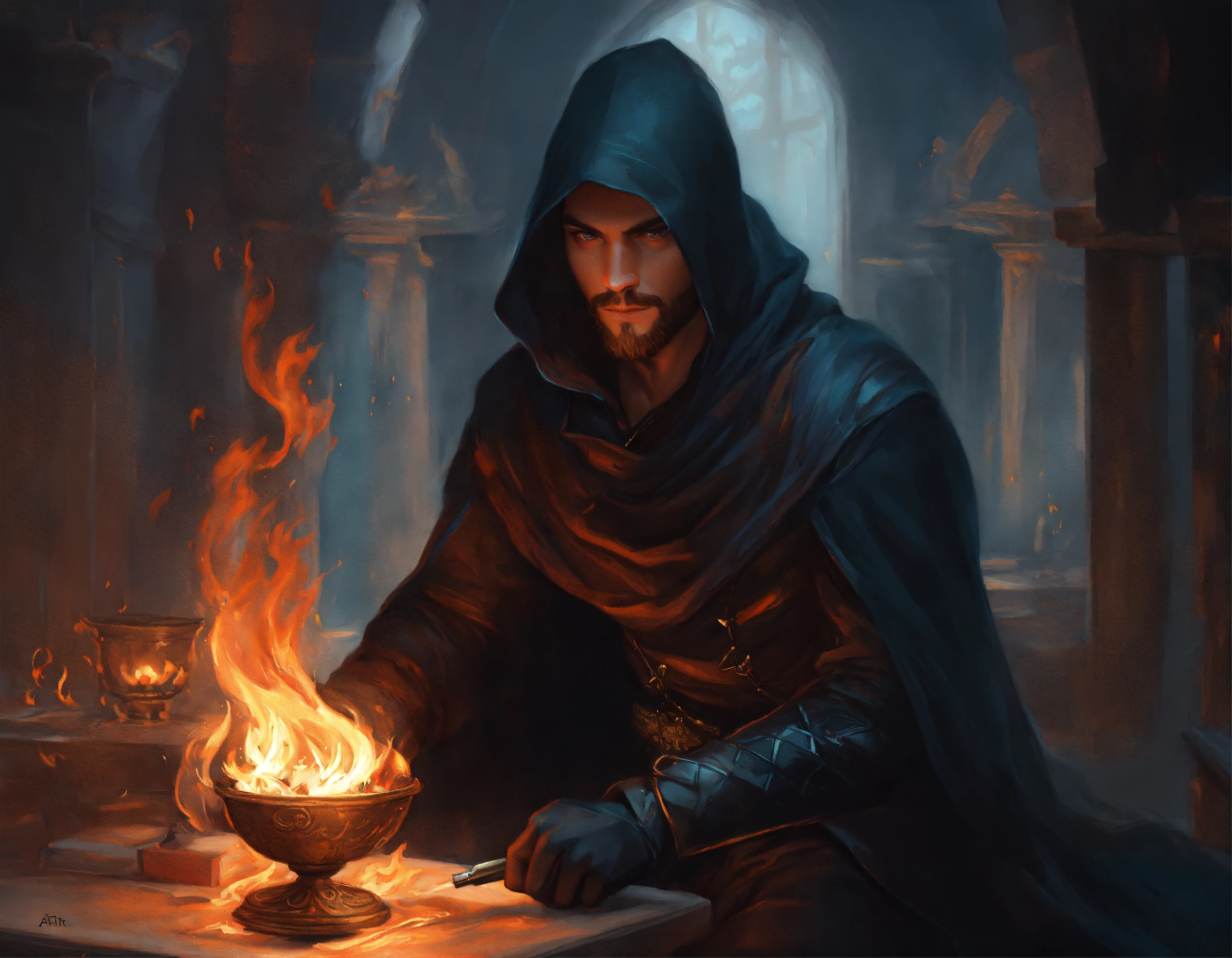 Fantasy painting, thief in black fitting cowl, casts a small magical flame in his hand, trending on artsation, by artgerm