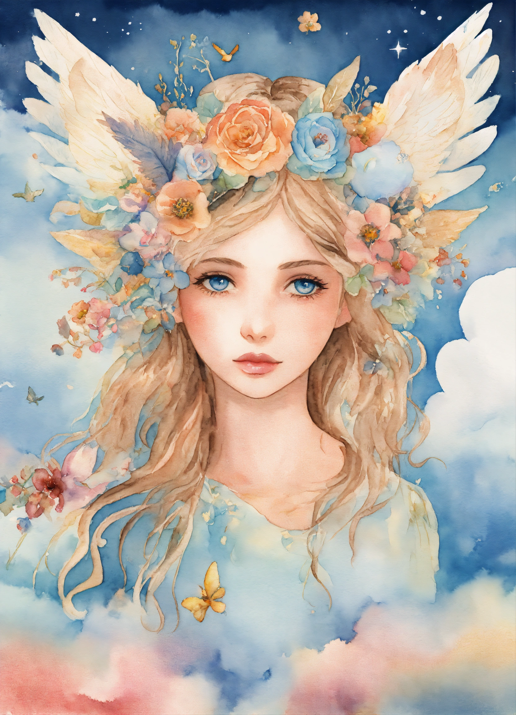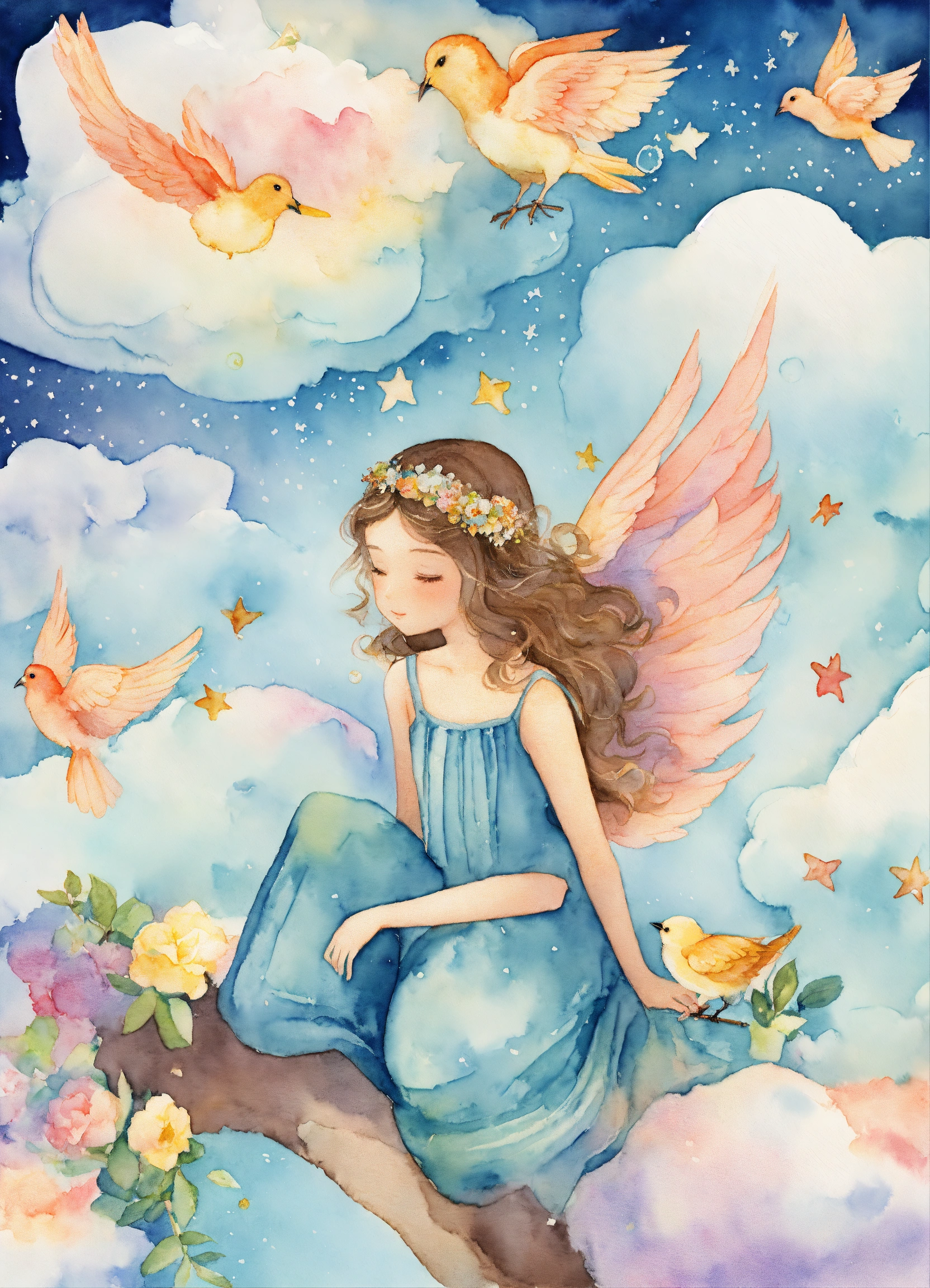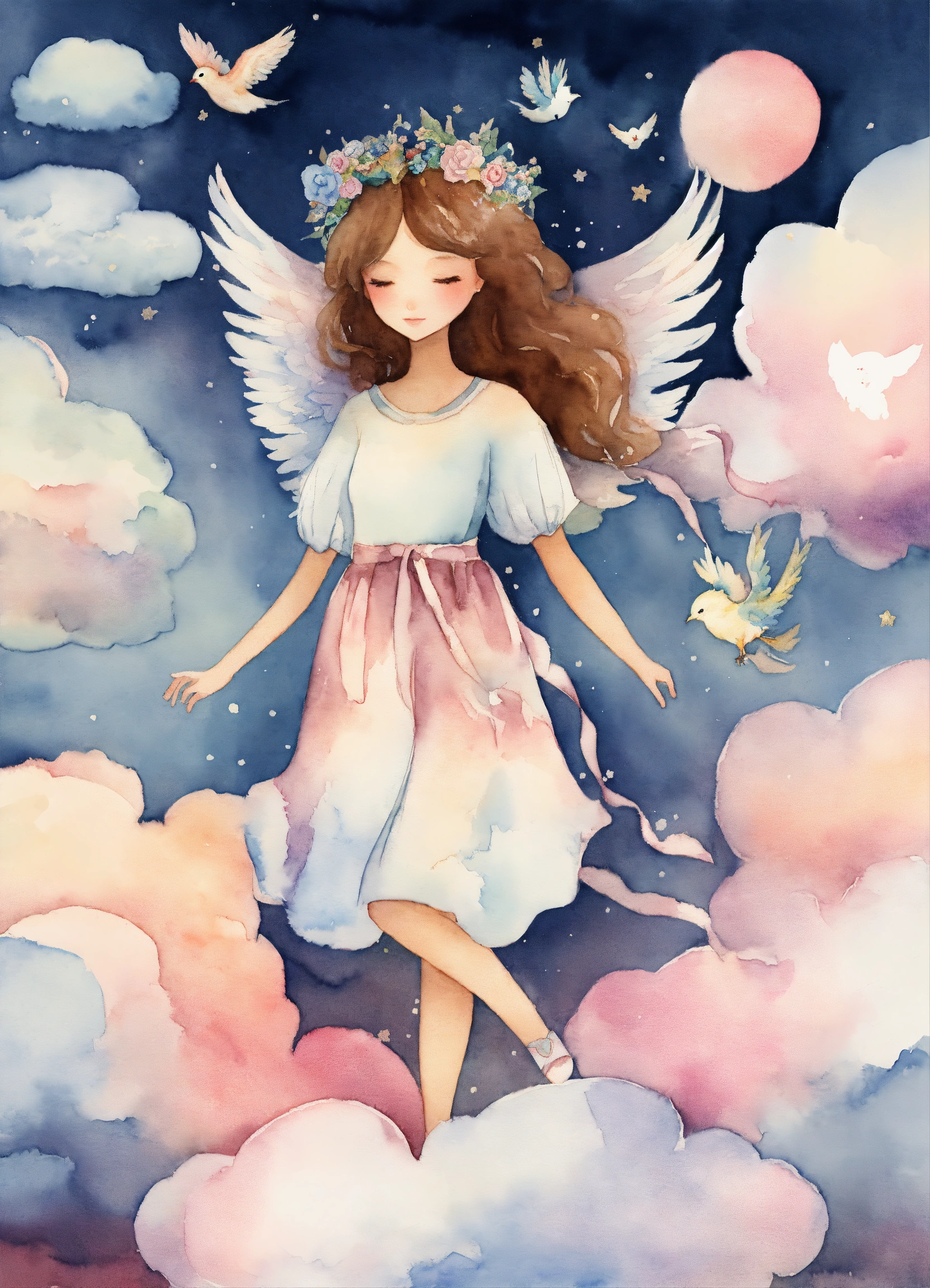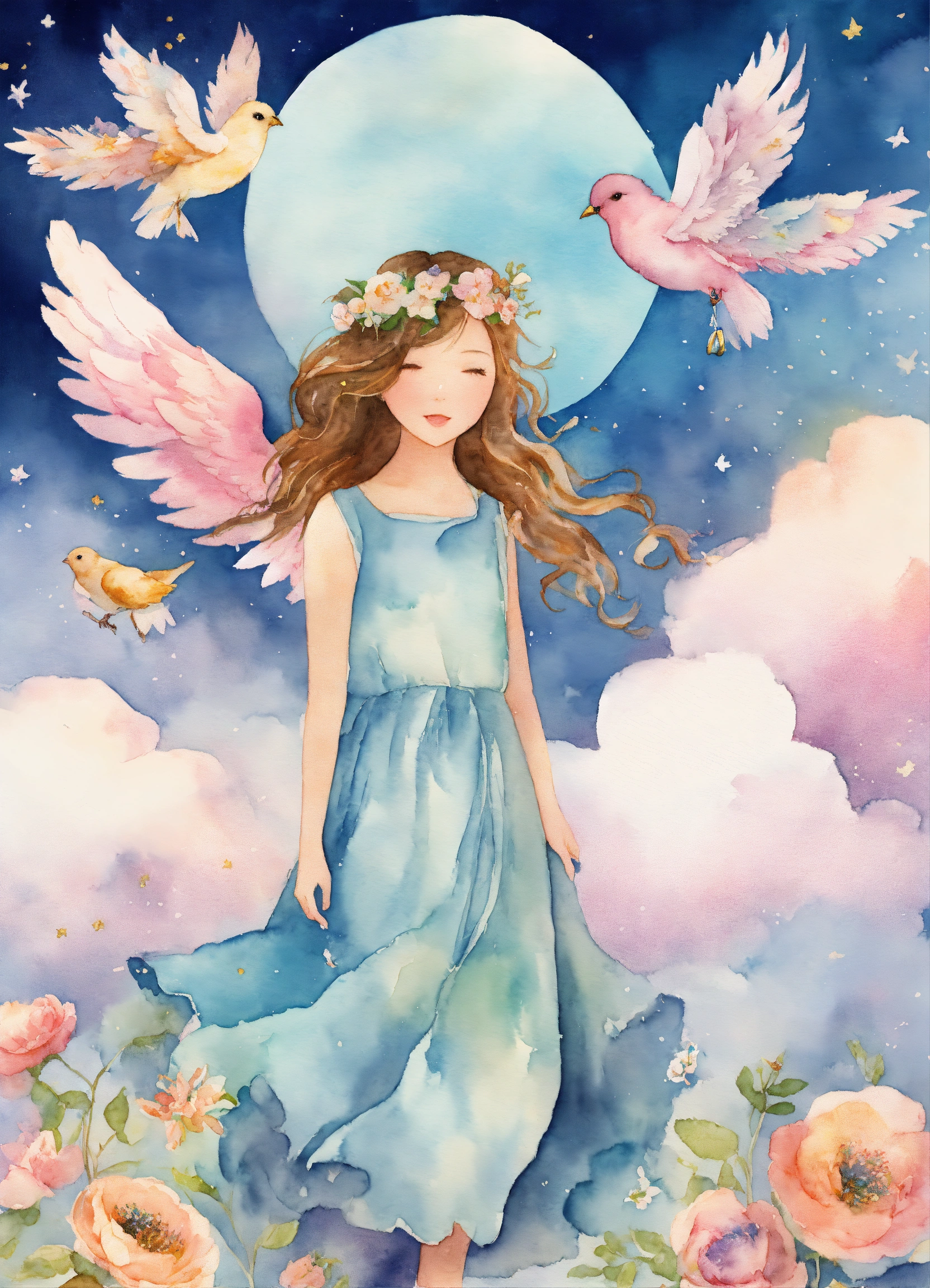 Whimsical clouds and skies angel girl, watercolor clipart, fairytale clipart png, fantasy birds, fantasy art clipart, paper craft - junk journal, scrapbooking