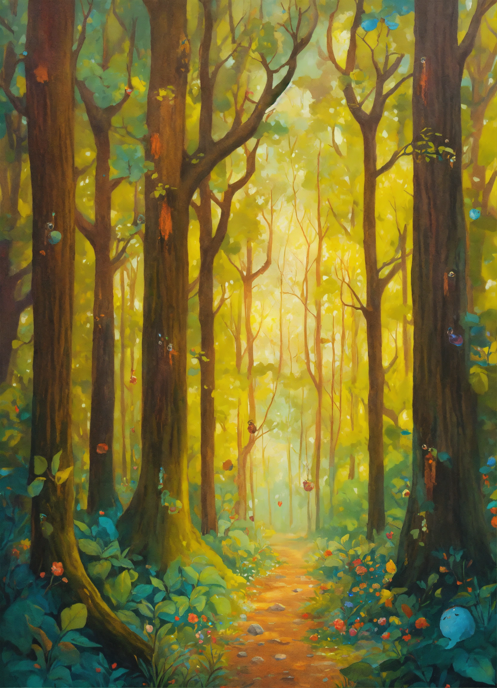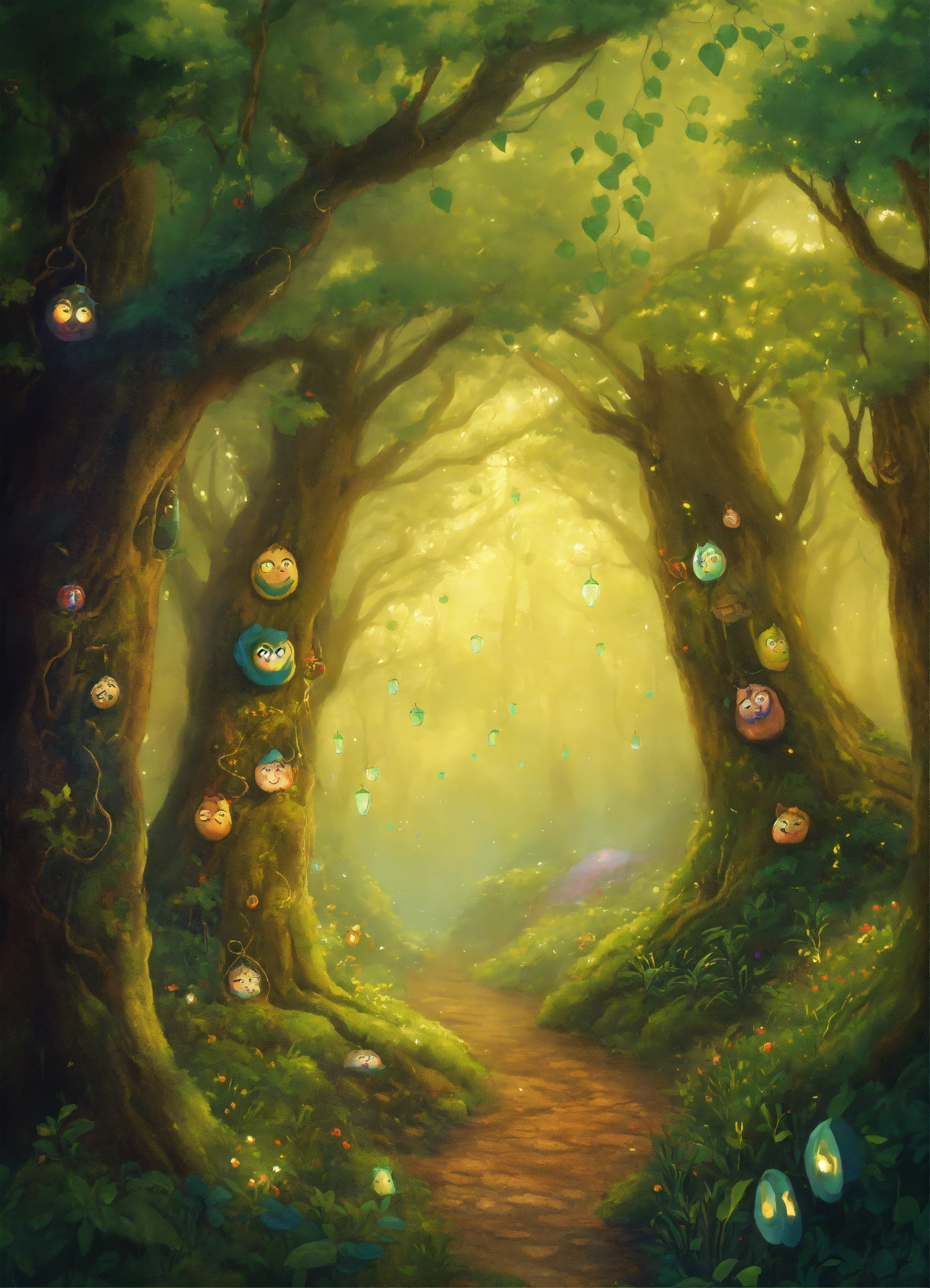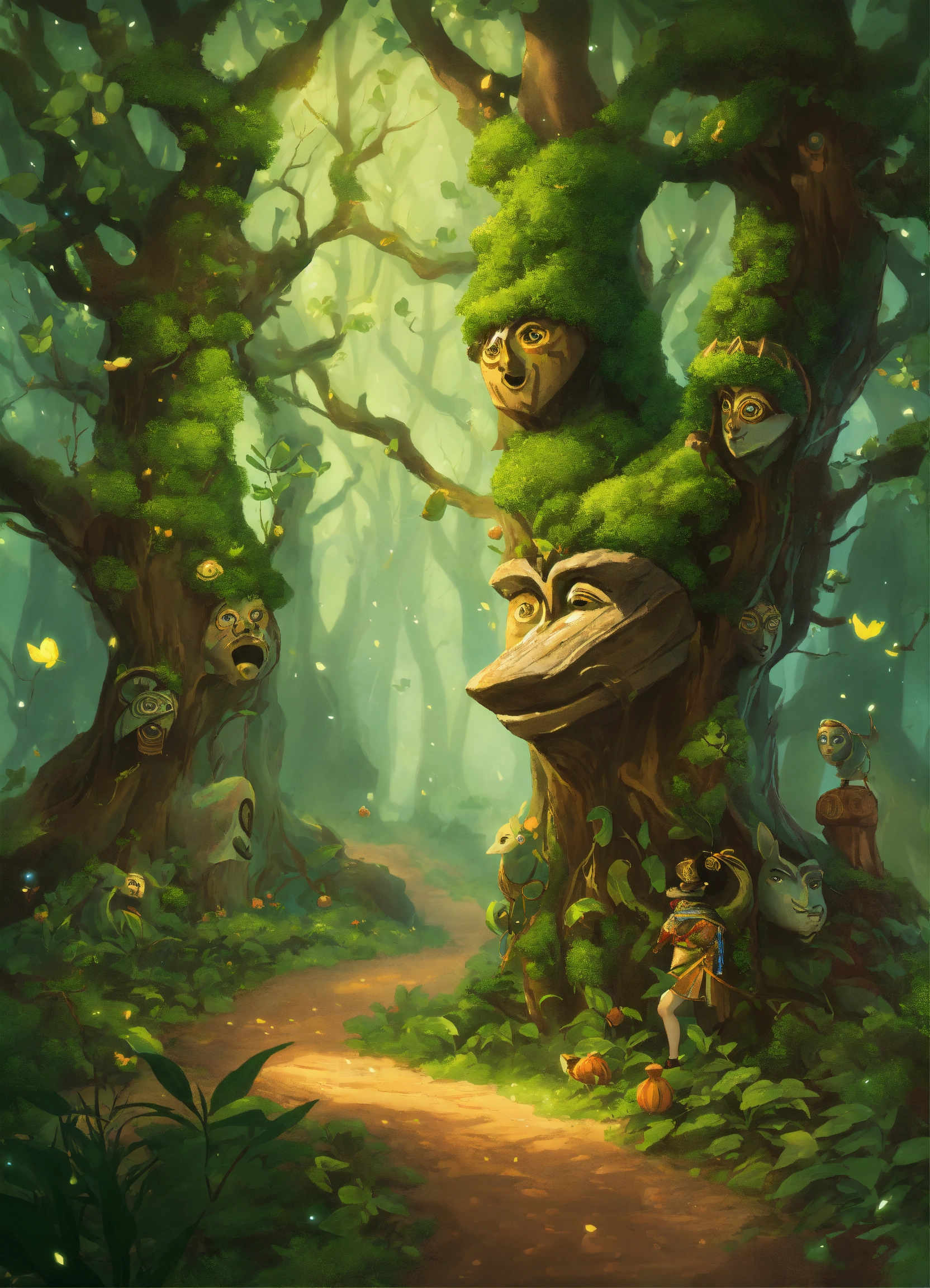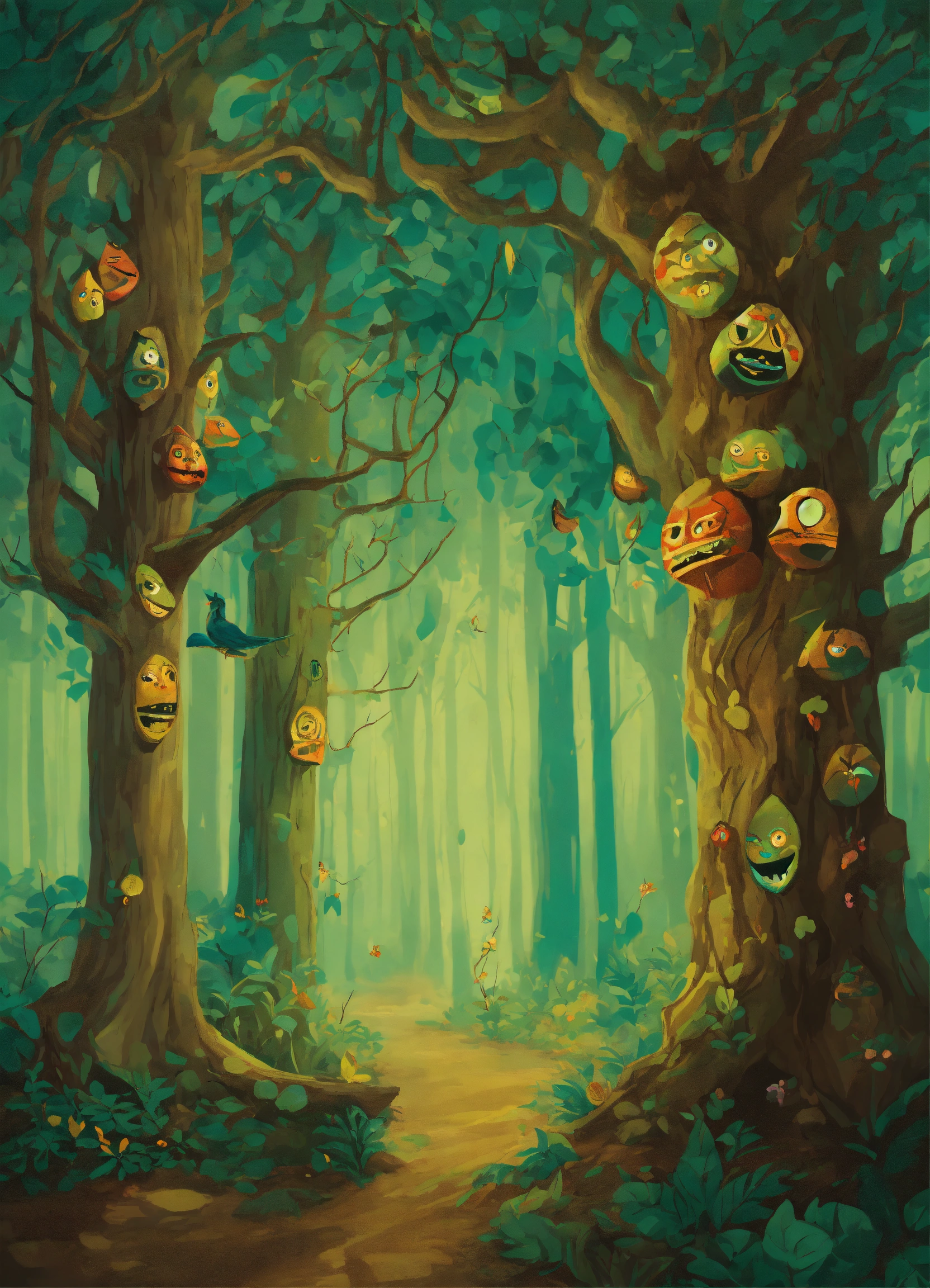 A representation of the mystical woods, with trees that appear to have magical faces and expressions.