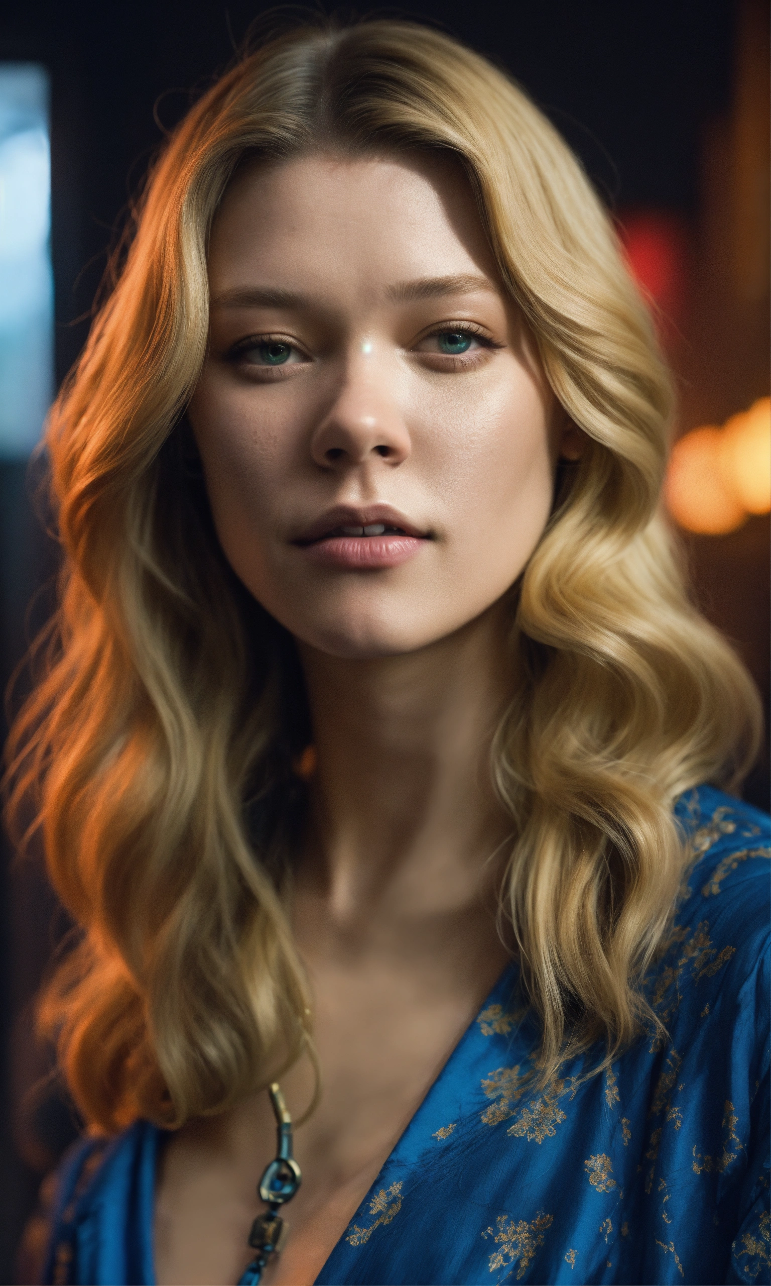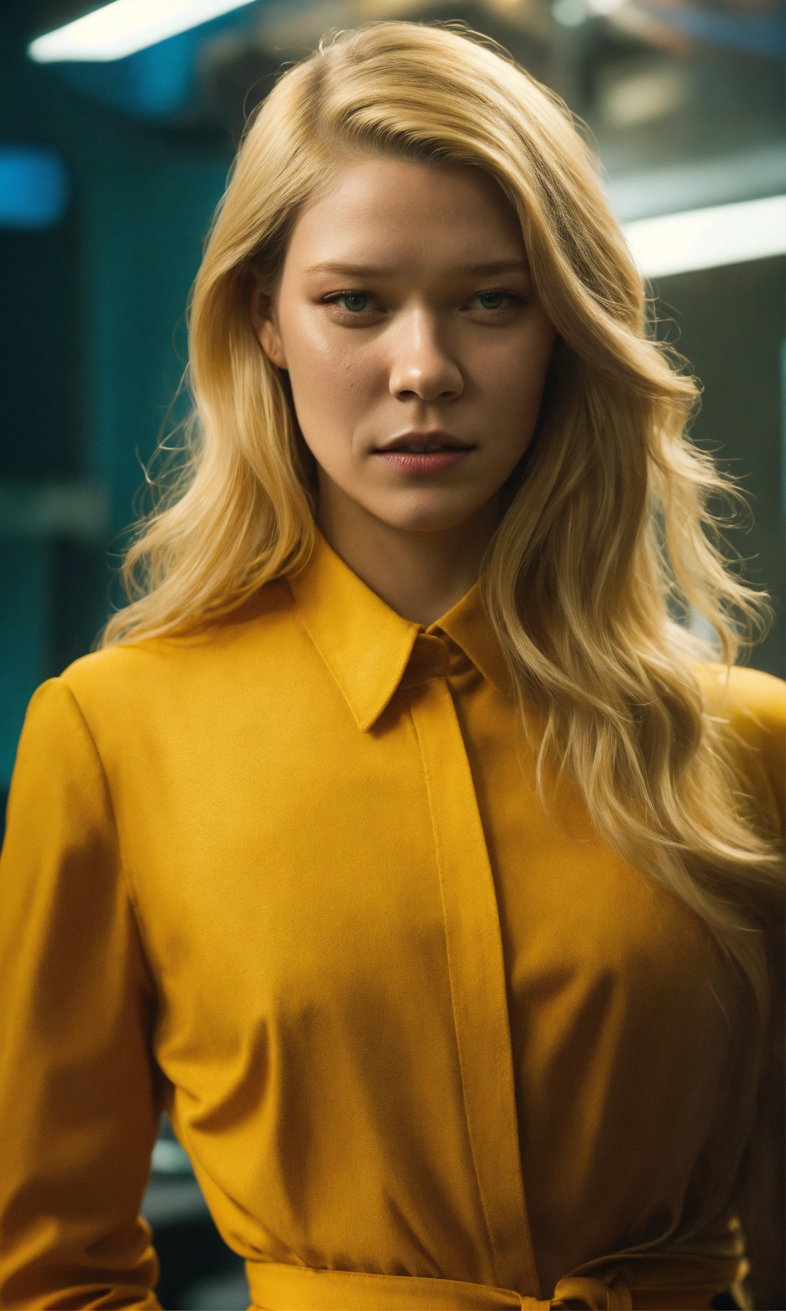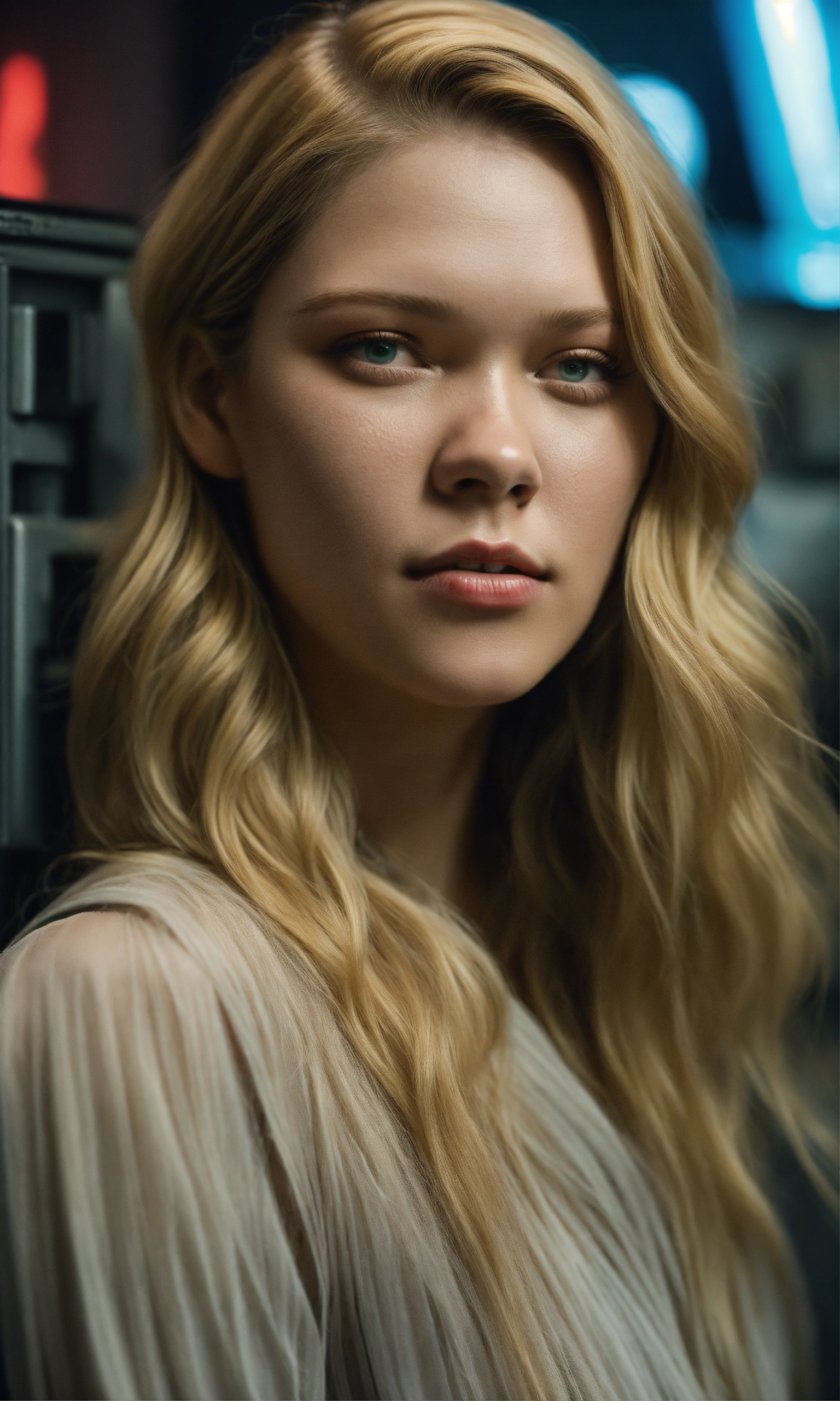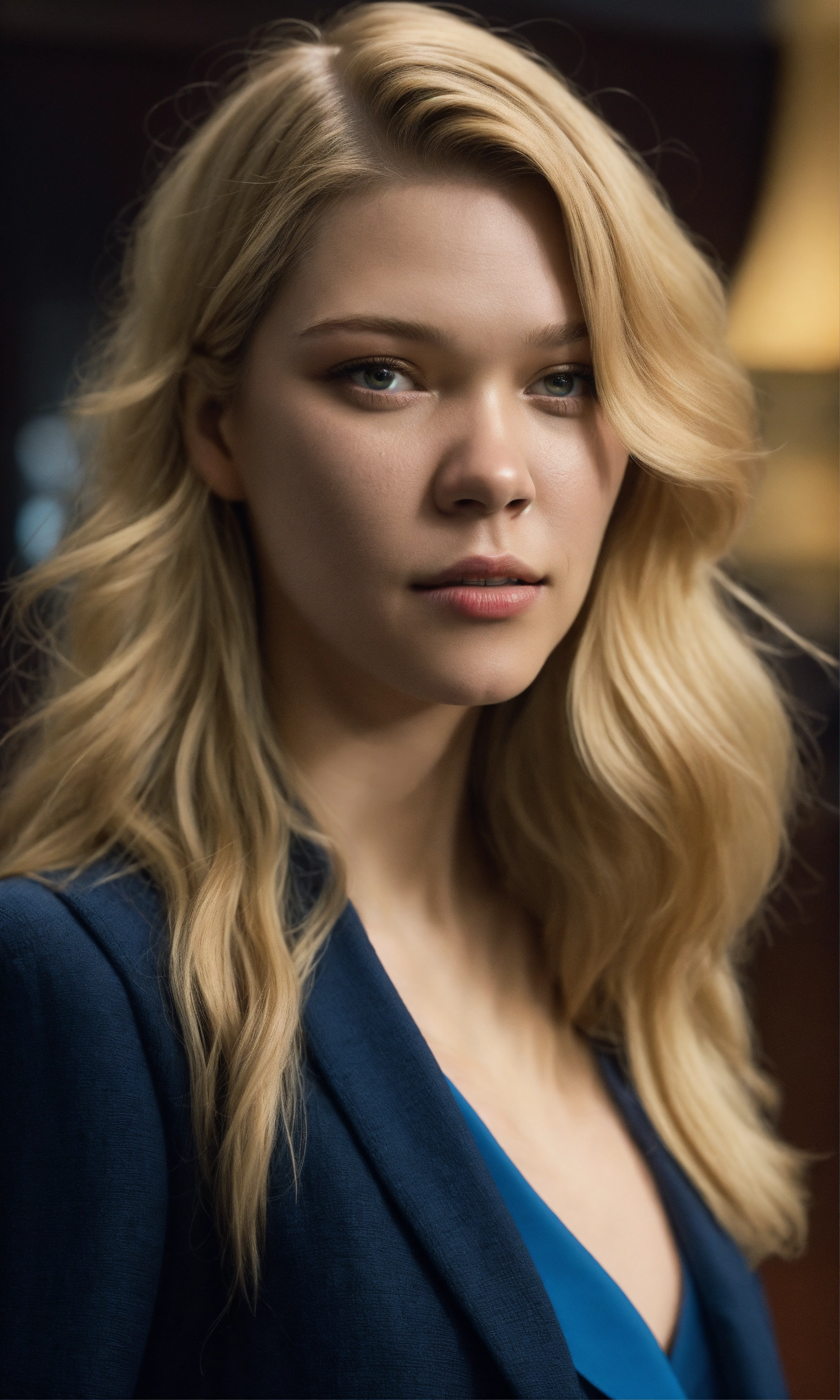 Beautiful blonde girl, lea seydoux long hair, altered carbon style, very realistic, 27 years old, serial killer hunt, business lady