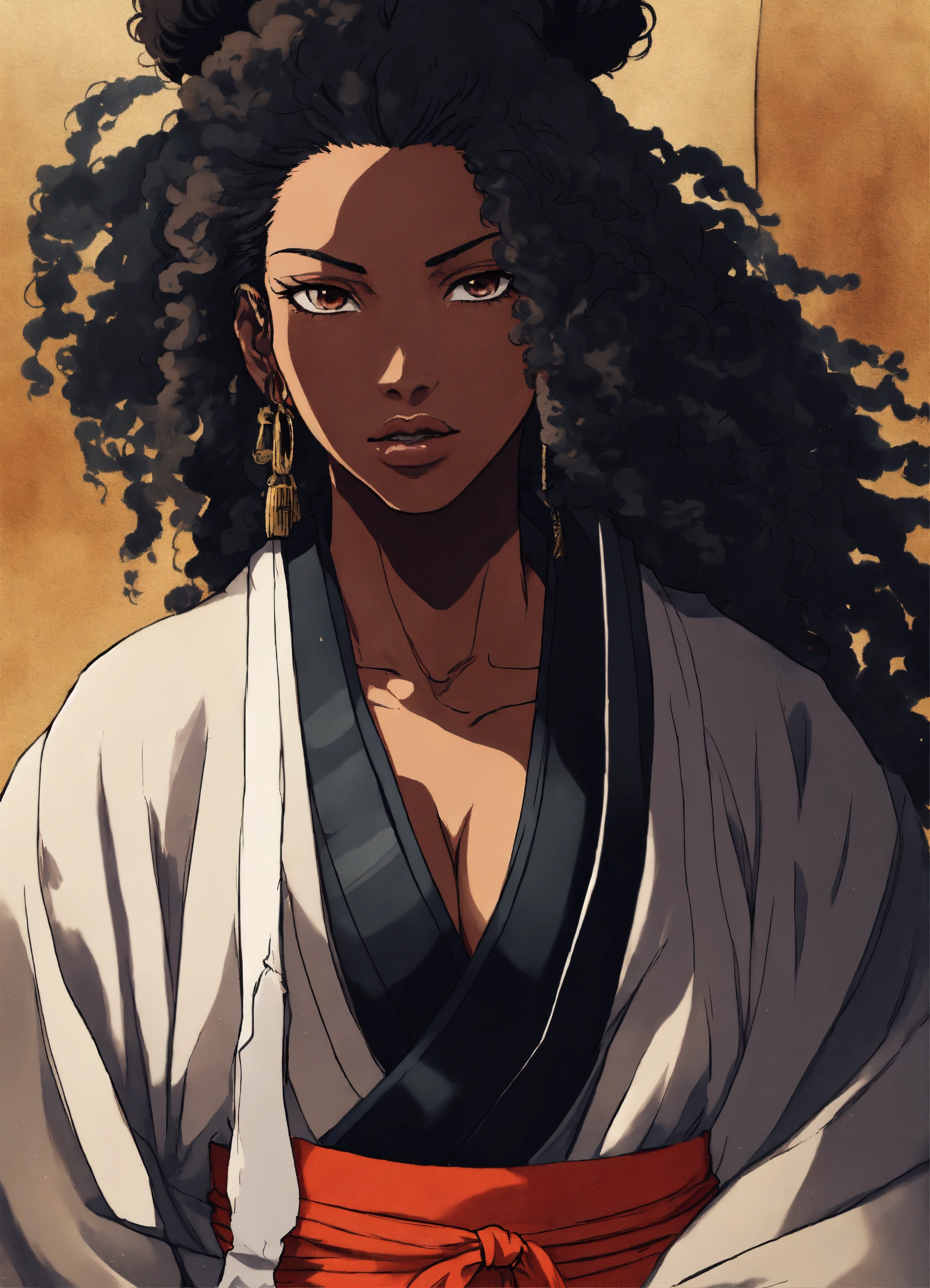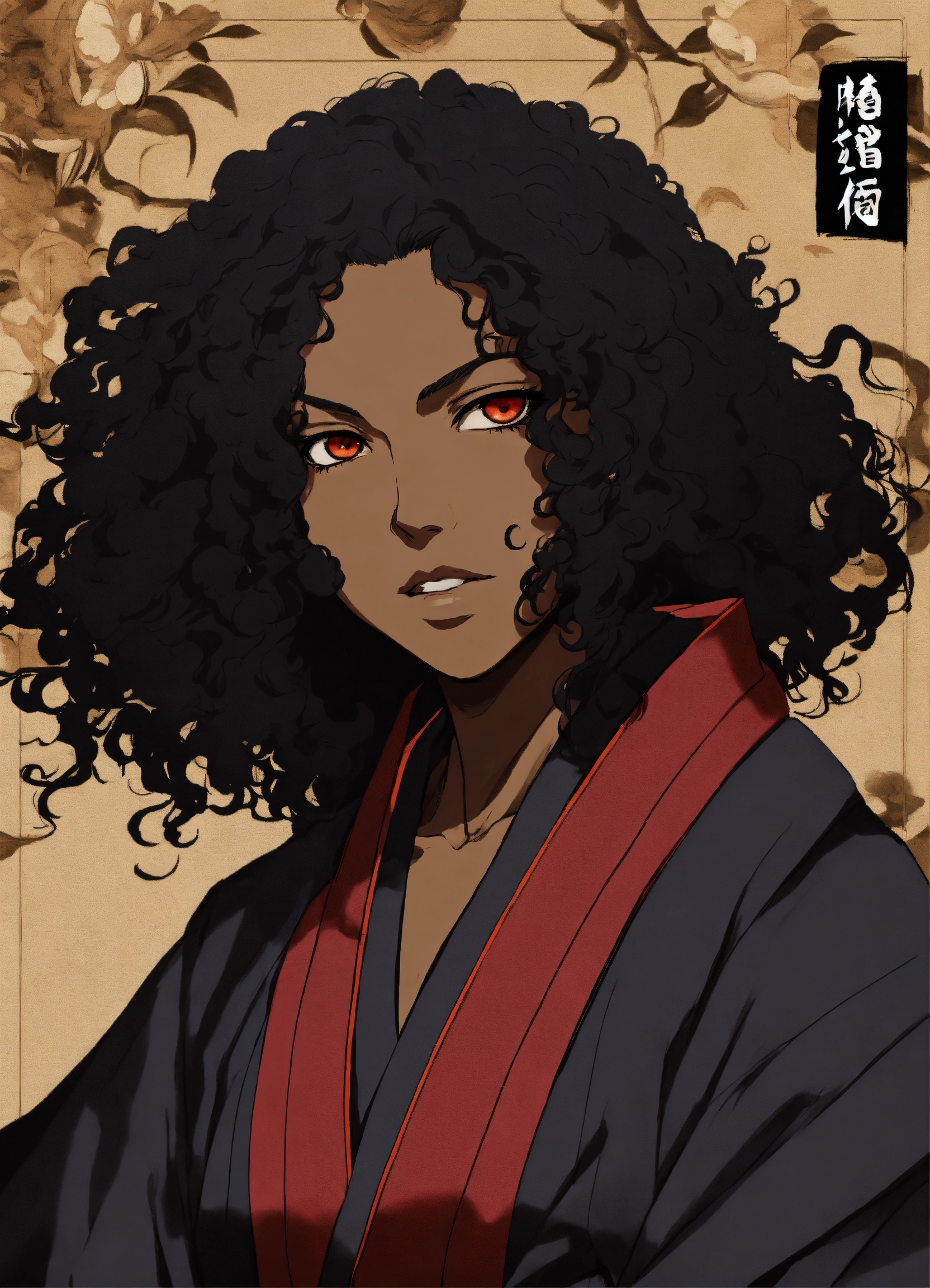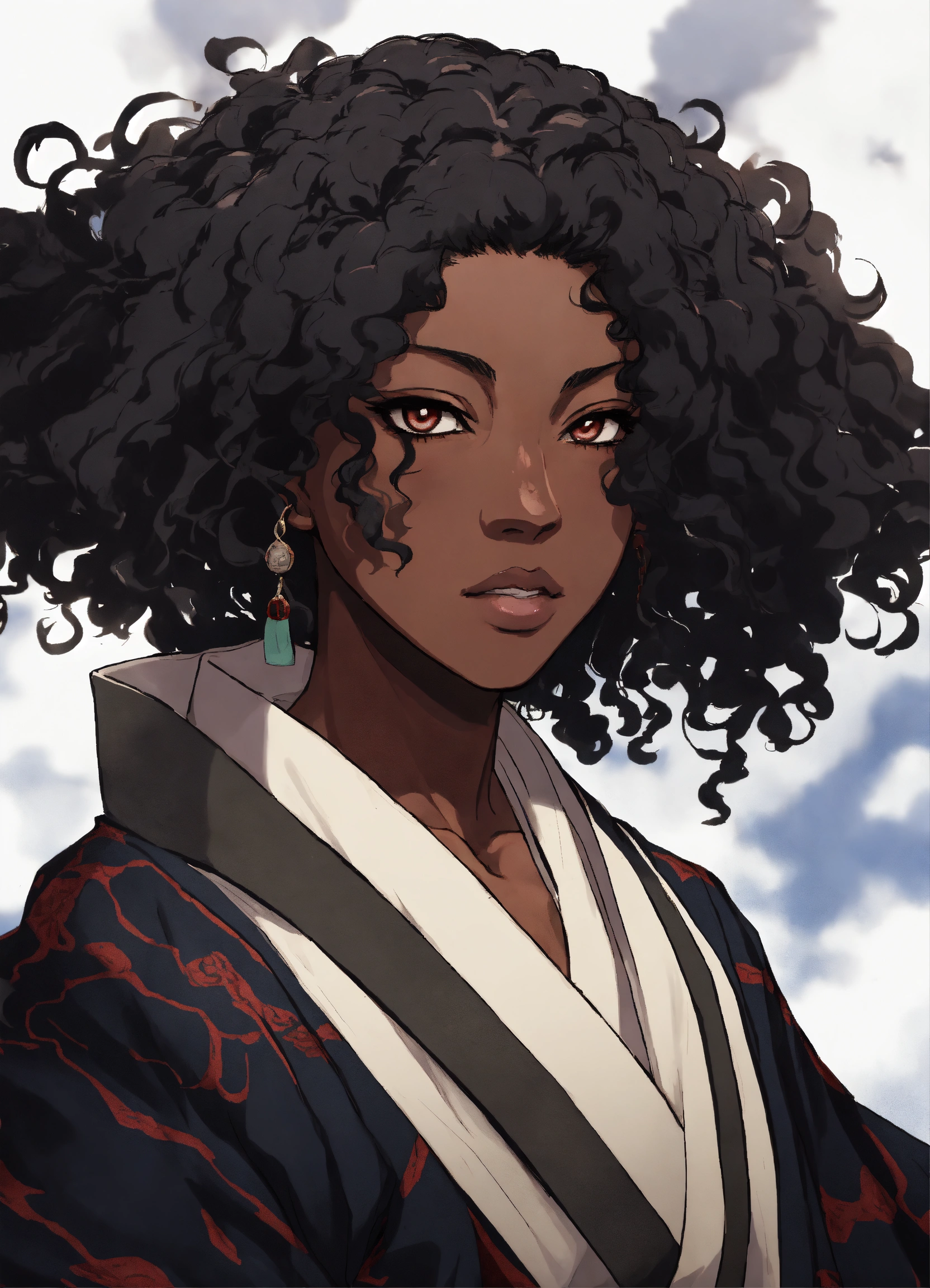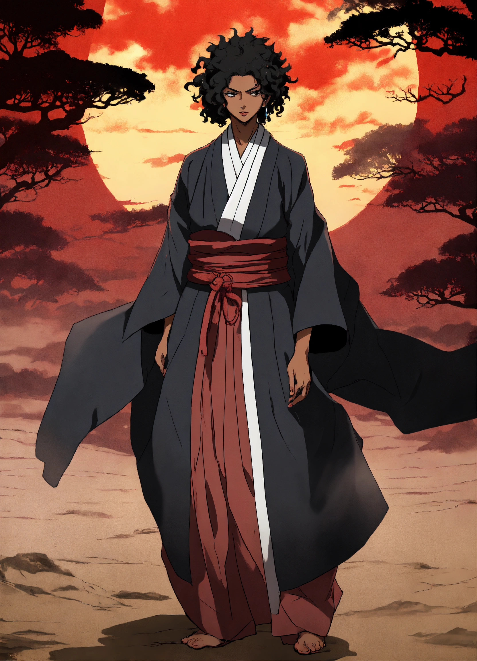 A black woman shunsui sakuranosuke jirō kyōraku with full lips and a broad nose and full dark curly textured hair dressed in shinigami robes, drawn in the style of tite kubo, bleach thousand year blood war, african features, anime, animation, full body