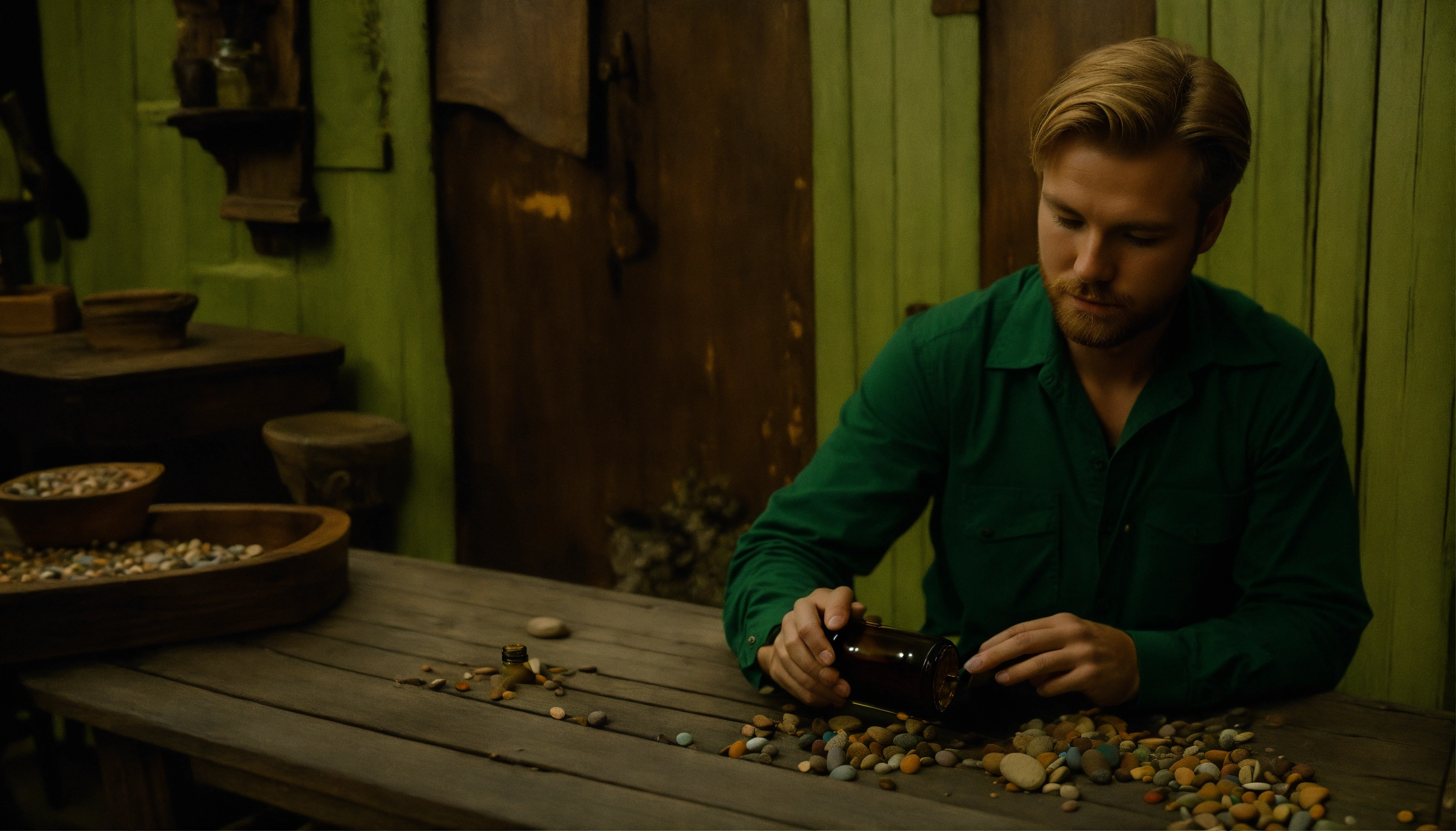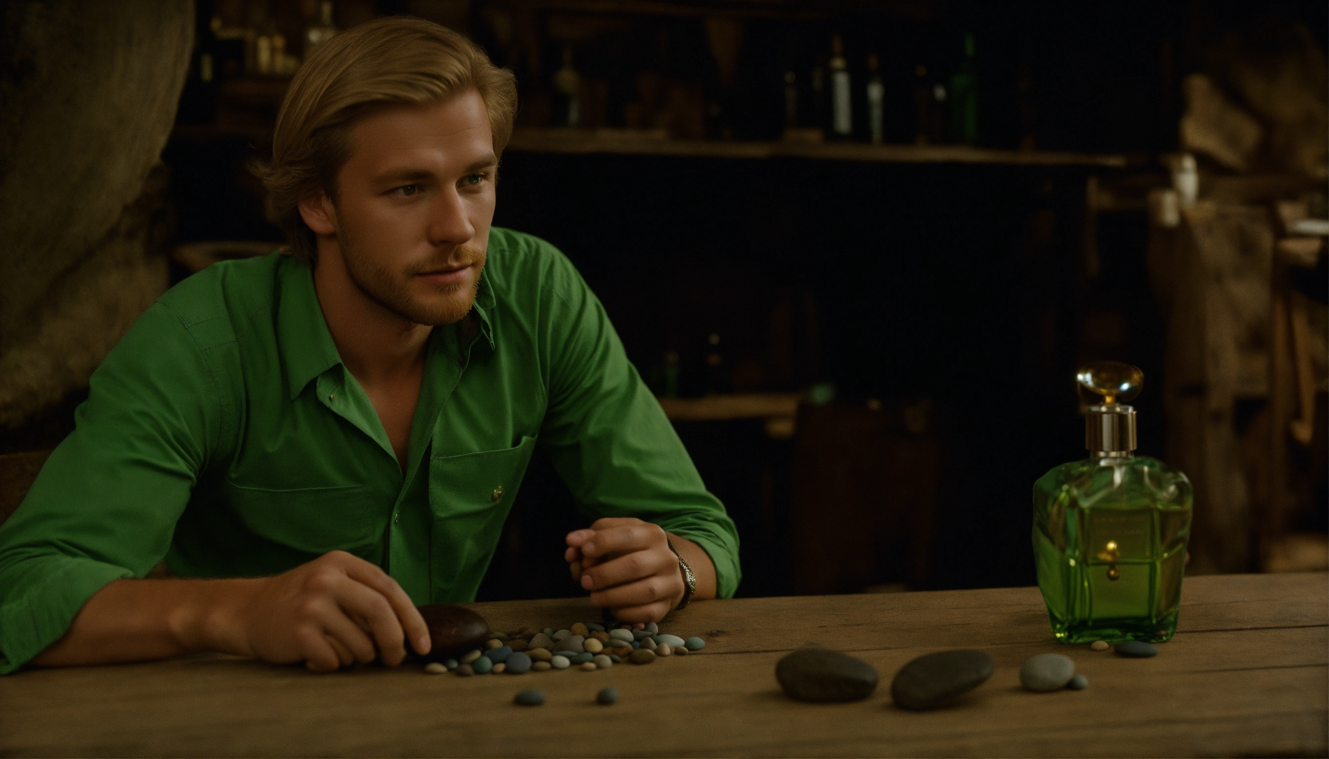 A norwegian, wearing a green shirt and brown trousers. he has blond hair and is 30 years old. he is sitting at an antique wooden table putting pebbles from the hudson river into an open perfume bottle. 1950