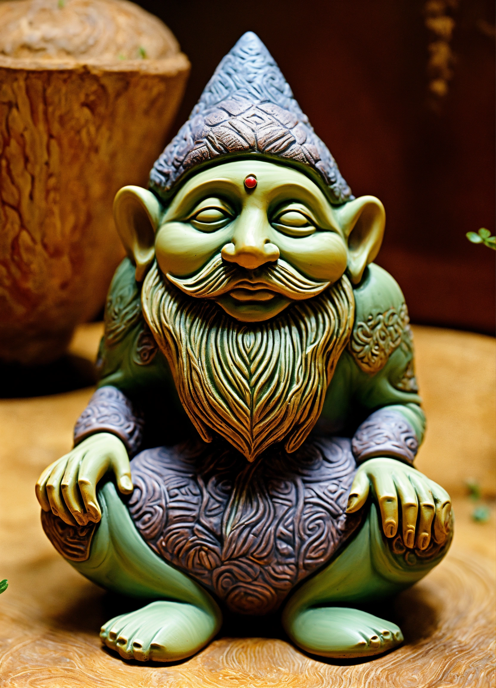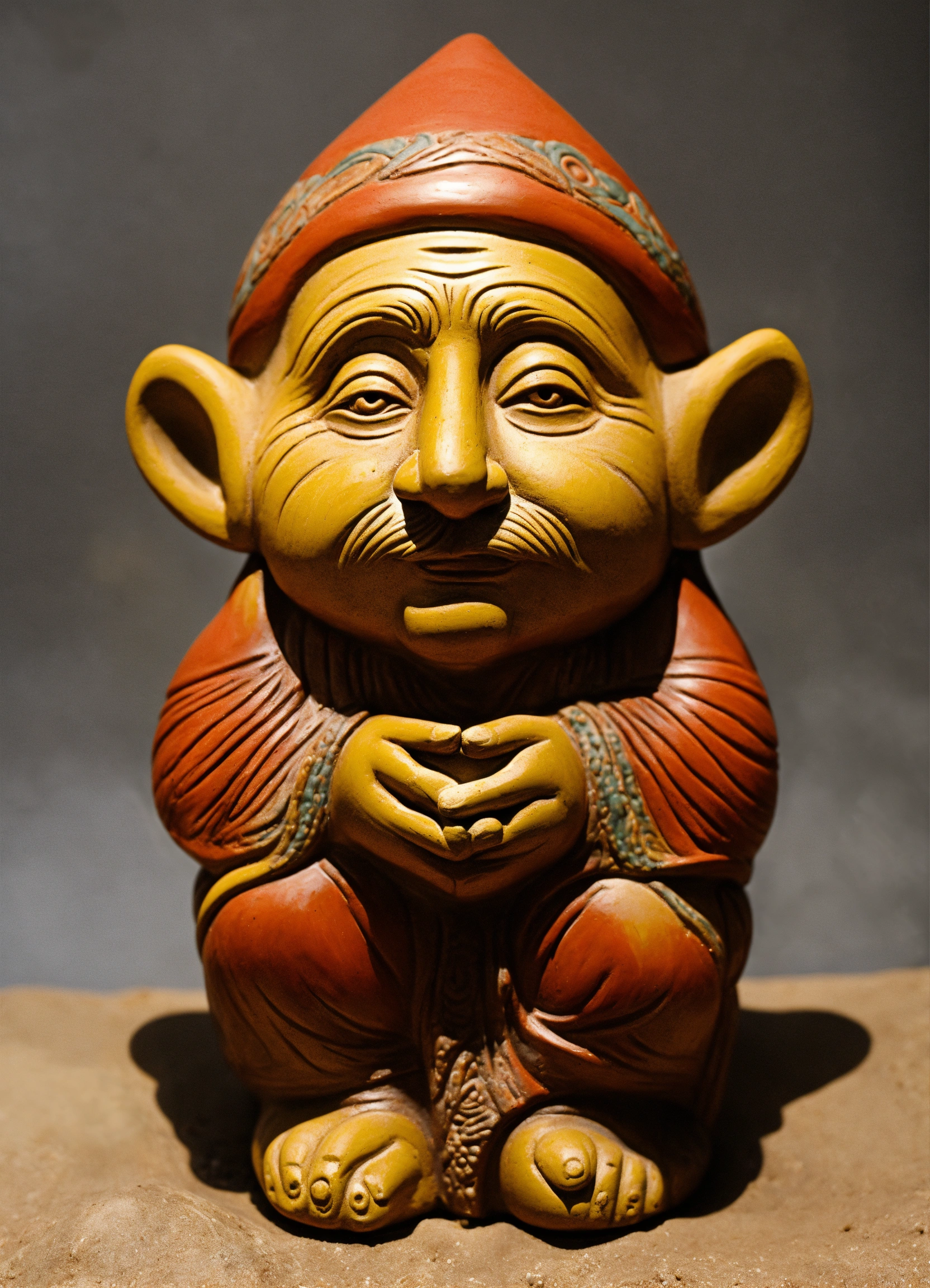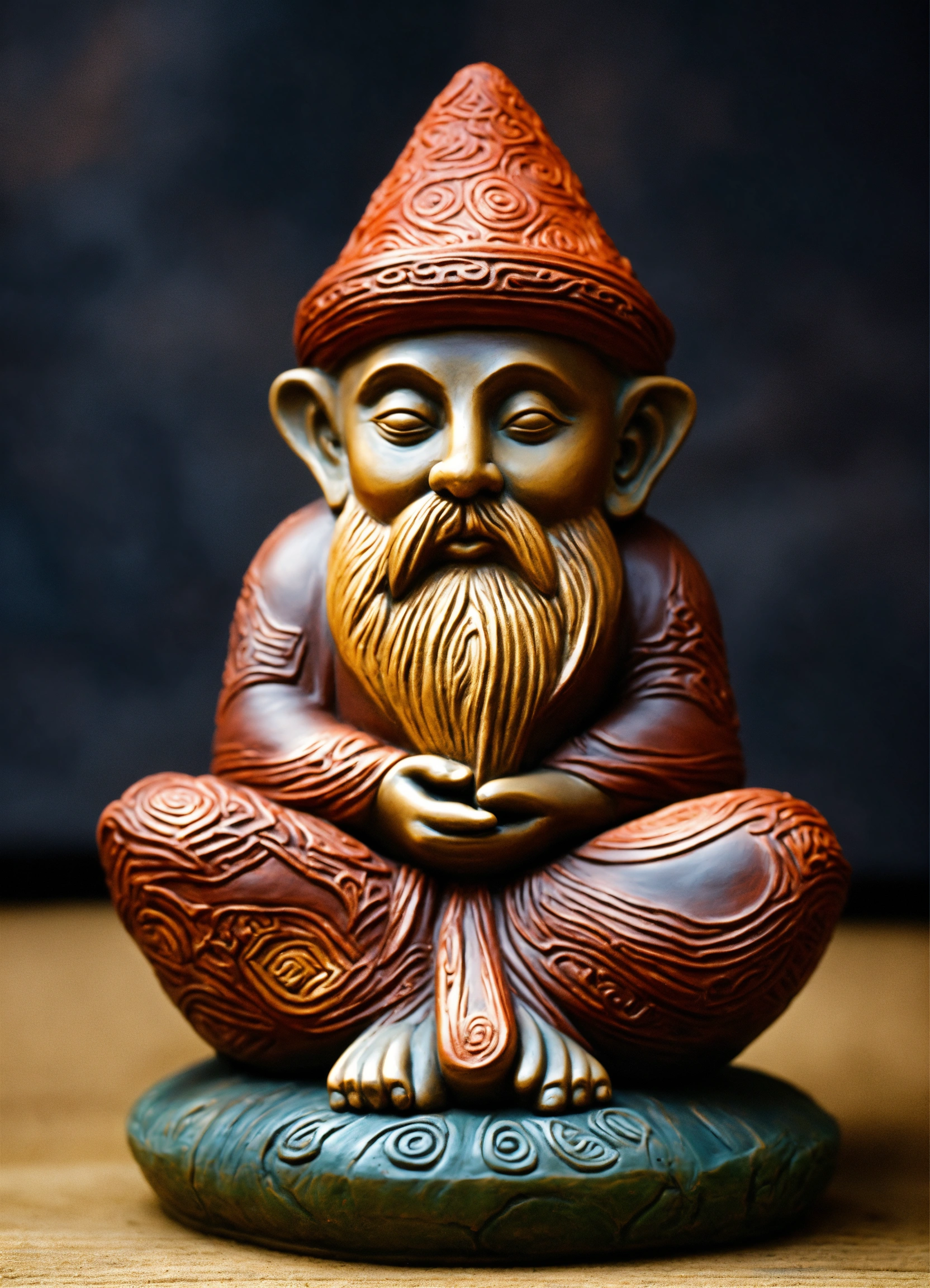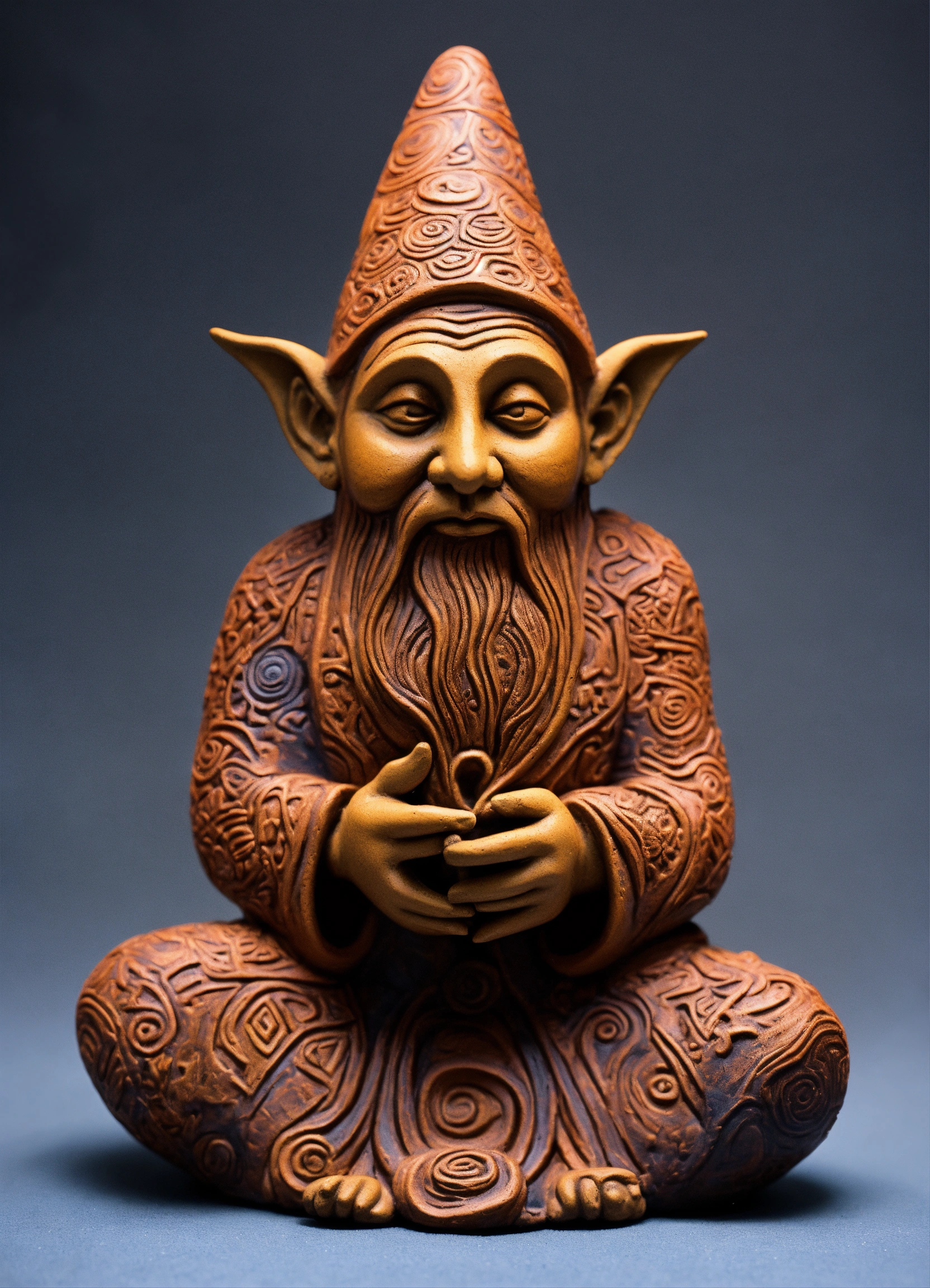 An ancient clay meditative roundshaped gnome hand made sculptured in the style of alex grey