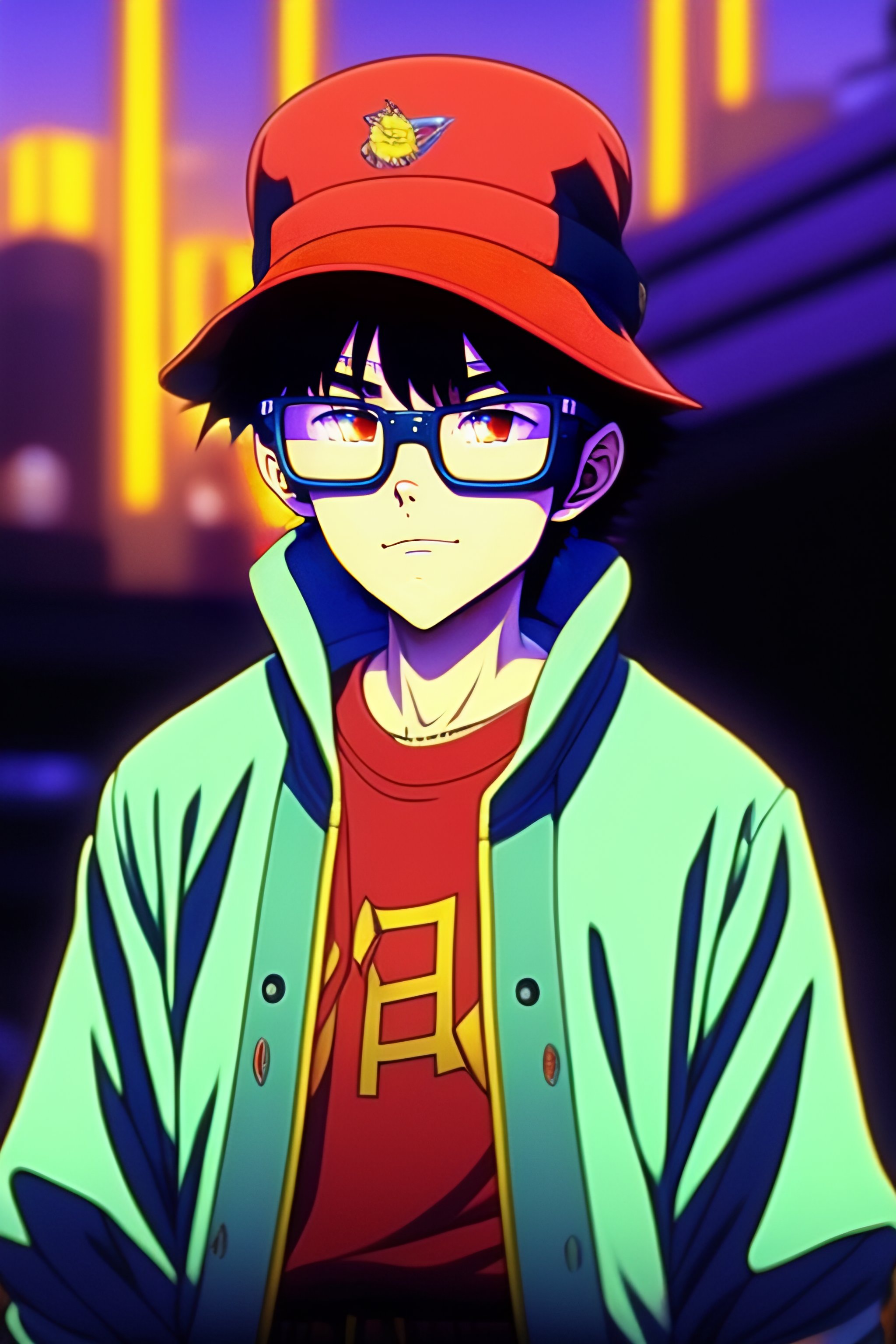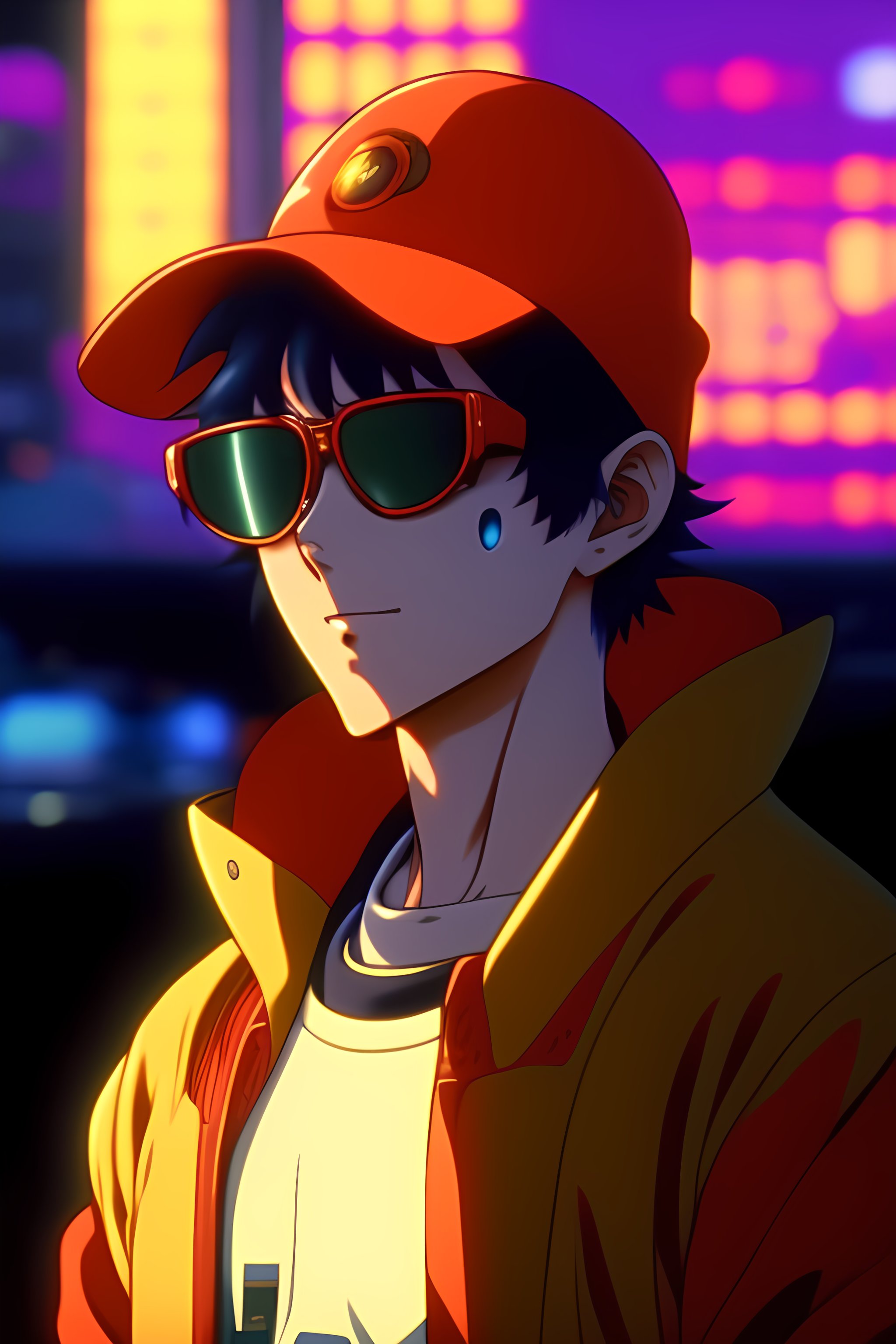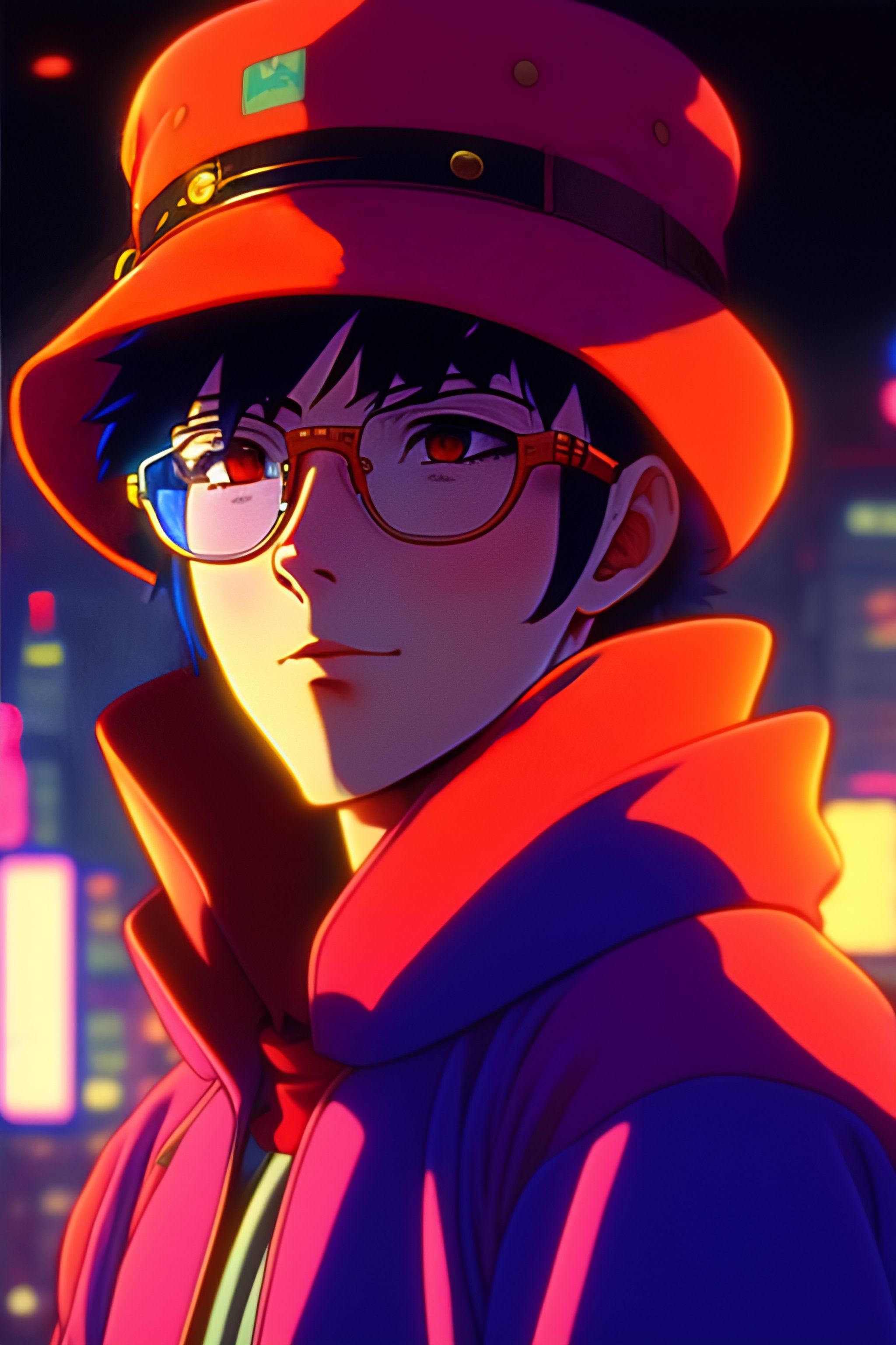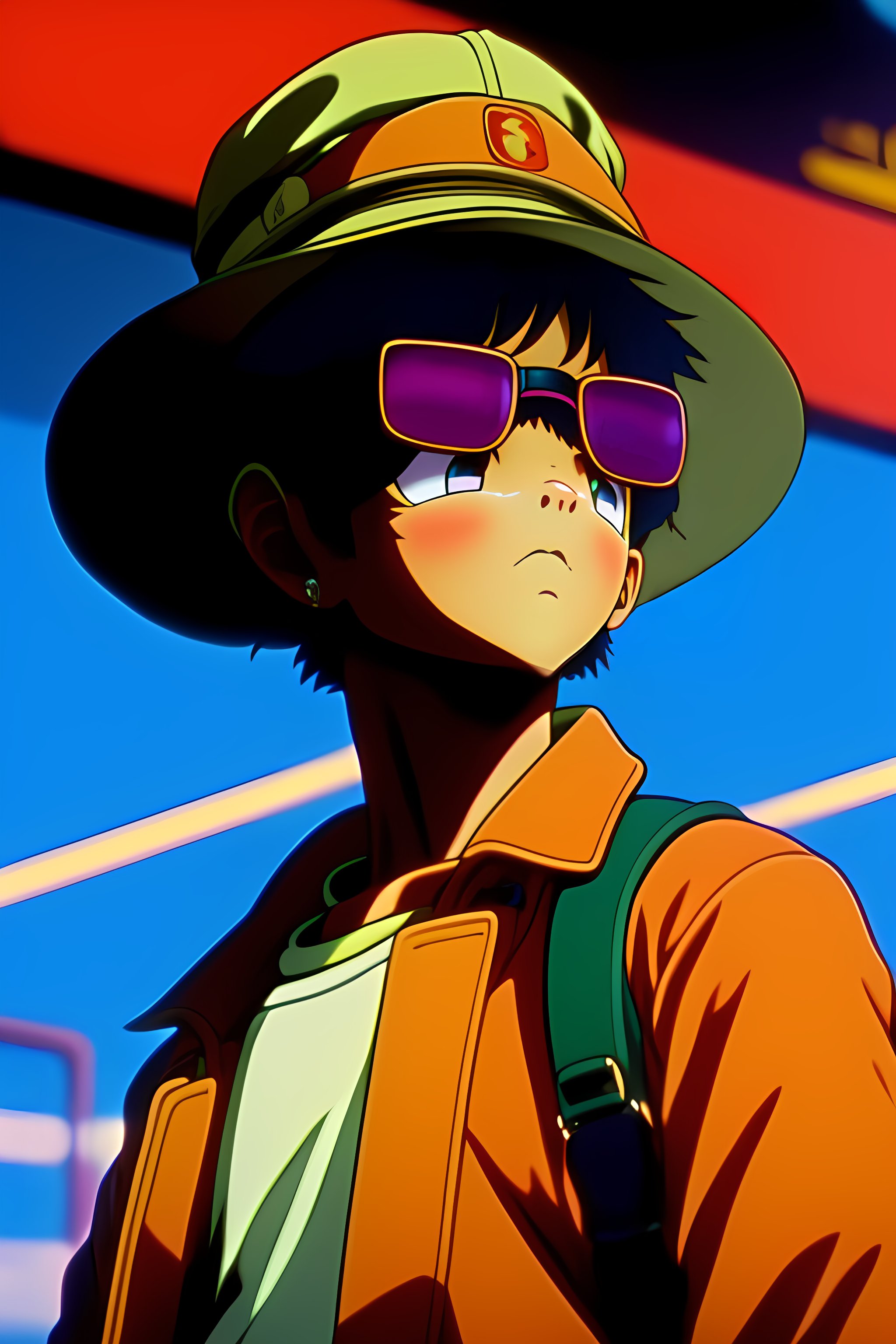 Vintage anime screenshot from akira, 90’s anime aesthetic. a cat with round dark glasses and a bucket hat, covering himself from the light very cyberpunk