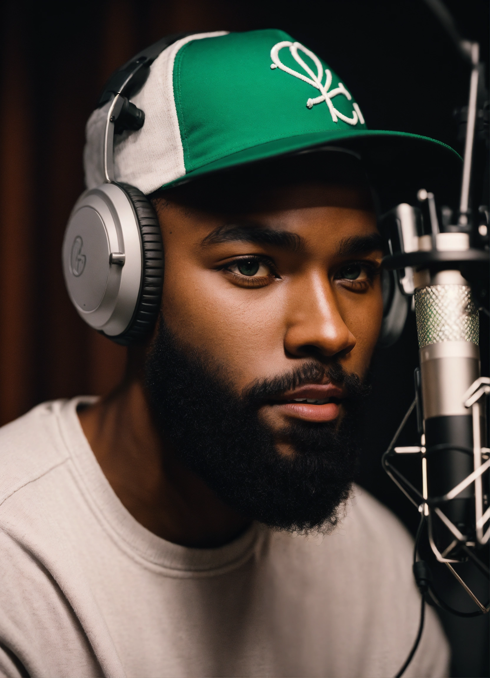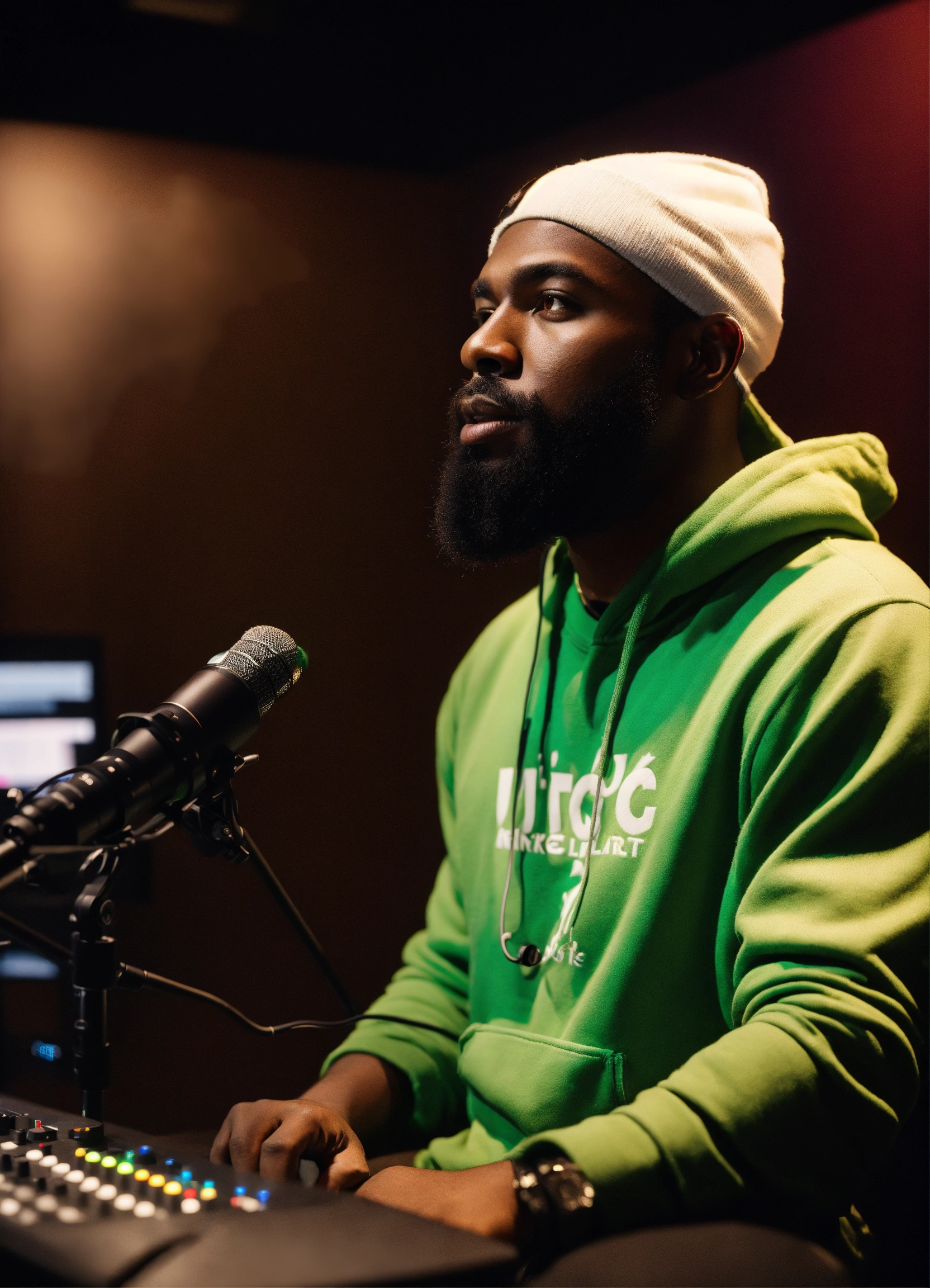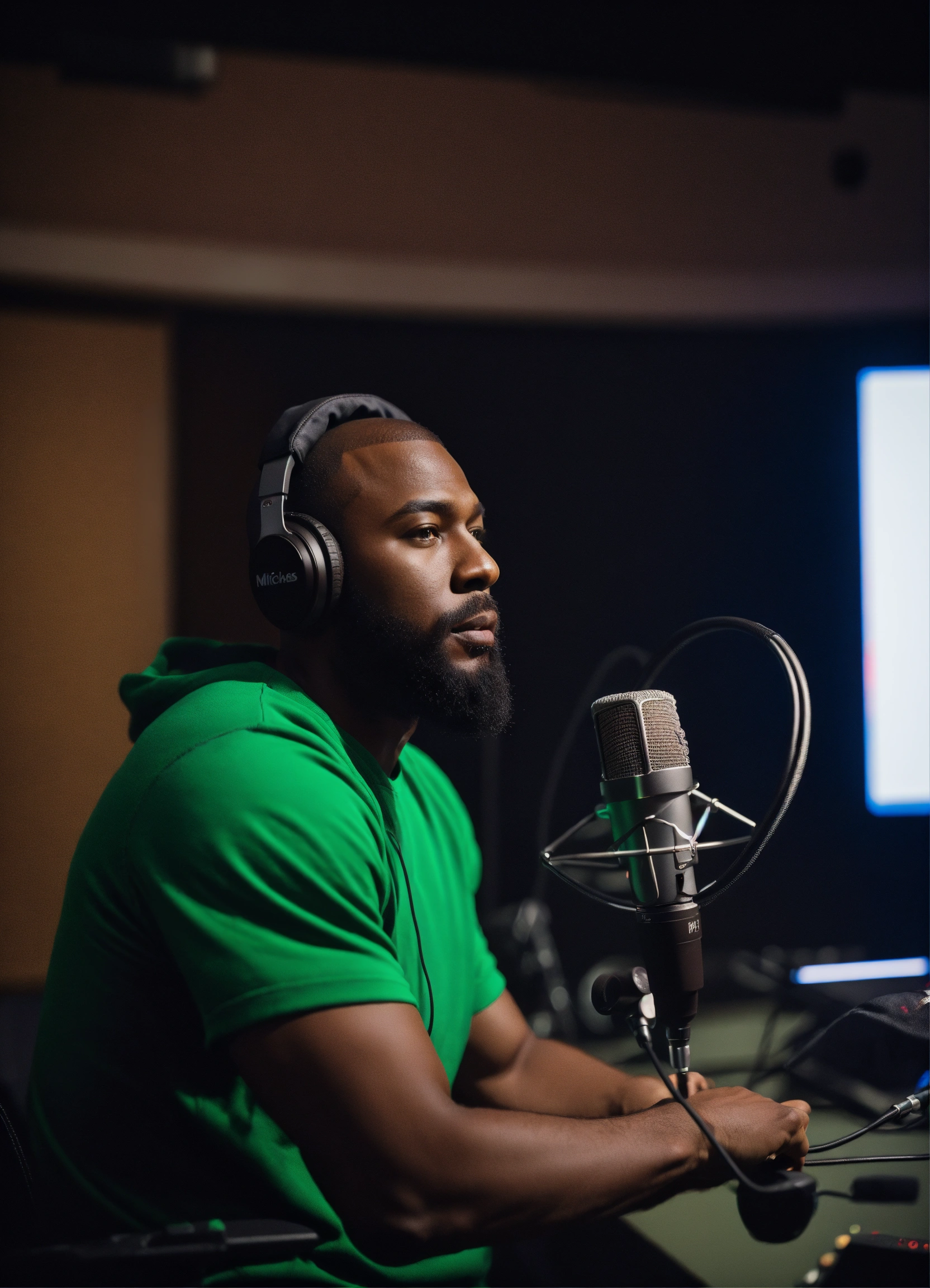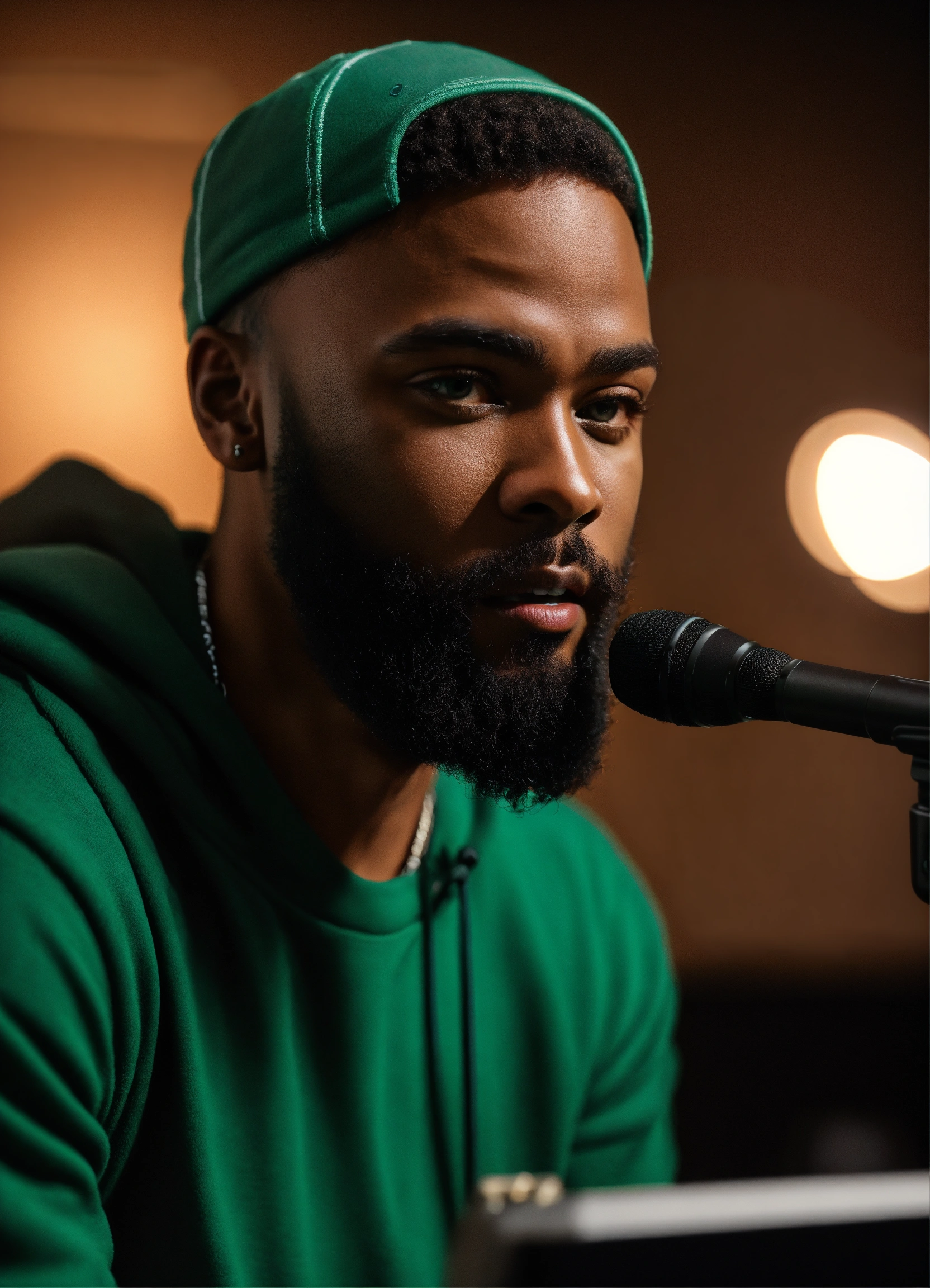 Real photo of a gugu e michaels chocolate dark skin tone handsome black man with beard, bald with white cap, talking into a mic with a short mic stand at a podcast studio, in a very large fancy studio, wearing long sleeve to the writst green sweat shirt and white atlanta sun visor, black jeans, very realistic, ultimate detail, 8k, face front looking straight into the camera, 8k, expensive recording studio with dark brown background, extreme detail, cinematic lighting, face front, brown eyes looking at camera.
