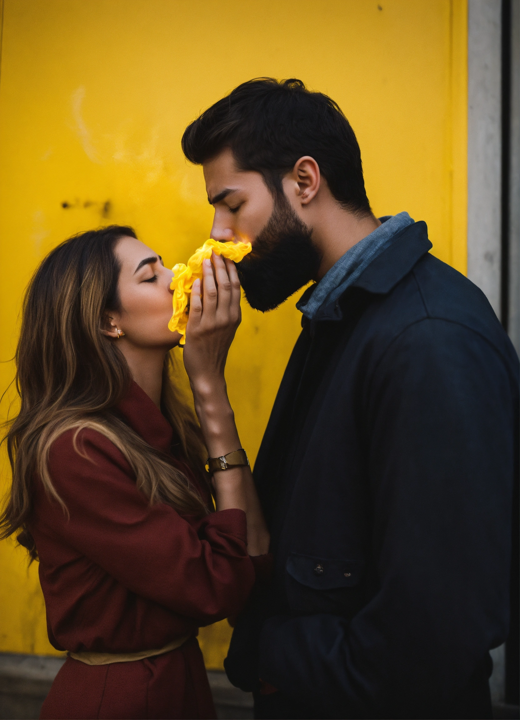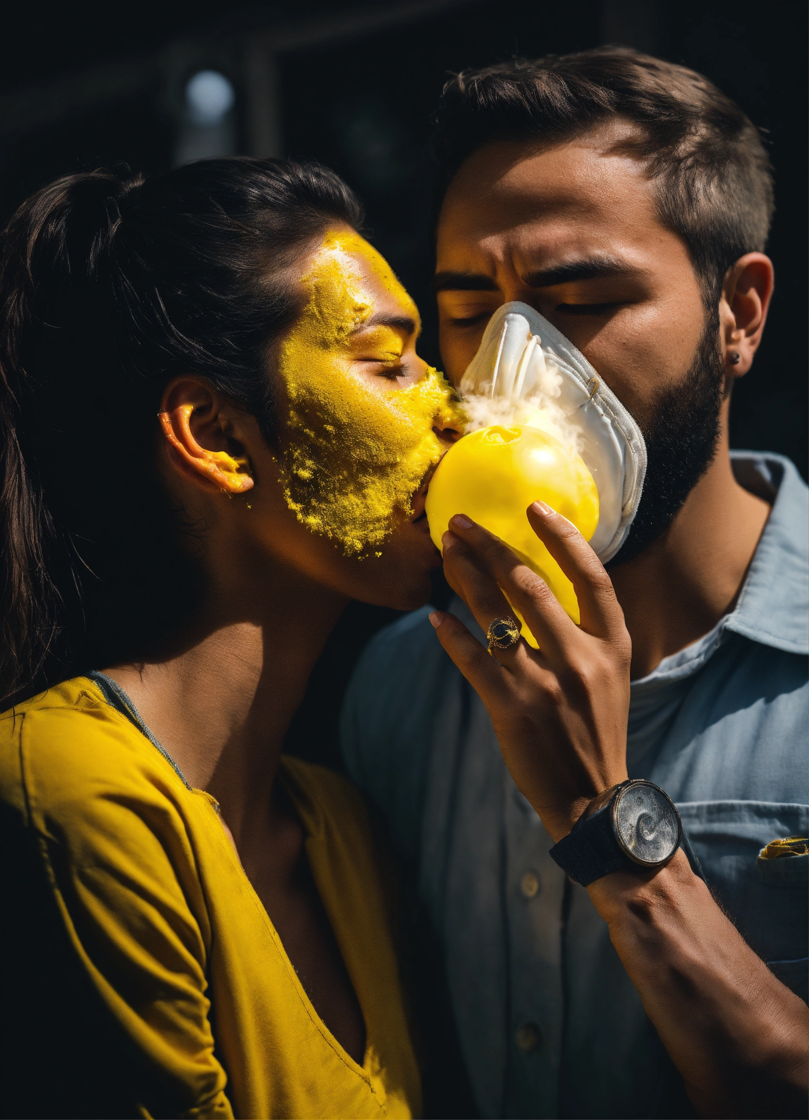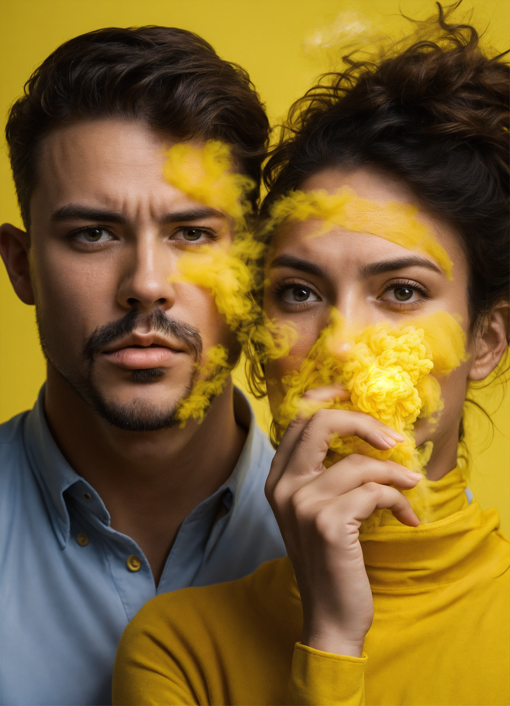 A realistic photo of a man exhaling yellow foul vapor from his mouth, and a woman covering her nose with her hands against the foul odor and looking questioningly.