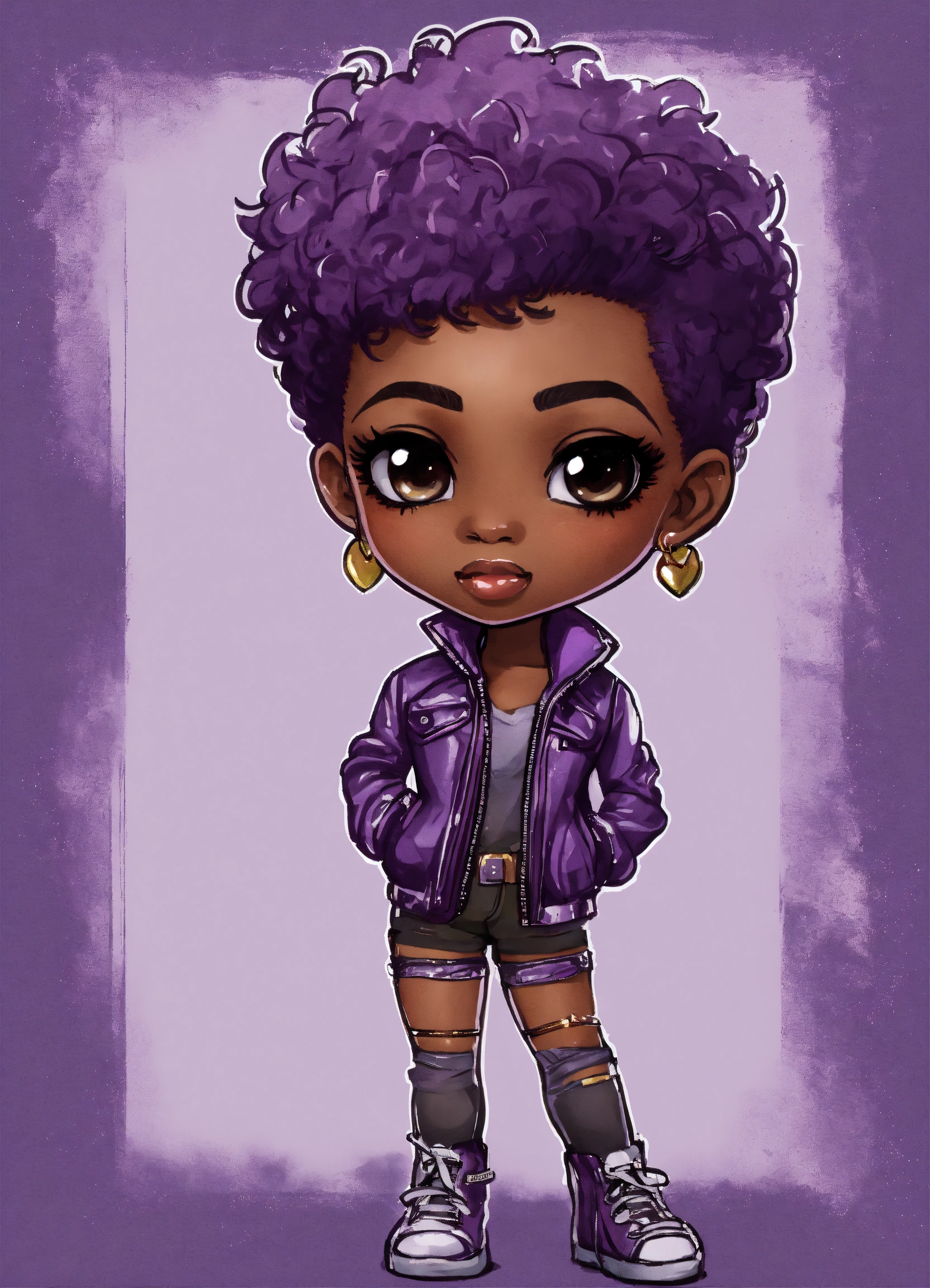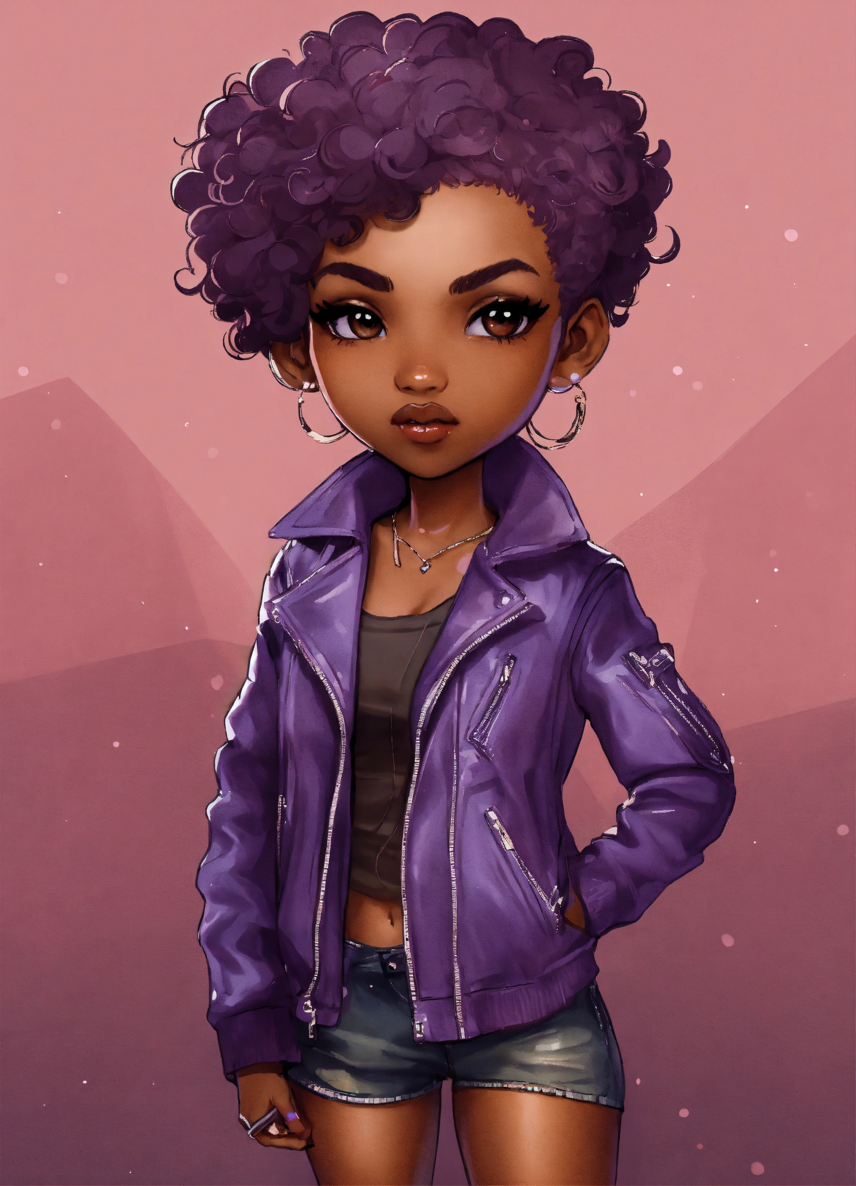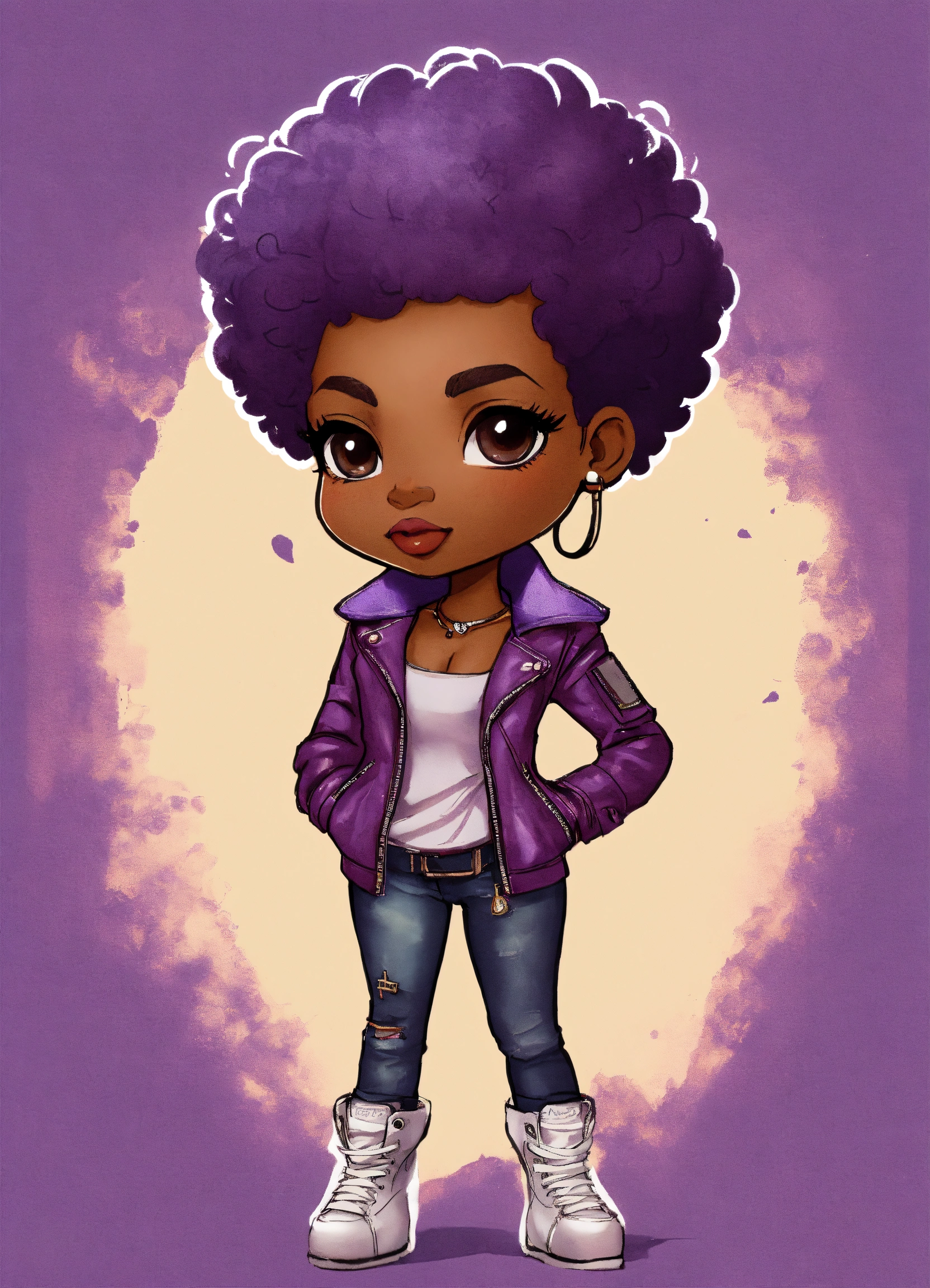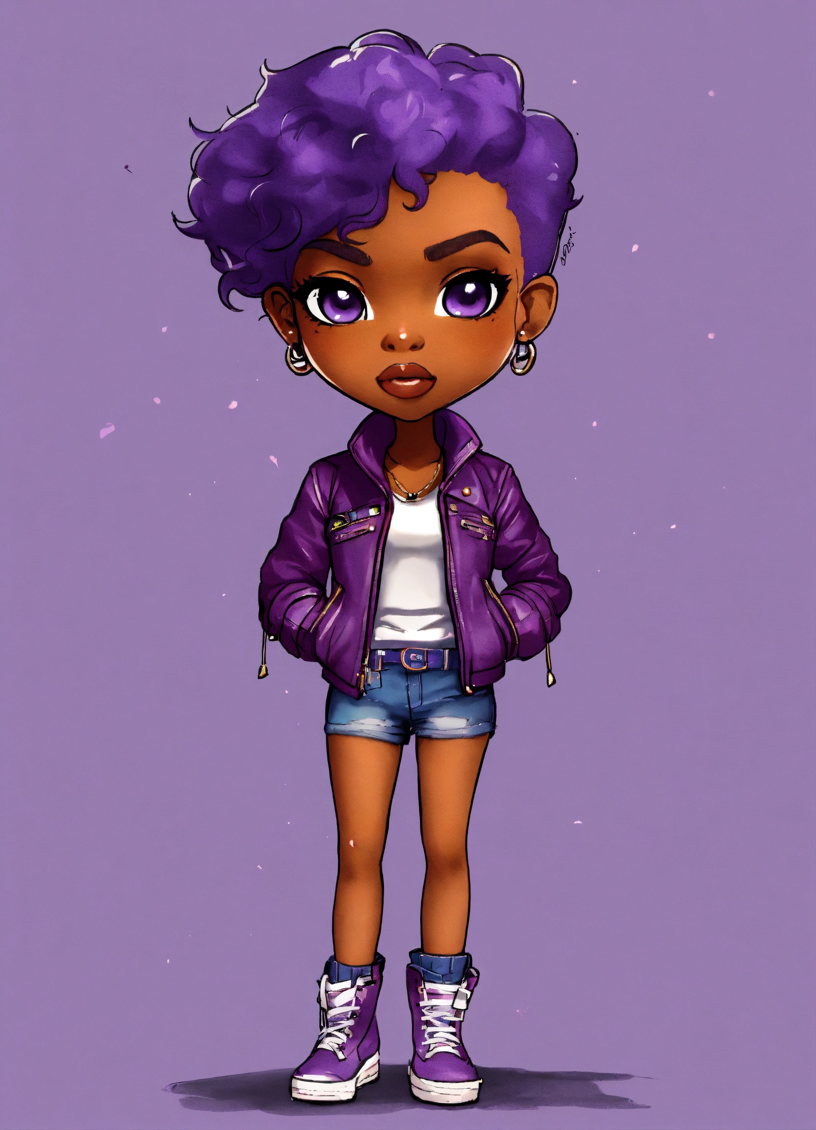 Digital illustration of a grunge chibi african american woman with a pixie cut, wearing a purple leather jacket. full body.