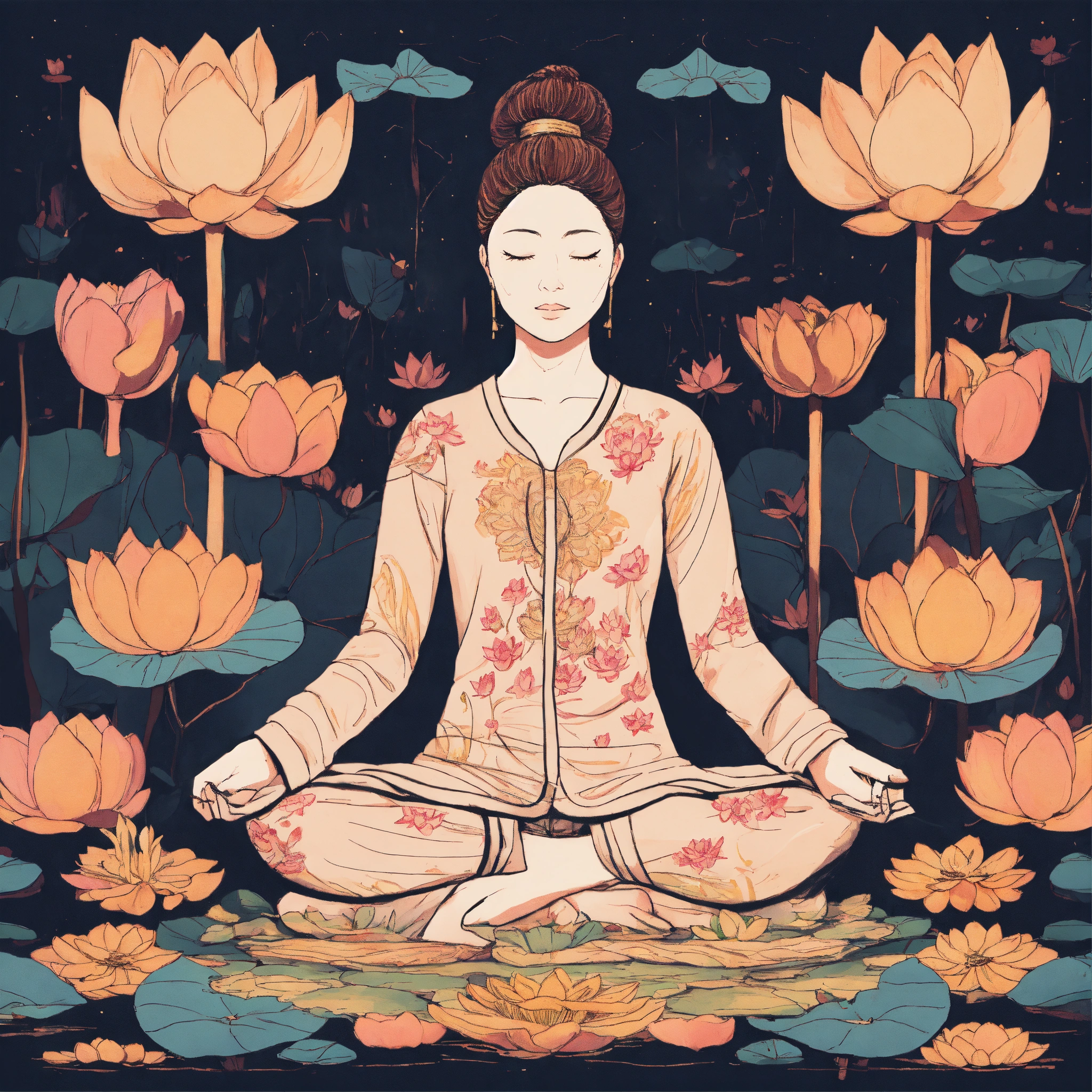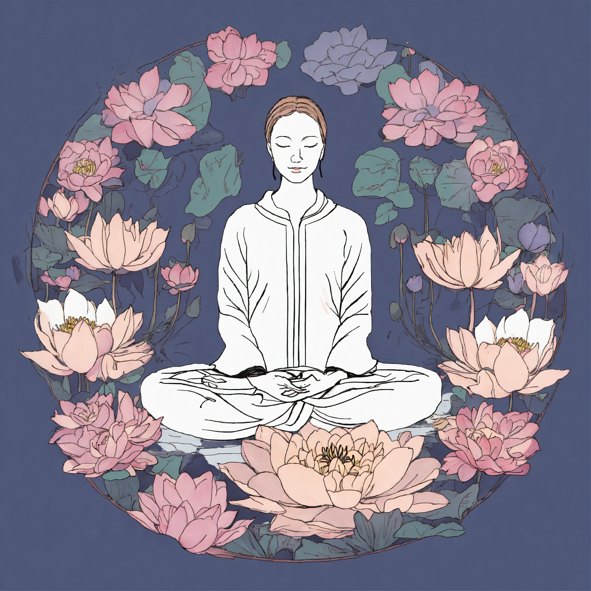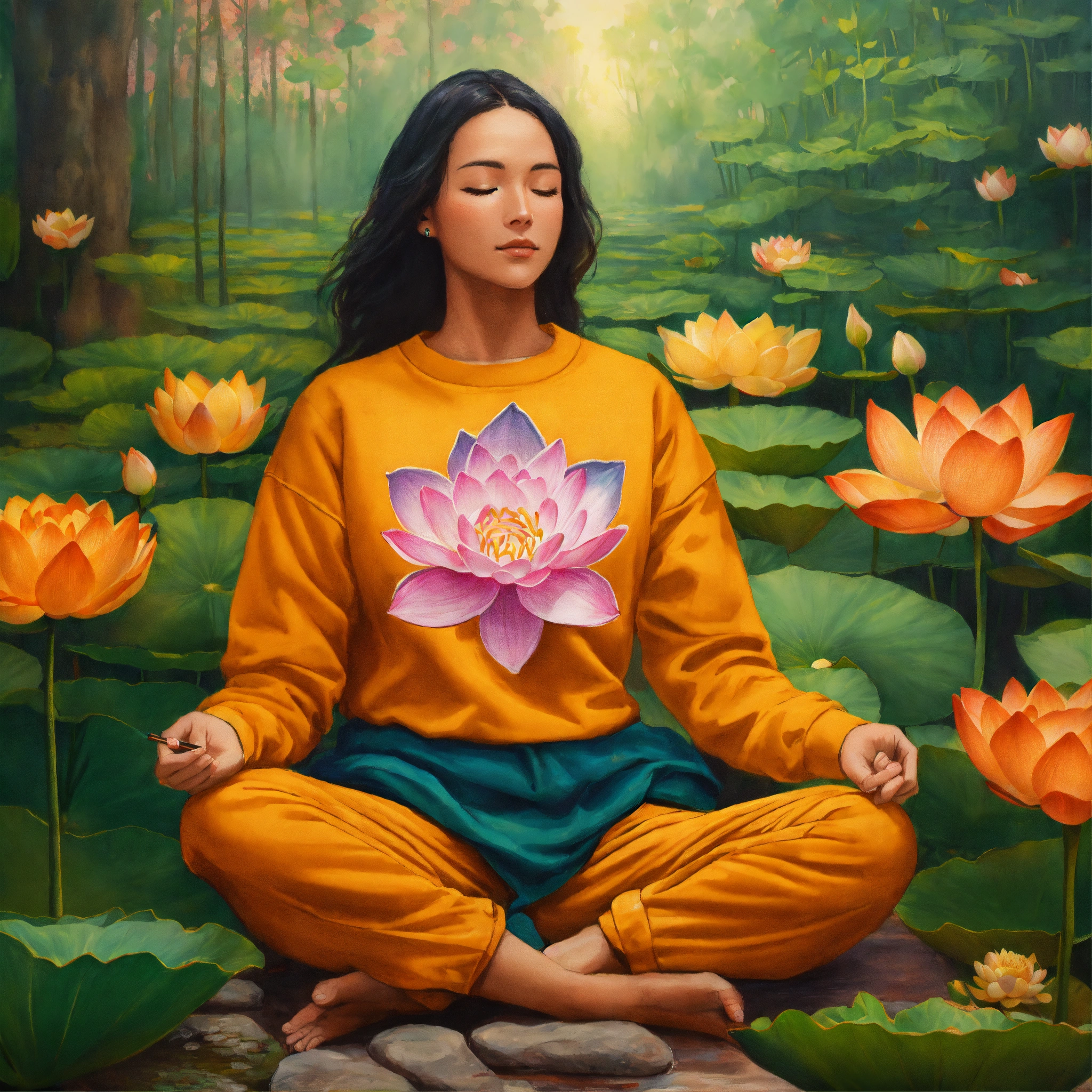 Drawing on a sweatshirt. paint an image of a massage therapist in a meditative pose surrounded by blooming lotus flowers, expressing the idea of harmony and inner peace.