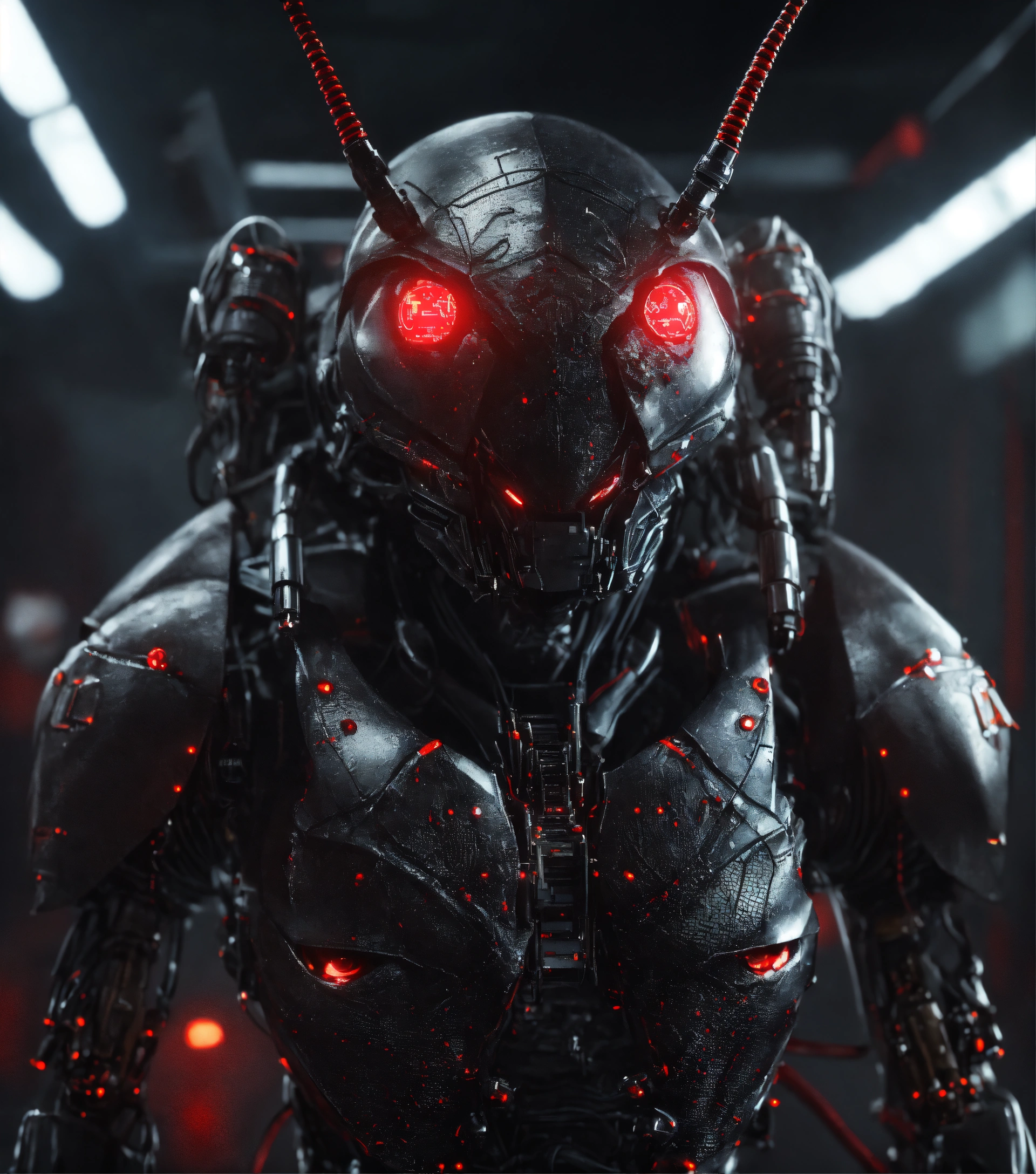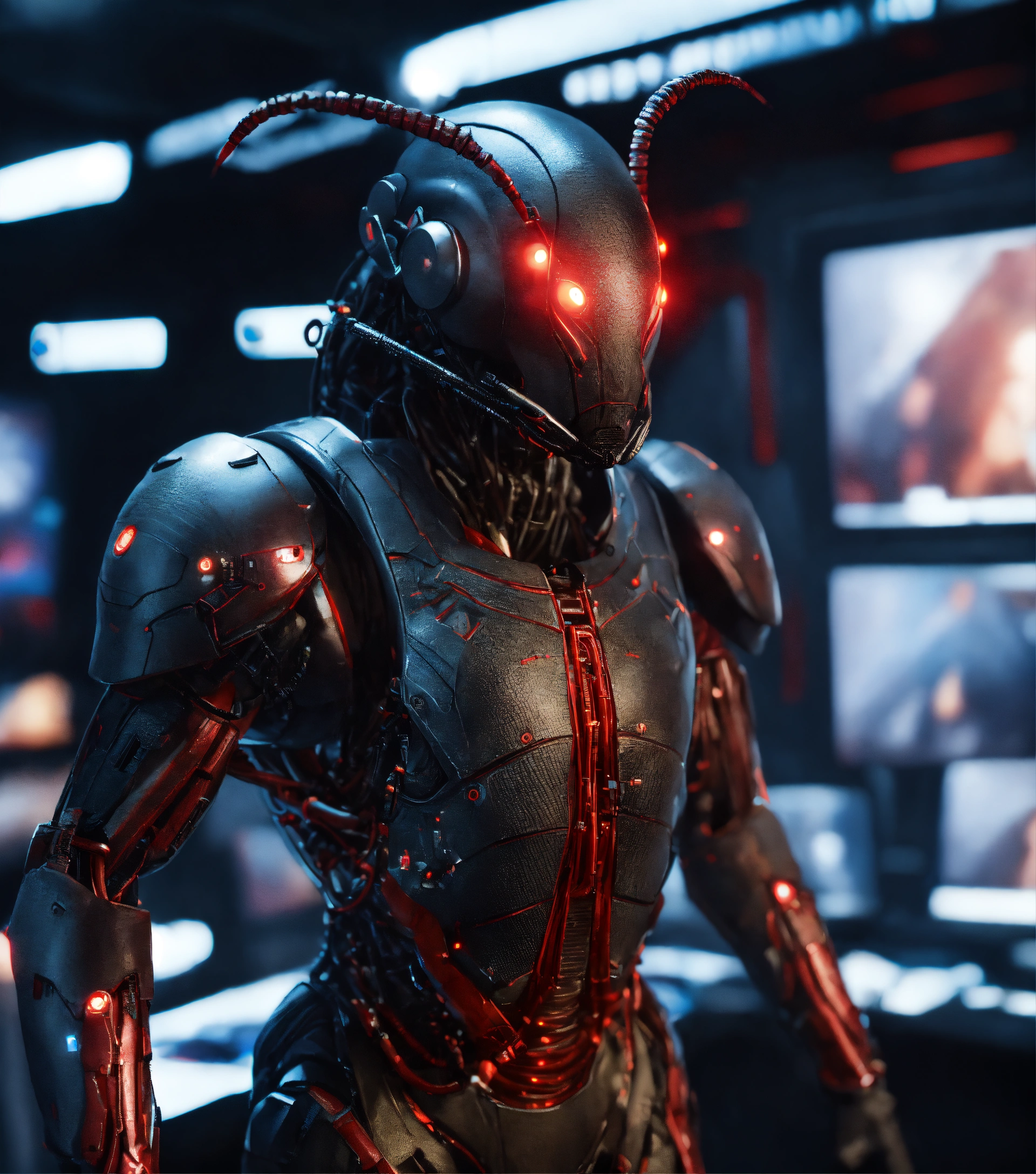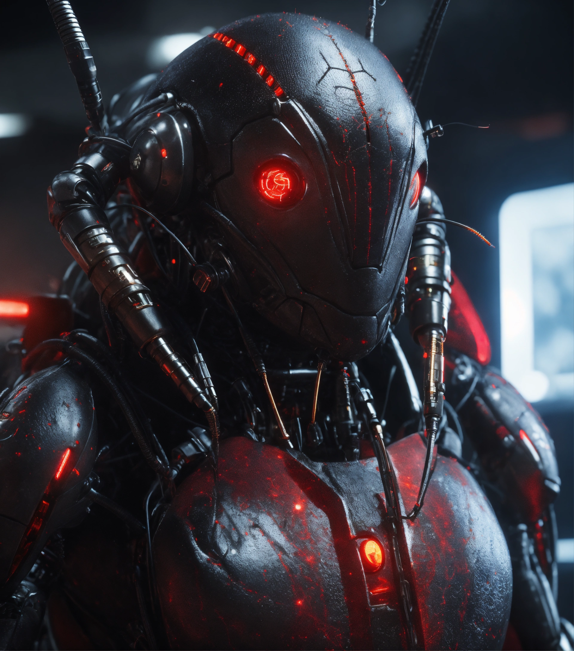 Black cockroach faced humanoids with red eyes and detailed circuitry markings, shooting metal cables from his wrists like spider many in a hi tech alien control room, realistic, 8k, unreal engine, pixar