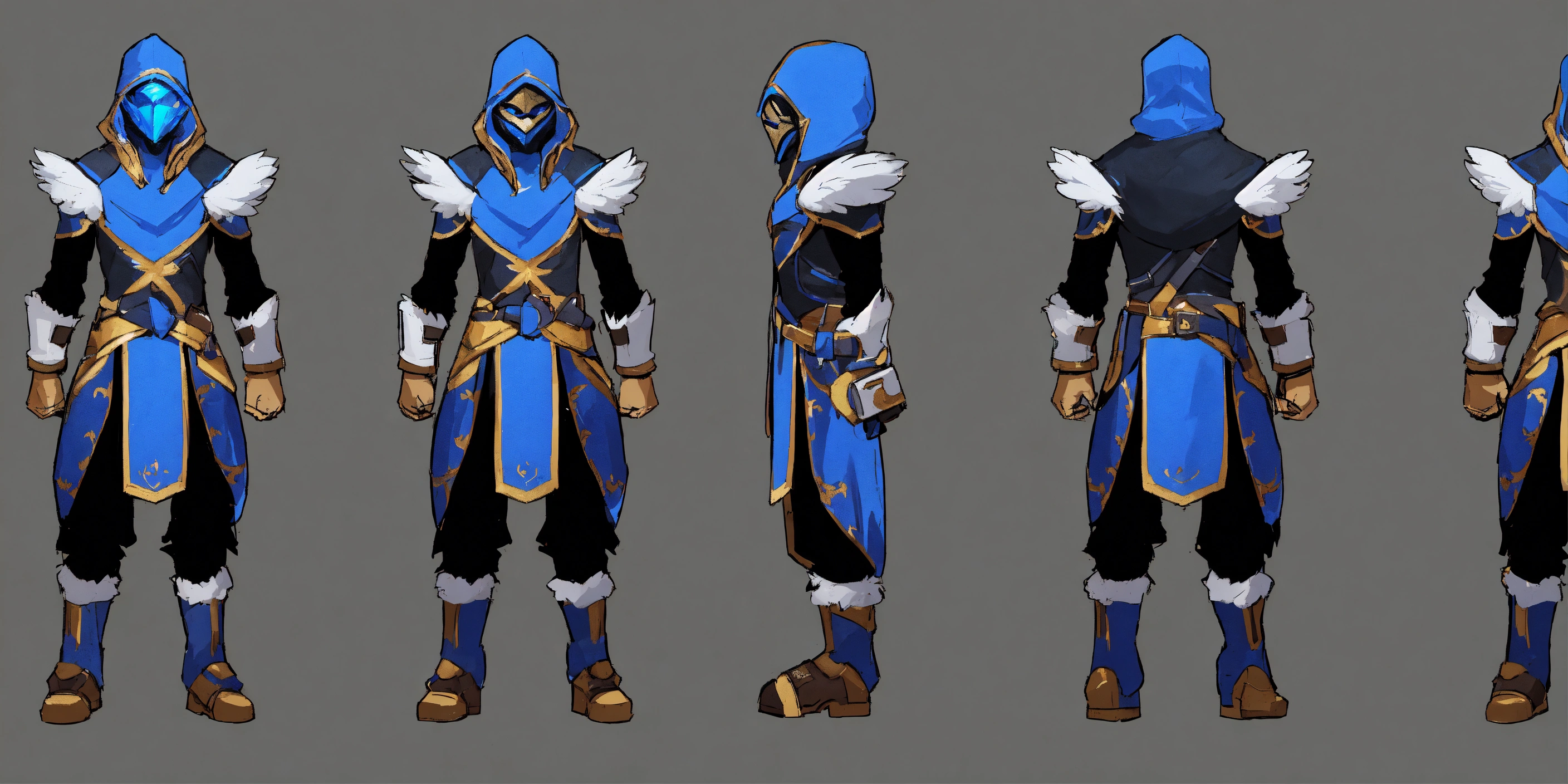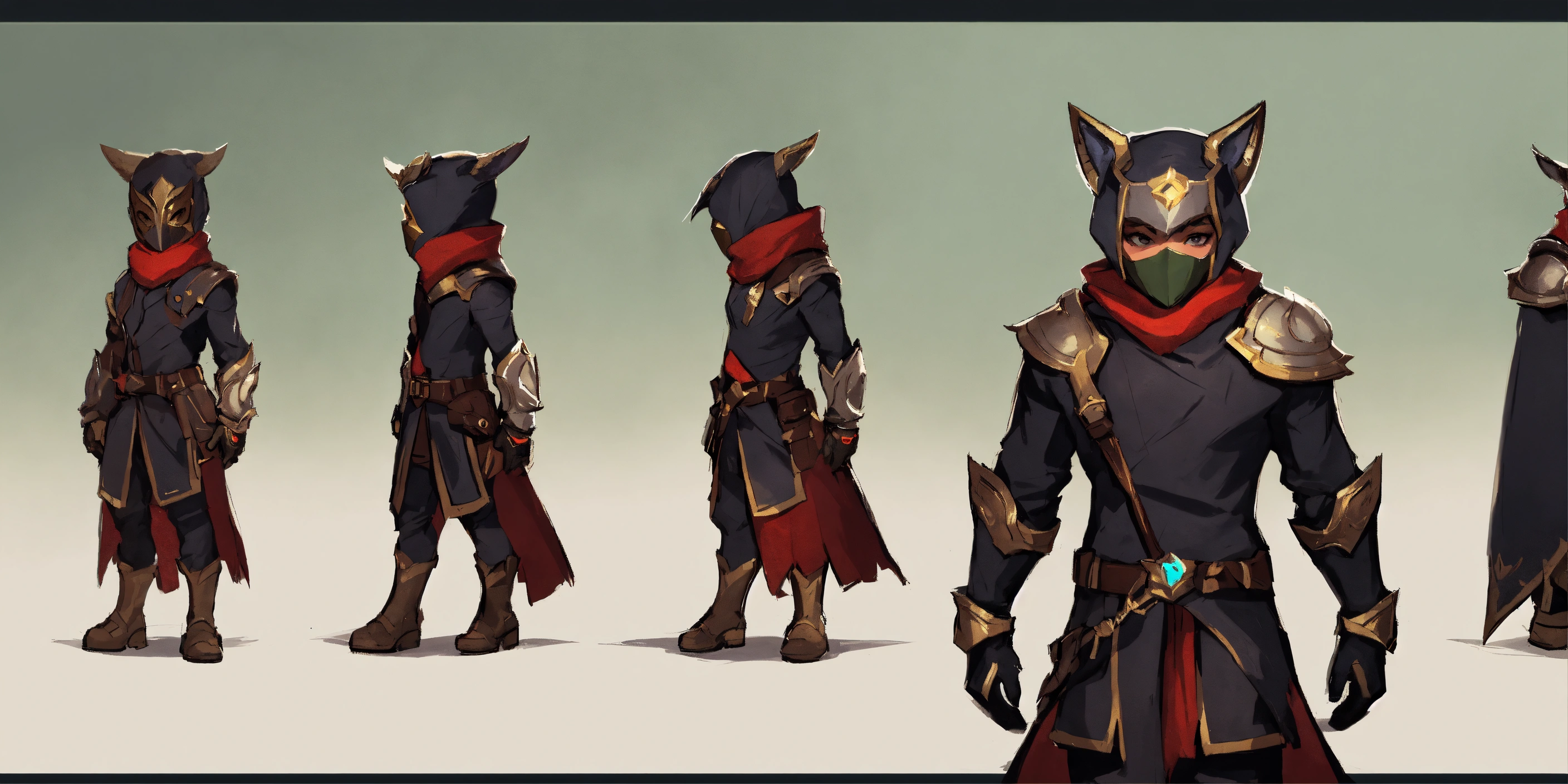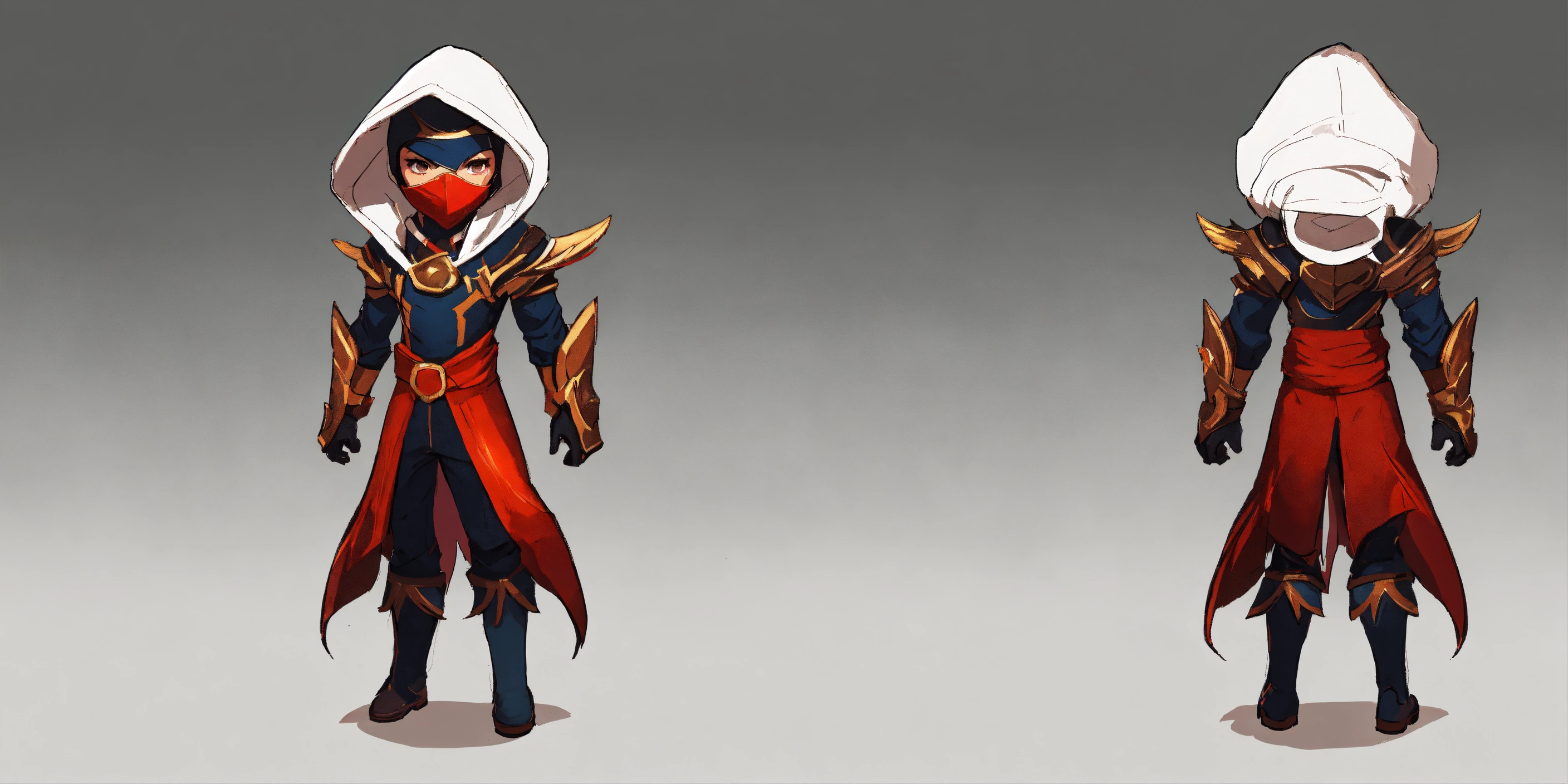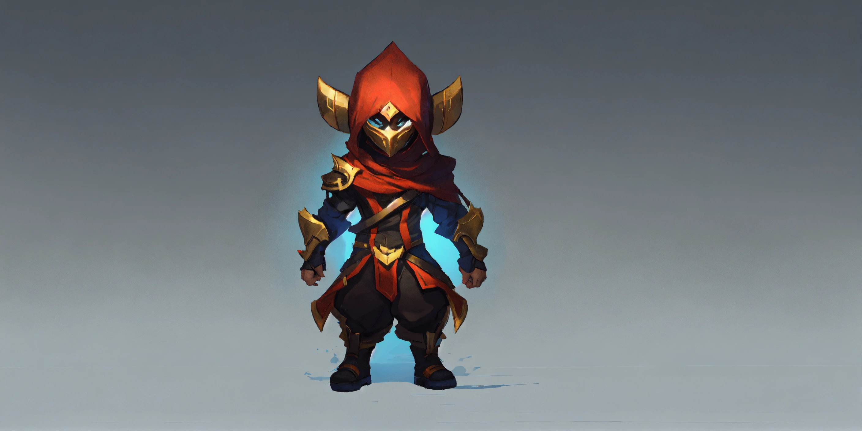 Game art, concept art, masked, boy, walking, game art, full body view, side view, chibi proportions, blank background, artstyle from league of legends
