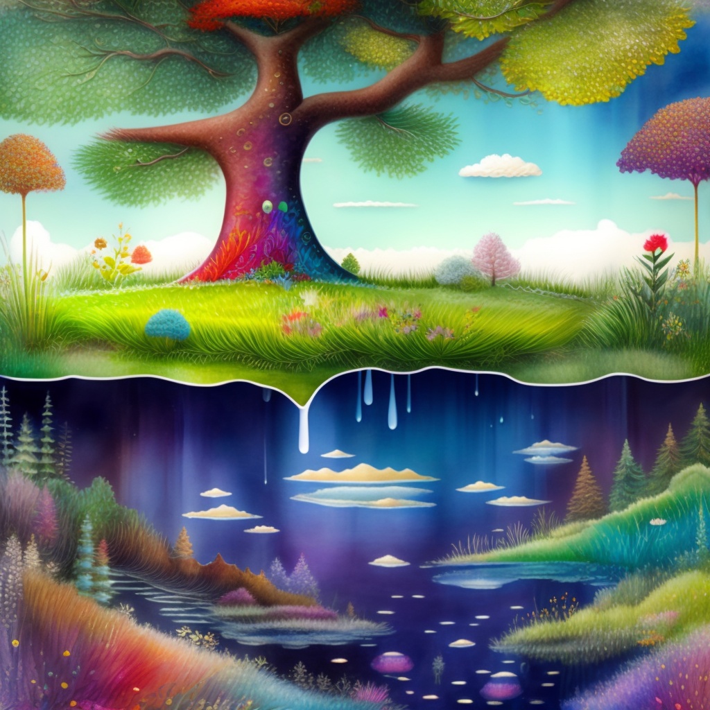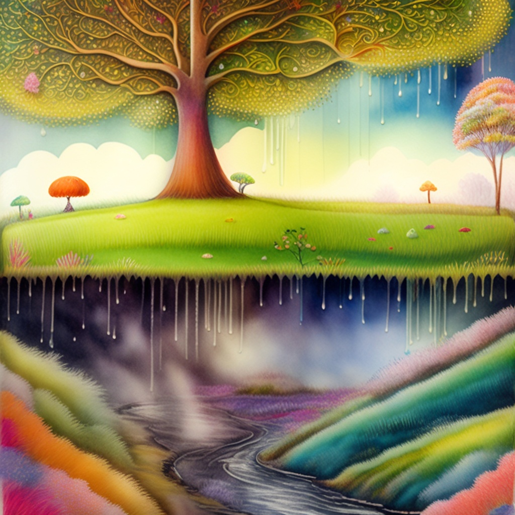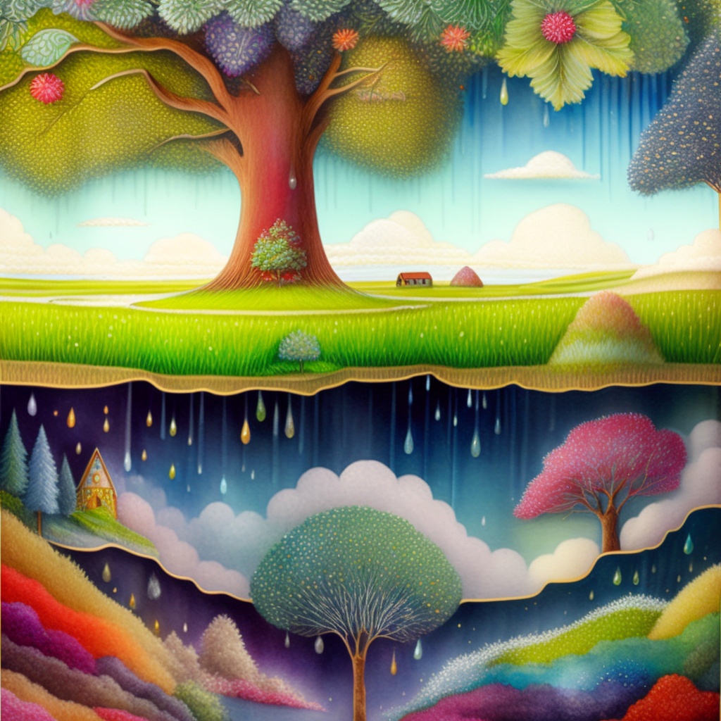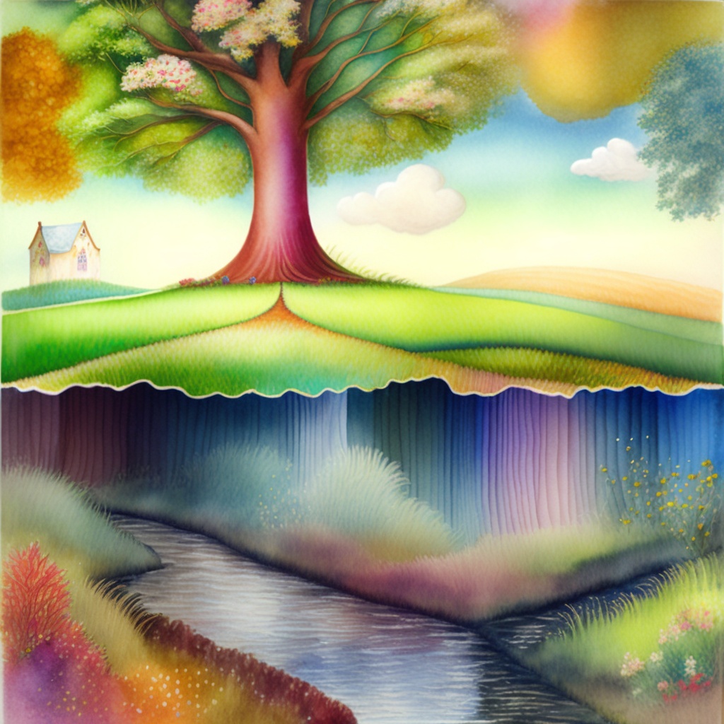 Sketch illustration, two worlds top half of nature trees and meadows, the bottom half of the page under the ground home, watercolour blurred rain puddle quirky cute patchwork multi coloured, quirky multi coloured, cracked and peeling paint, hyper detailed ultra intricate, maximalist hyper detailed storybook illustration, 3d, in the style of arthur rackham, intricate detail, intricate and hyperdetailed painting
