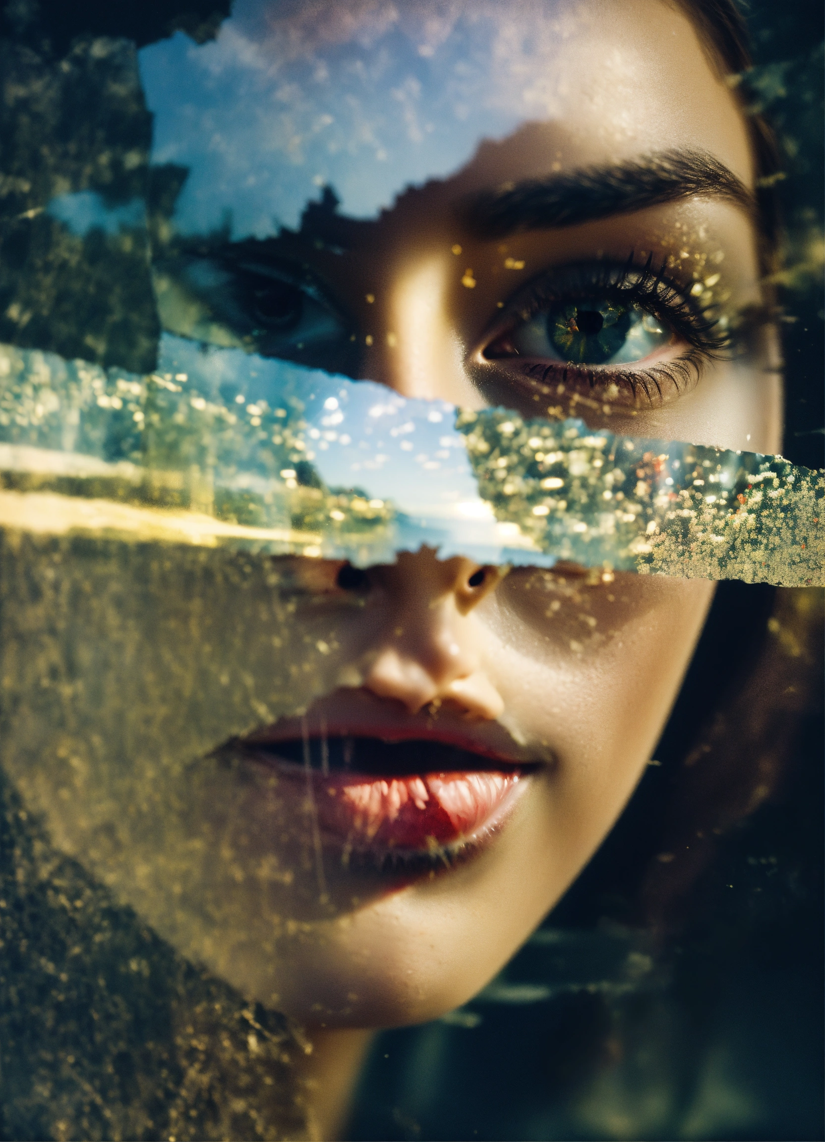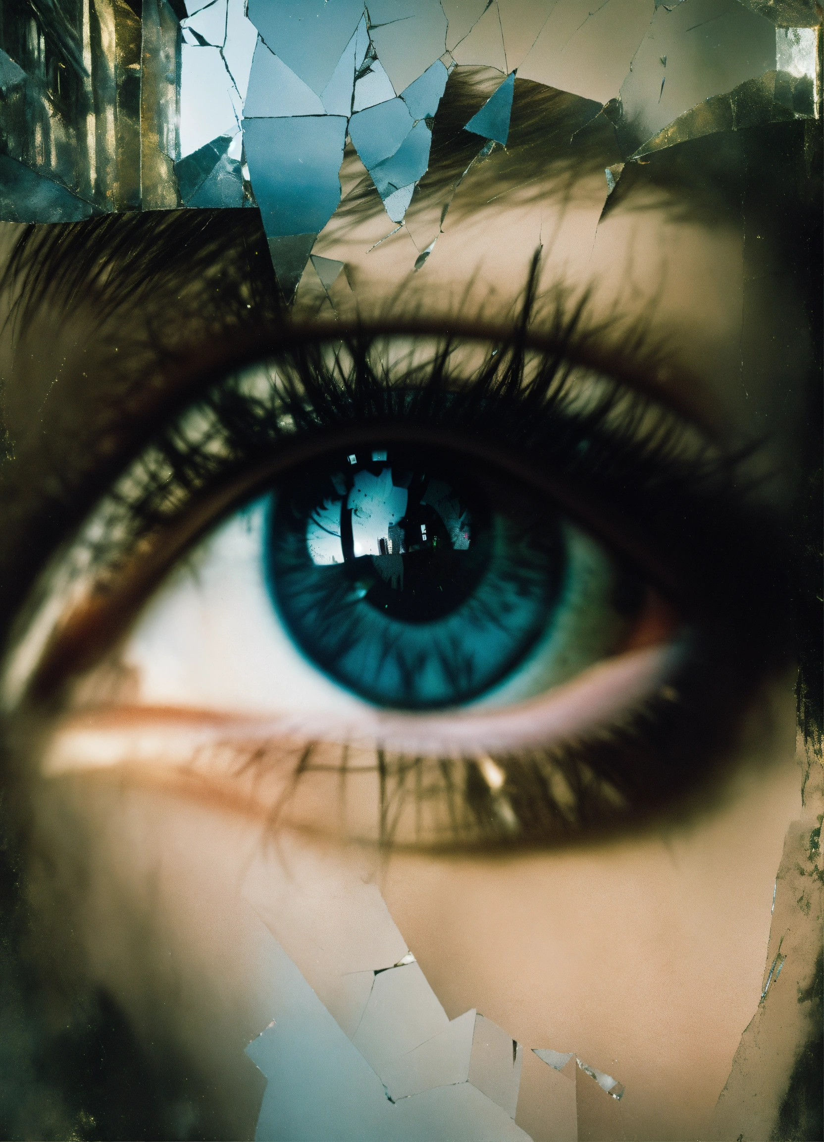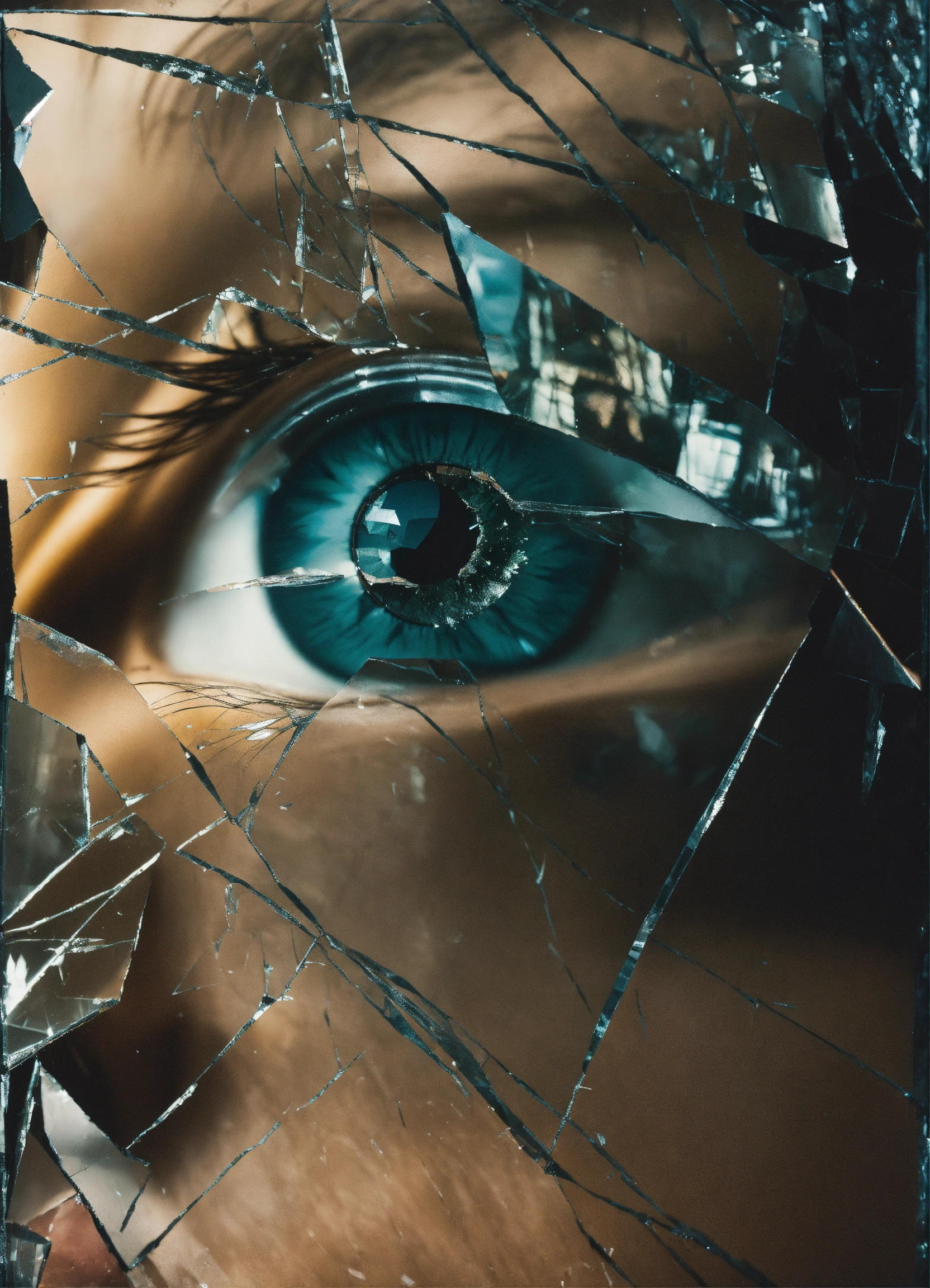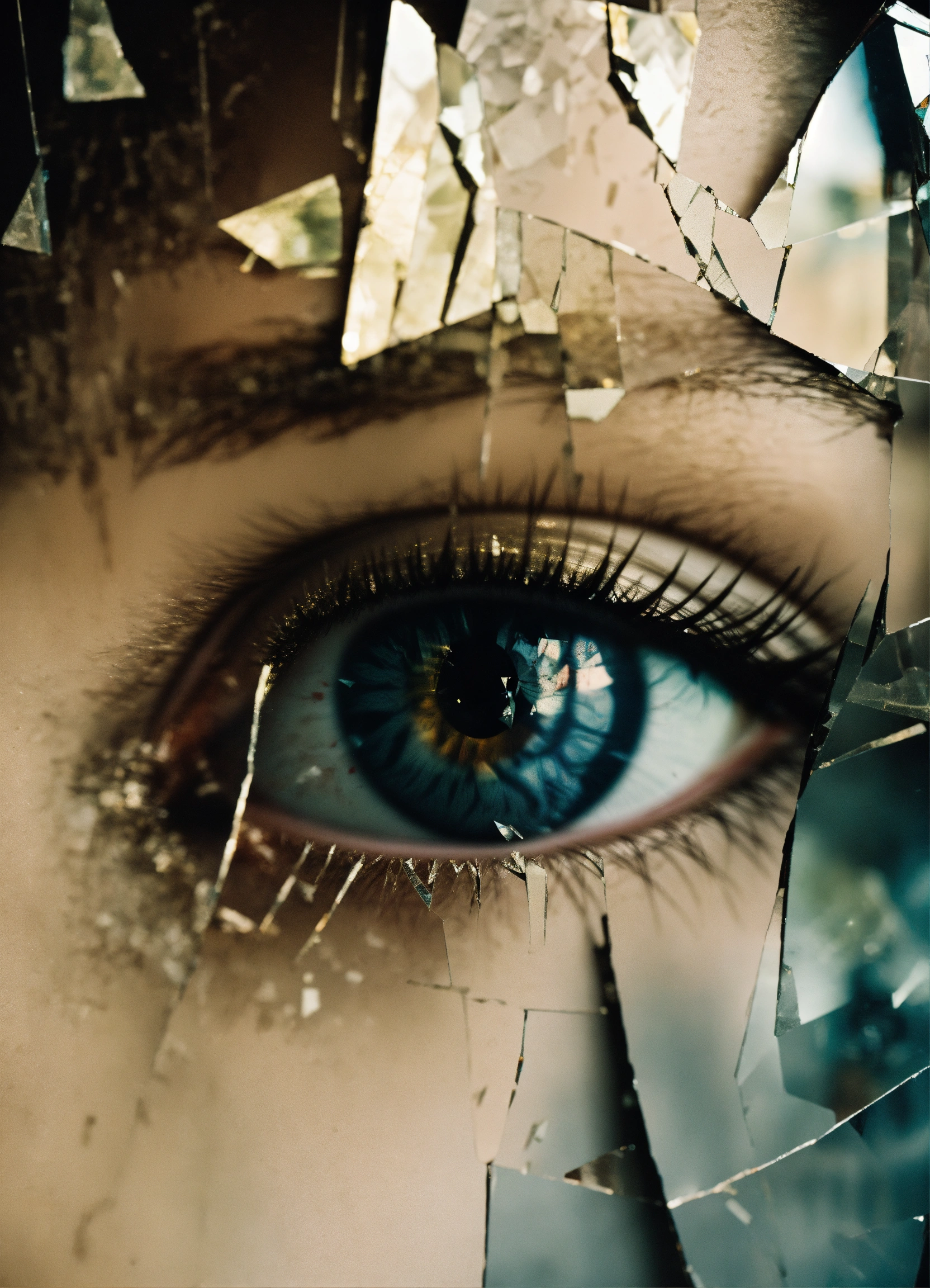 Double exposure photo, featuring eye, shattered mirror effect, broken mirror, sharp mirror edges, ephemeral shadows, motion - infused mystique, in the style of haunting allure, robert frank.