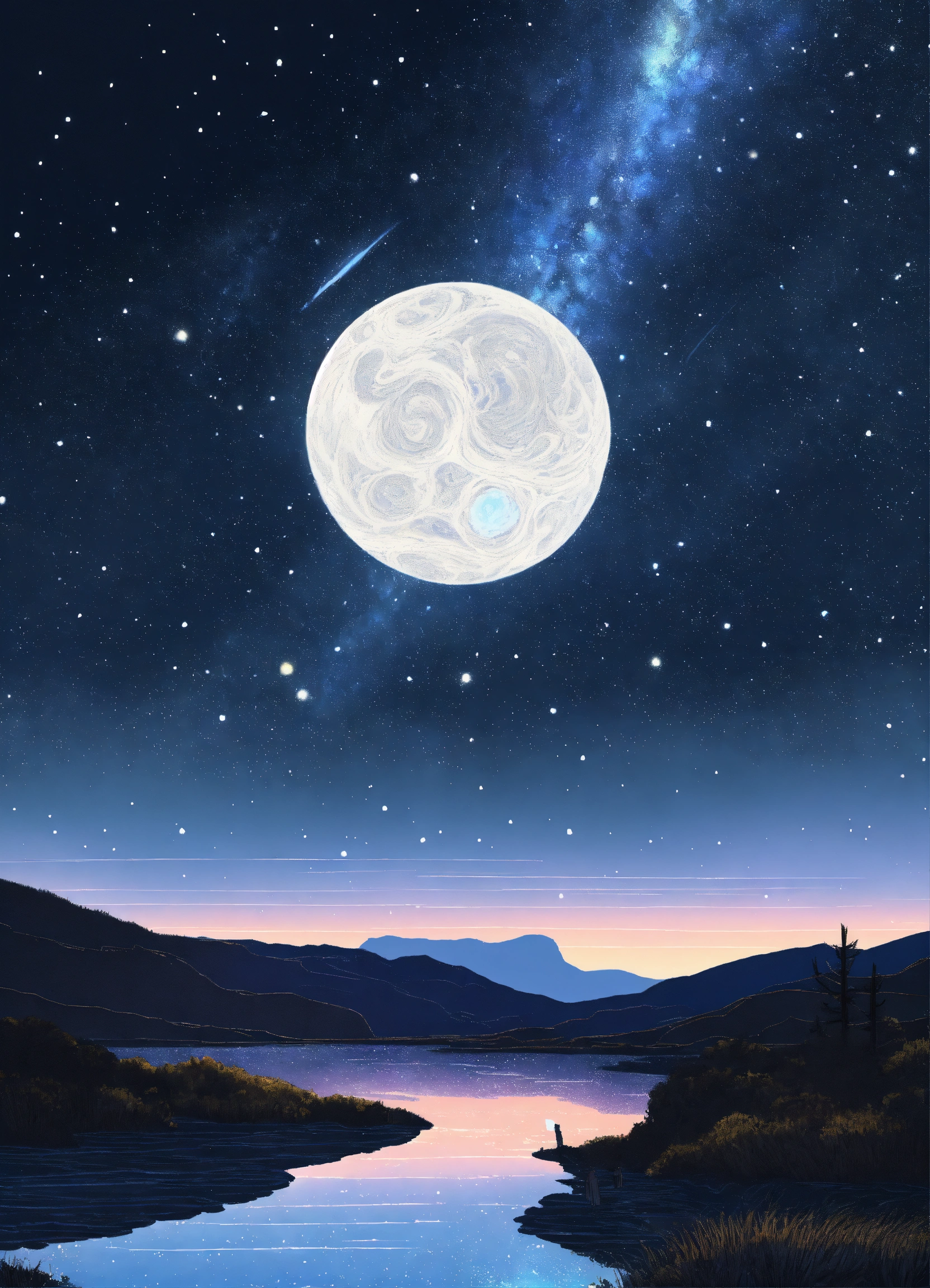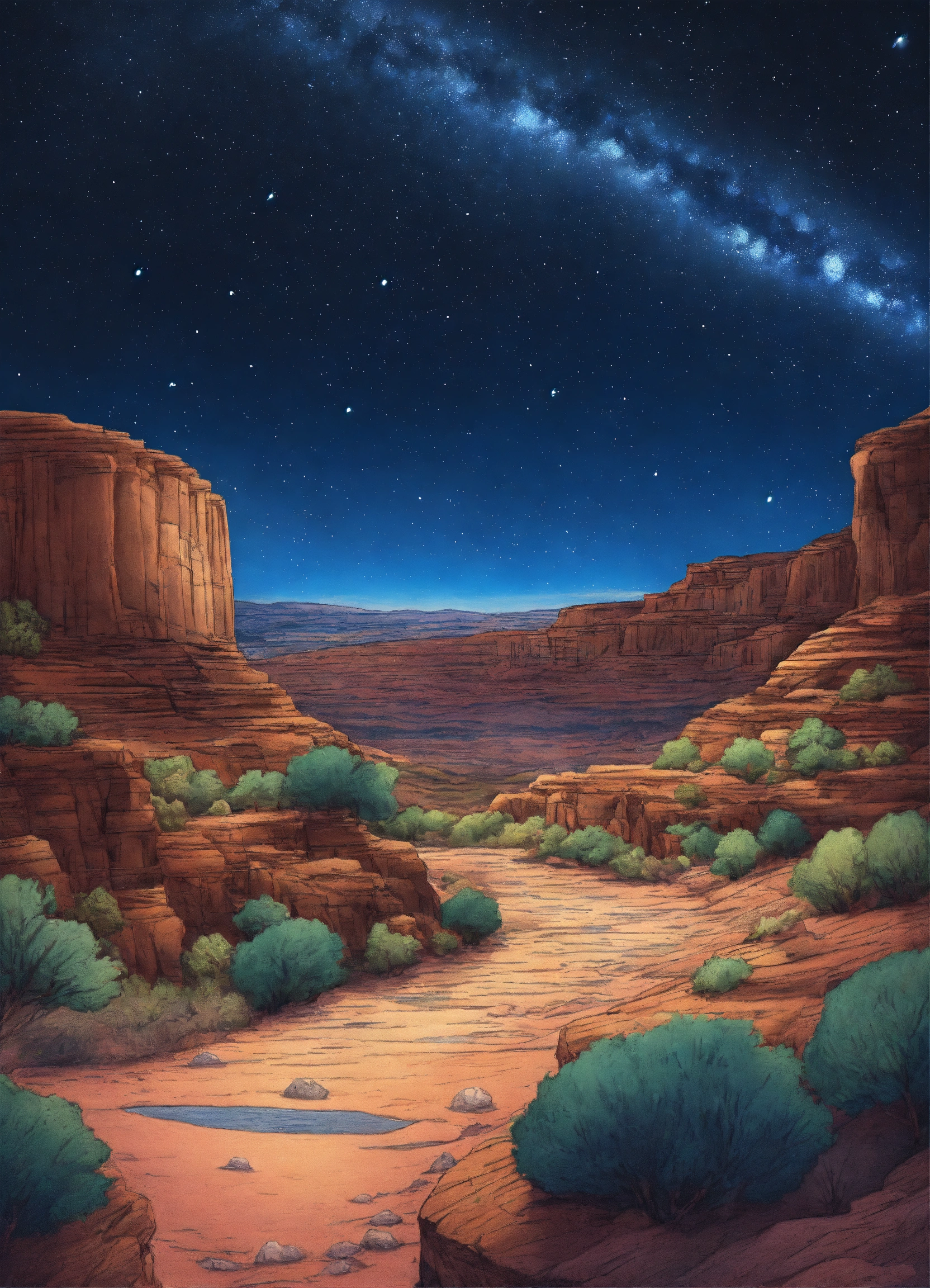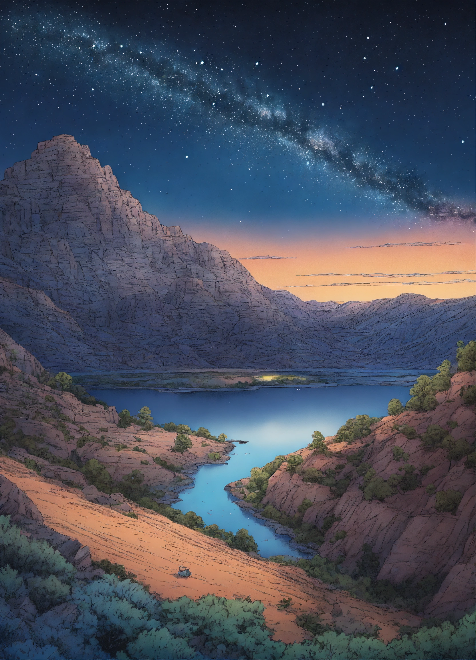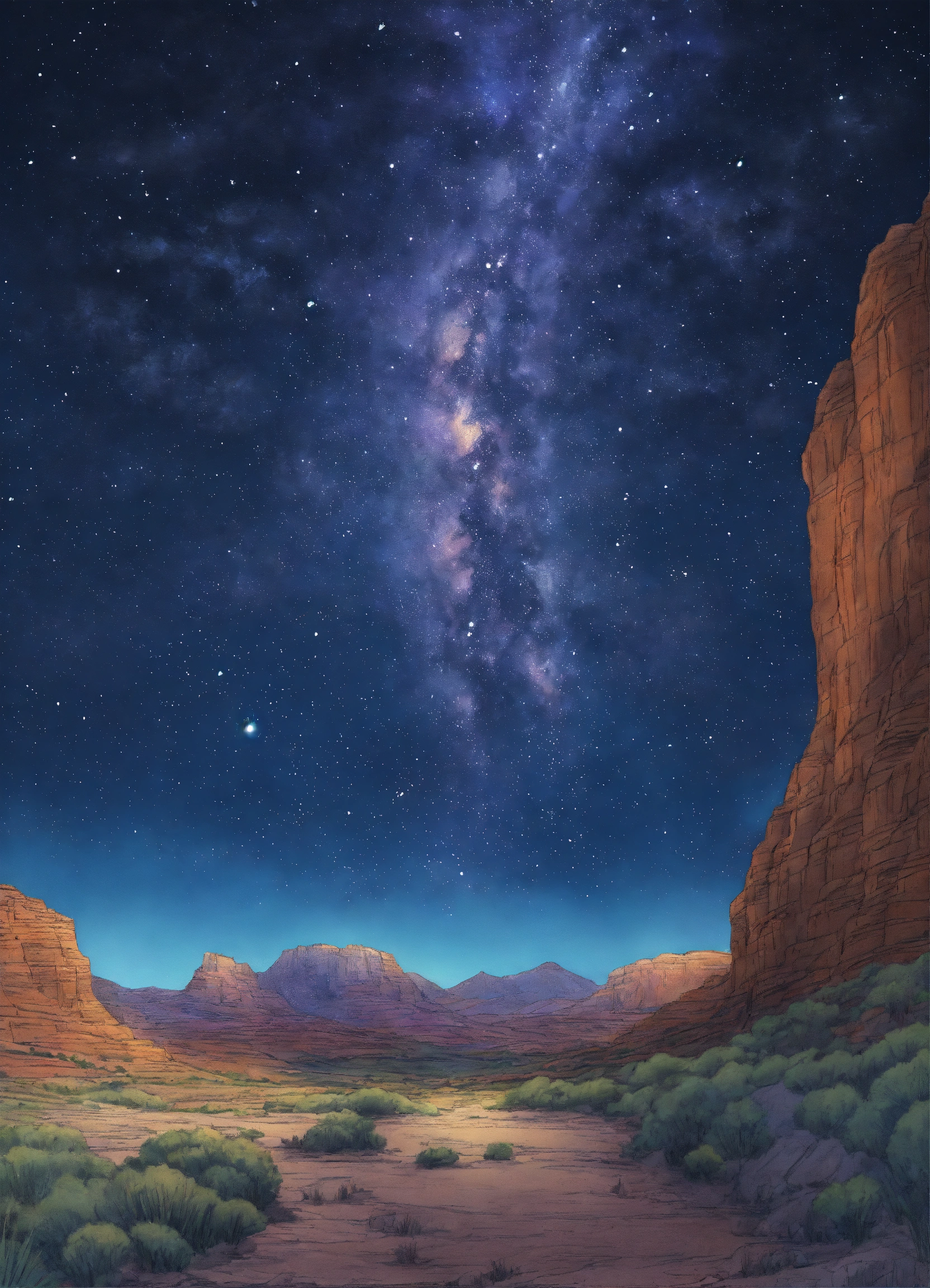 Drawing a clear view of the milky way in the national monument park by night in summer. two colours white and dark blue, hd, crystal clear. line drawing, clean clear lines, coloring book style, bright colors, intricate details, elegant, discreete, serene, magical, peaceful, fine detail, pastel pencils, winsor mccay style.