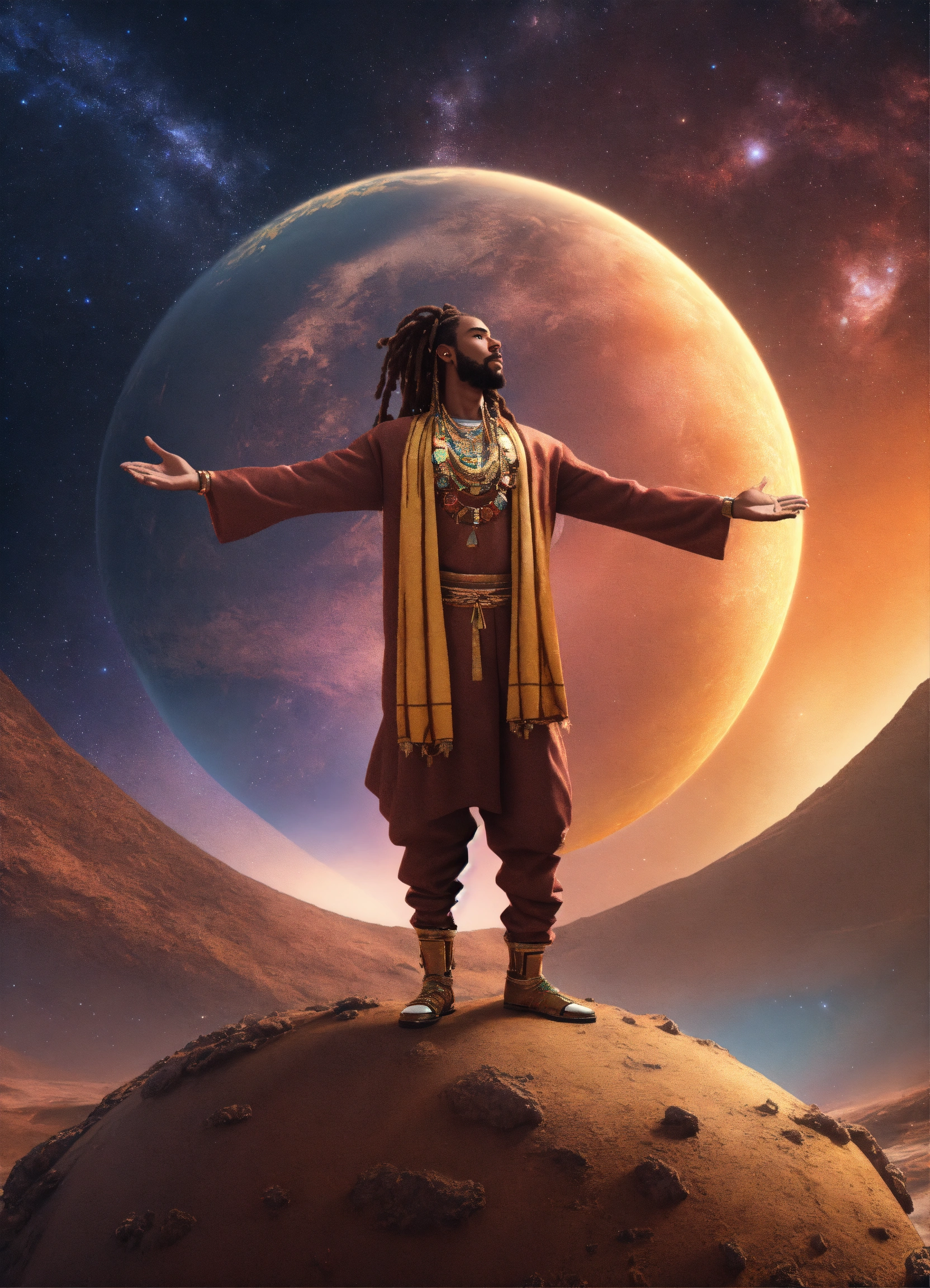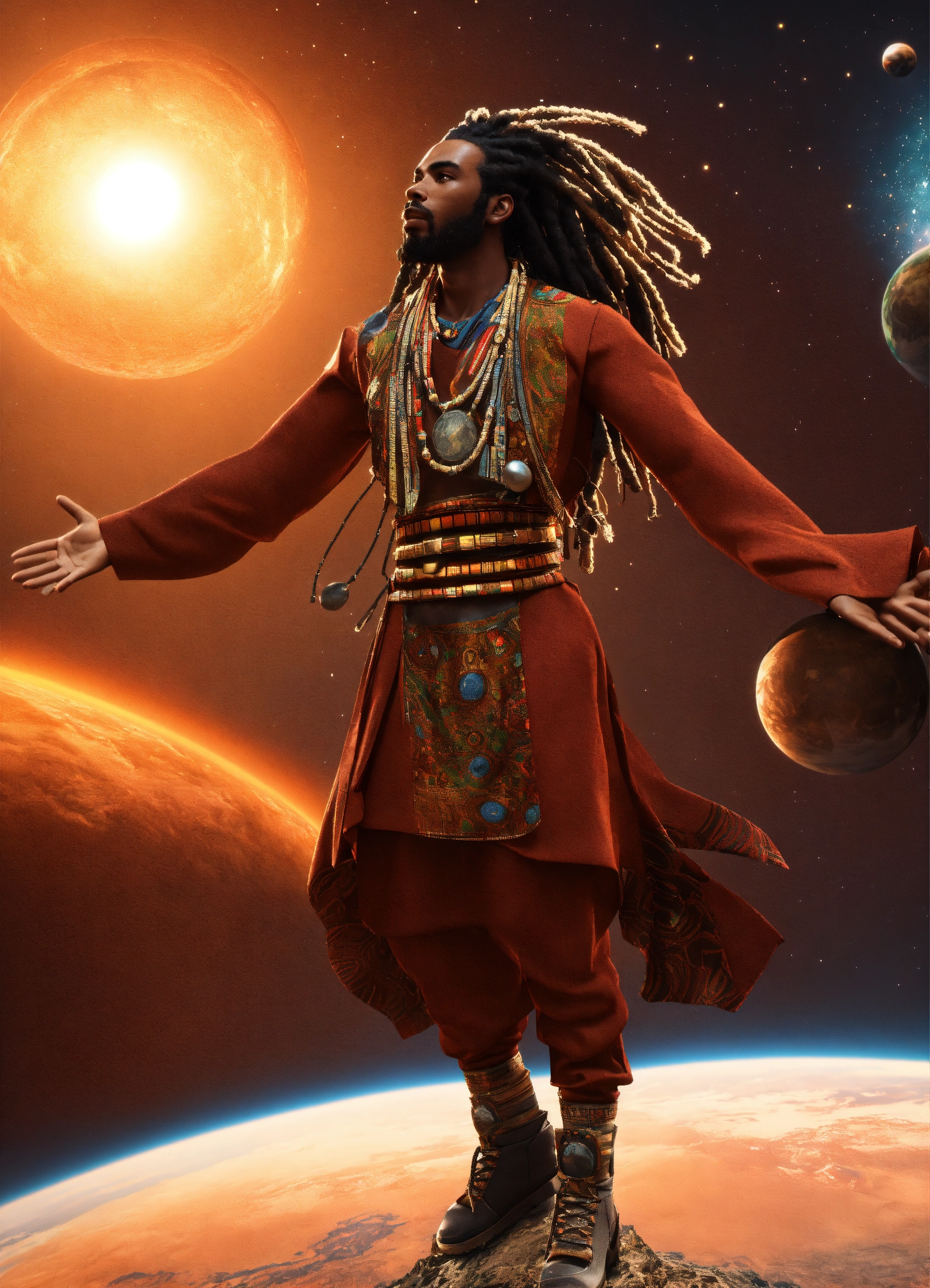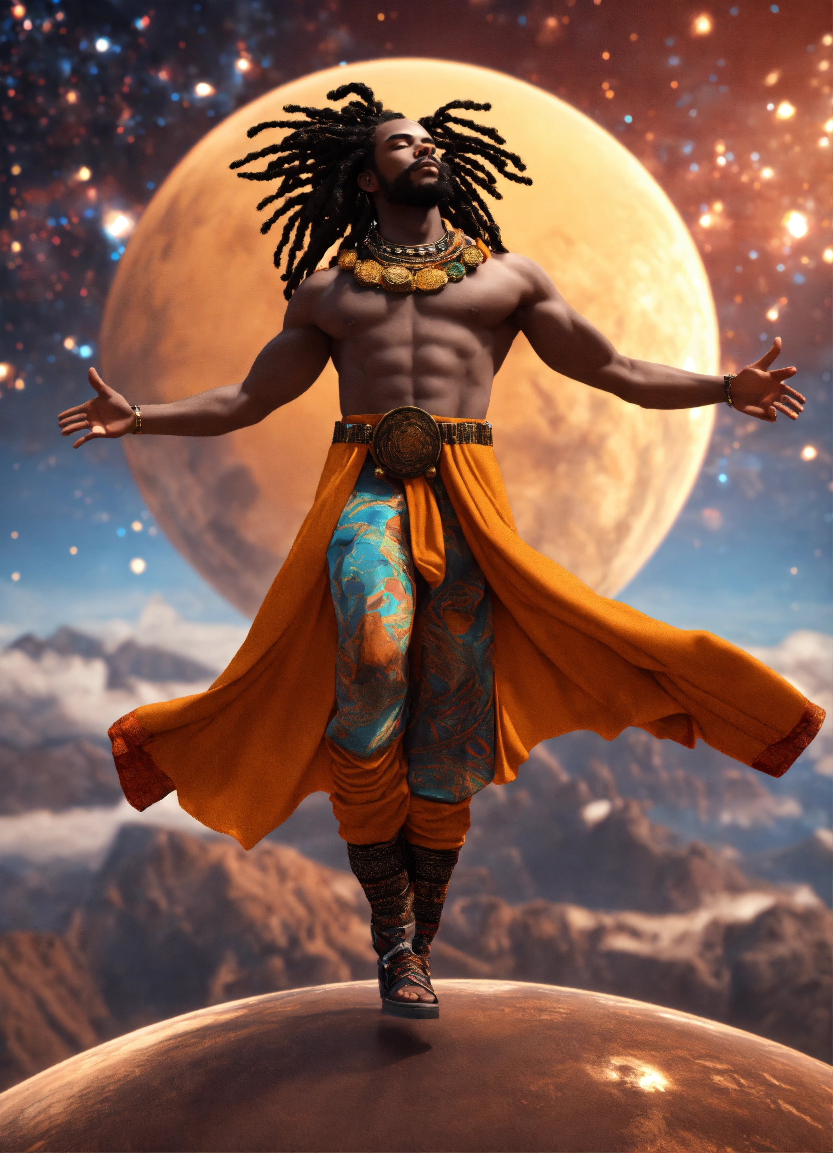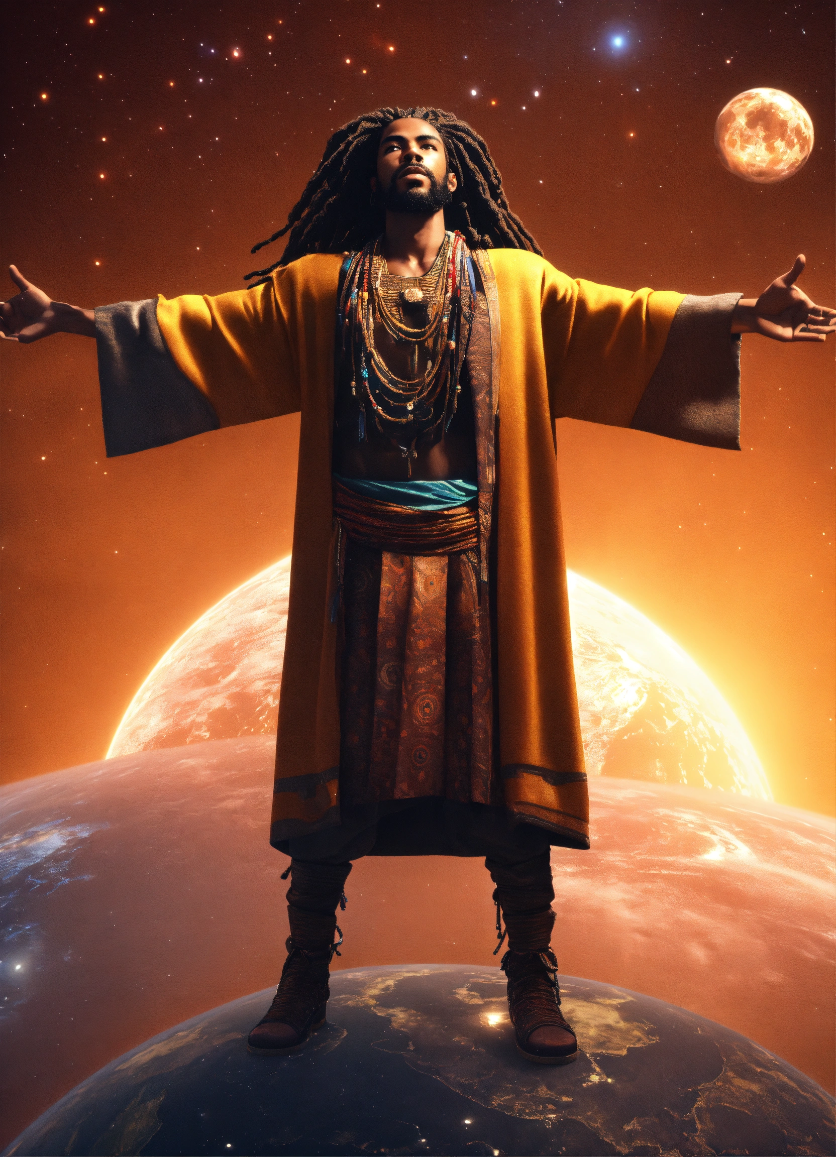 3d render of black man with long flowing dreadlocks, 6'5" tall, well-built, standing on top of planet earth with the cosmos in the background, full body shot, hands upraised, wearing african style clothing