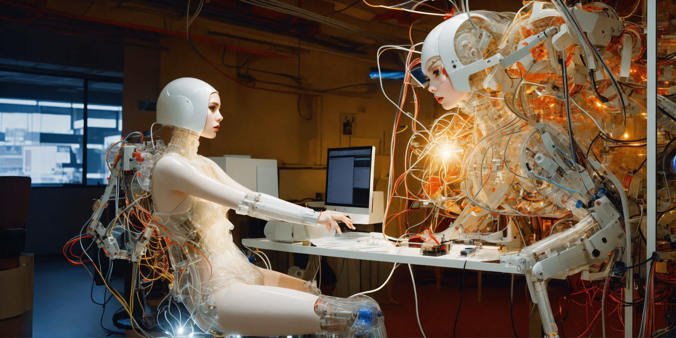 Body portrait photography, in an office full of cables and wires and led, driving a carbon motor head attractive transparent white plexiglass secretary robots typing, 80 degree view, art by sergio lopez, natalie shau, james jean and salvador dali