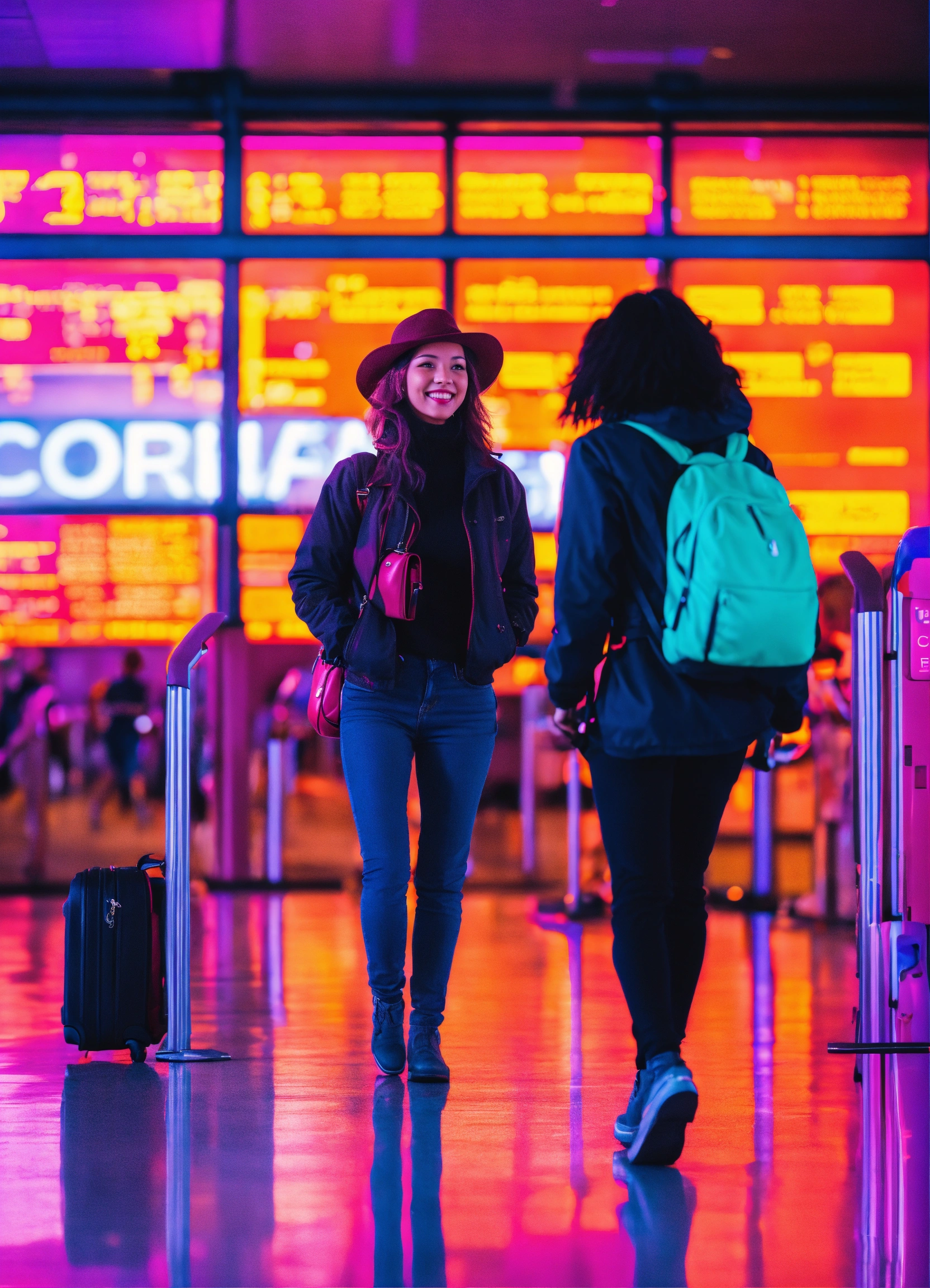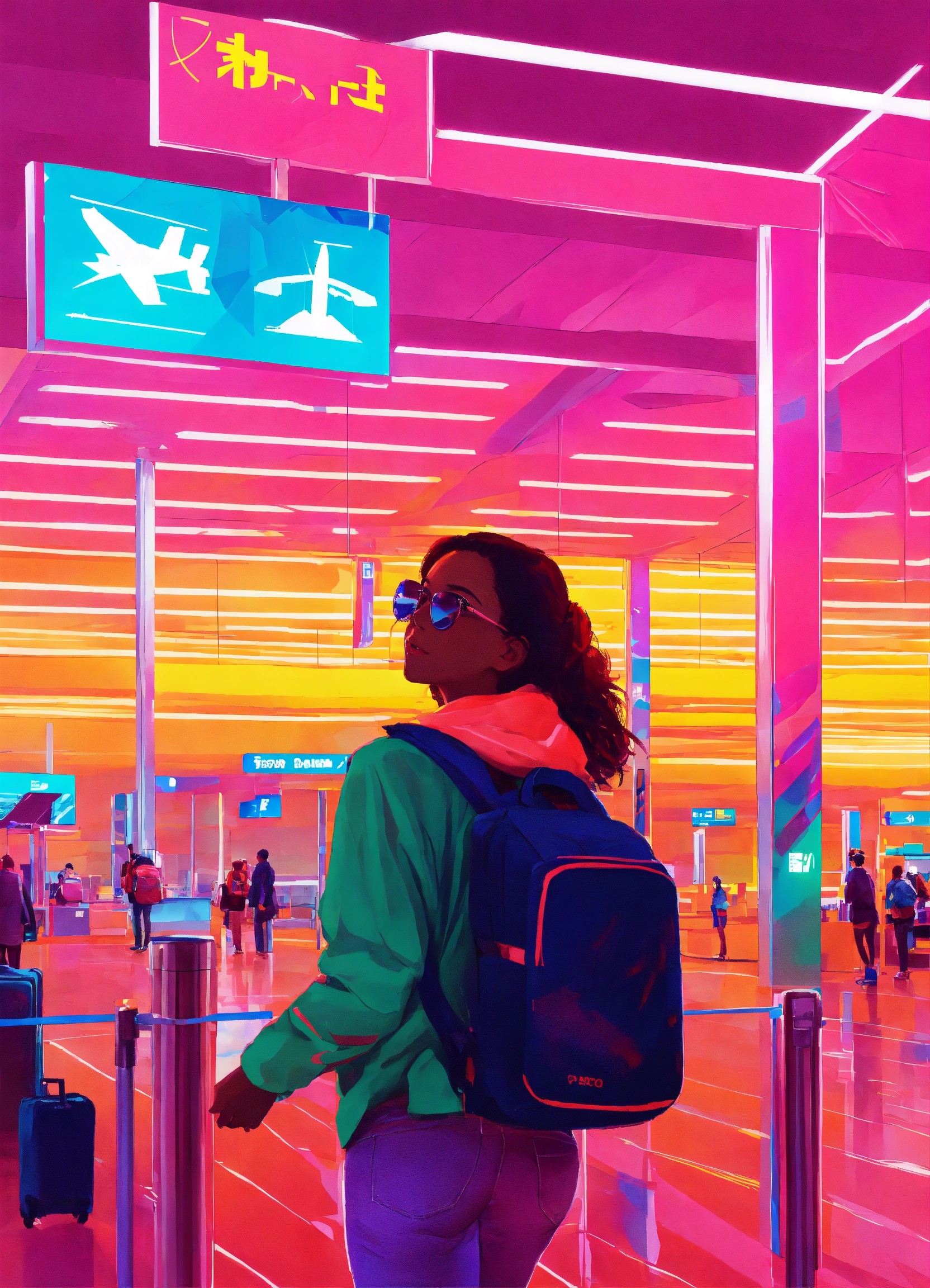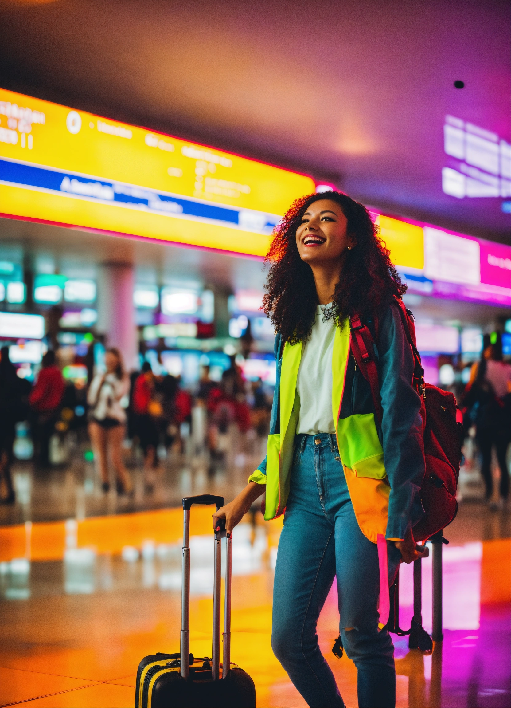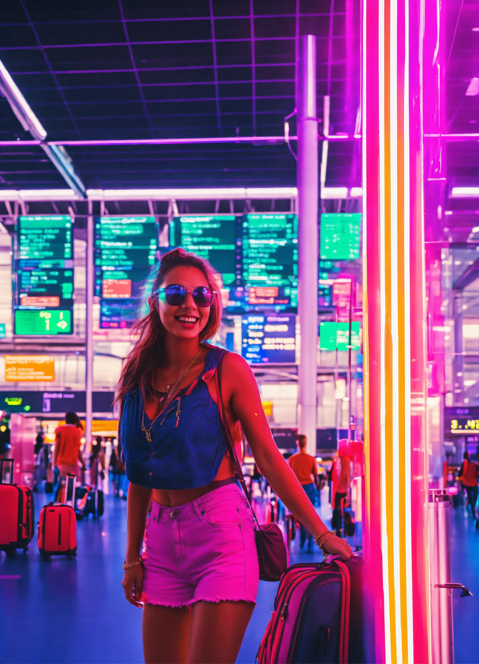 A woman at the airport happy that she is about to travel to another country in a neon environment
