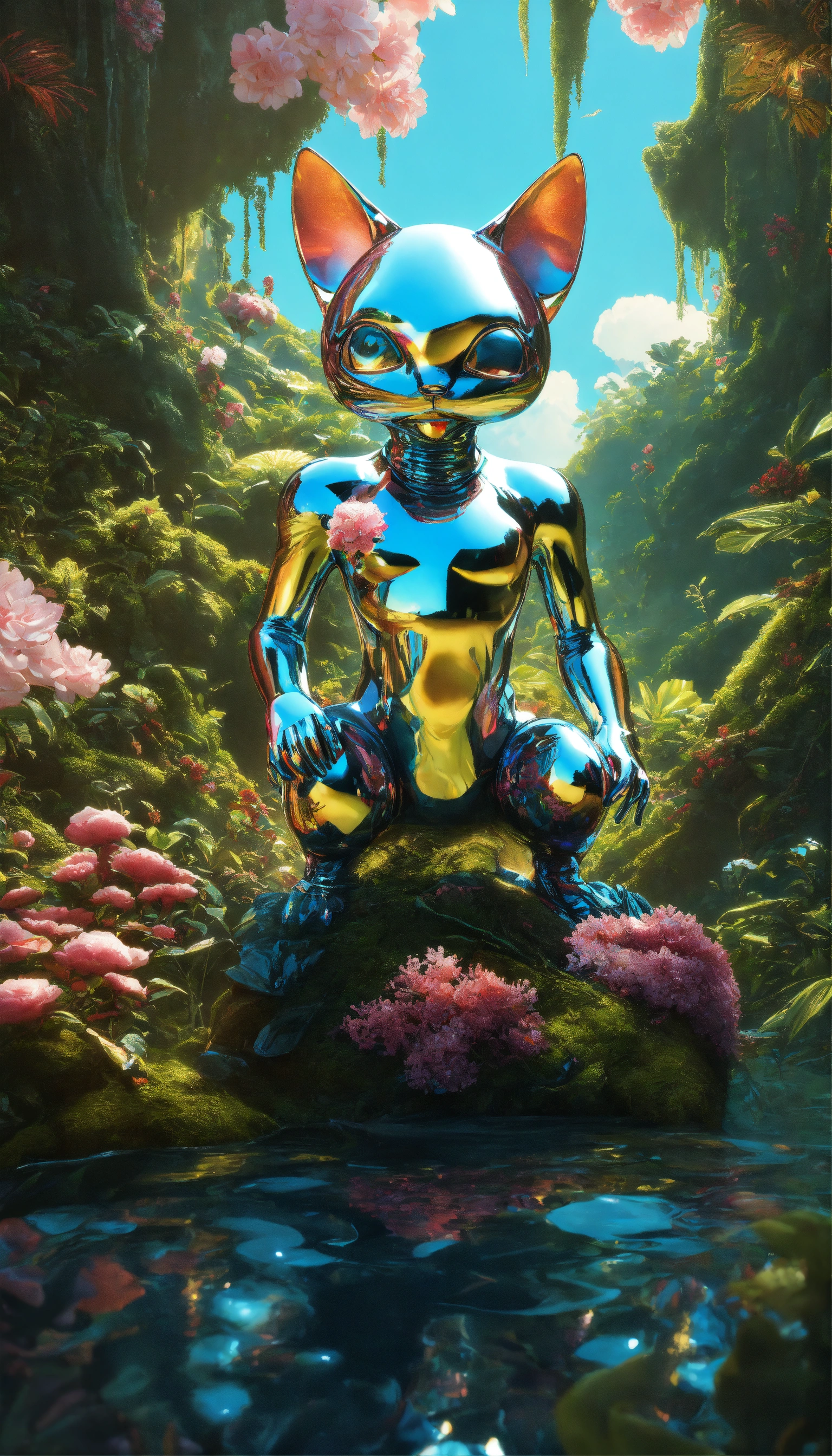 Extremely ultrarealistic photorealistic 3d cute chrome japanese alien holding a kitty in a vast jungle, by james jean and android jones jeff koons erin hanson joe fenton dan mumford professional photography, natural lighting, volumetric lighting maximalist photoillustration 8k resolution intricately detailed, complex, elegant, expansive, fantastical