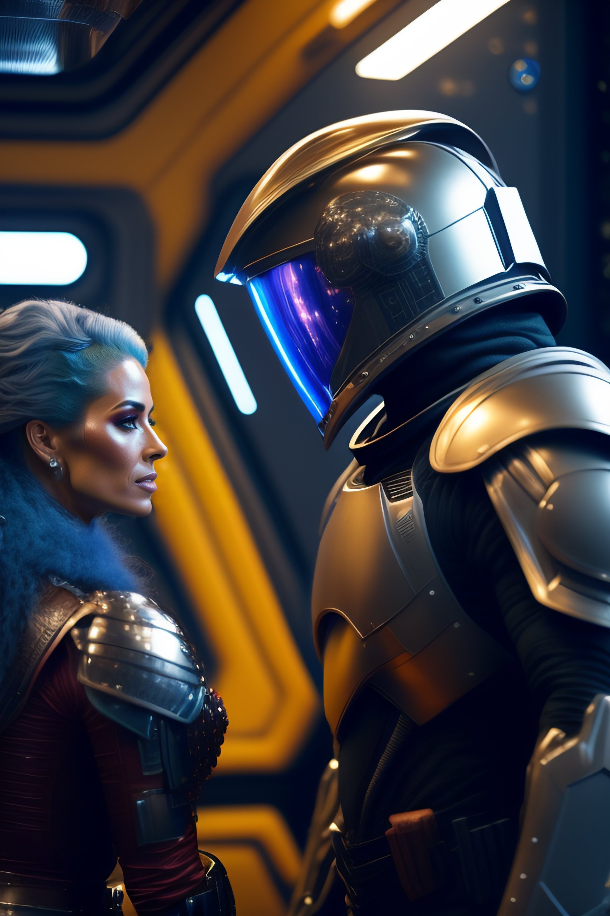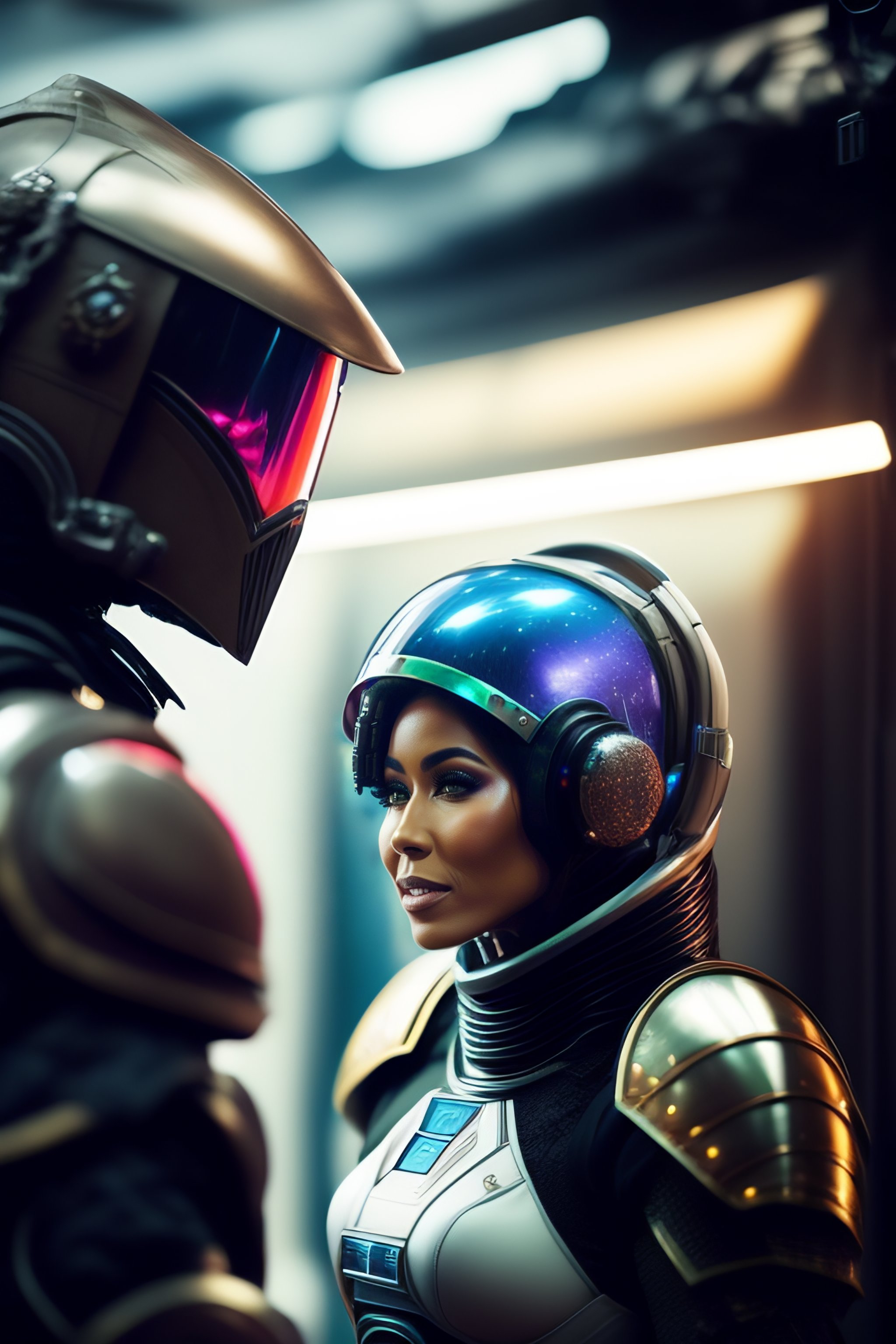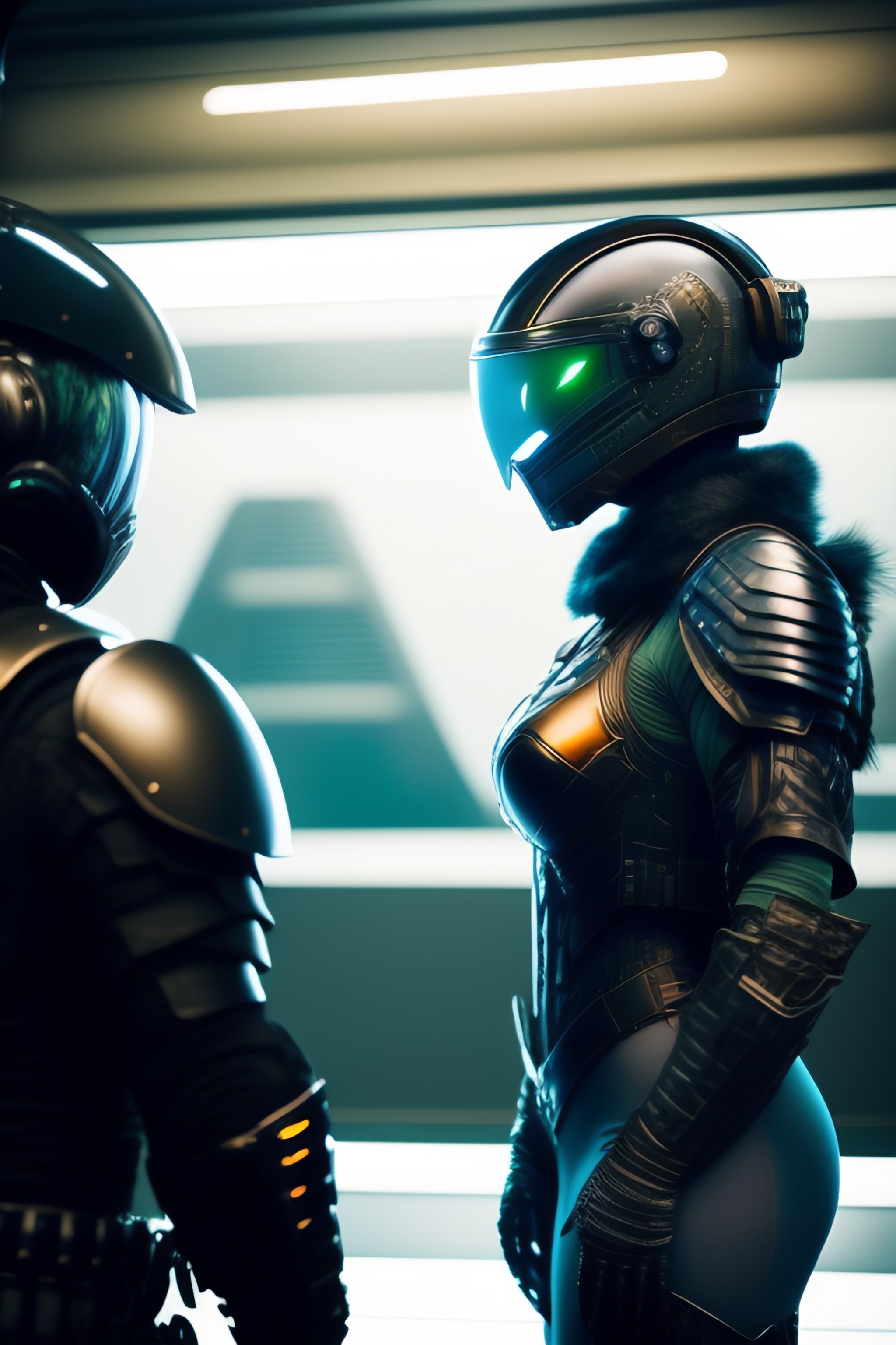 An alien in combat armor chatting with a human bounty hunter in a space station