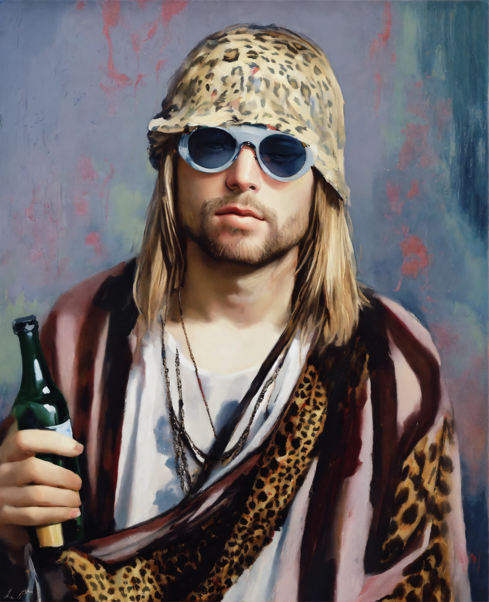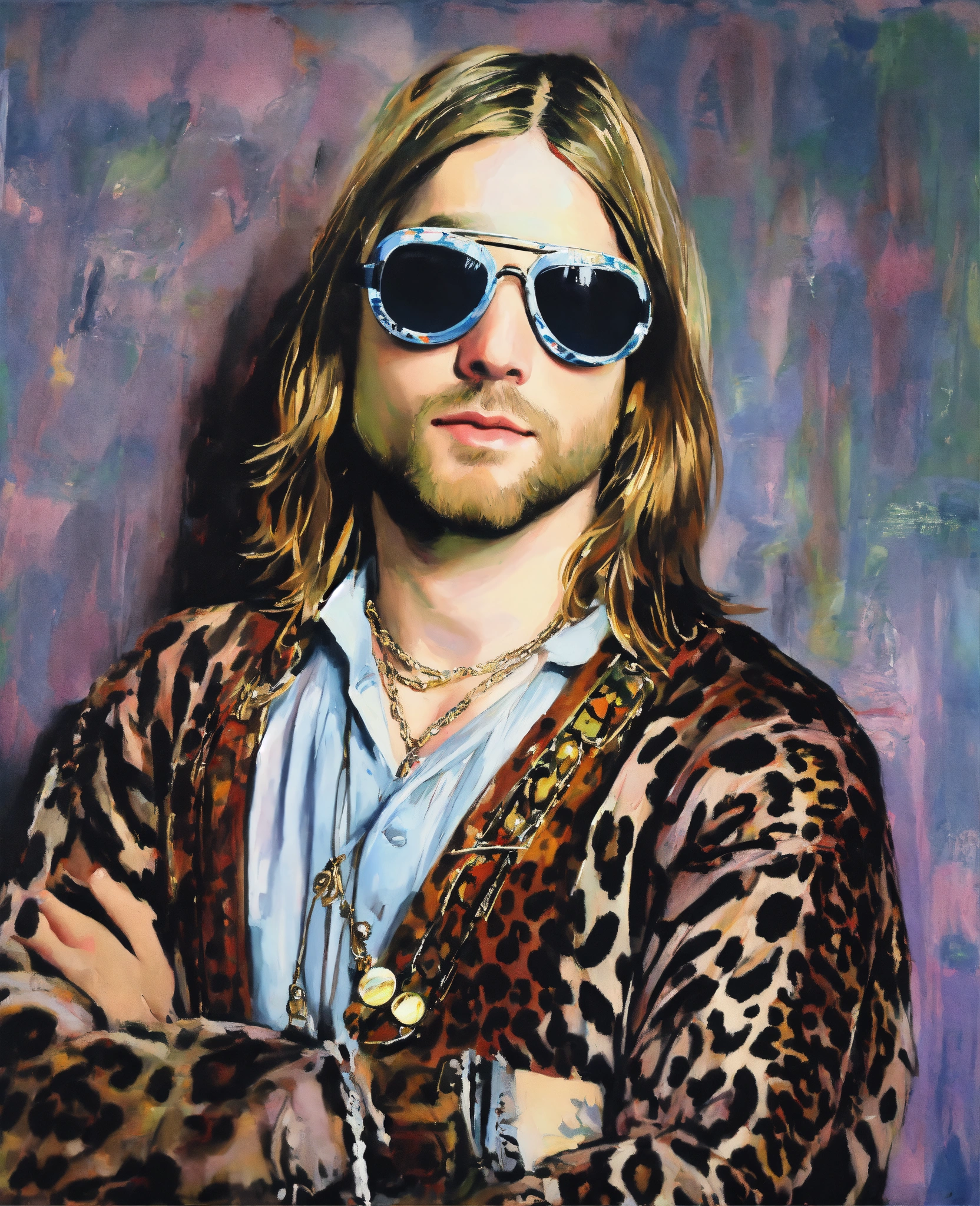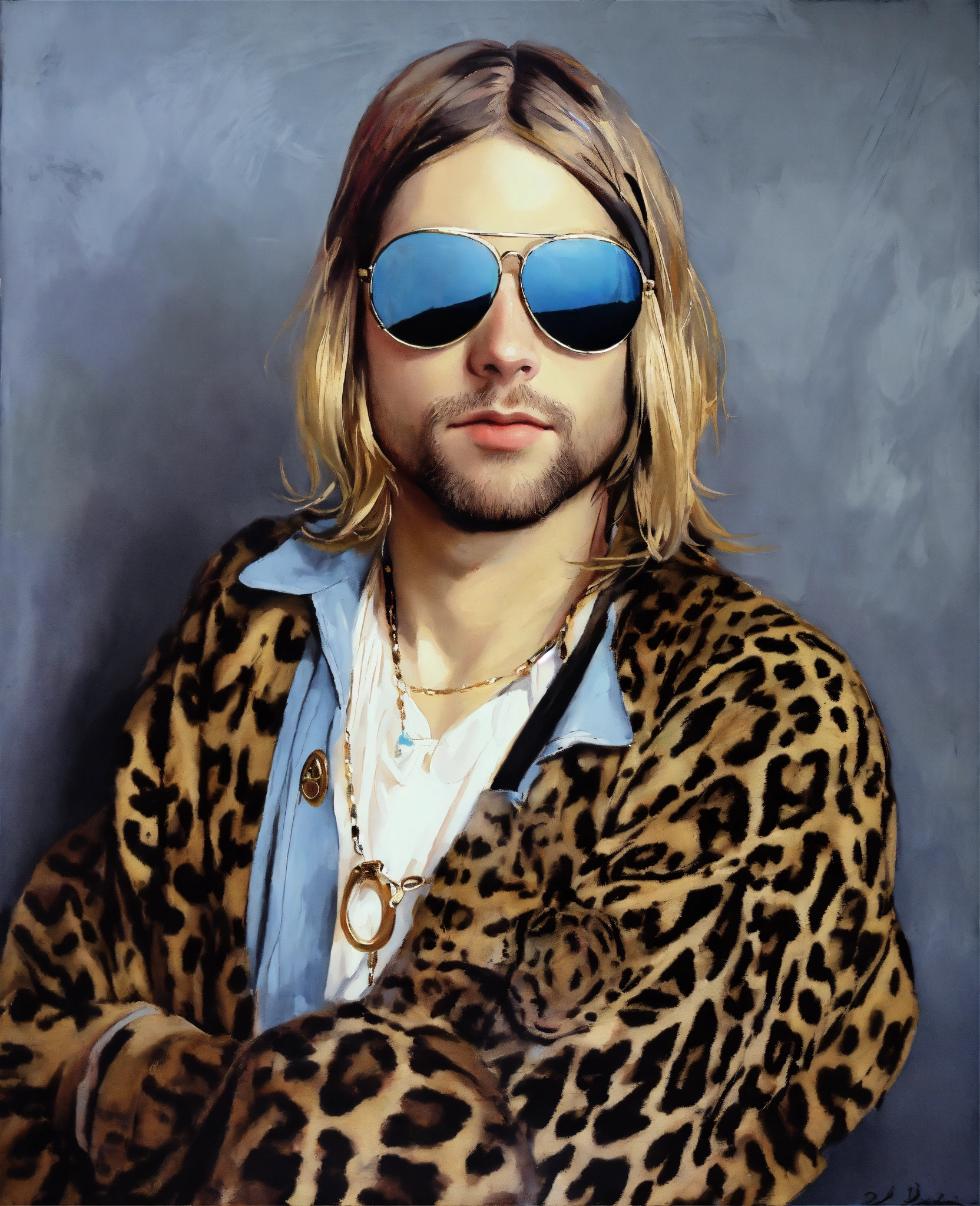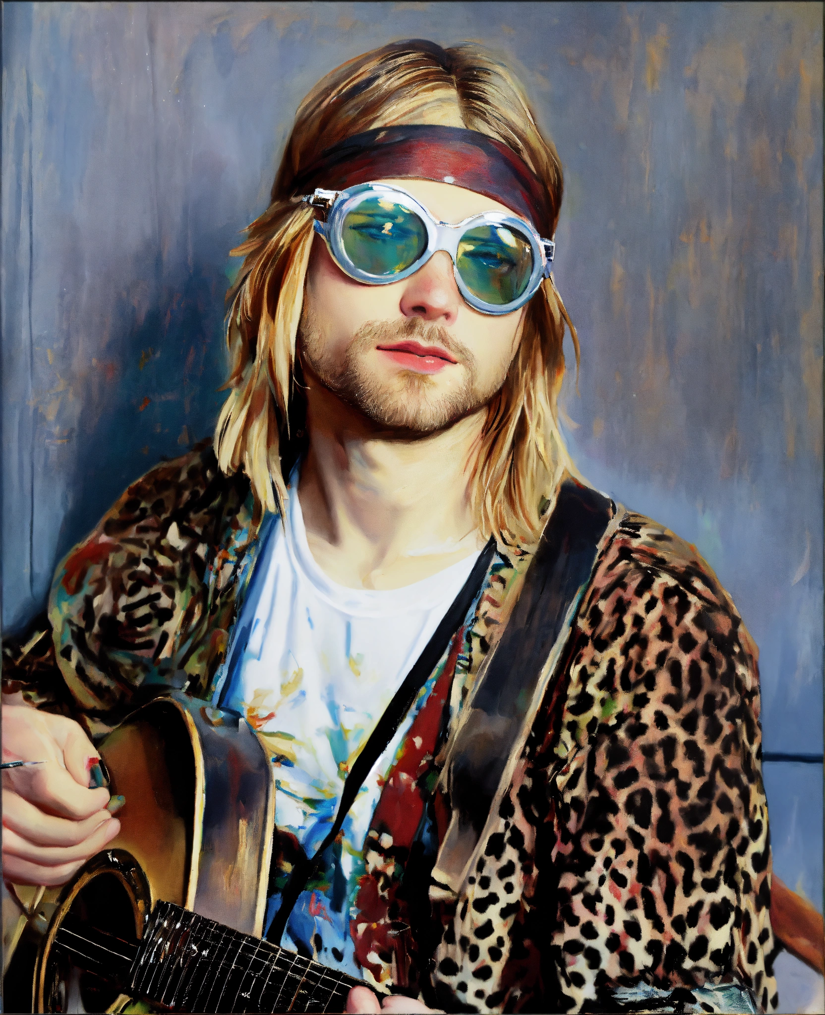 Paint kurt cobain in the painting style of leonardo da vinci, a similar style to the mona lisa, the picture should resemble a renaissance painting, kurt should be wearing a leopard print top his clout goggle sunglasses (like picture attached), brush strokes similar to da vinci, fading similar to the mona lisa, it should look old