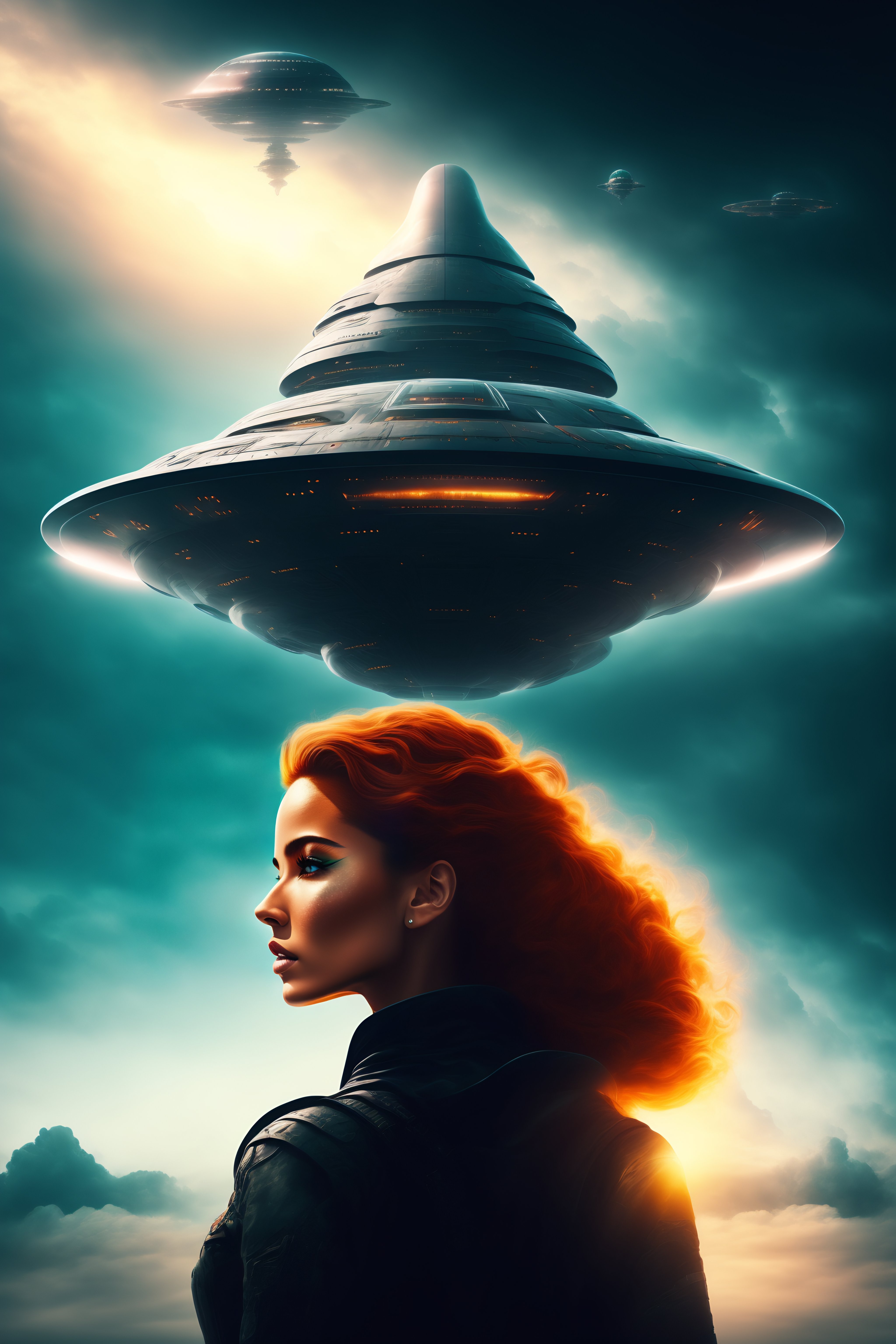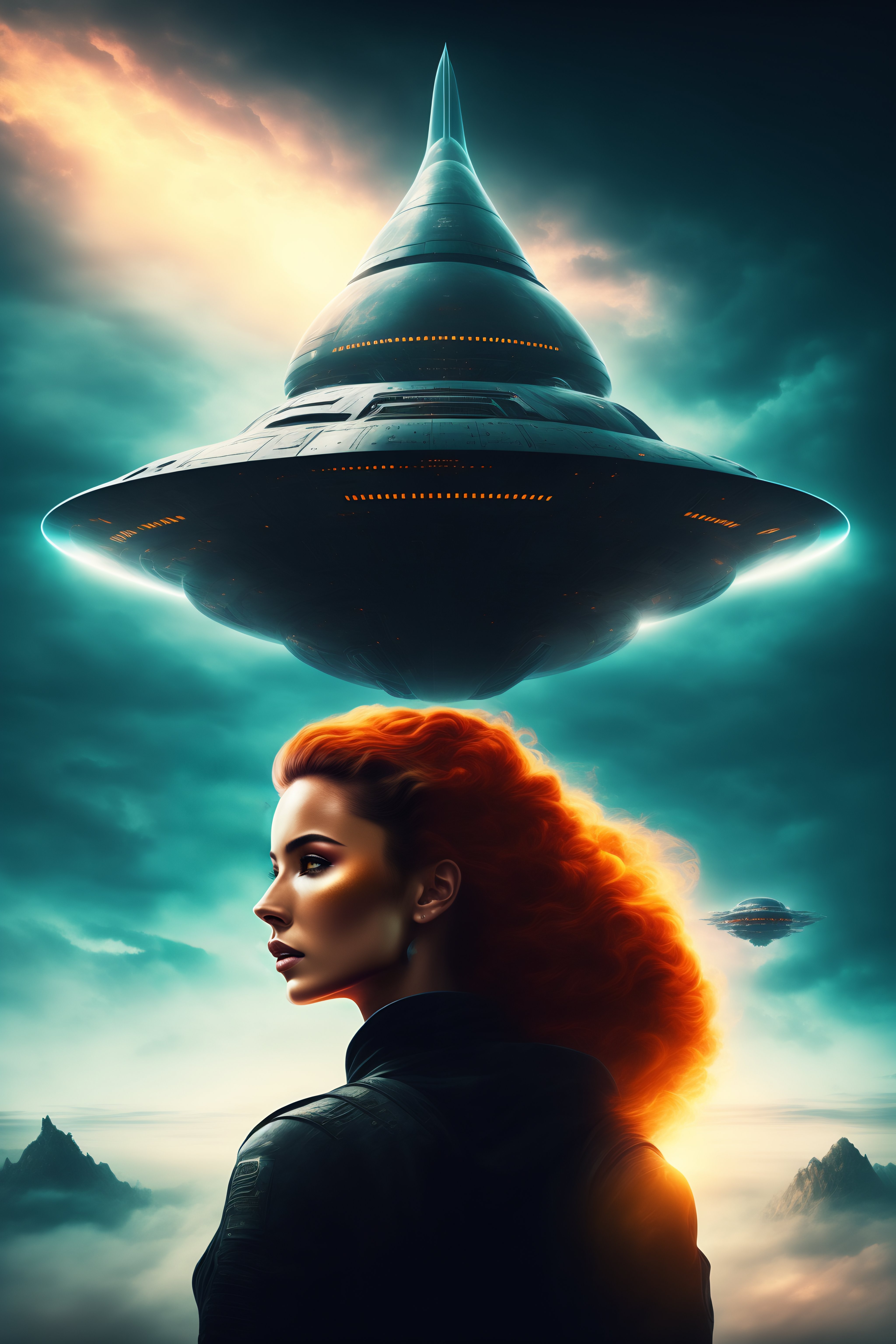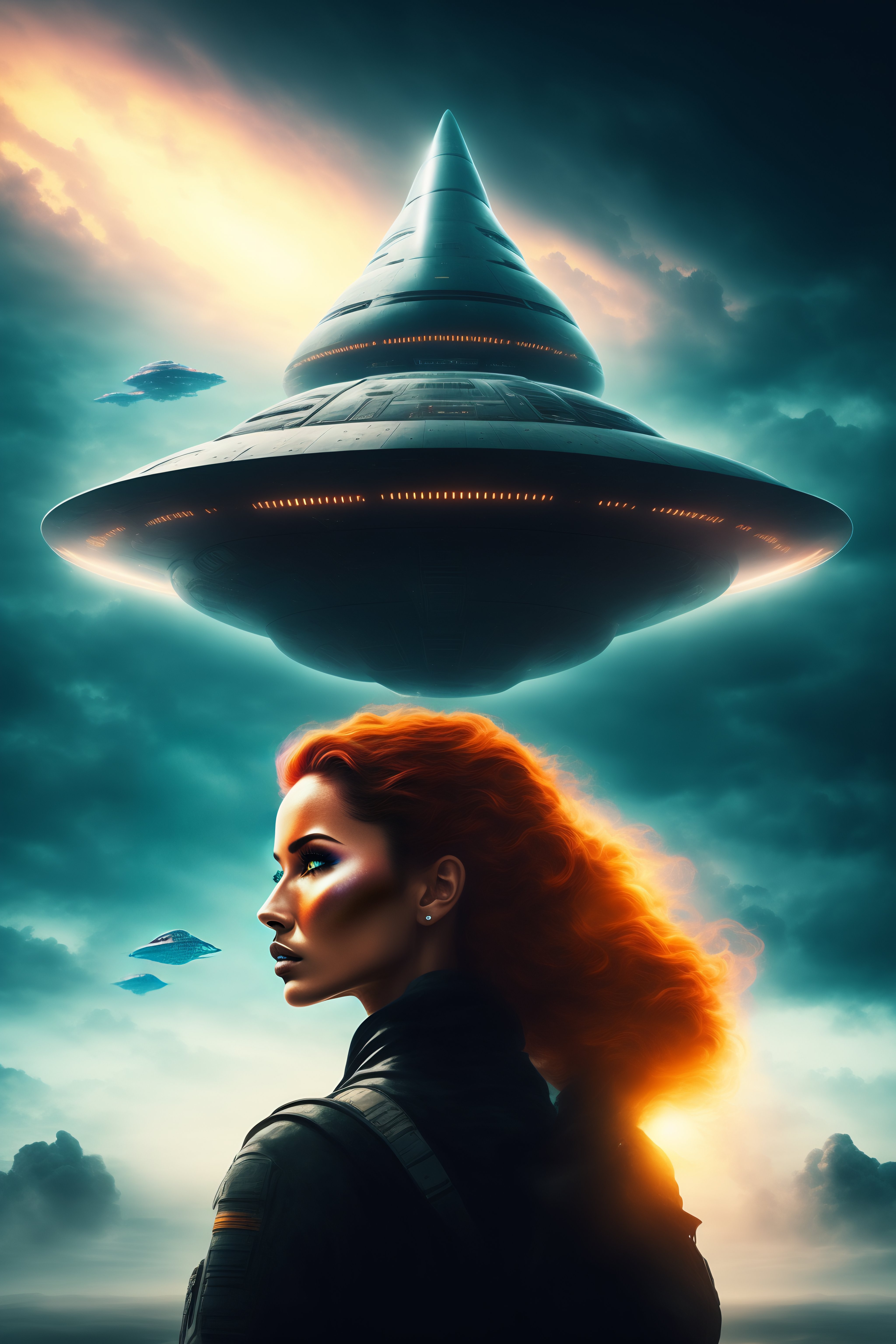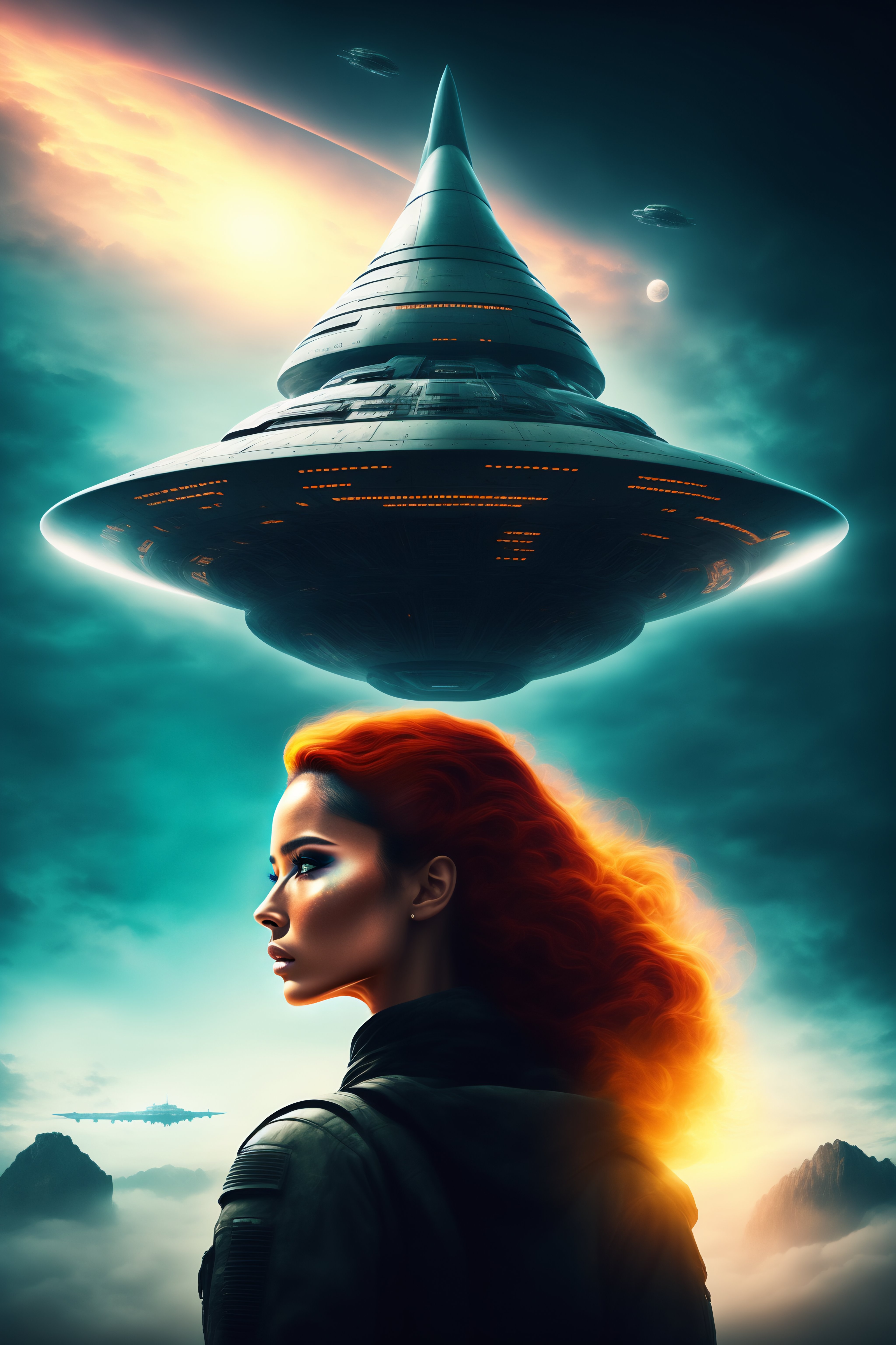 Distopic future, alien space ship above the sky, earth as a pos-apocalyptic paradise, a half human half vulcan girl at the center o the image looking at the sky, cinematic