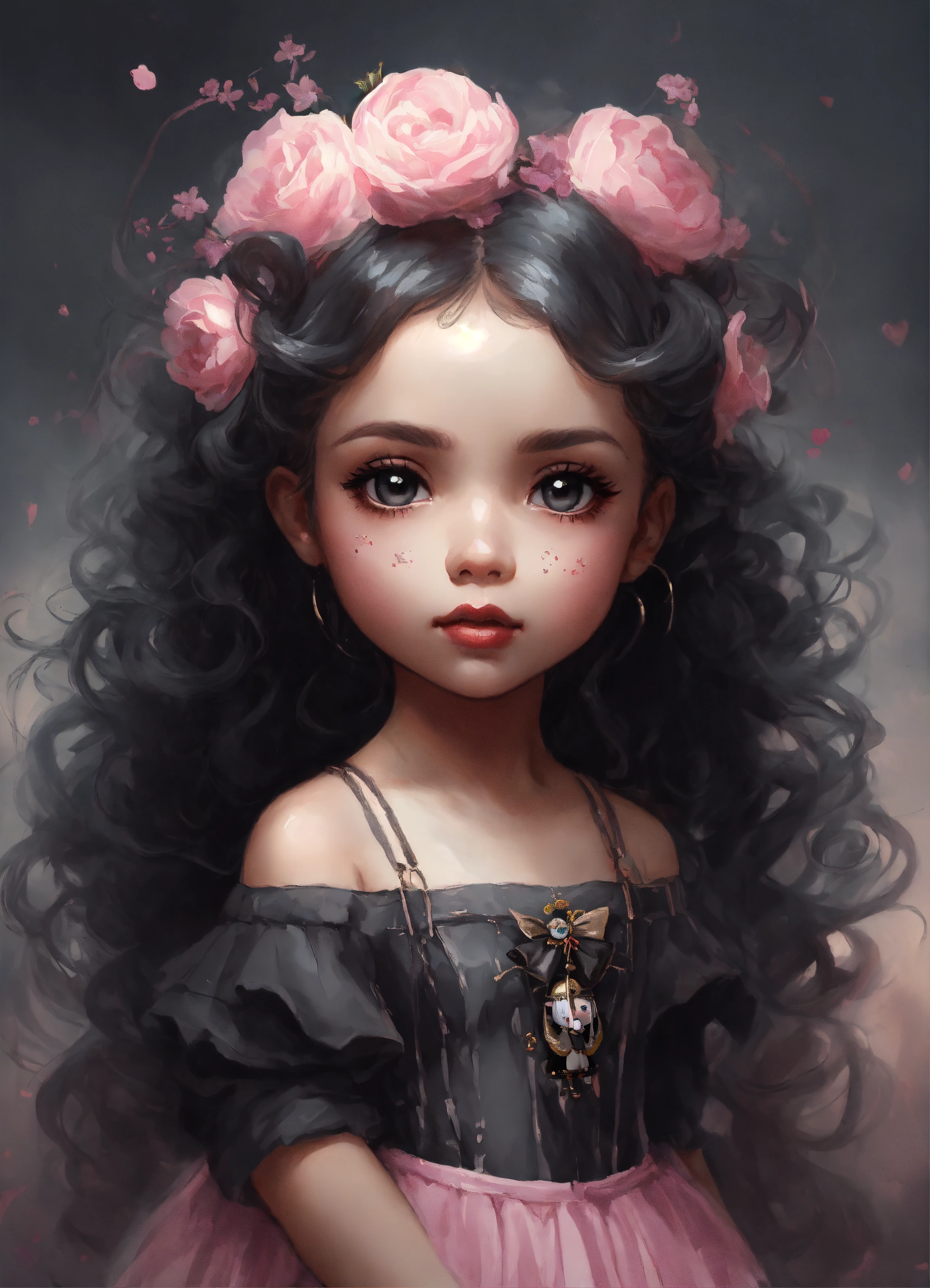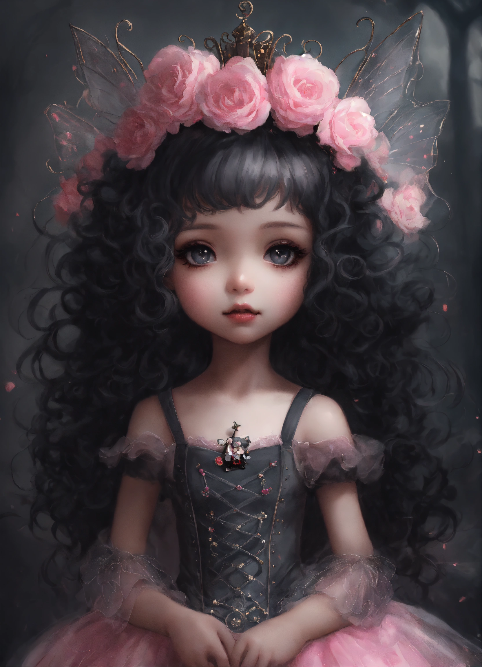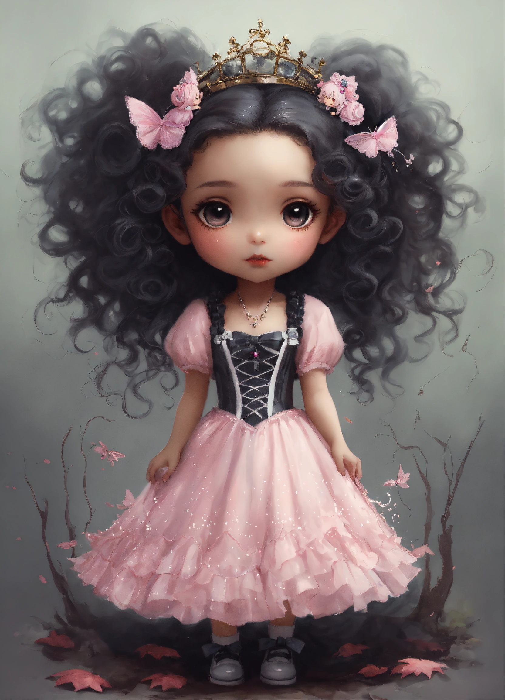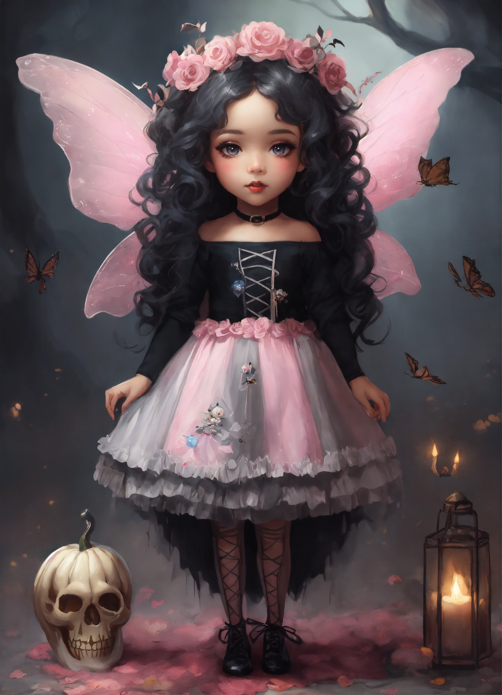 Portrait and shot full body of a very cute dark fairy gothic chibi girl in halloween time, she is doing magic, wearing a black crown in her head, wearing a white and grey and pink long dress, kewpie fairy clothes, white background, long curly hair oil paint vray, by stanley artgerm and tom bagshaw