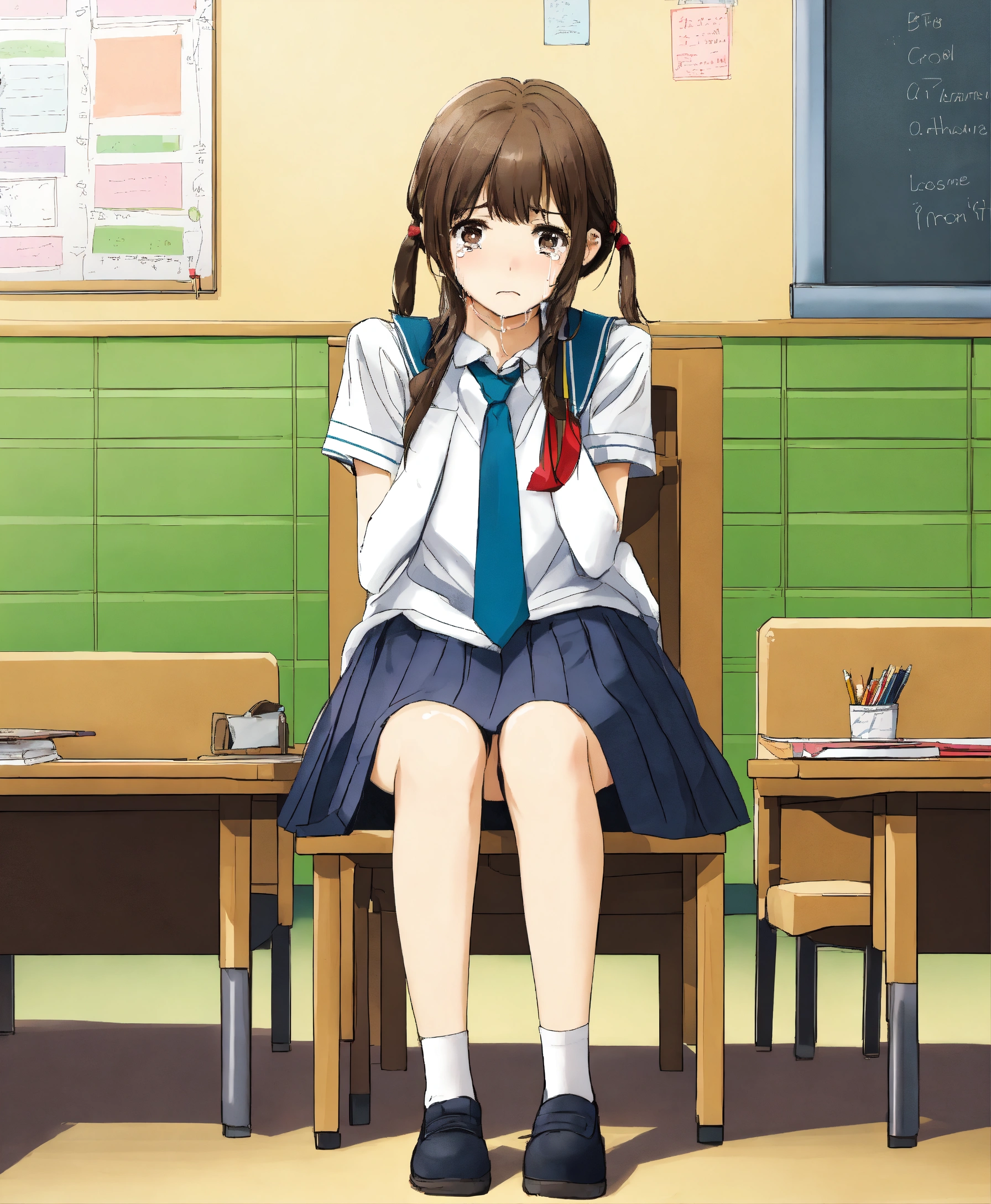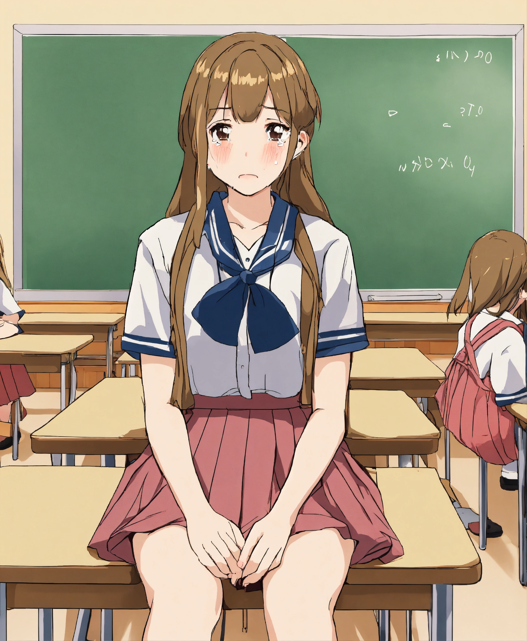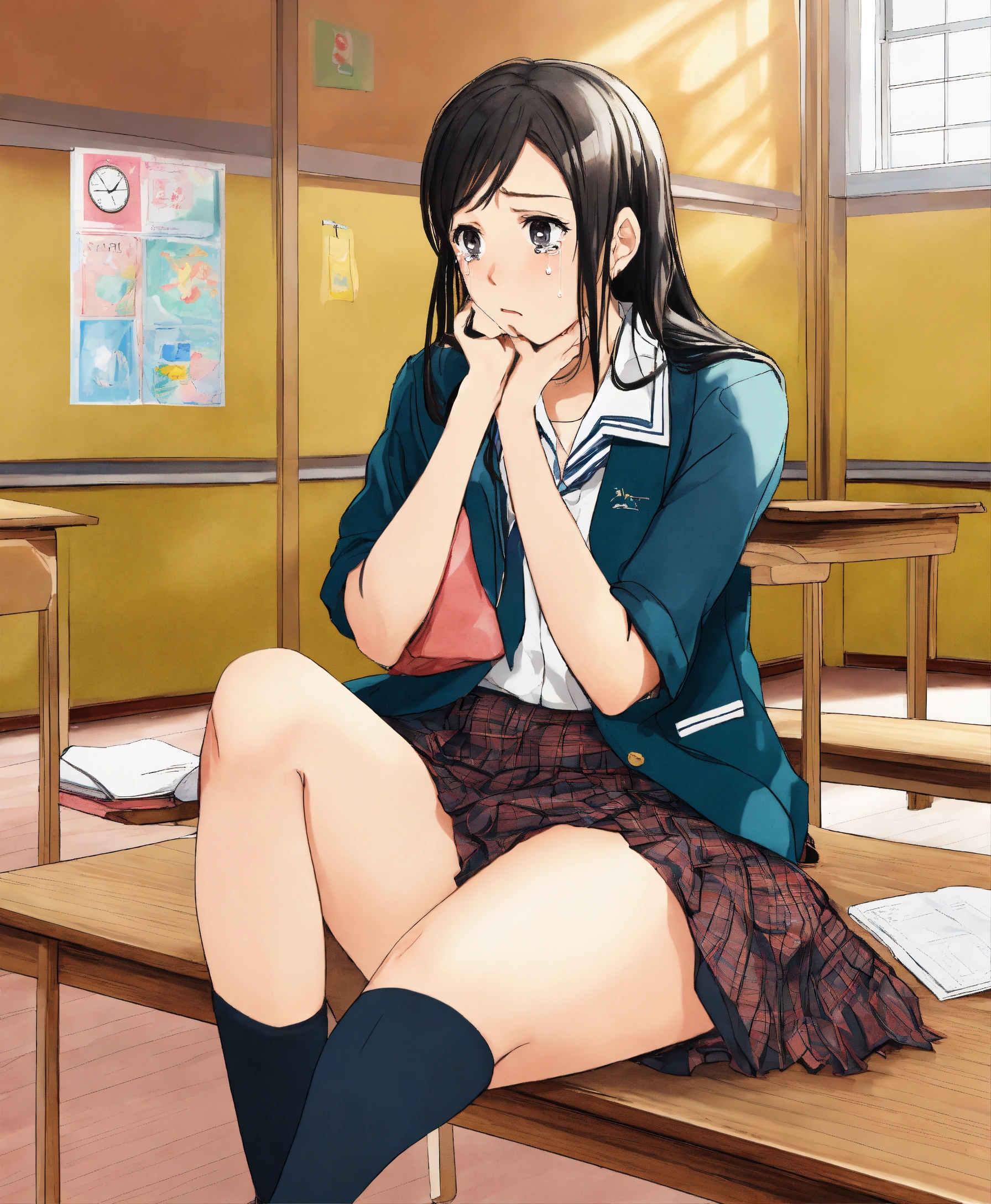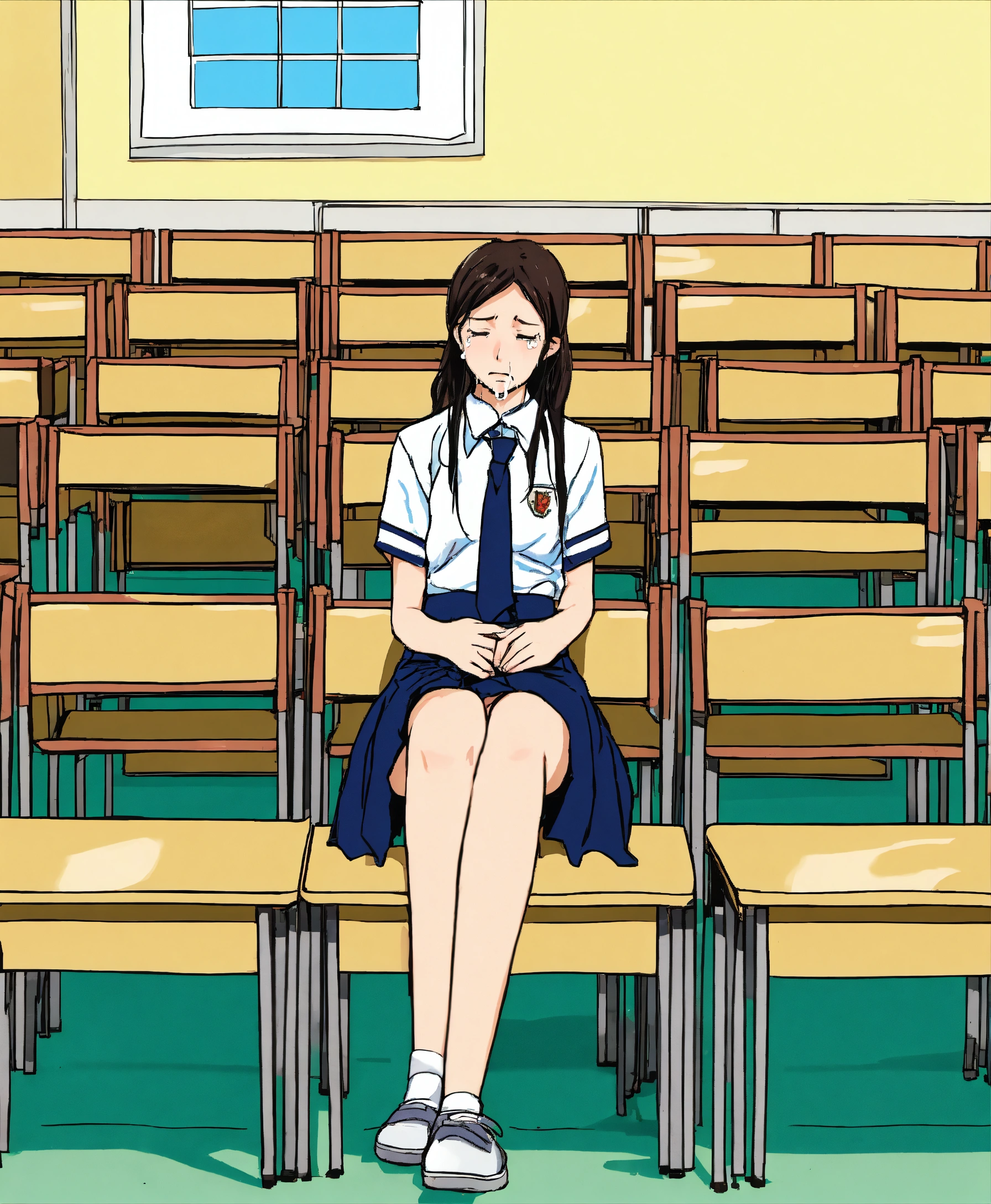 18, woman, ashamed, crying, drawing, school uniform skirt, crossed legs, sitting in a classroom, front view.