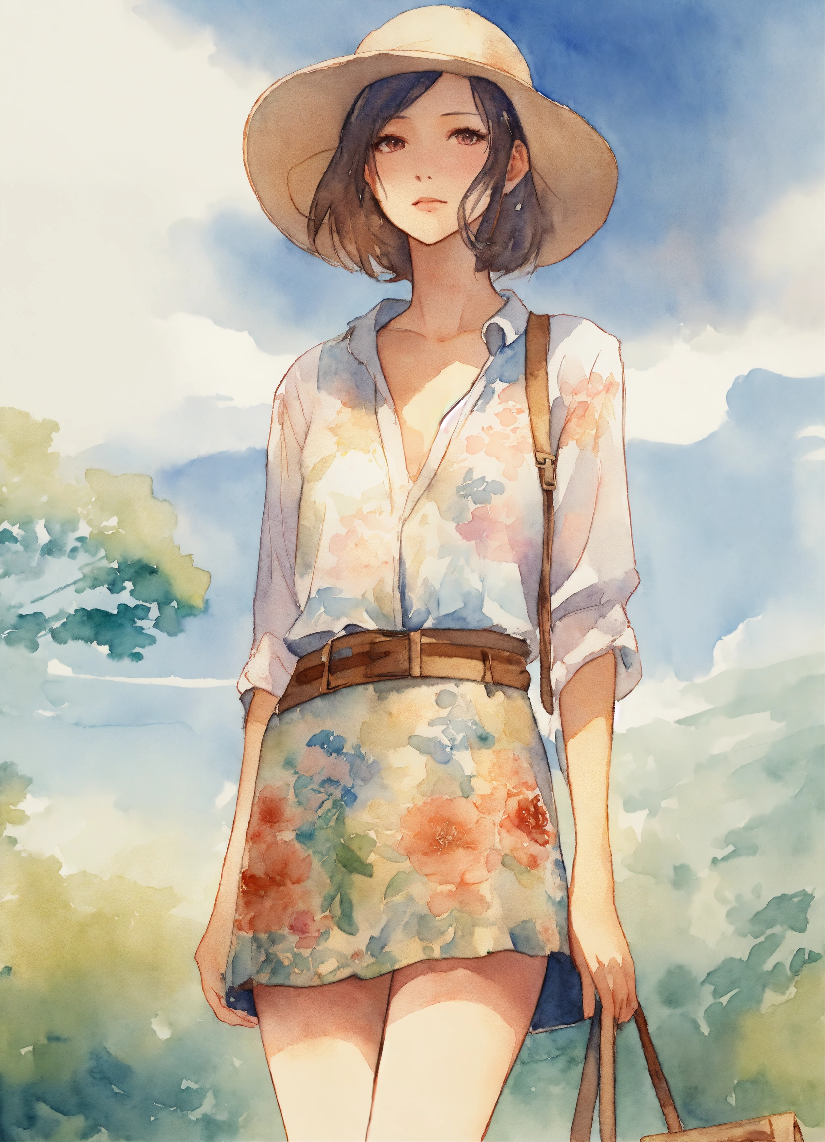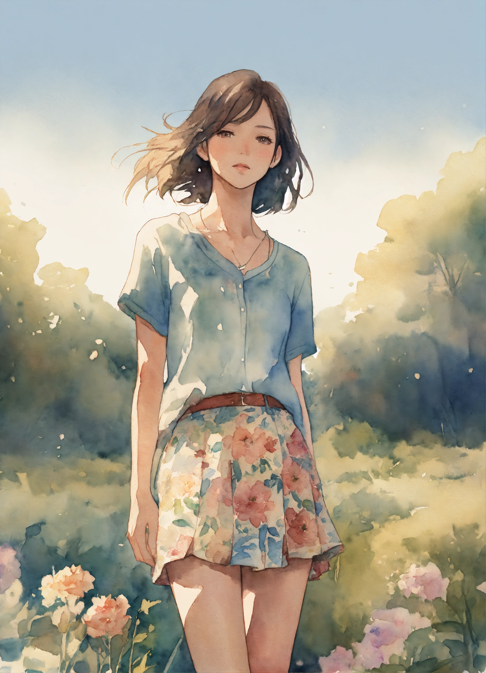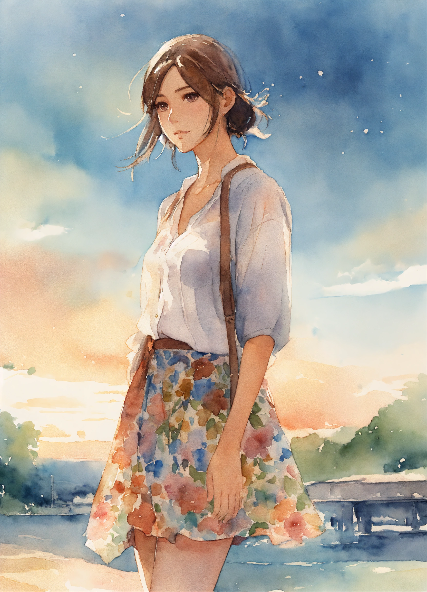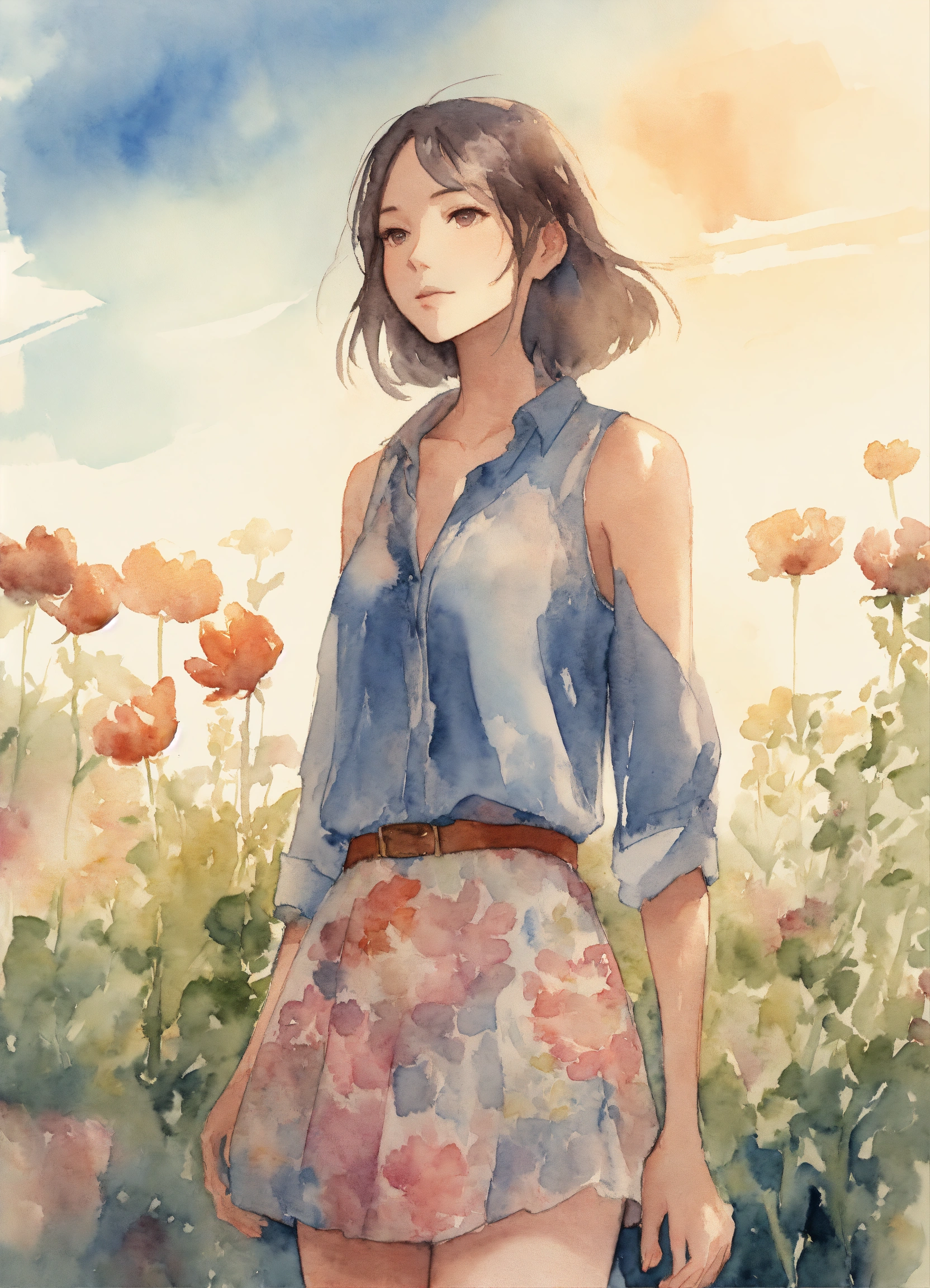 Half body watercolor illustration of an 42 year woman looking to the front, wearing a boho floral short skirt, comfortable, stylish, chic, no makeup, effortless, relaxed, casual, laid-back, frontal facing, beautiful light sky, low saturation, muted colors, animation, fantasy art, by makoto shinkai