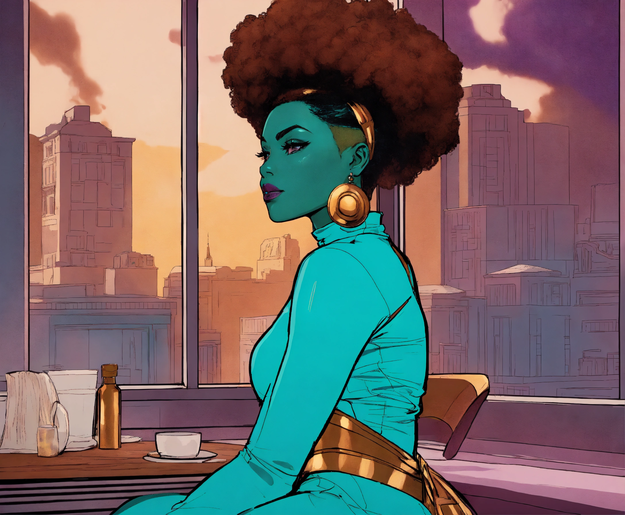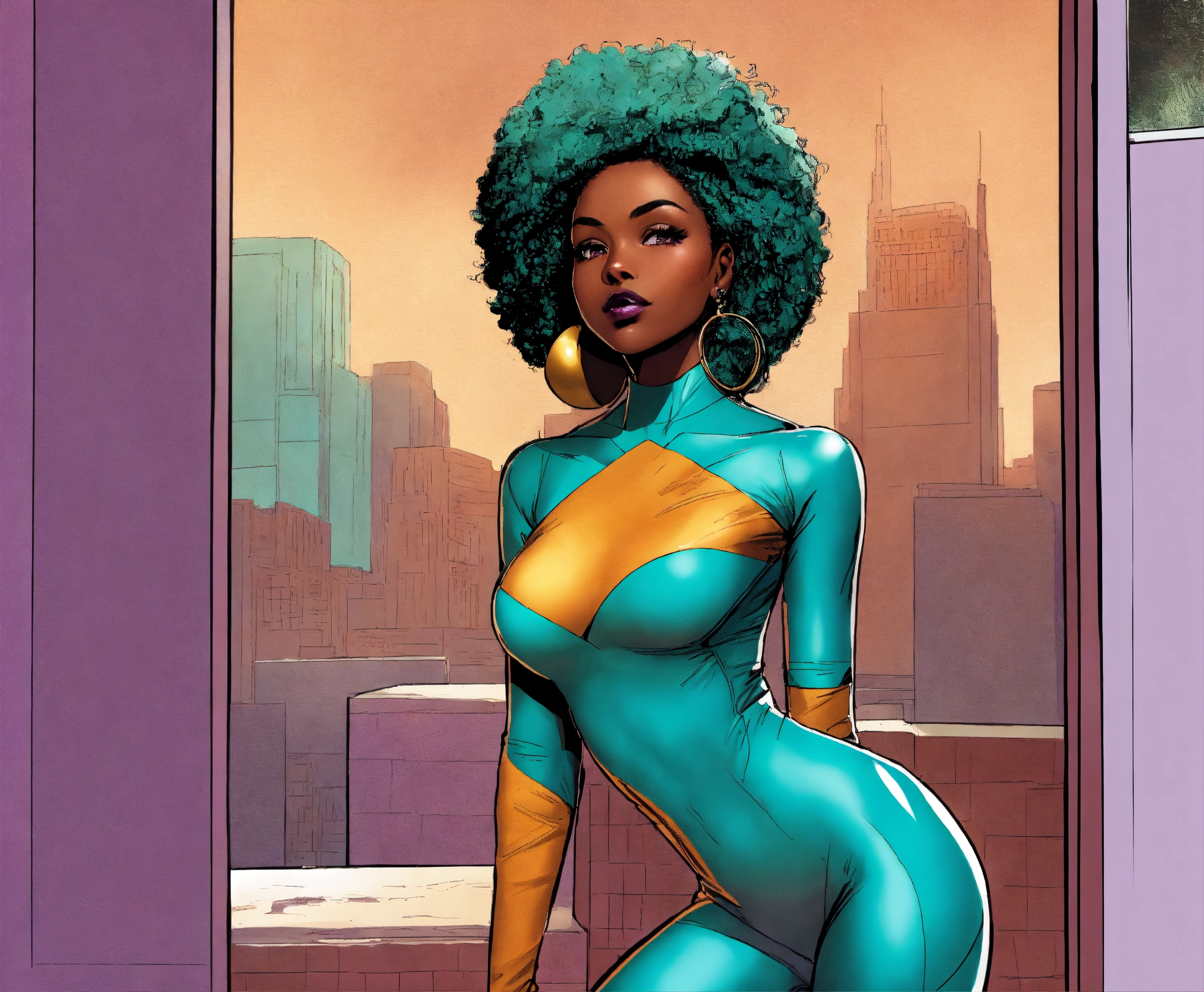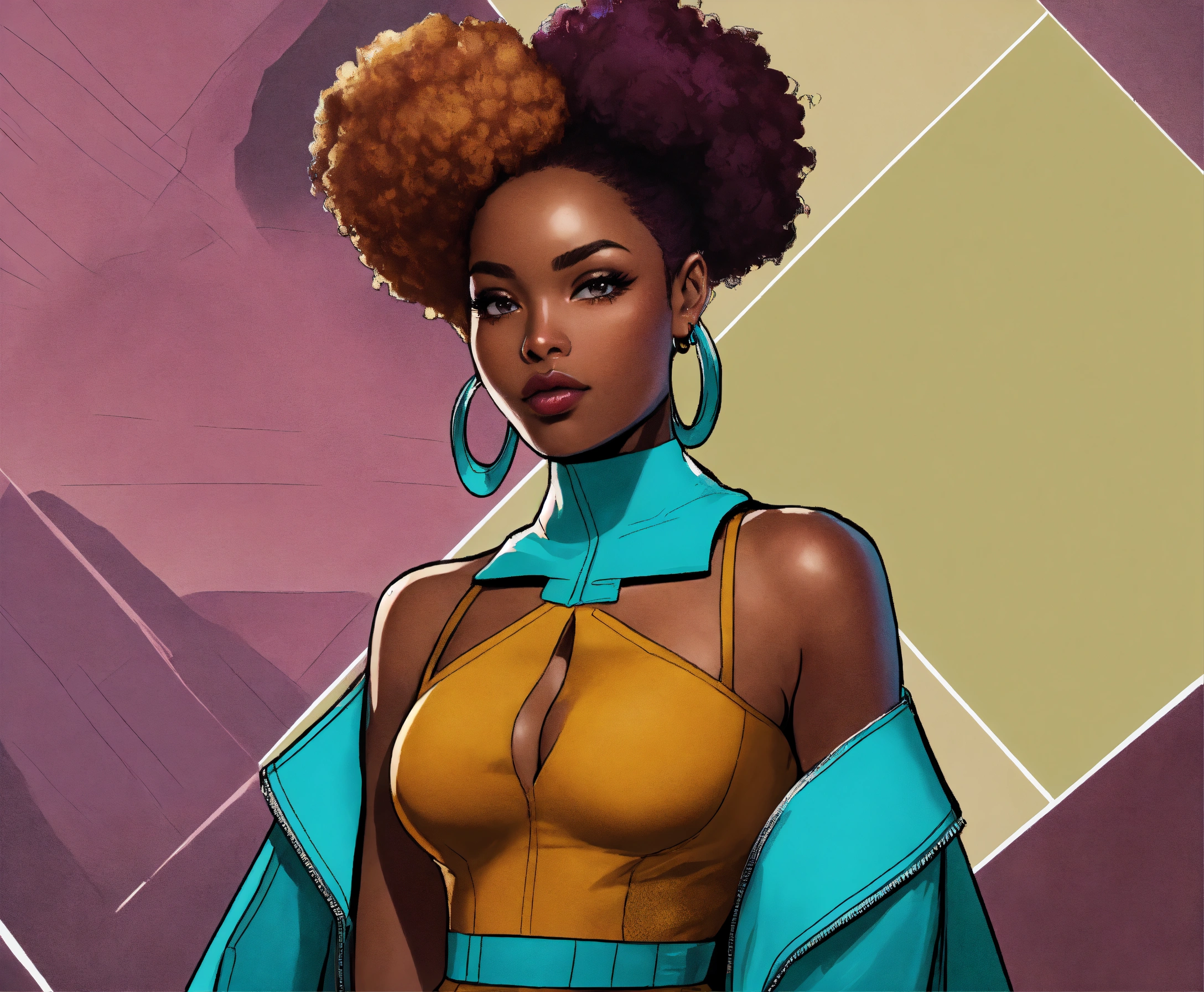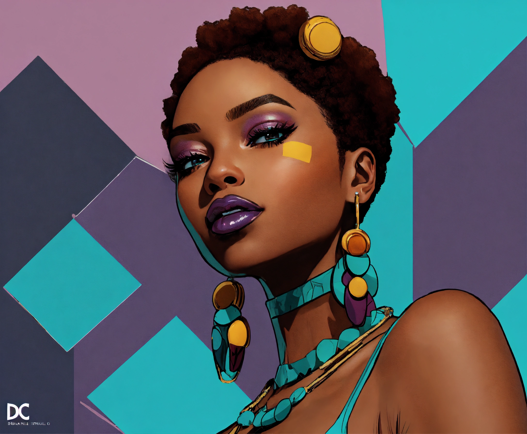 Dc comic ‘yes you can breakout and something new’, a beautifully majestic afrocentric woman smooth glossy elasticity rich skin texture, color palette; turquoise rich mahogany burnt umber mustard shades of violet, rule of thirds, dc comics aesthetic styling