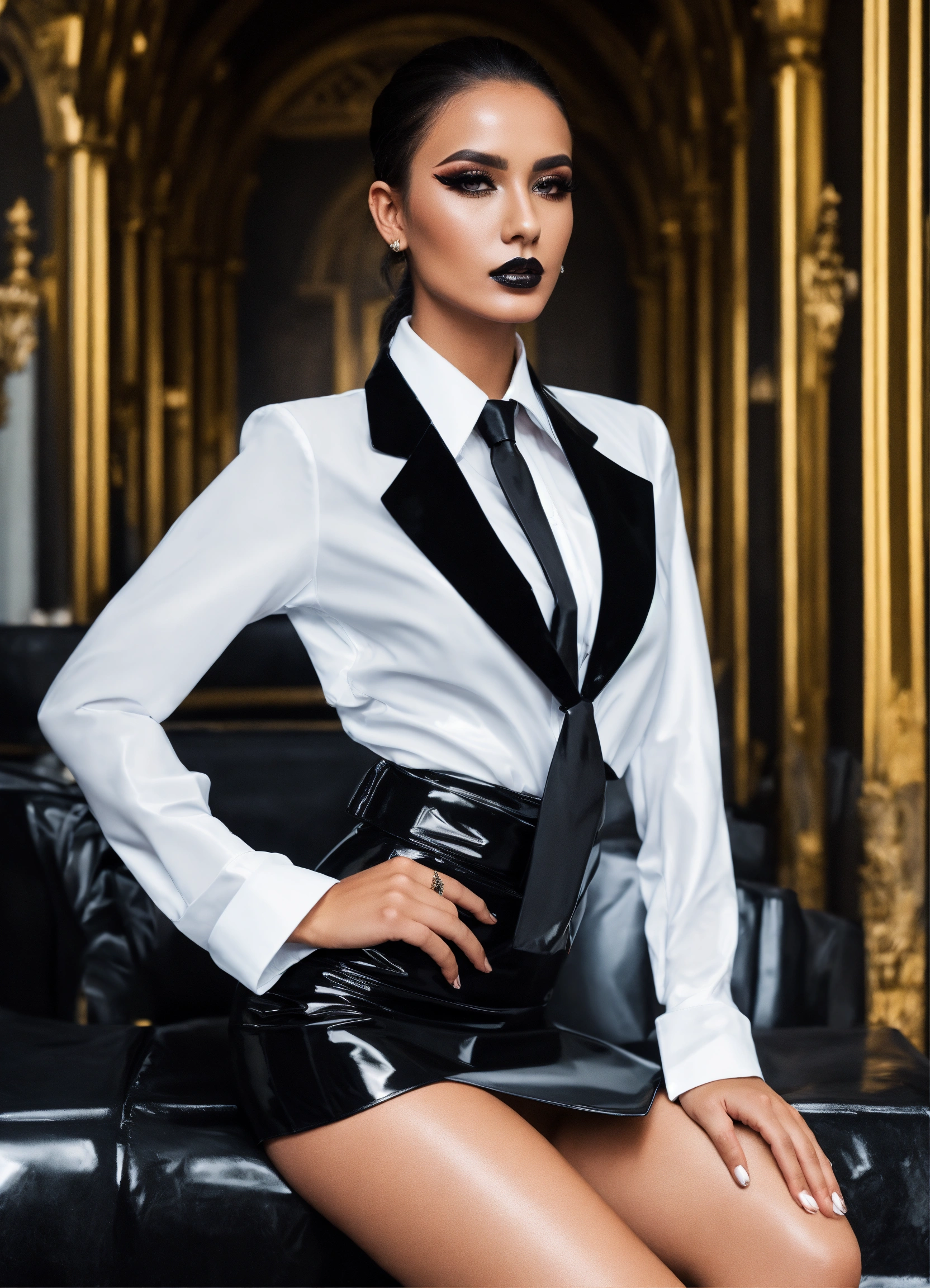 Stunning arab model wearing business suit, black pvc latex business blazer and black pvc skirt, white shirt and black necktie, black eyeliner smoky eyes, castle room, straight black high ponytail hair